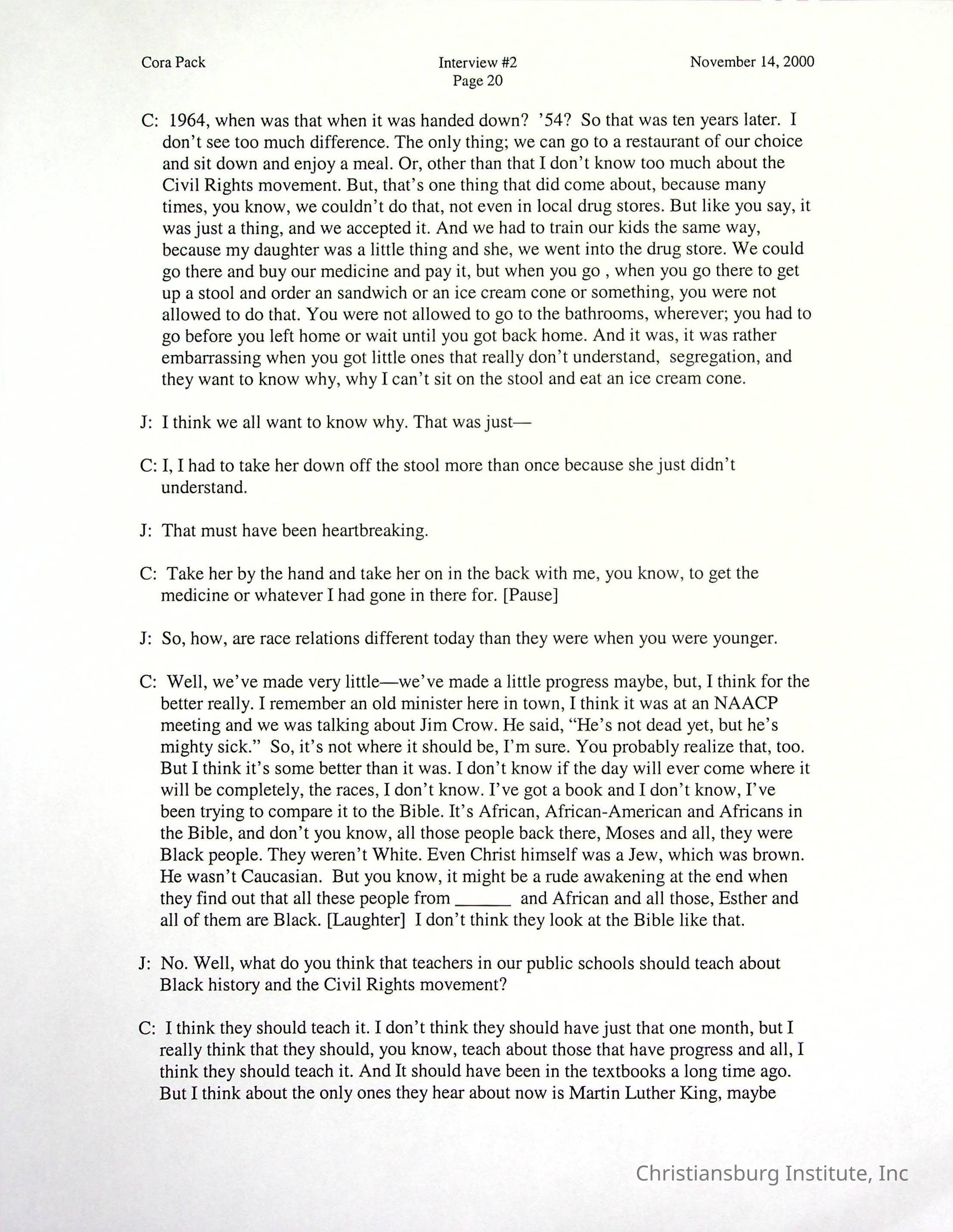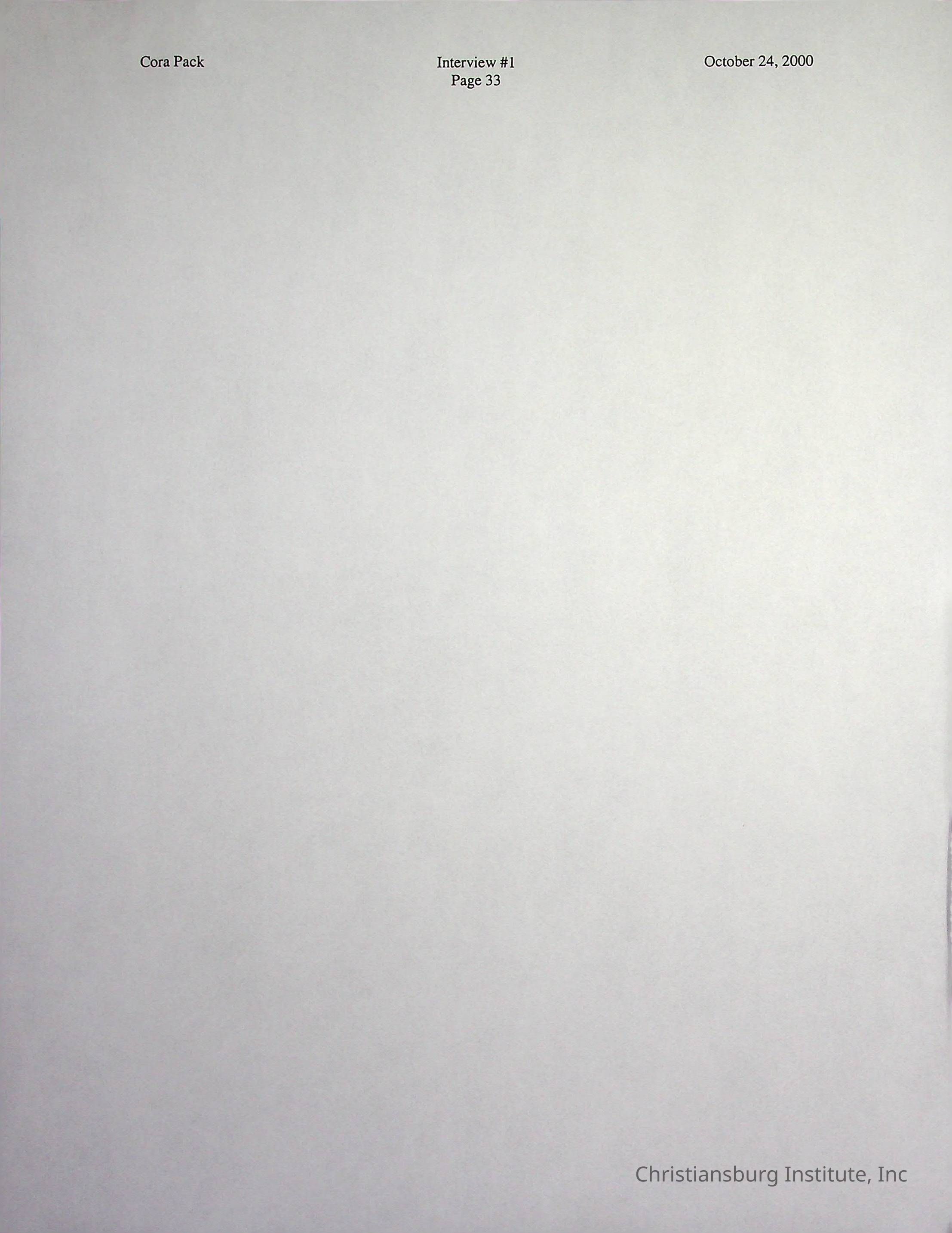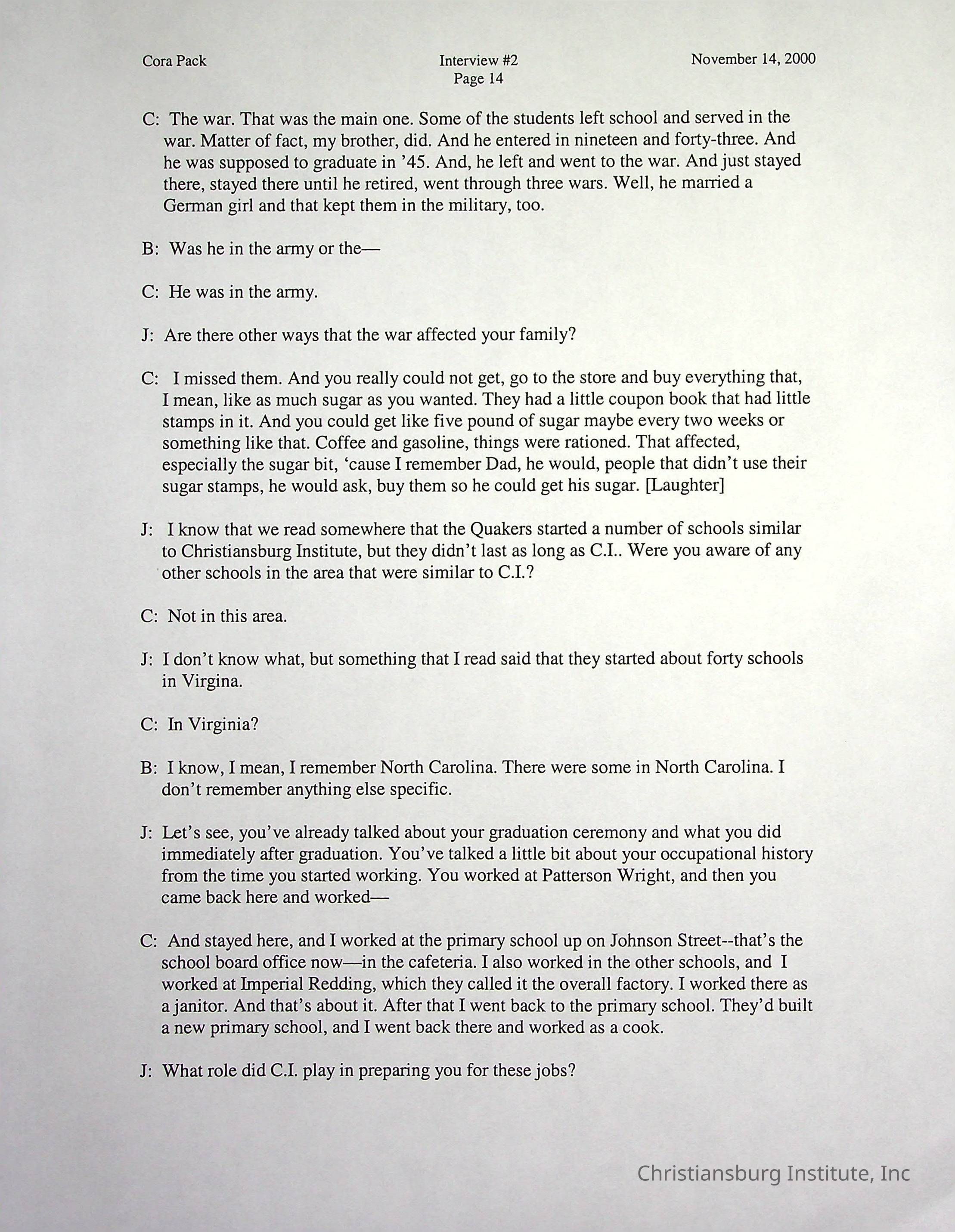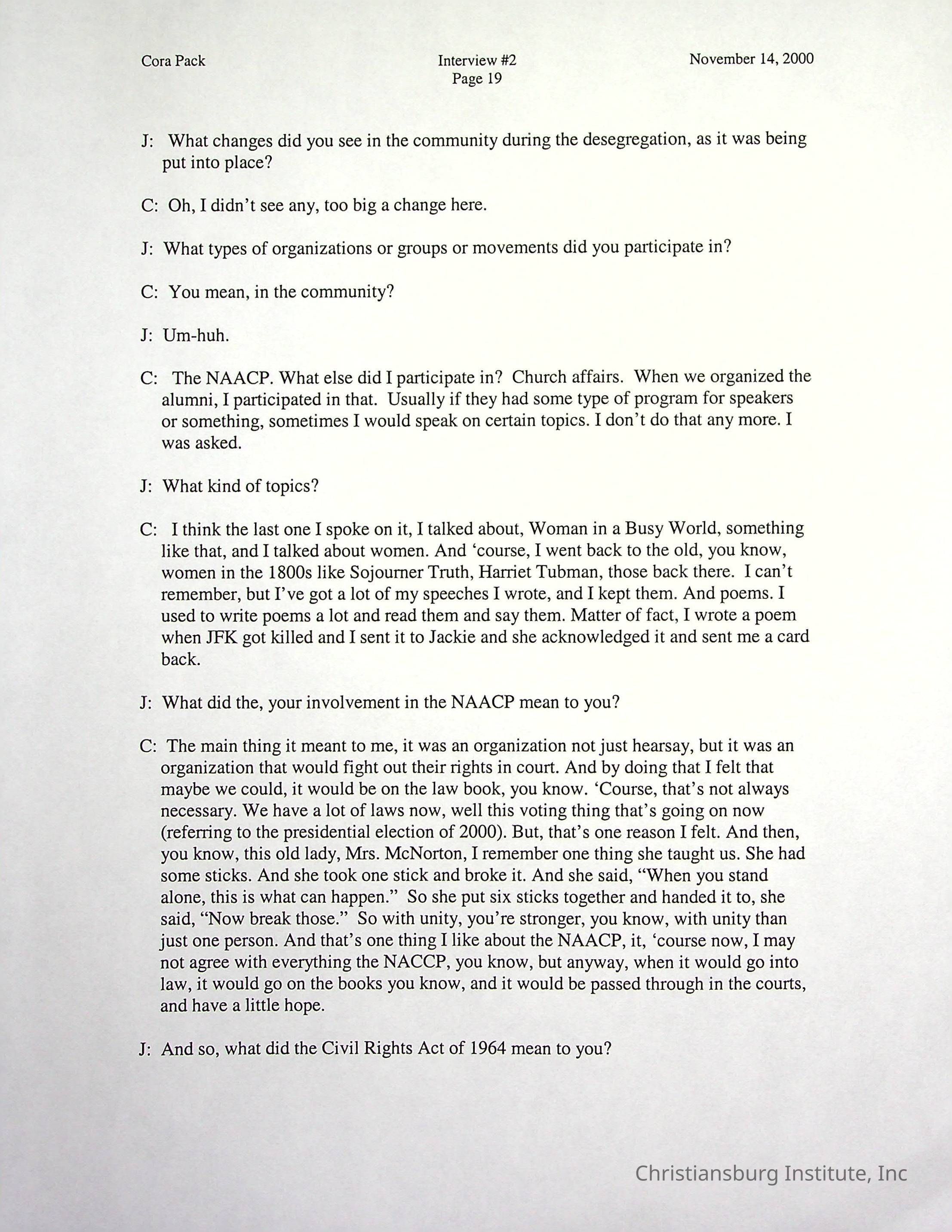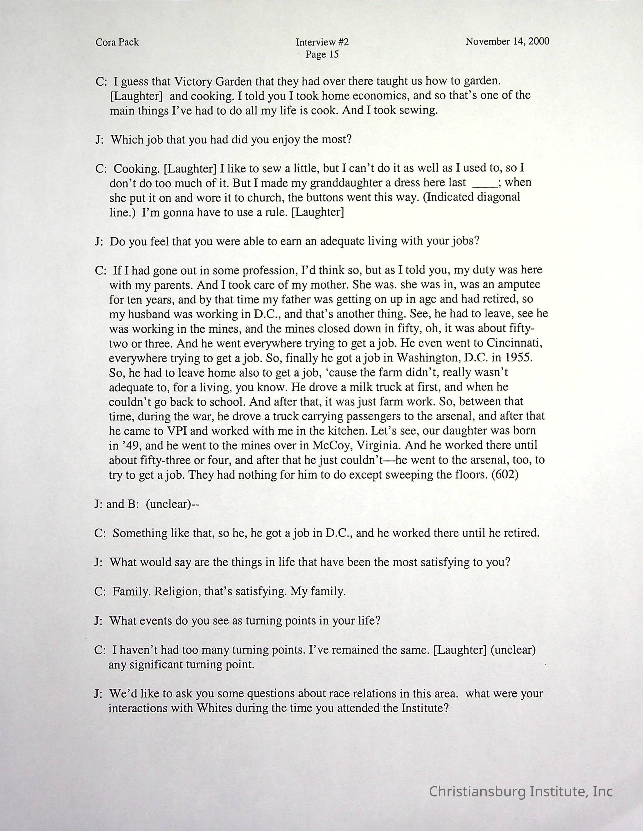Two oral histories with Christiansburg Institute alumni, Cora Pack conducted by Jean Hamm on October 24th, 2000 and November 14th, 2000.Creator