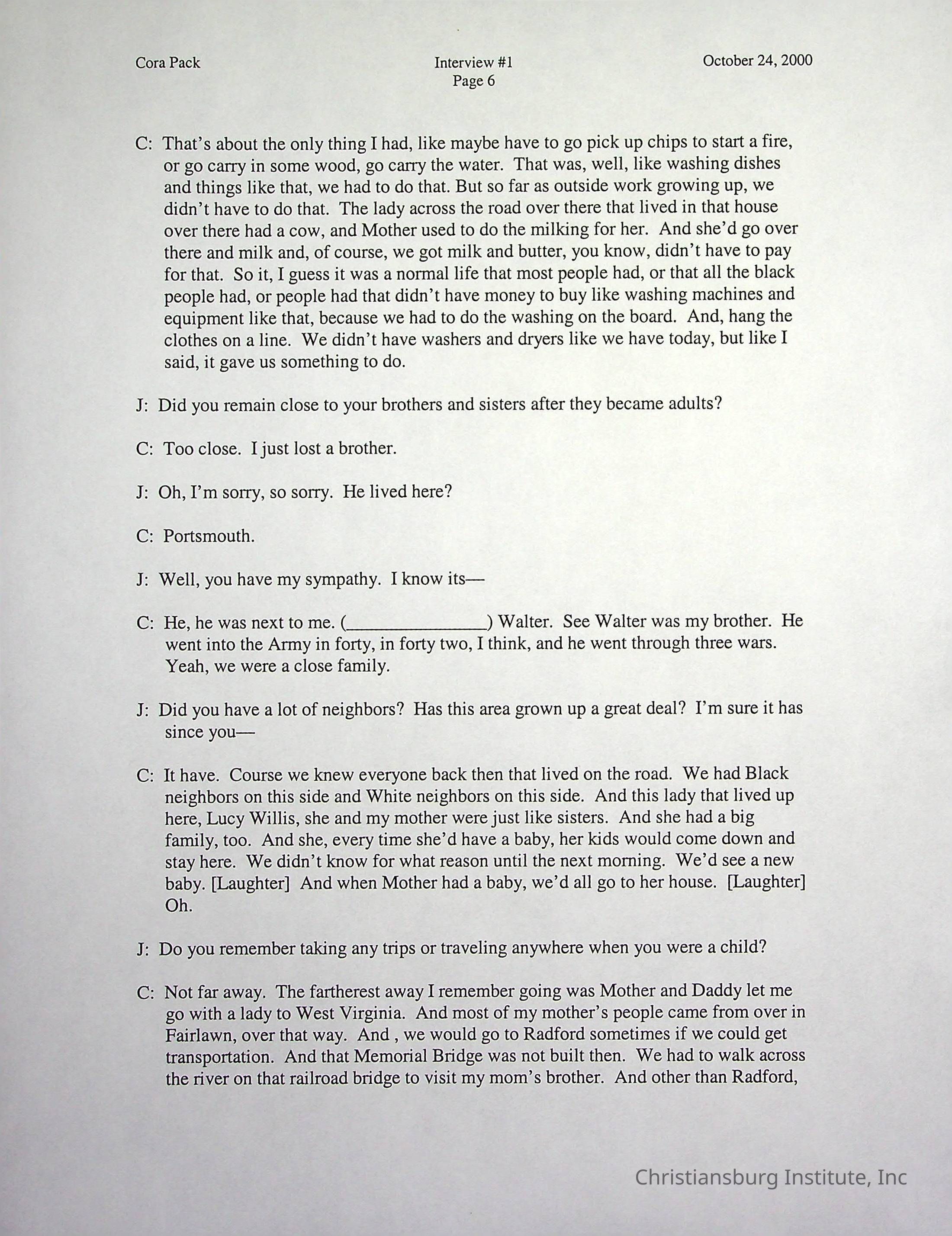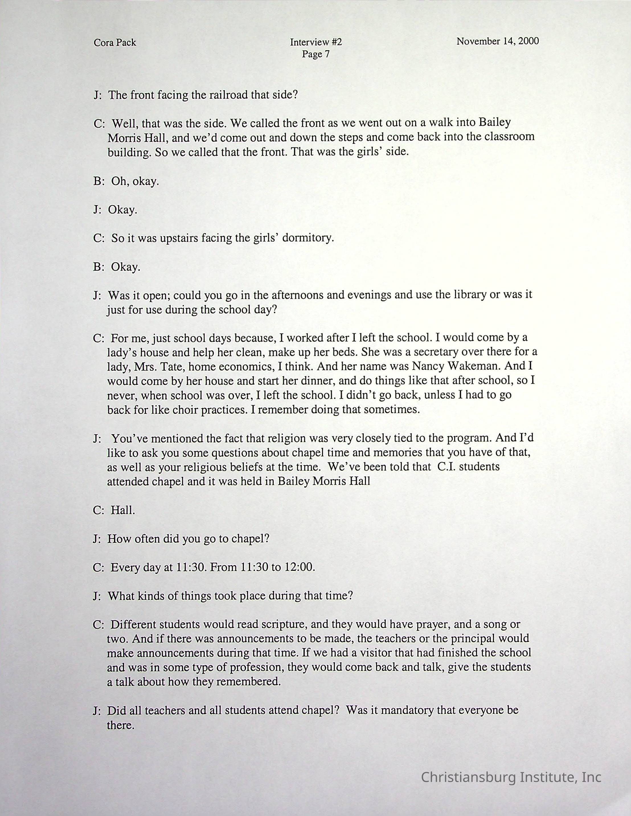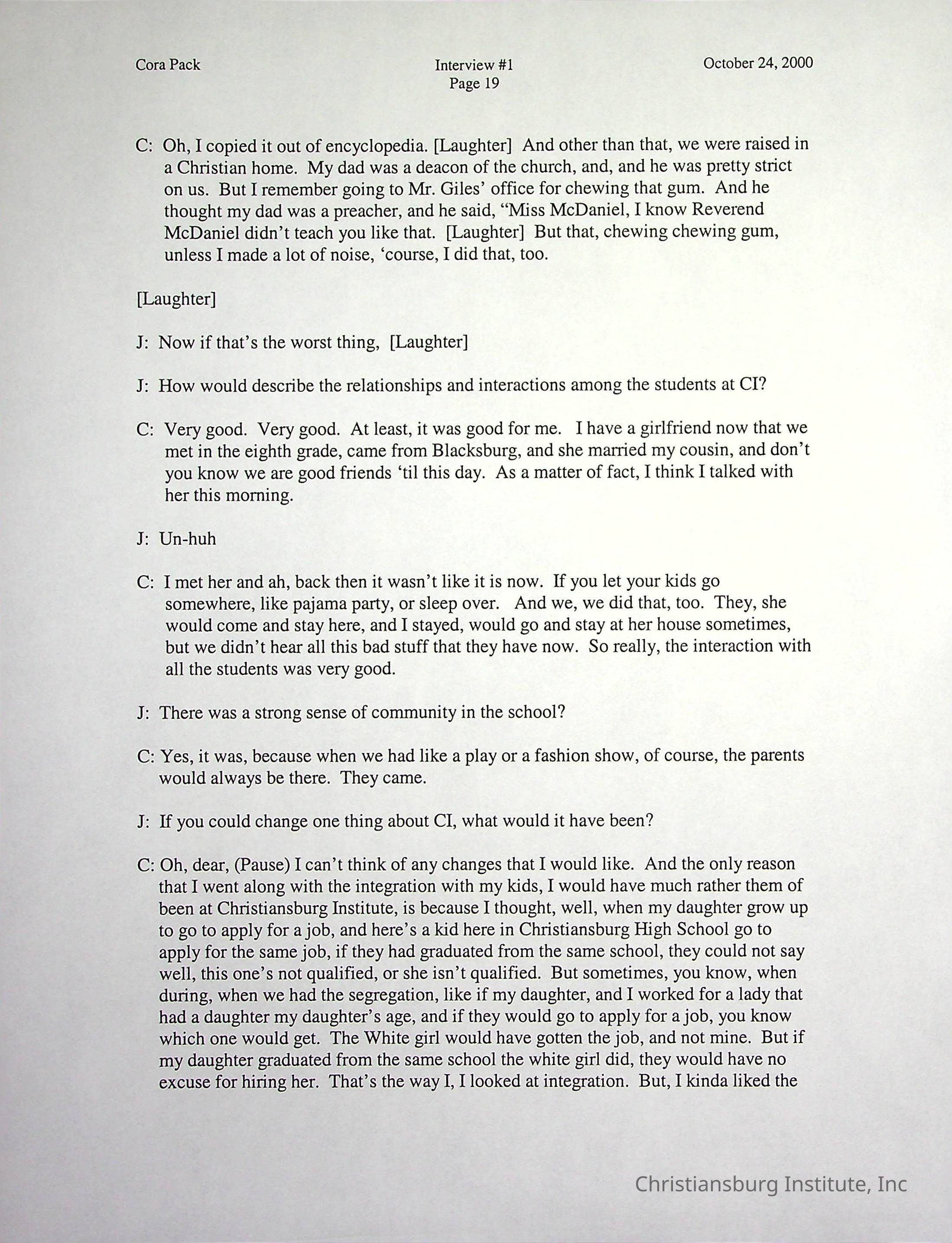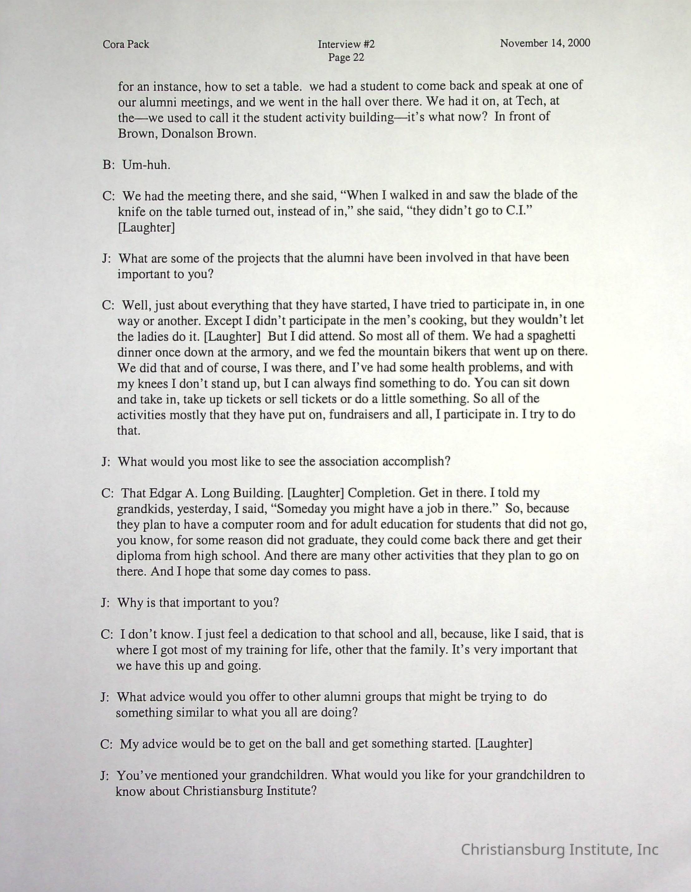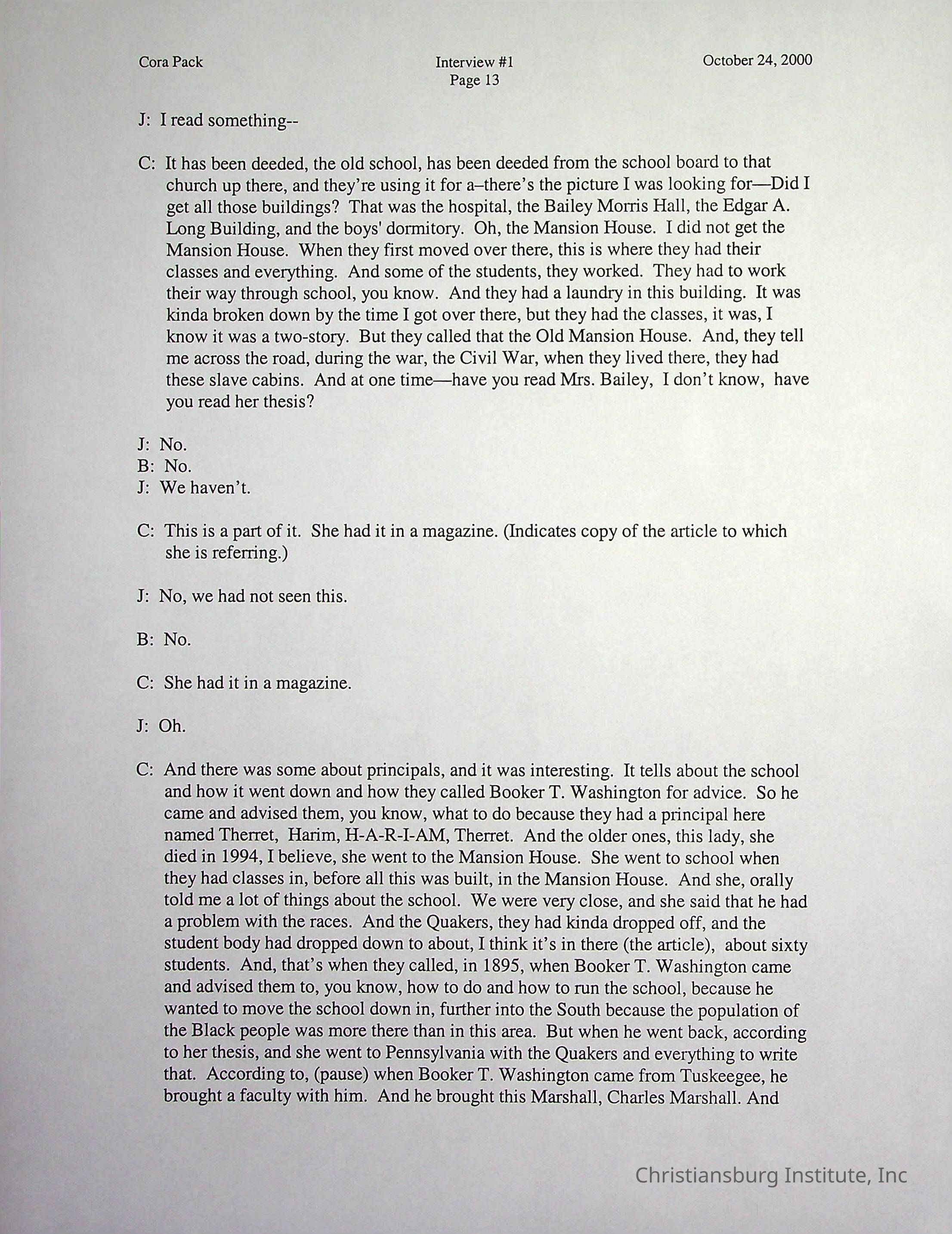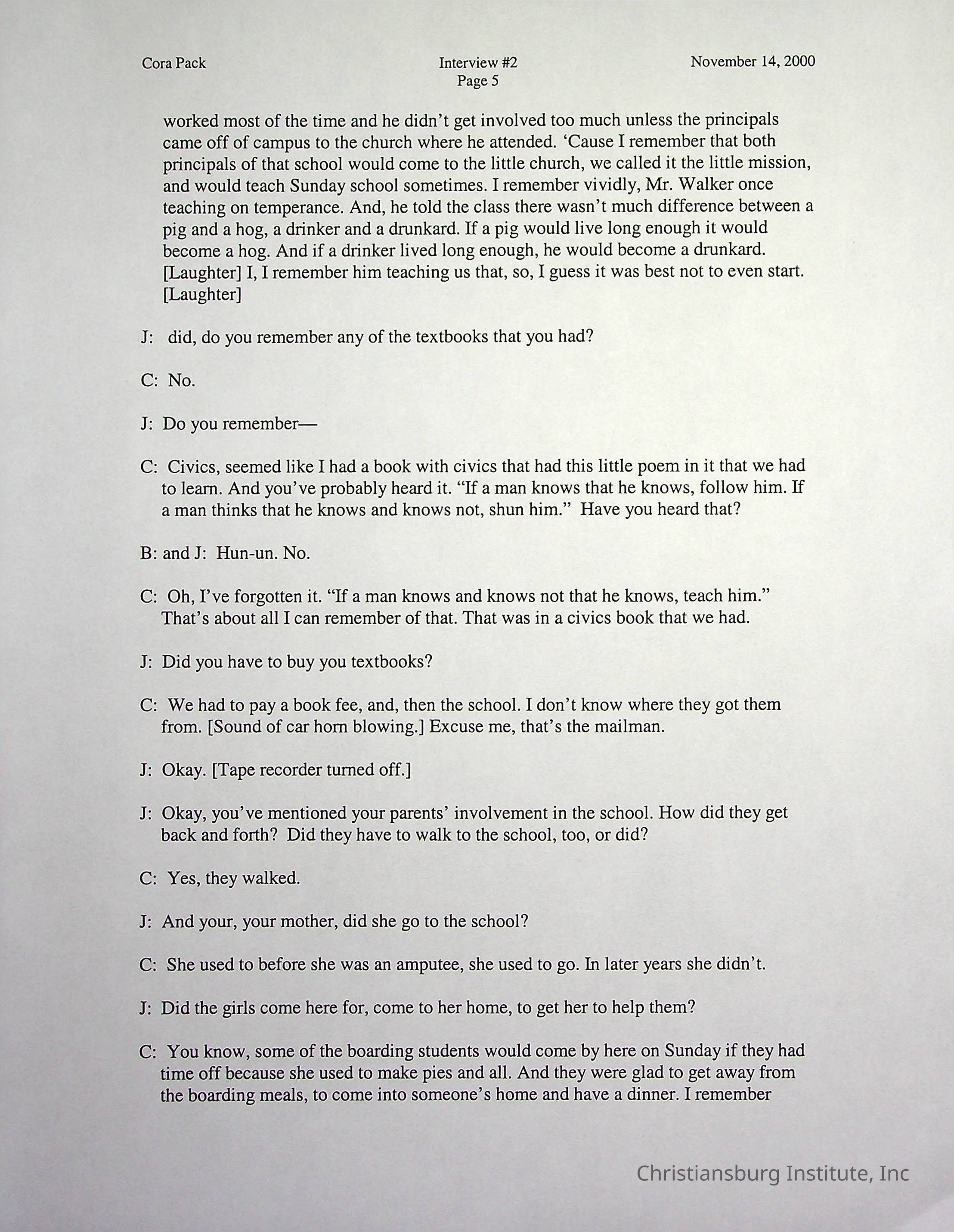 Two oral histories with Christiansburg Institute alumni, Cora Pack conducted by Jean Hamm on October 24th, 2000 and November 14th, 2000.Creator
