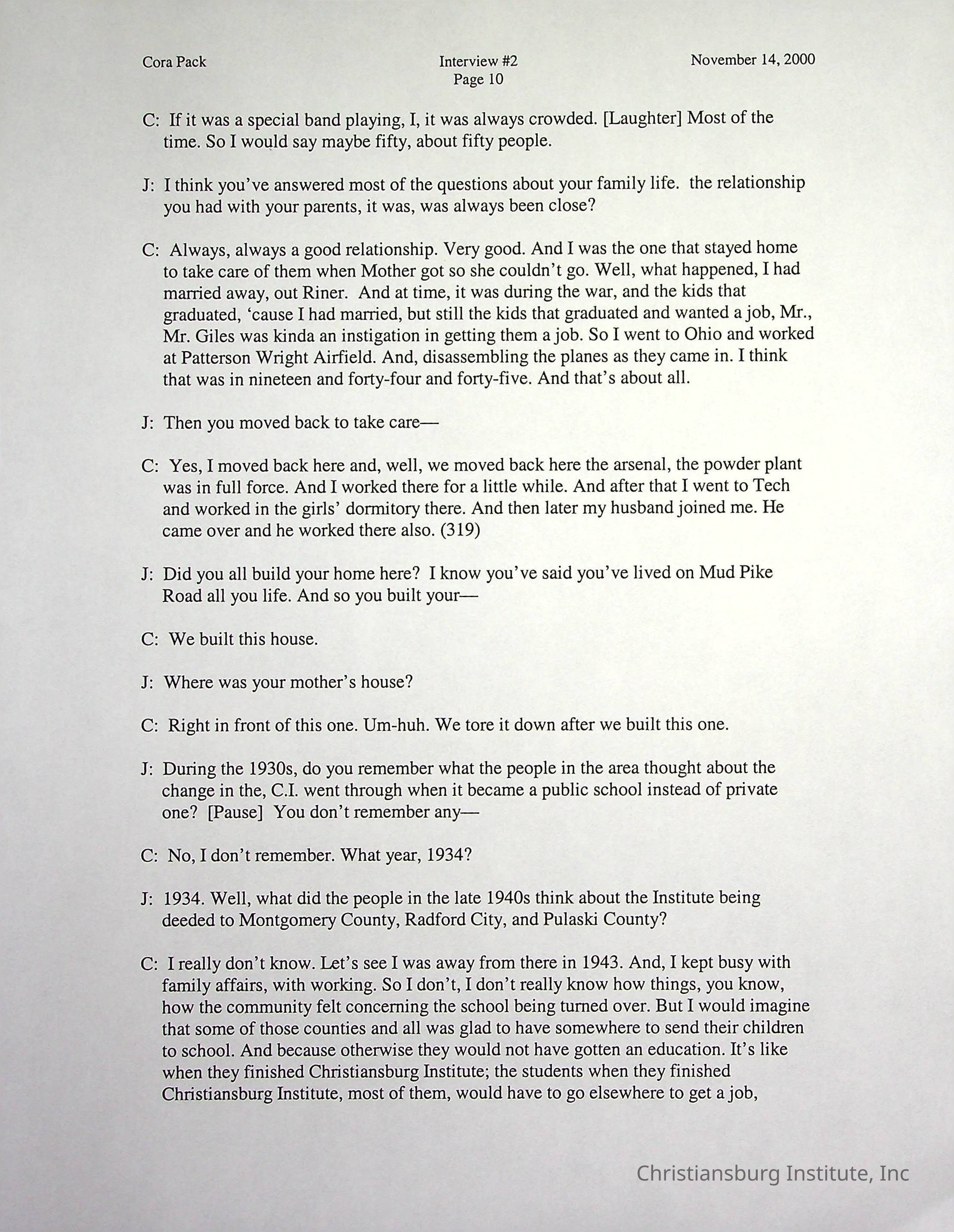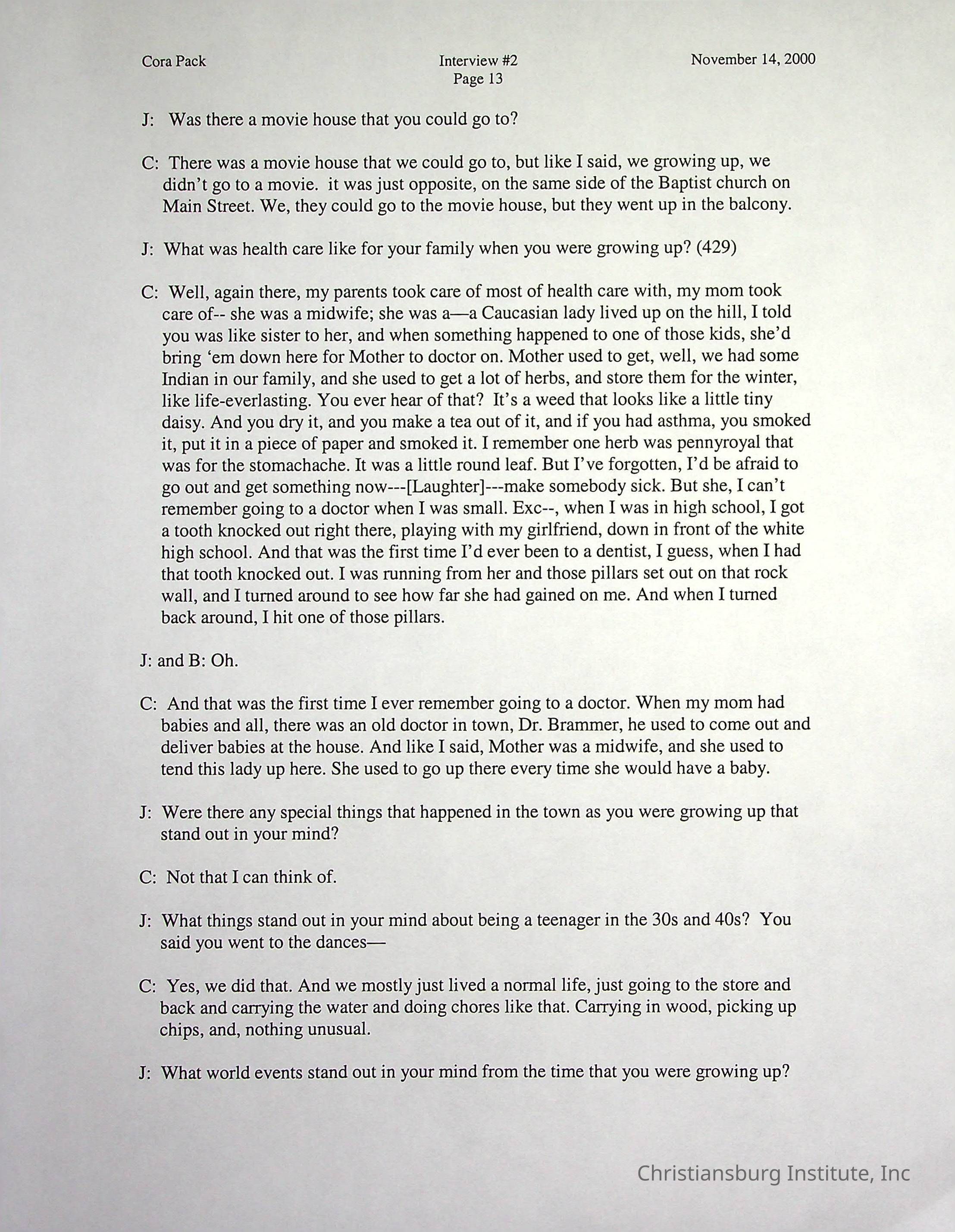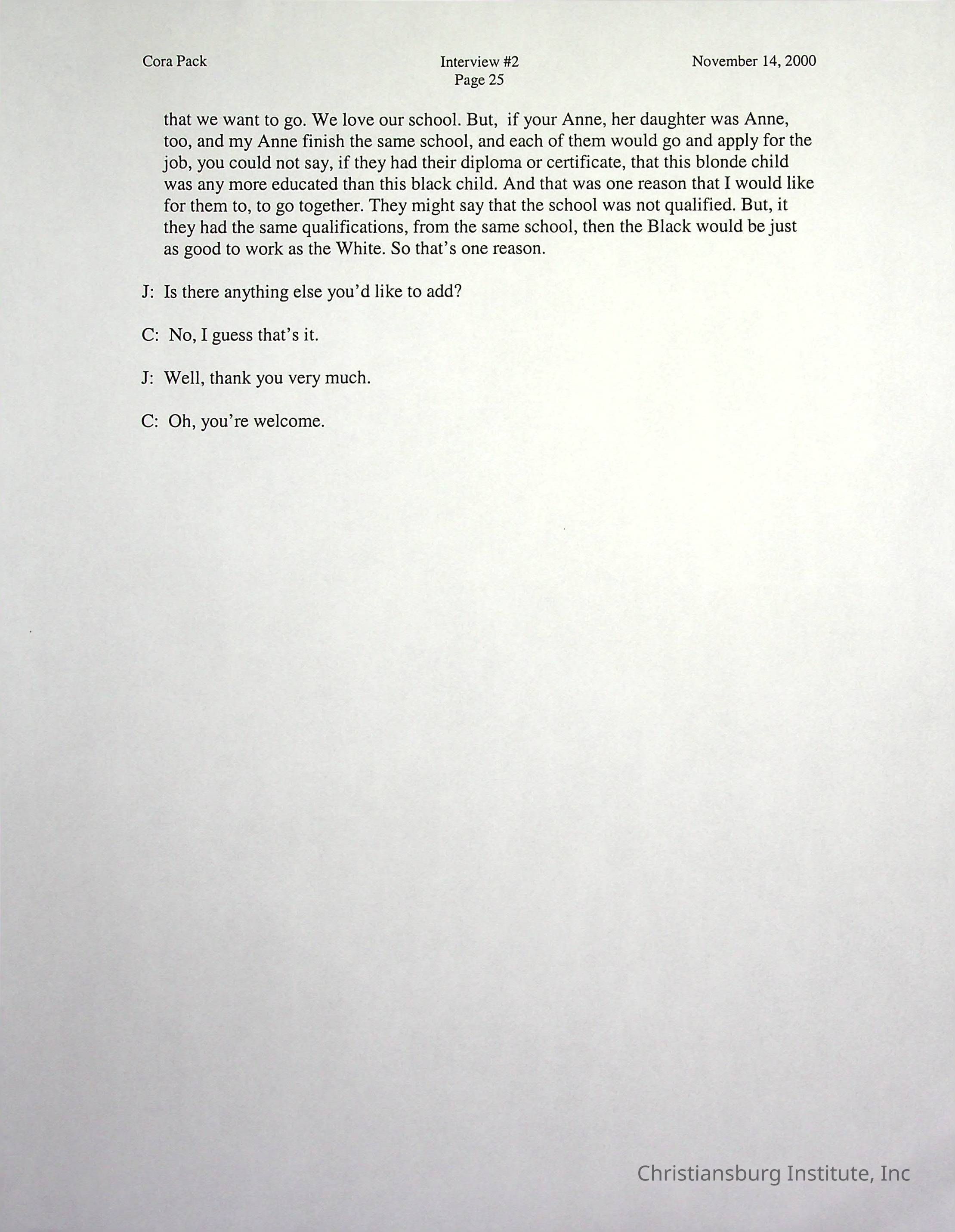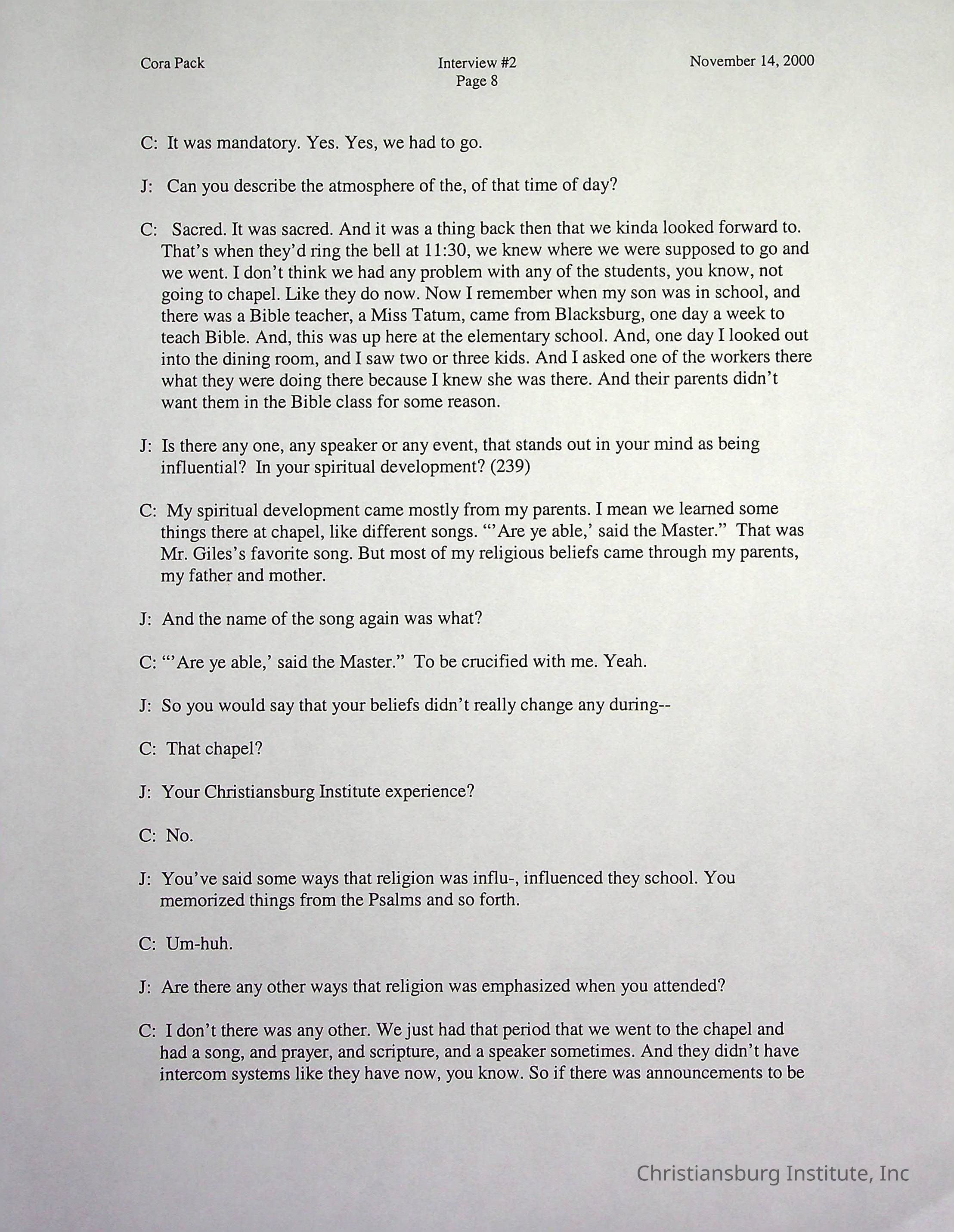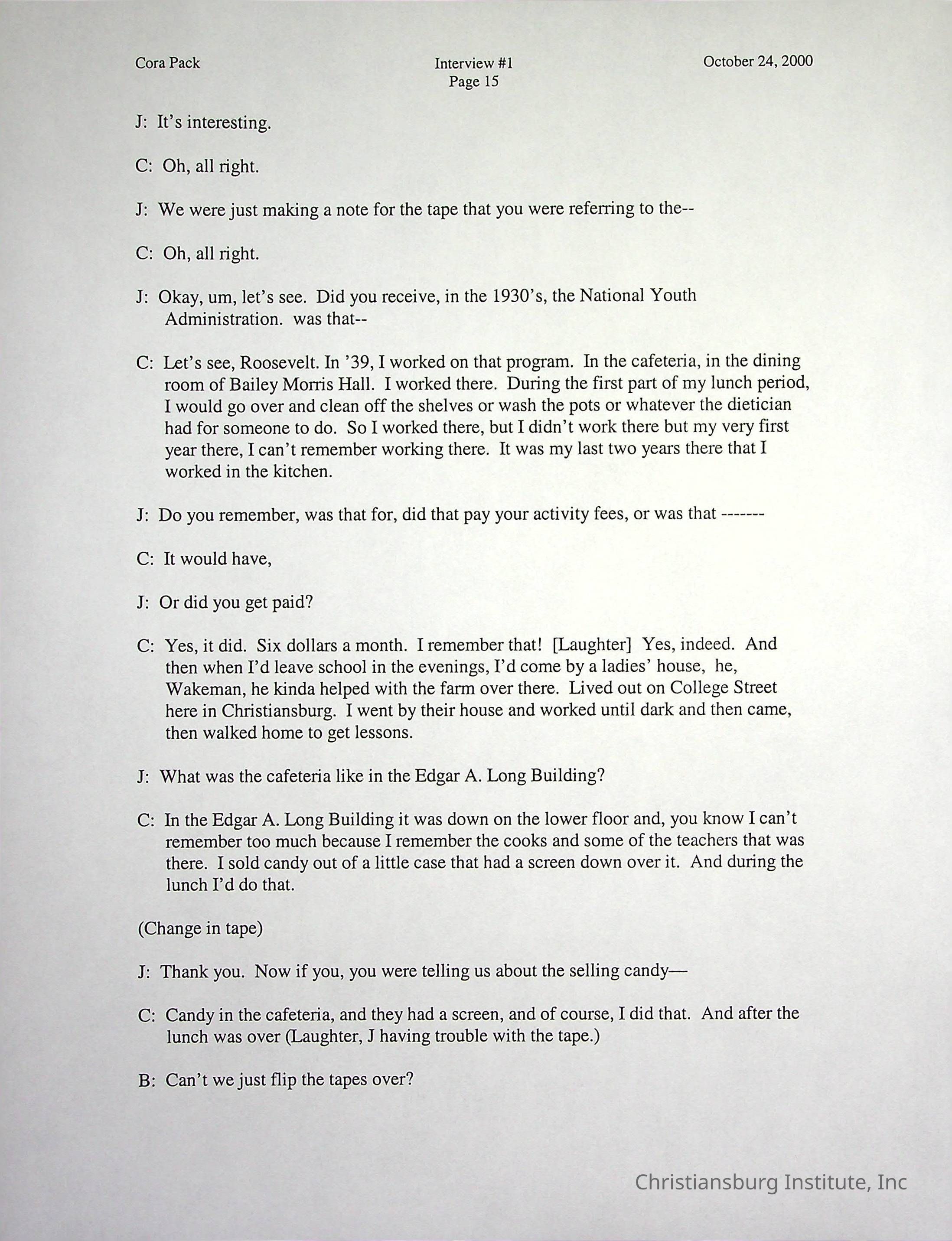 Two oral histories with Christiansburg Institute alumni, Cora Pack conducted by Jean Hamm on October 24th, 2000 and November 14th, 2000.Creator
