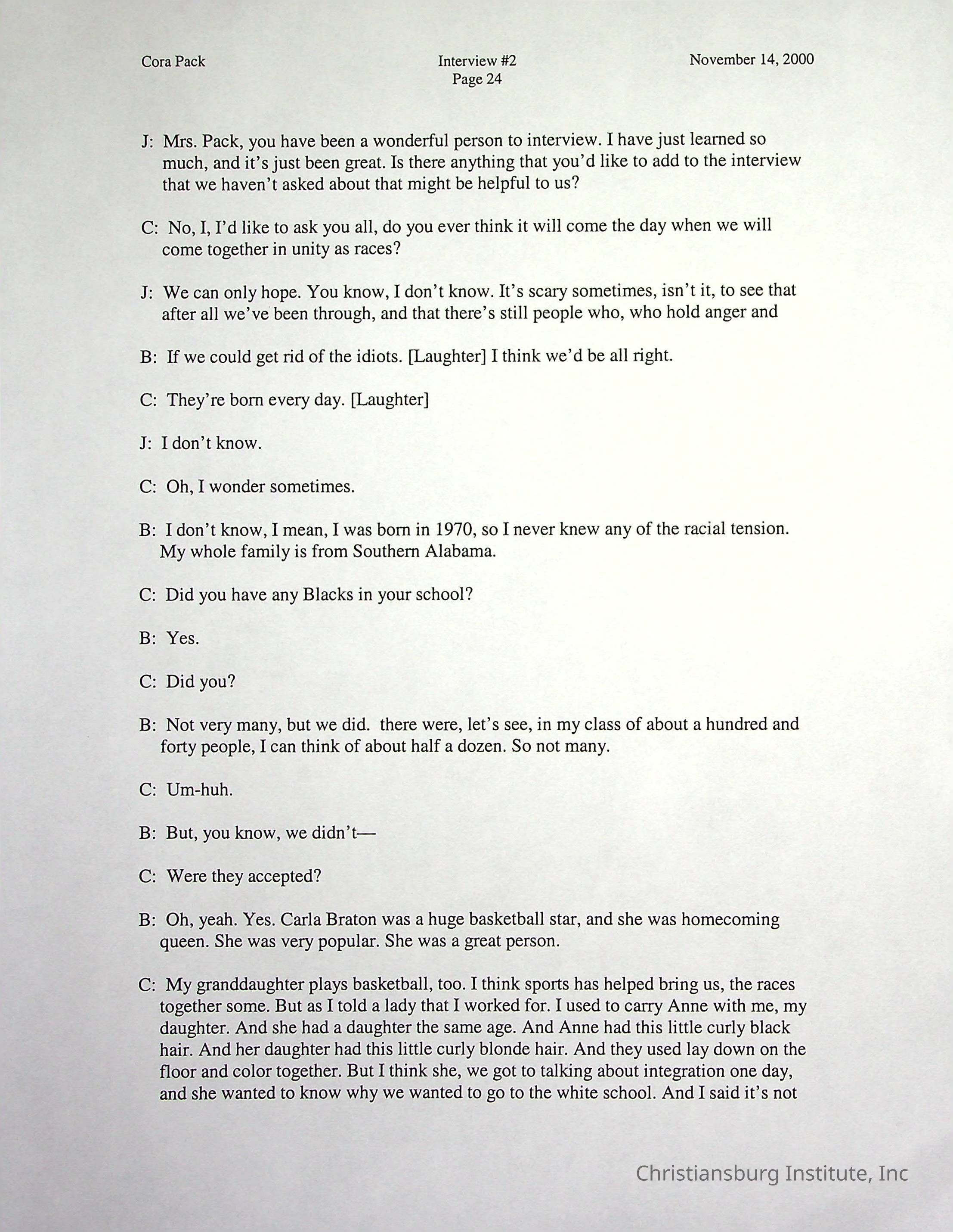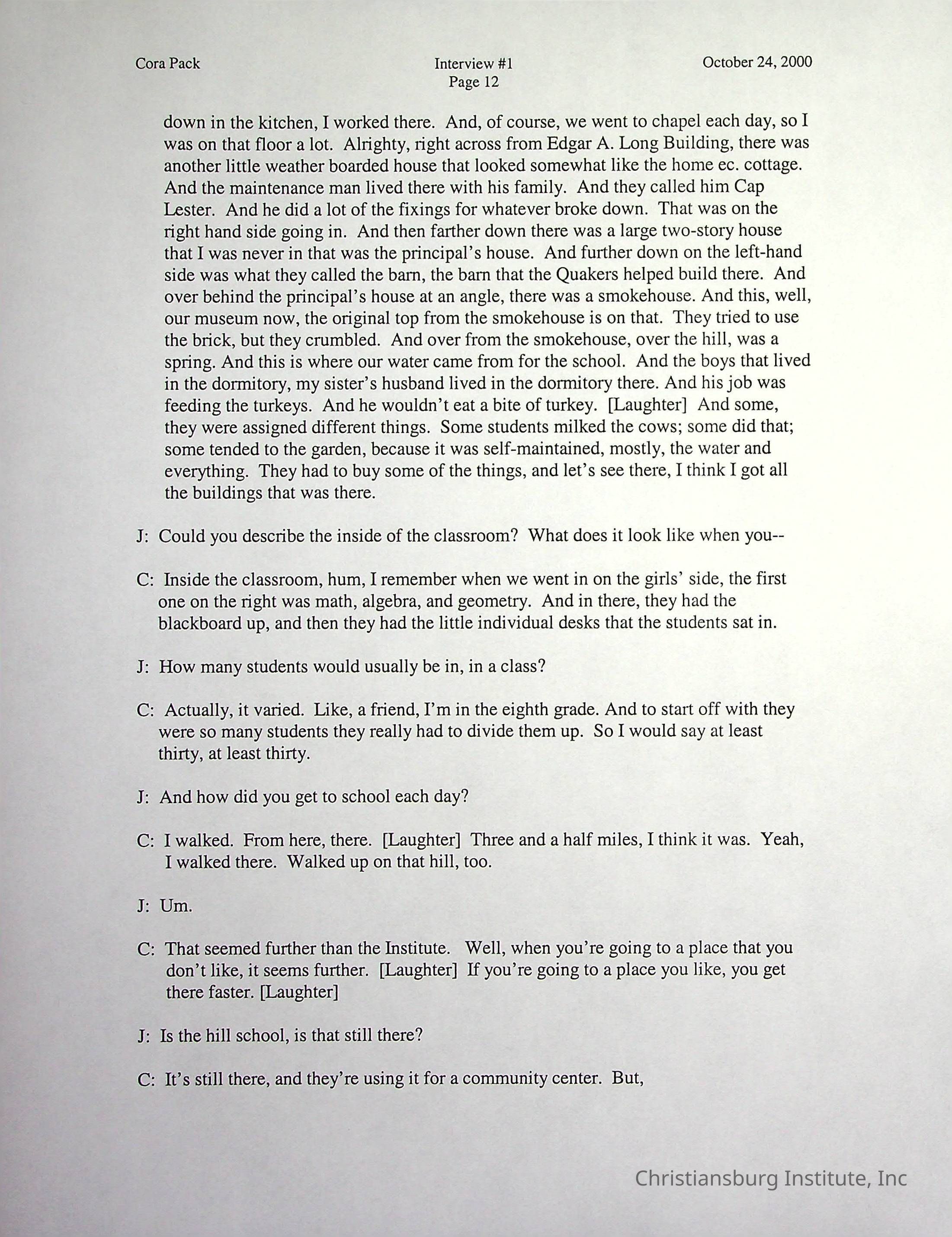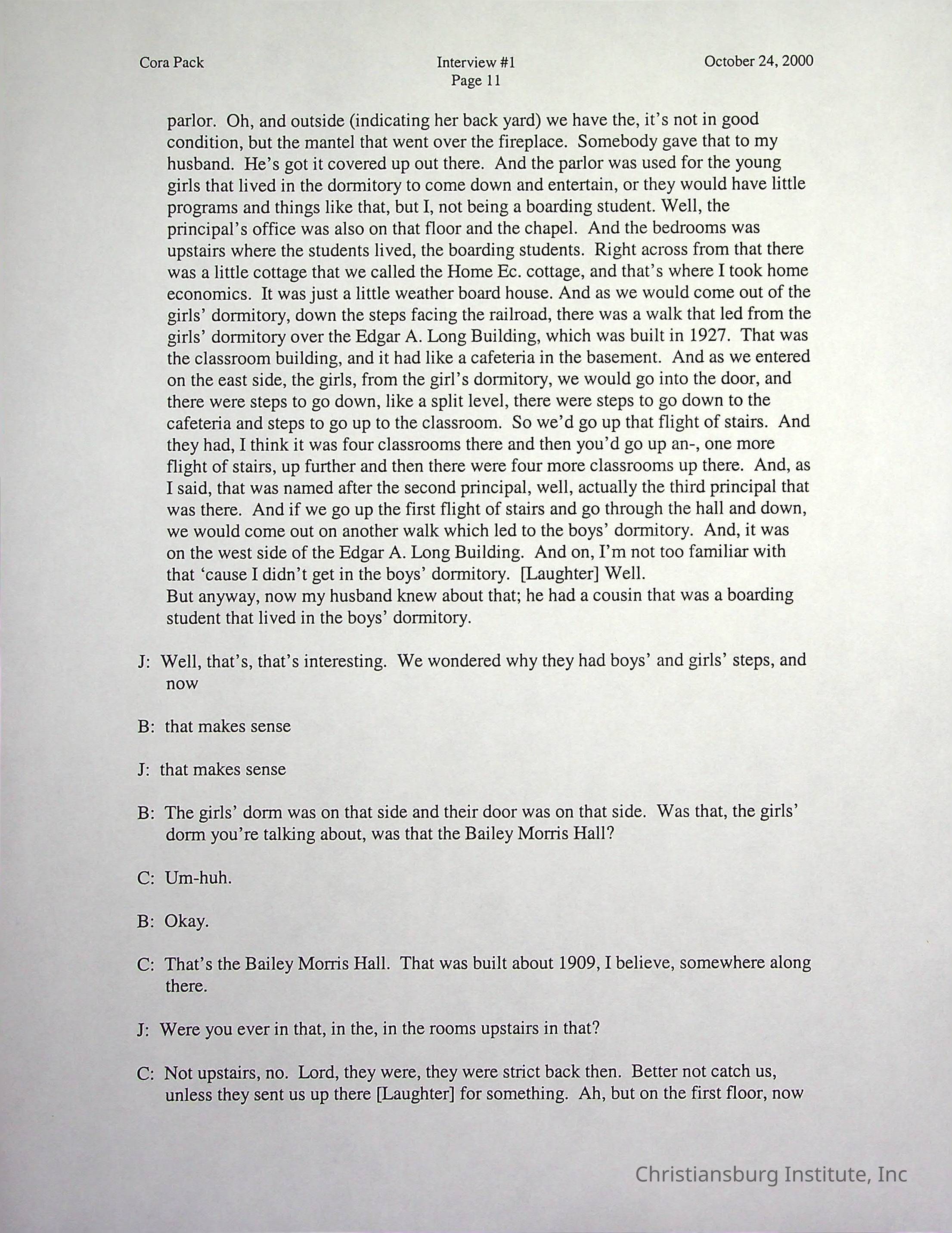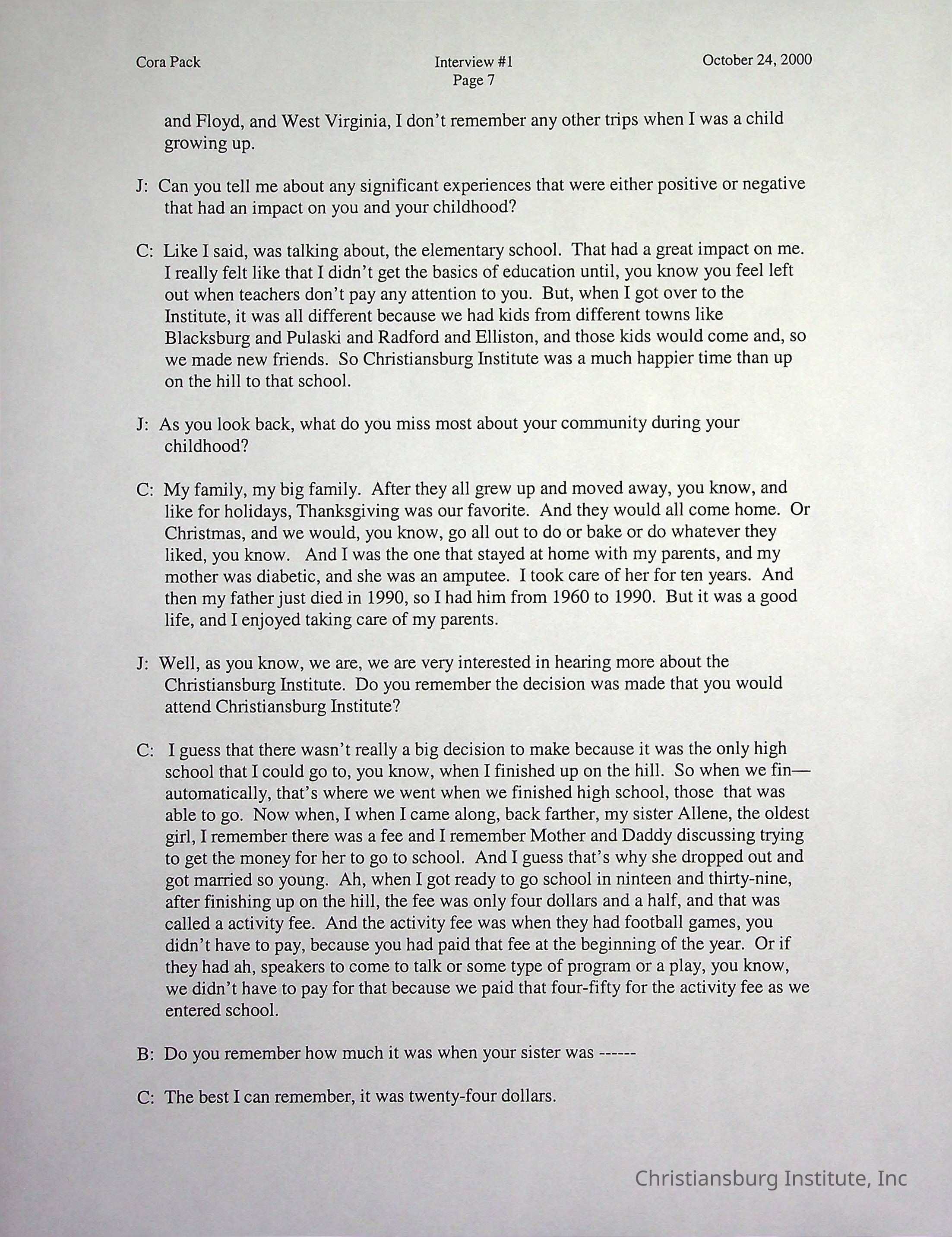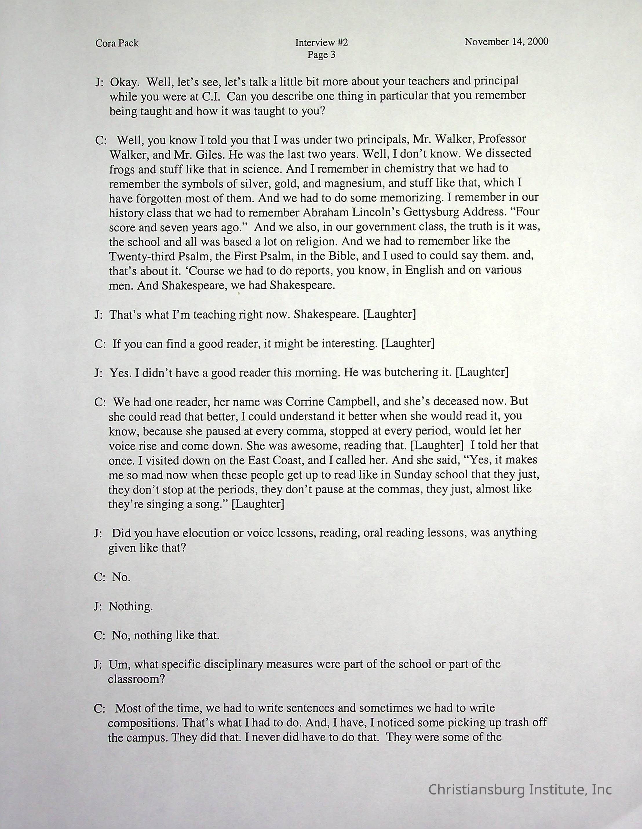 Two oral histories with Christiansburg Institute alumni, Cora Pack conducted by Jean Hamm on October 24th, 2000 and November 14th, 2000.Creator
