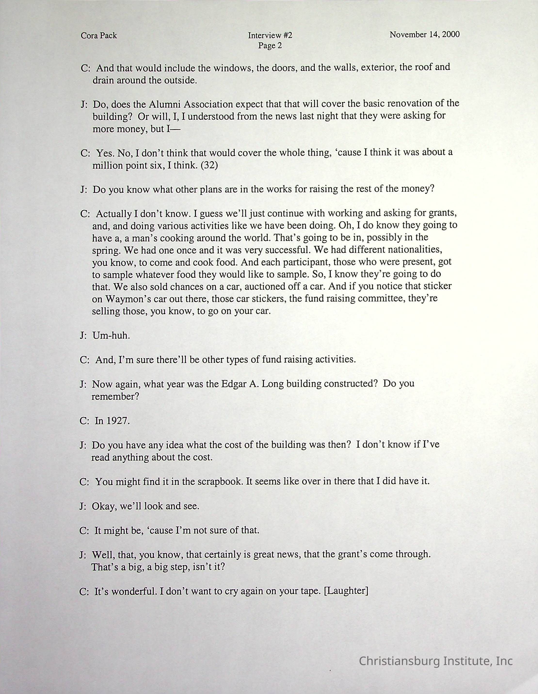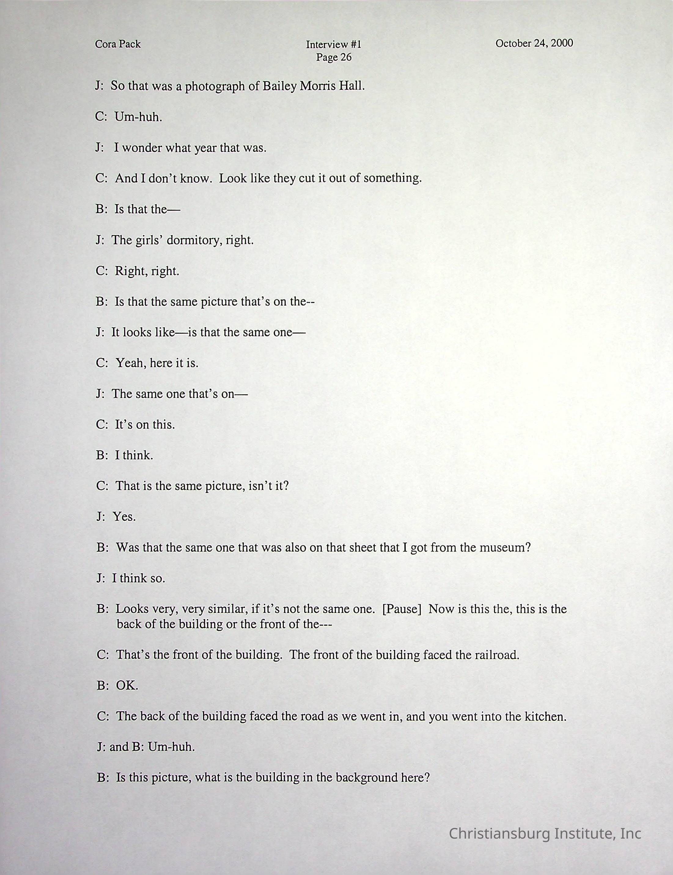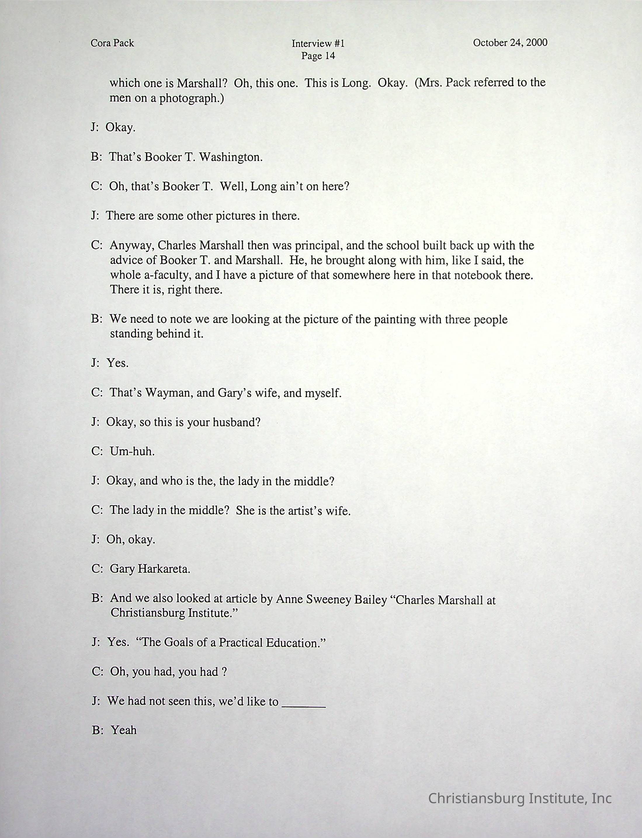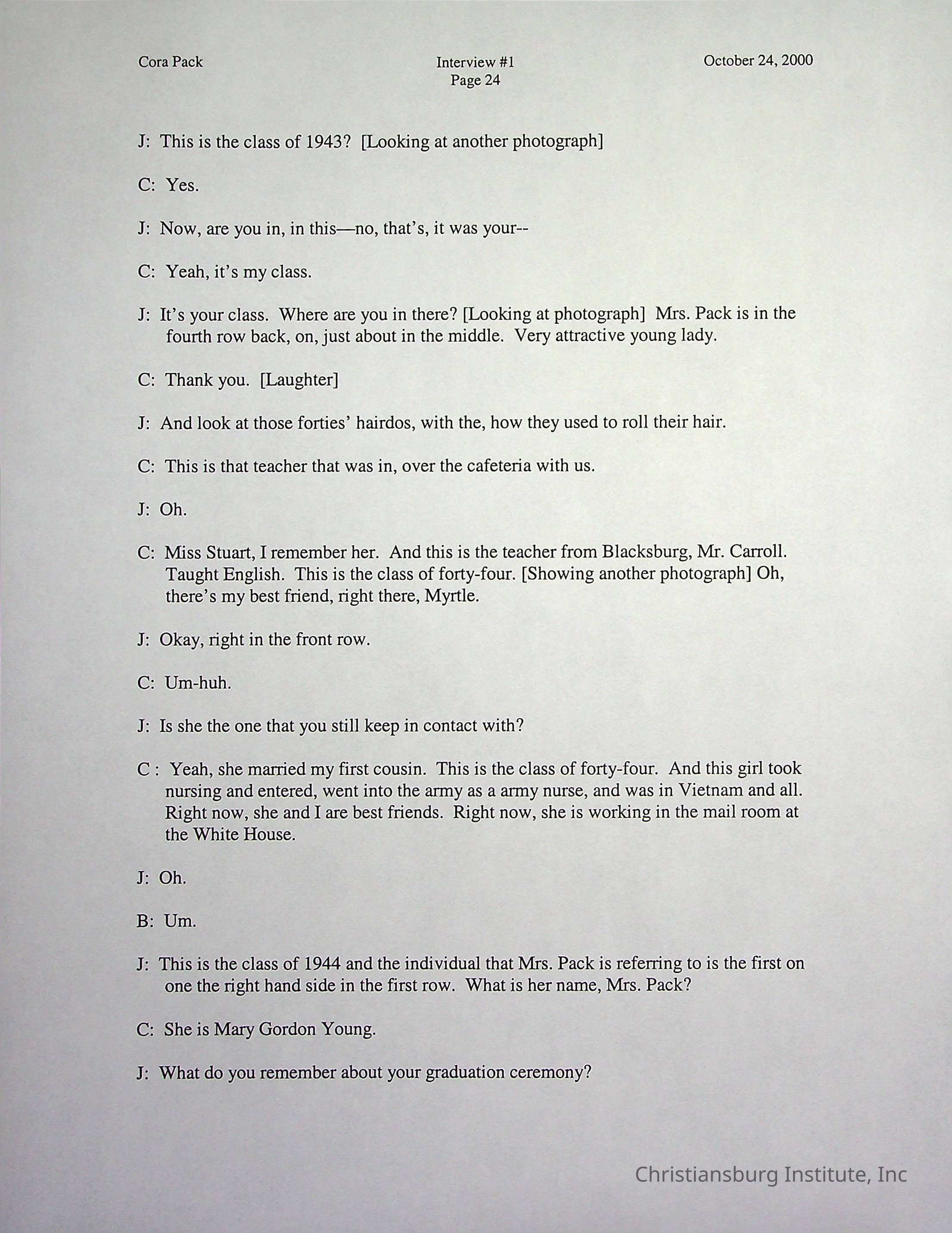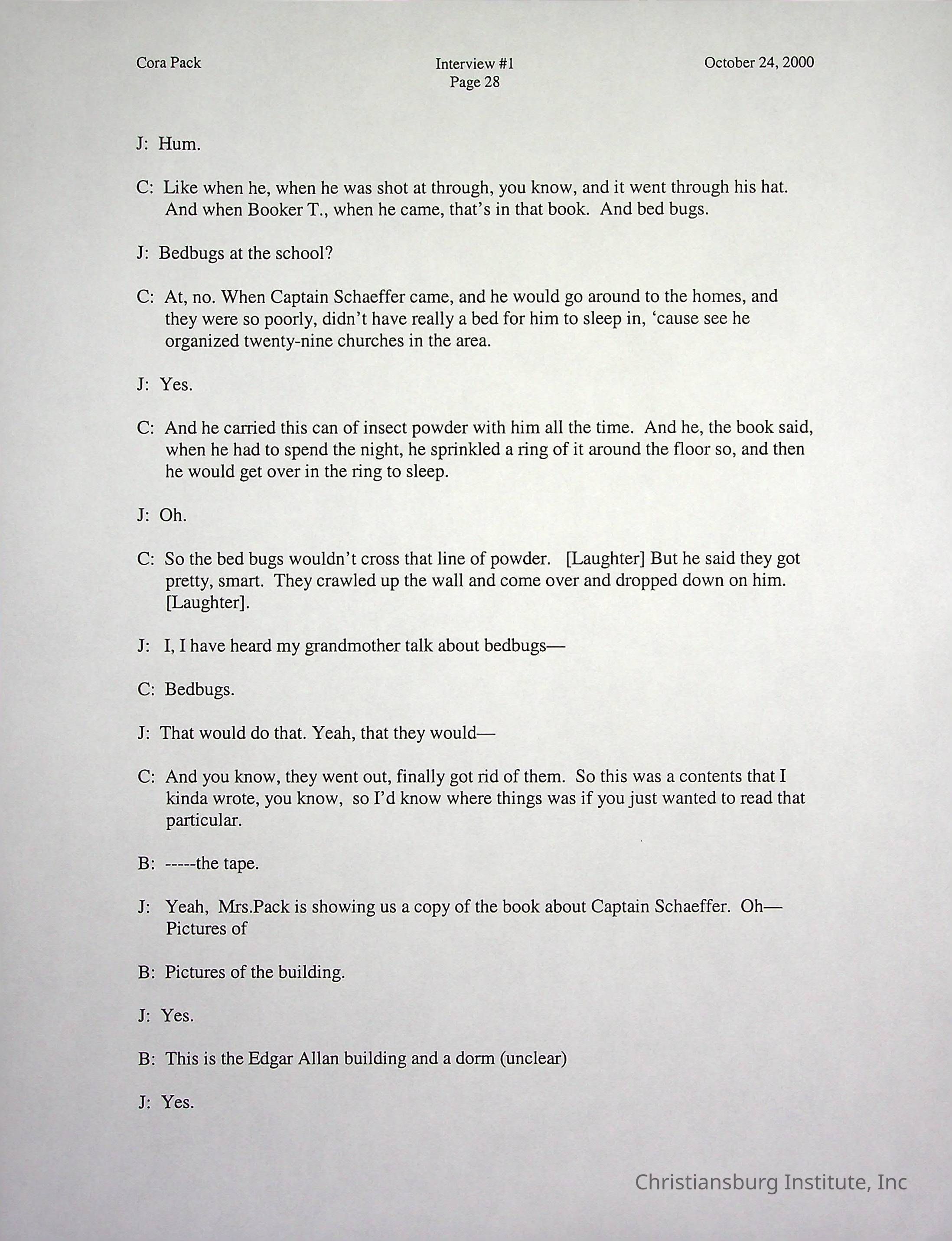 Two oral histories with Christiansburg Institute alumni, Cora Pack conducted by Jean Hamm on October 24th, 2000 and November 14th, 2000.Creator