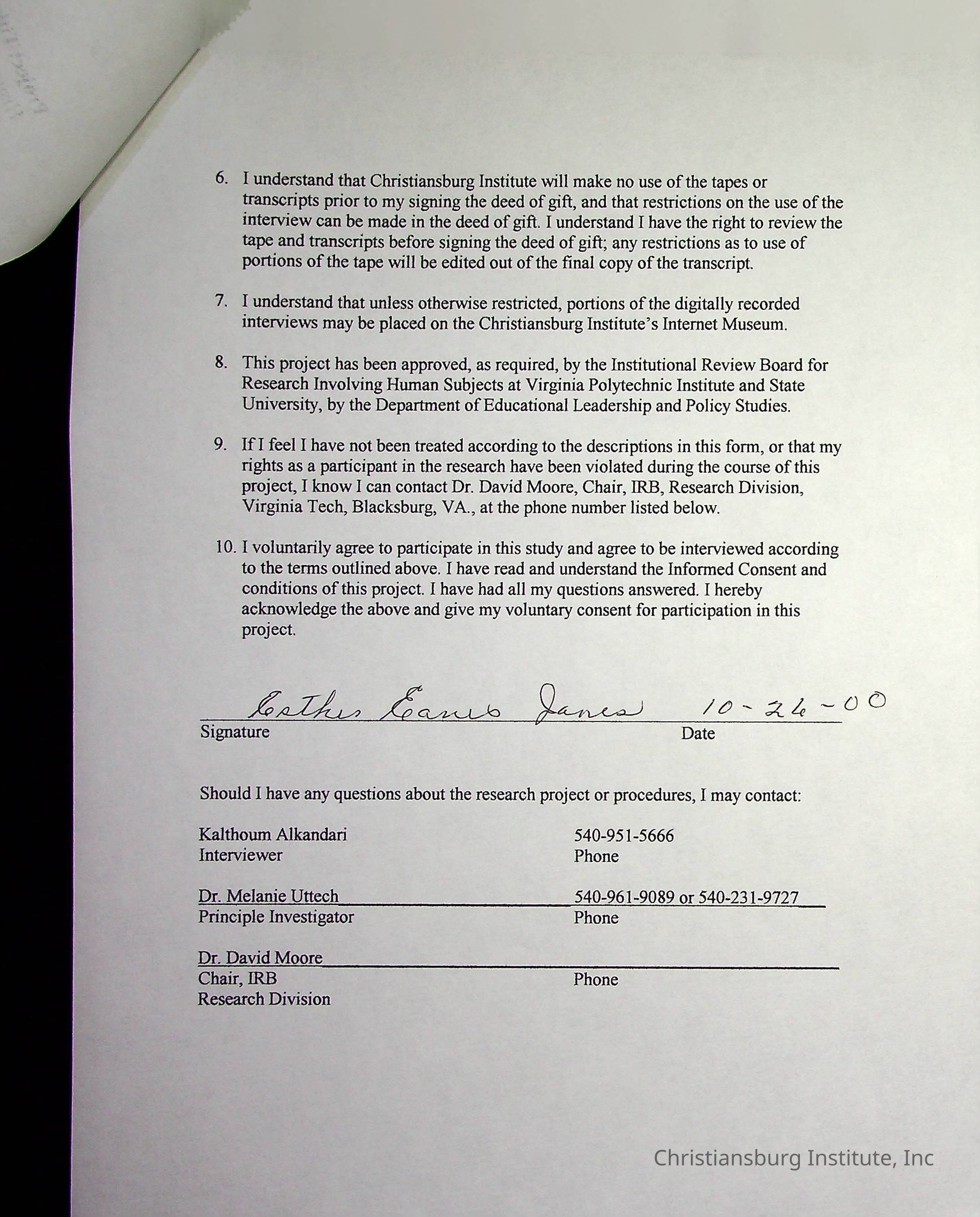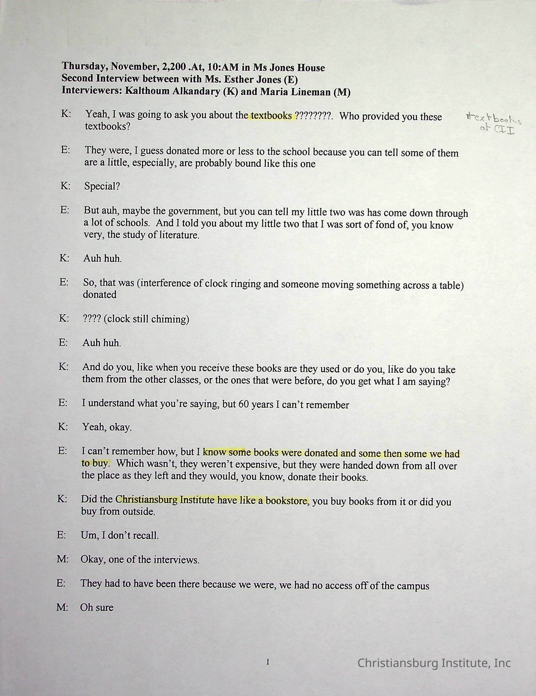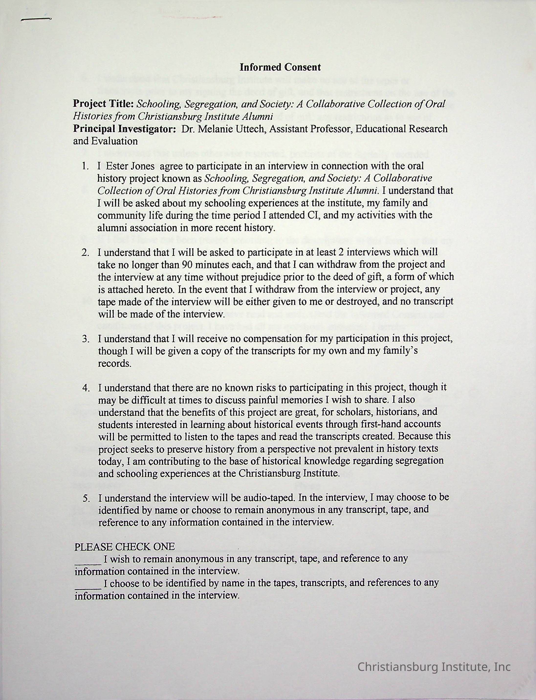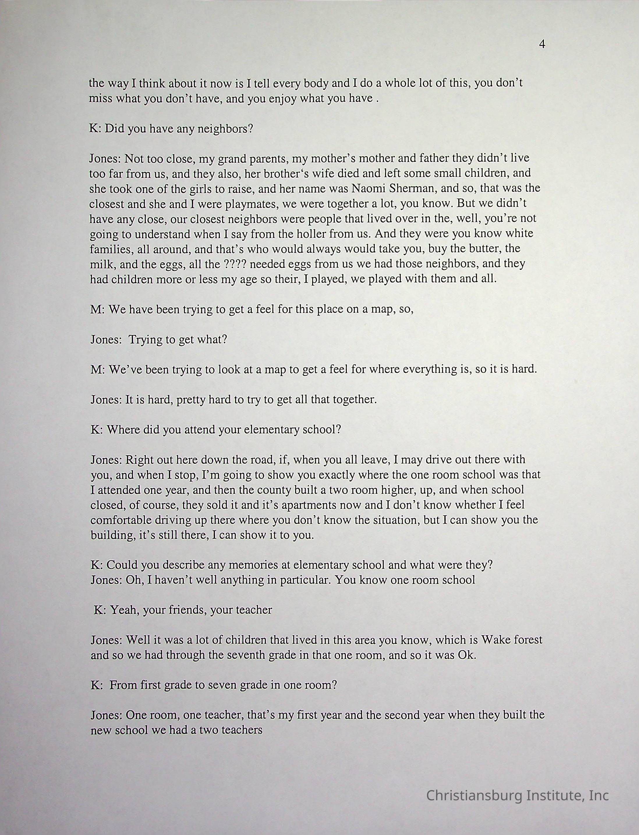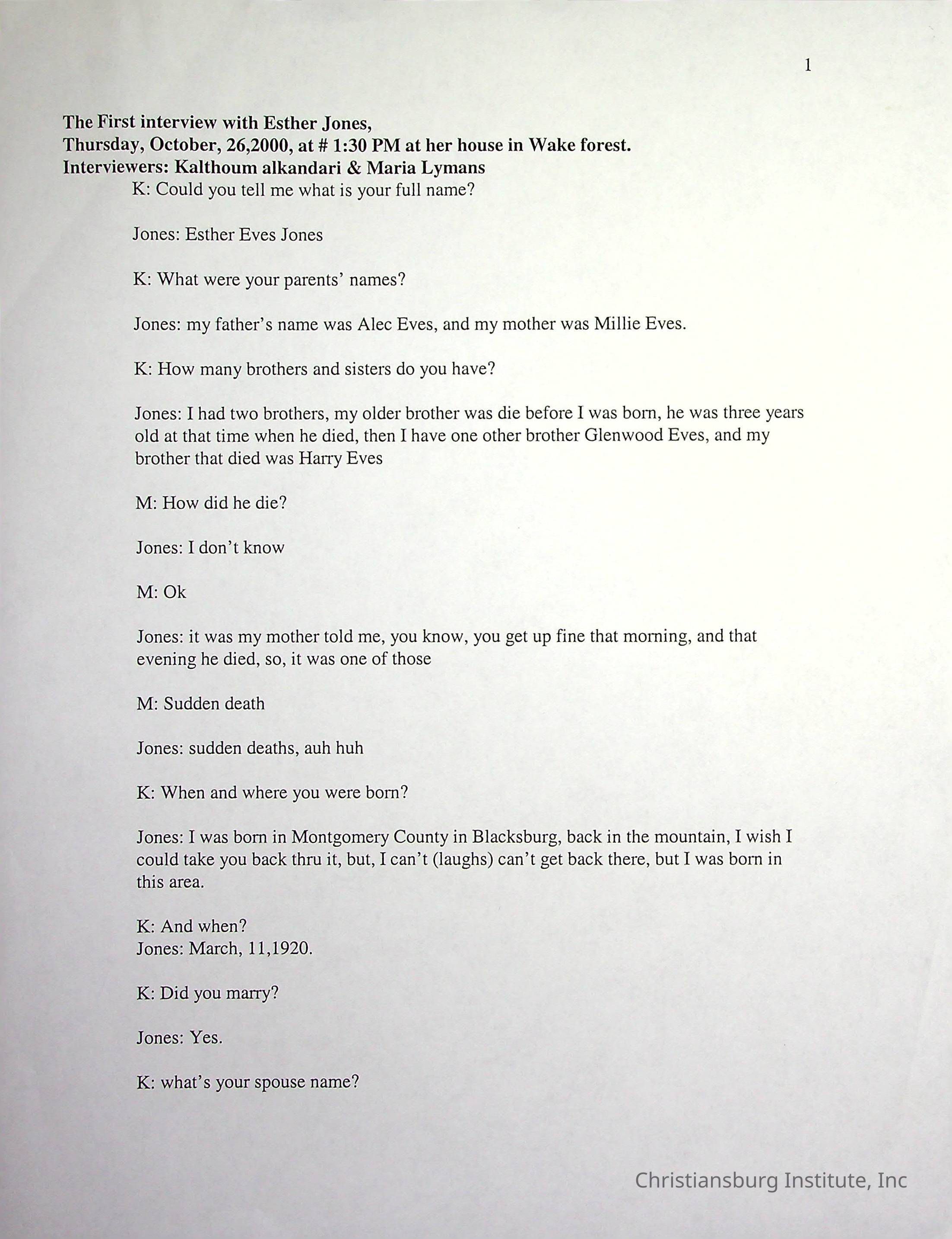 An oral history with Christiansburg Institute alumni, Esther Jones conducted by Kalthoum Alkandari and Maria Lymans on October 26th, 2000 and a second interview conducted on November 52nd, 2000.Collection