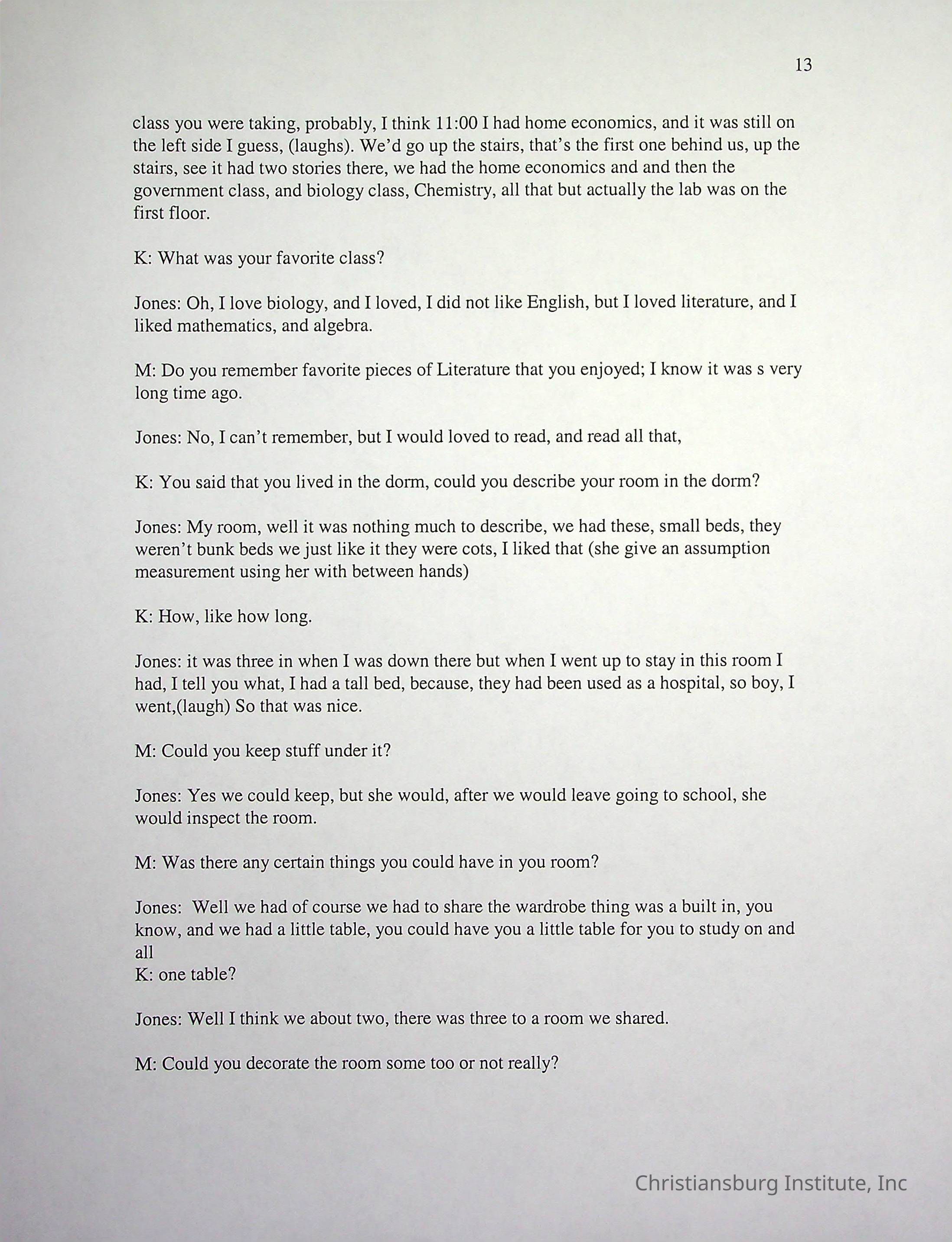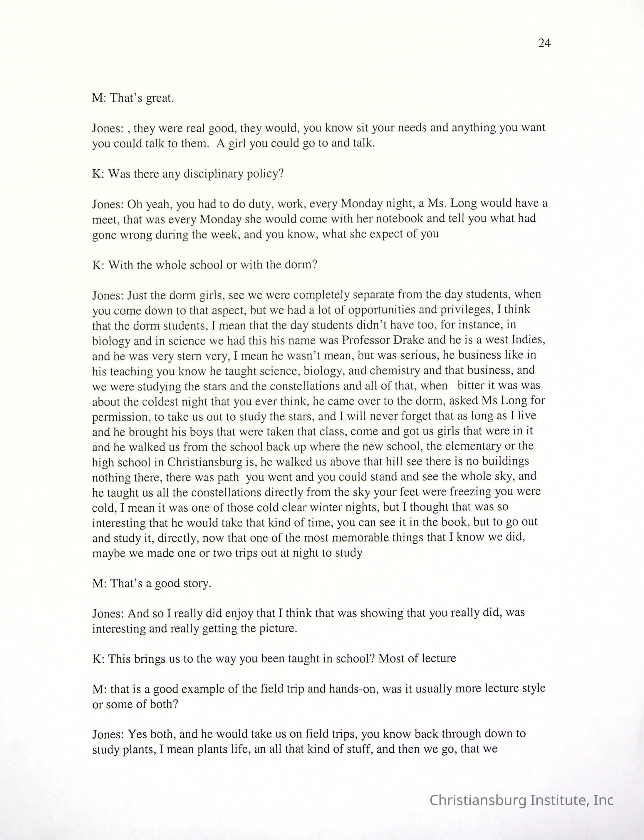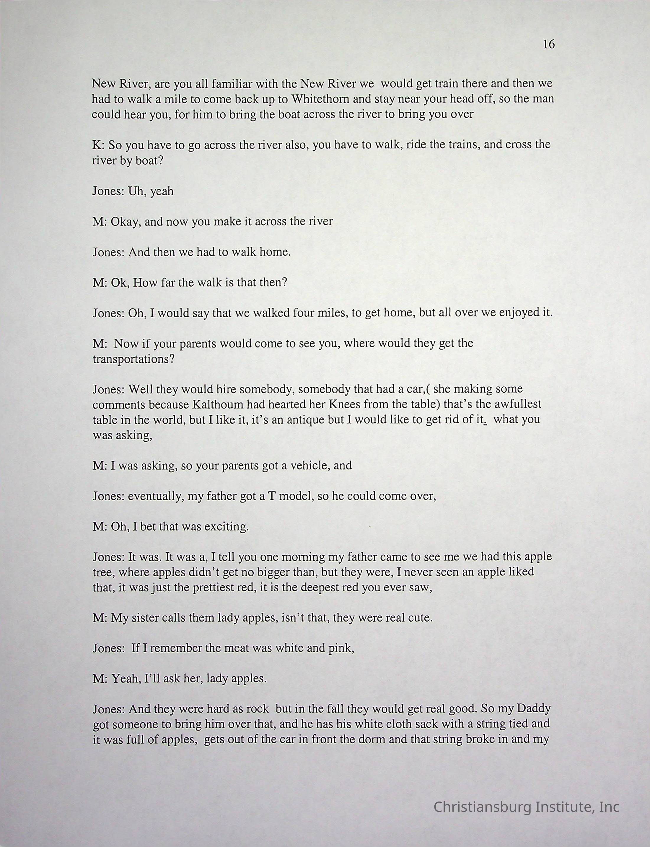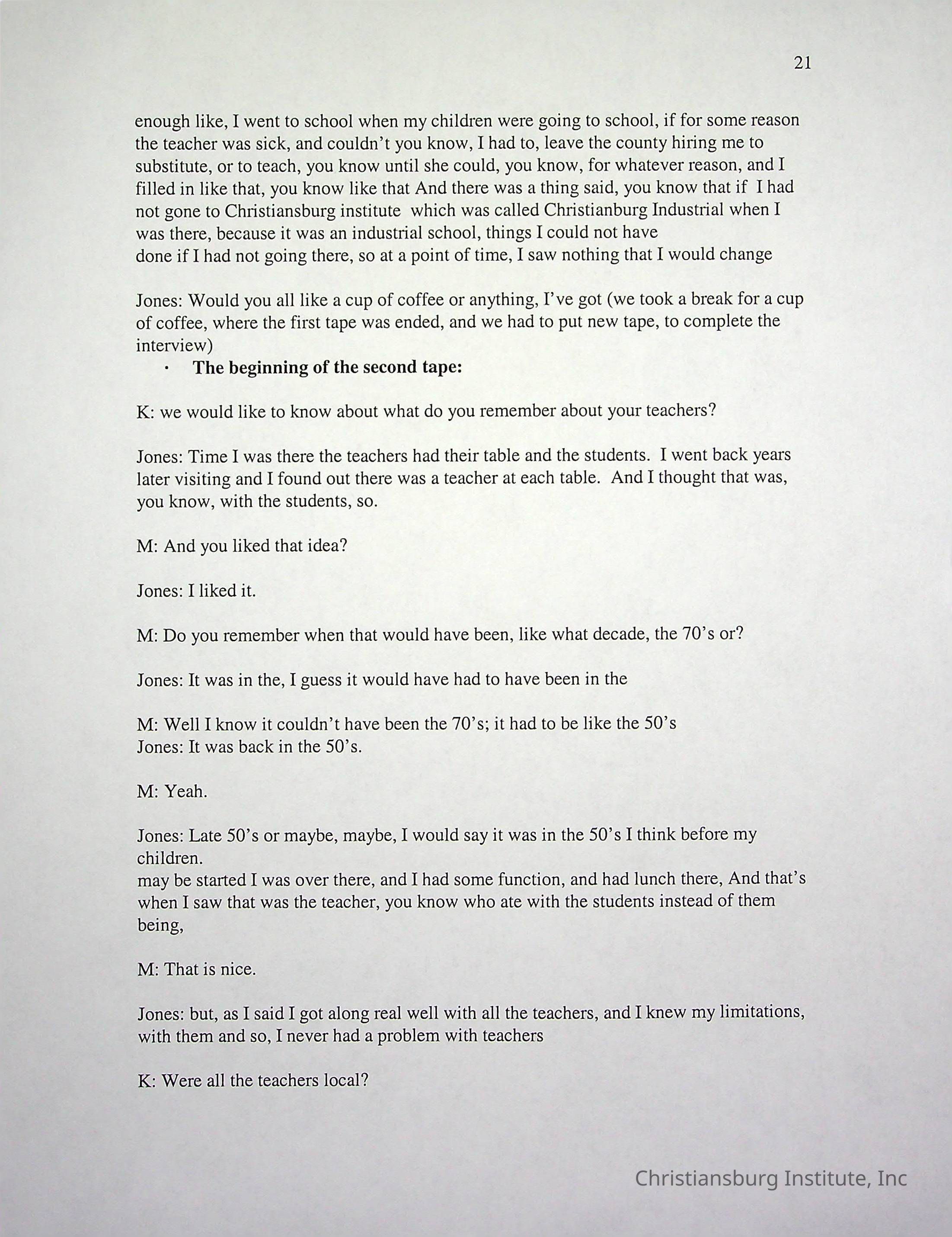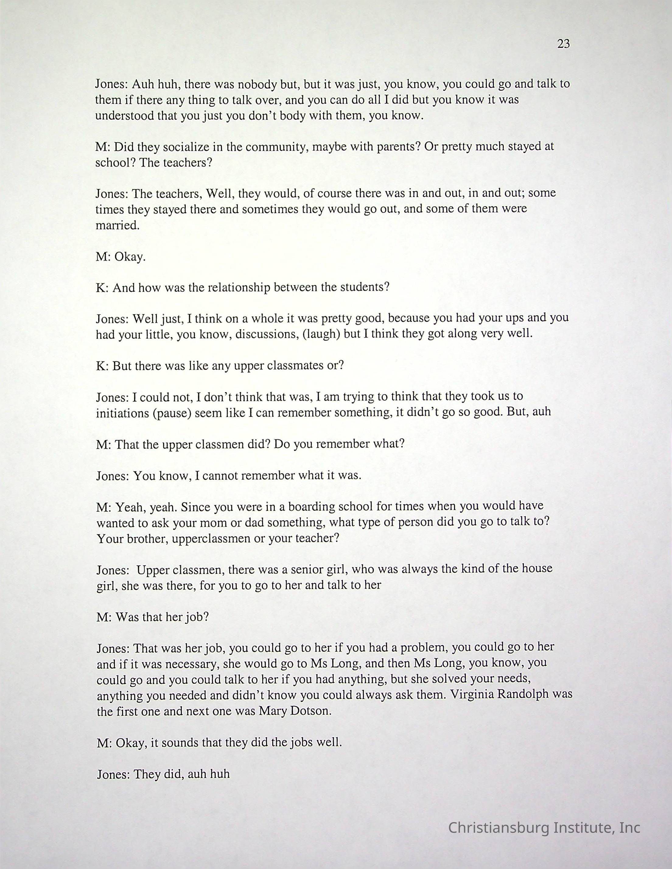 An oral history with Christiansburg Institute alumni, Esther Jones conducted by Kalthoum Alkandari and Maria Lymans on October 26th, 2000 and a second interview conducted on November 52nd, 2000.Collection