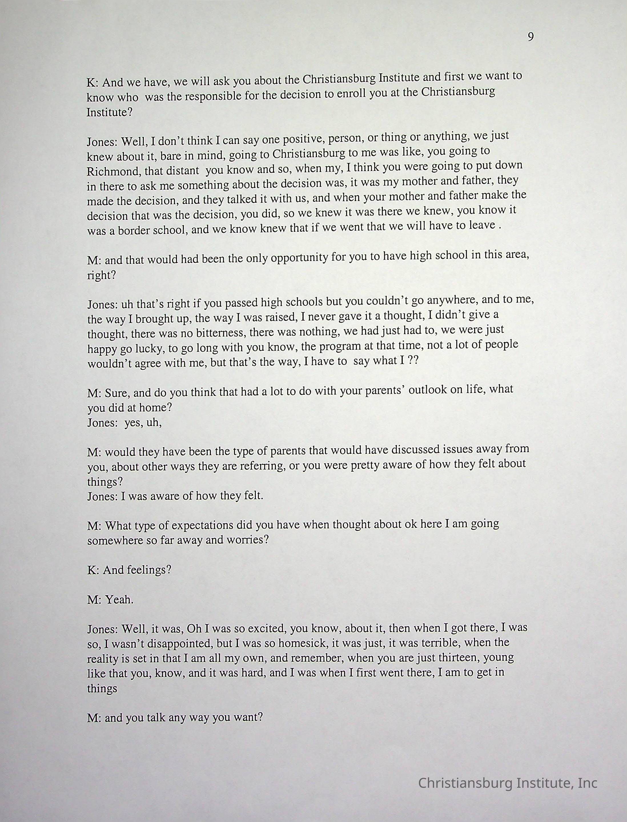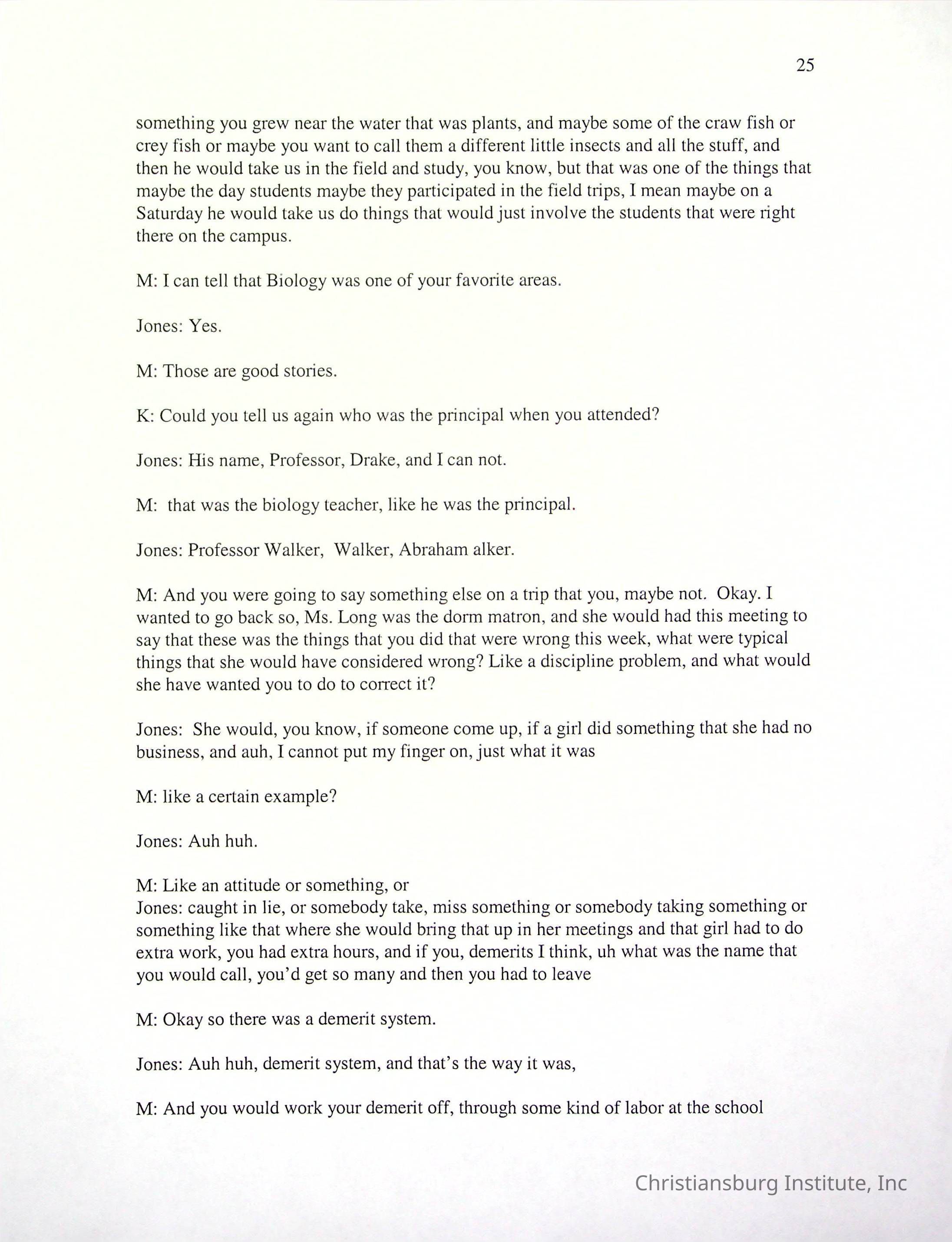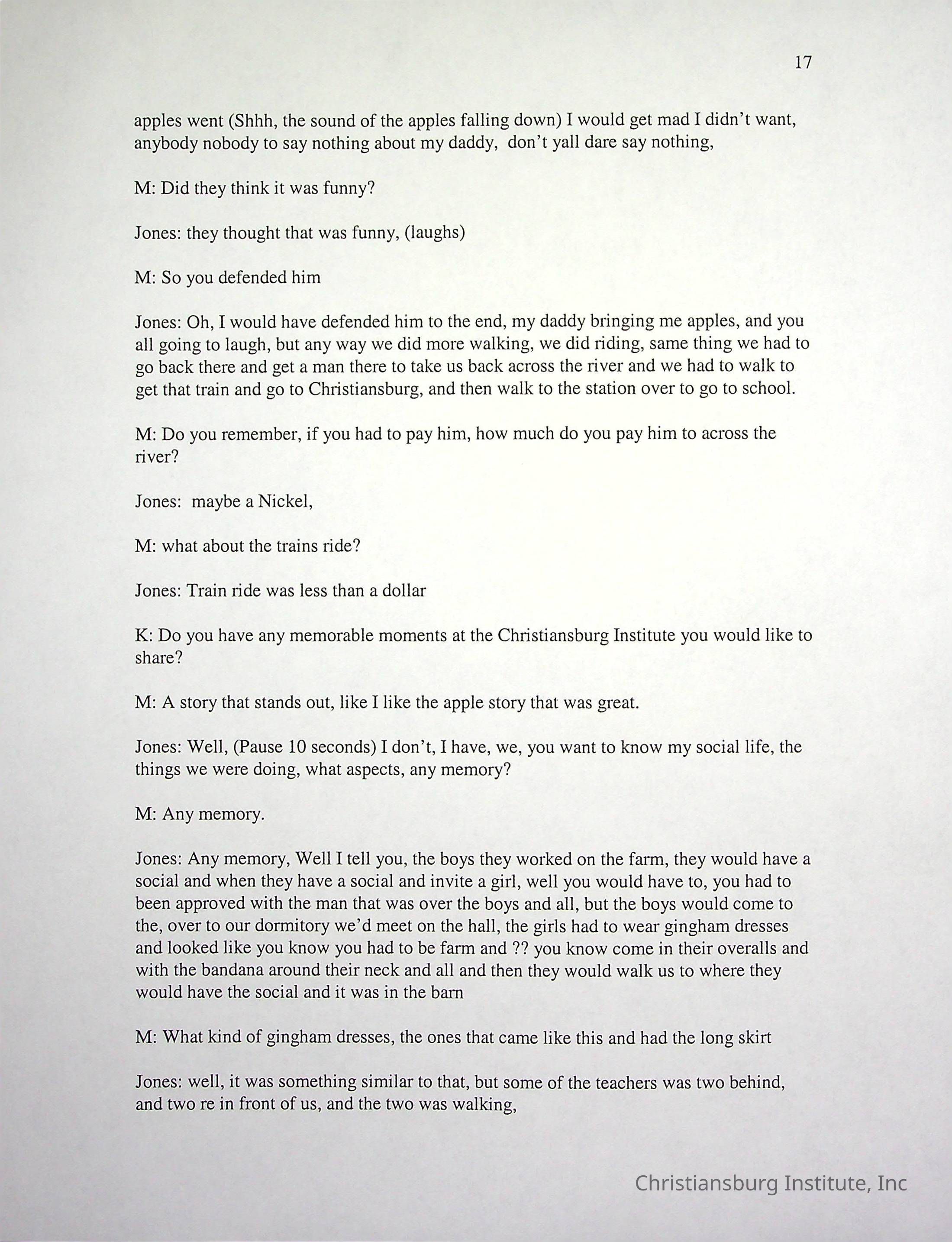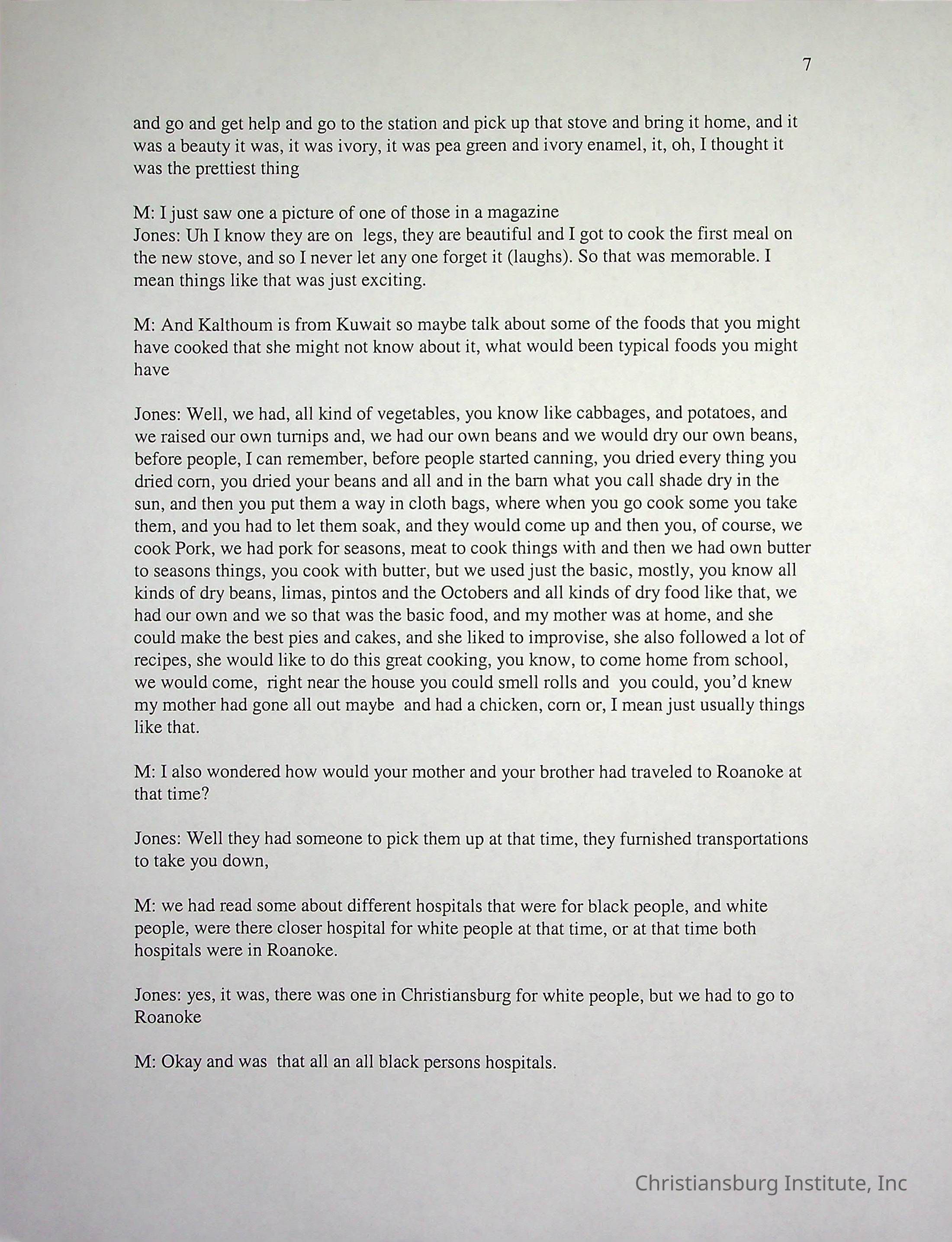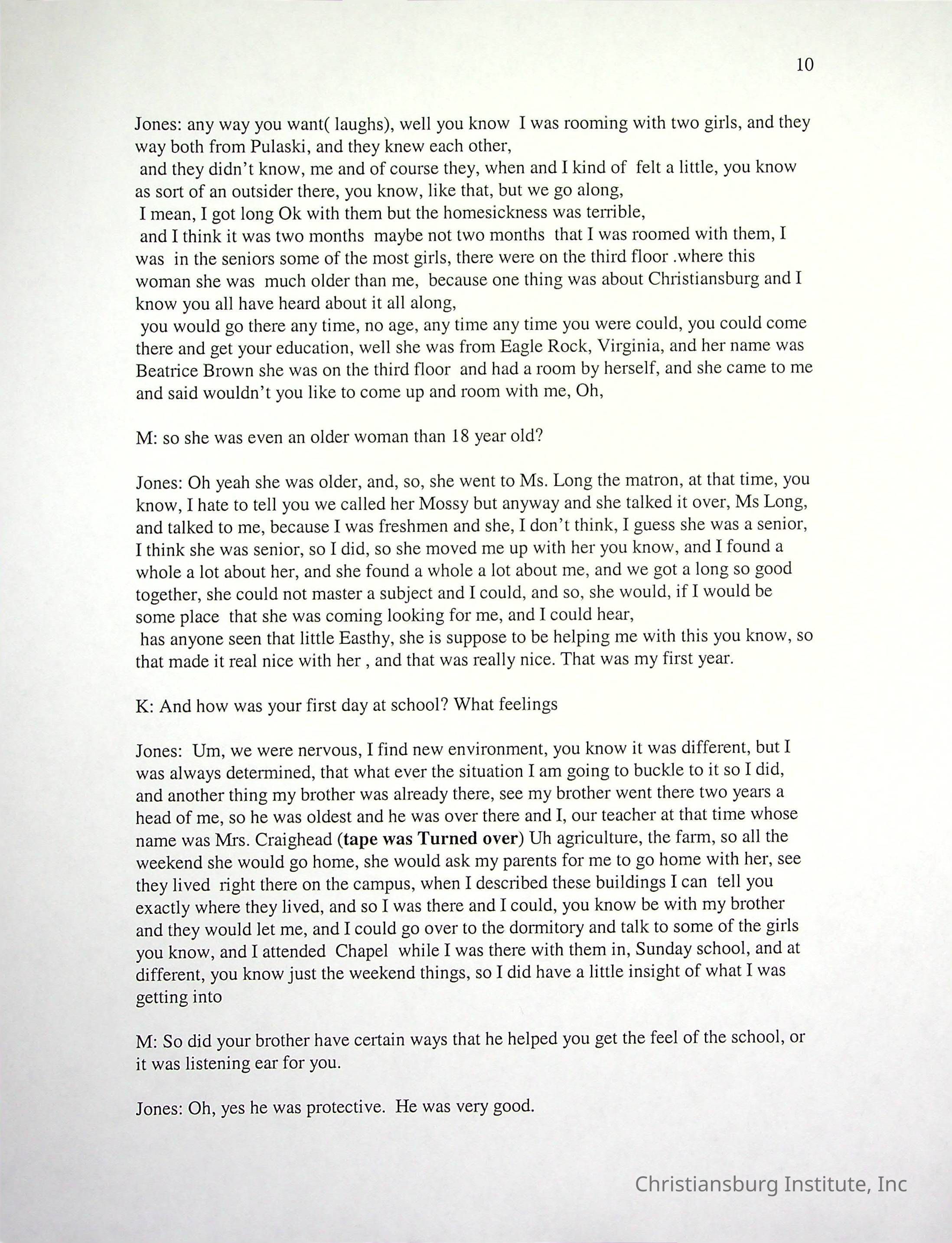 An oral history with Christiansburg Institute alumni, Esther Jones conducted by Kalthoum Alkandari and Maria Lymans on October 26th, 2000 and a second interview conducted on November 52nd, 2000.Collection