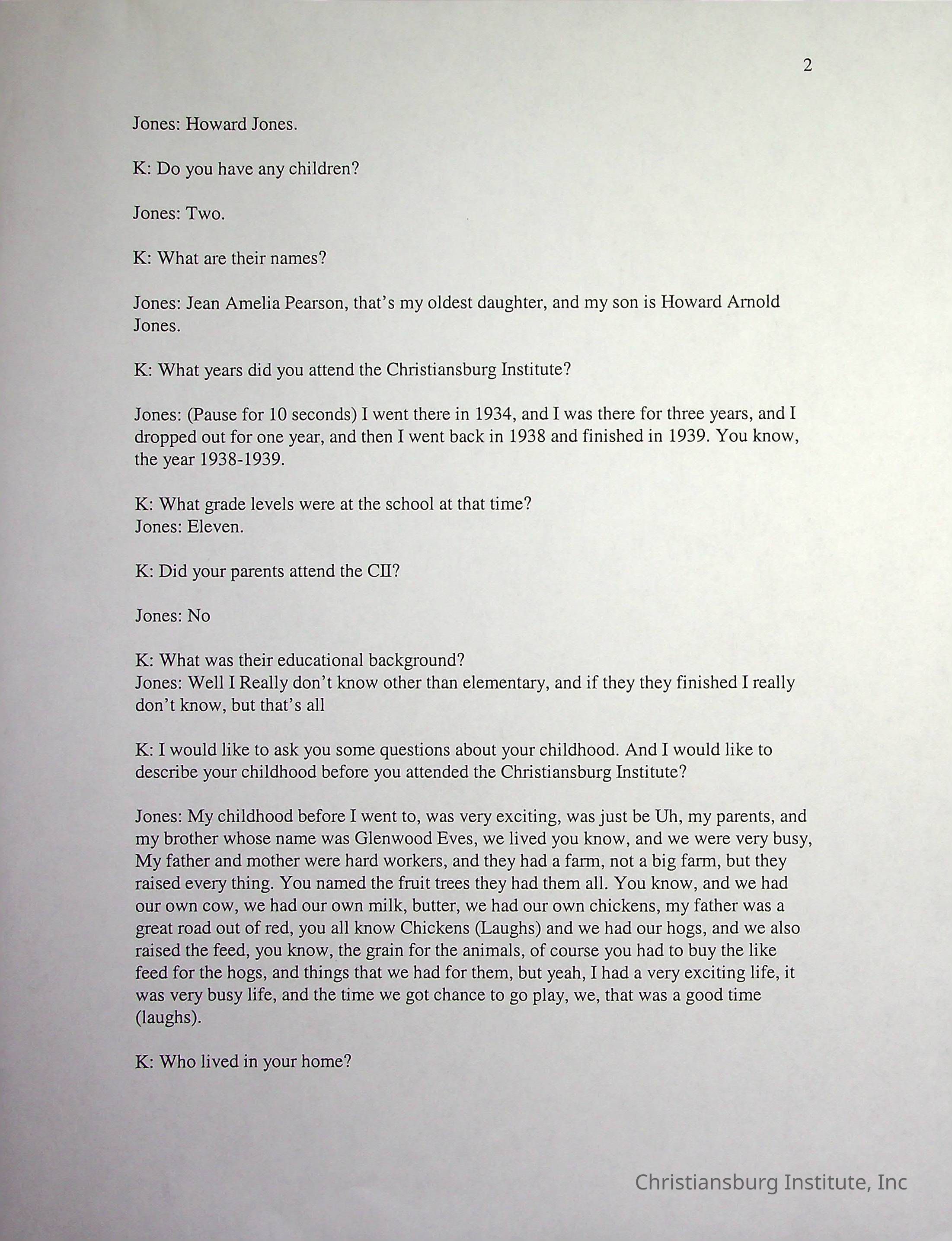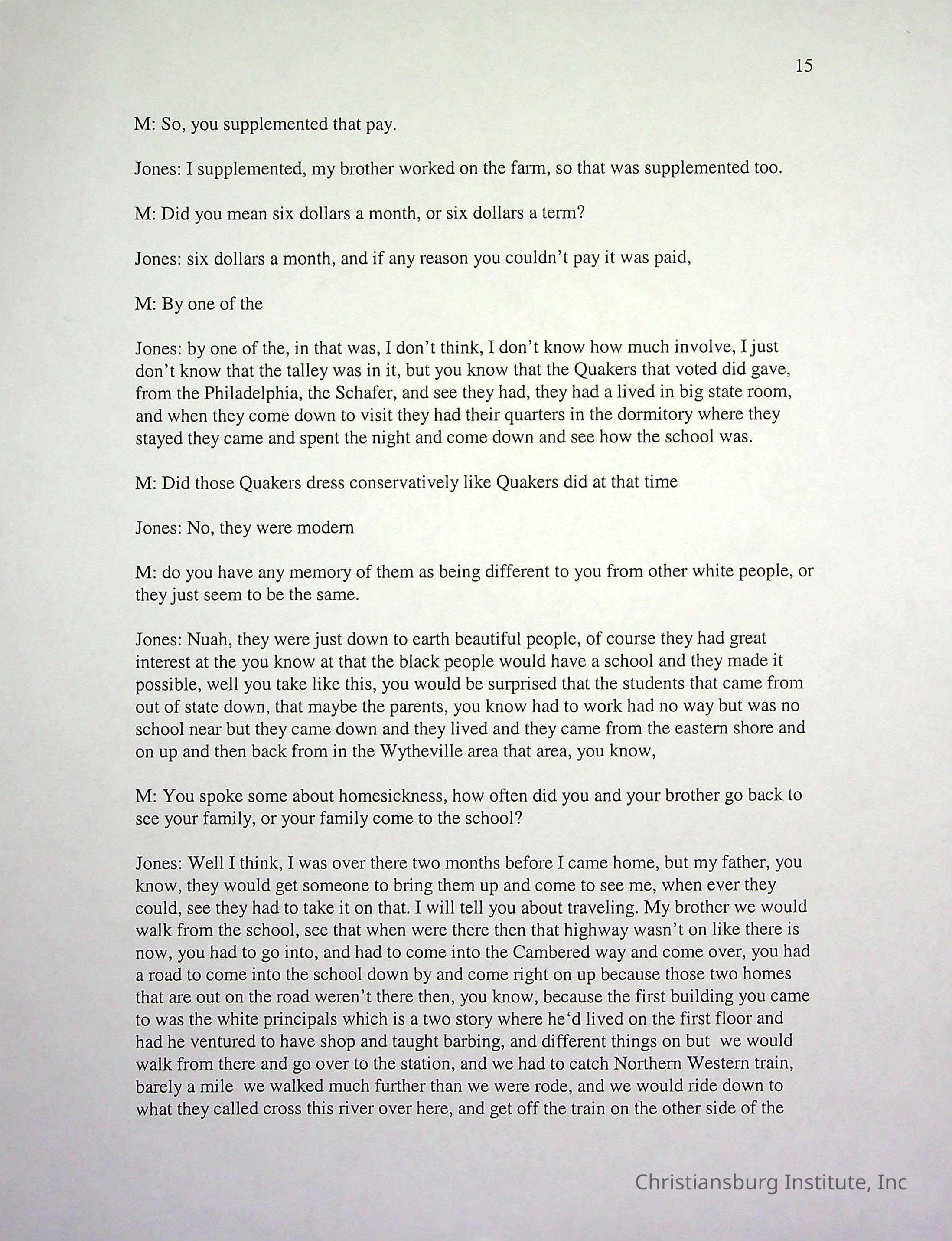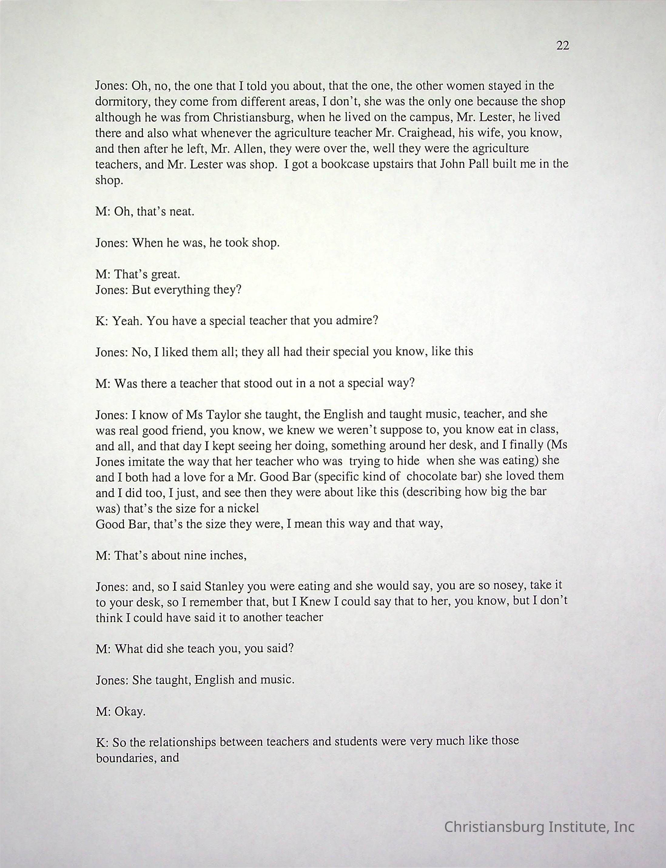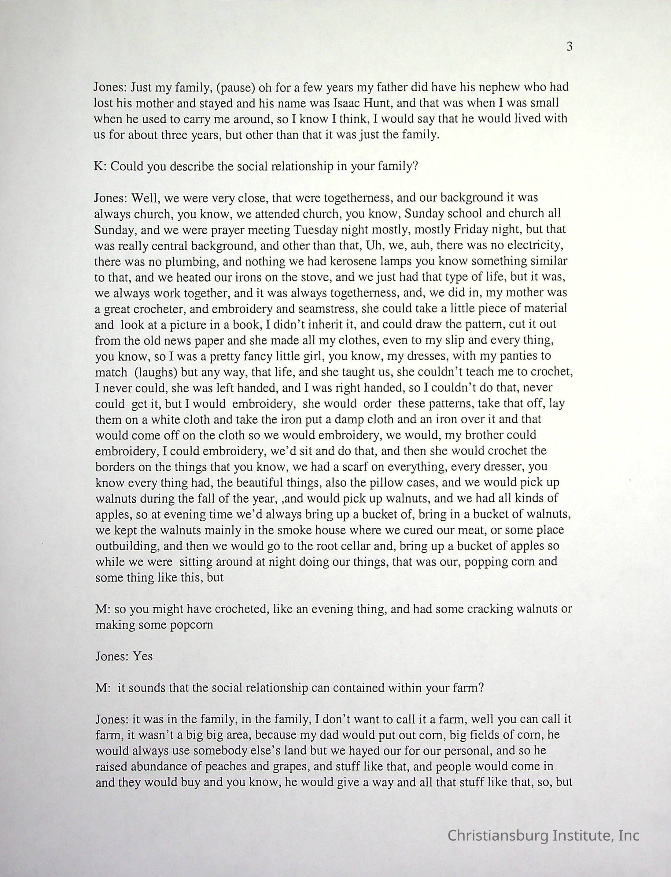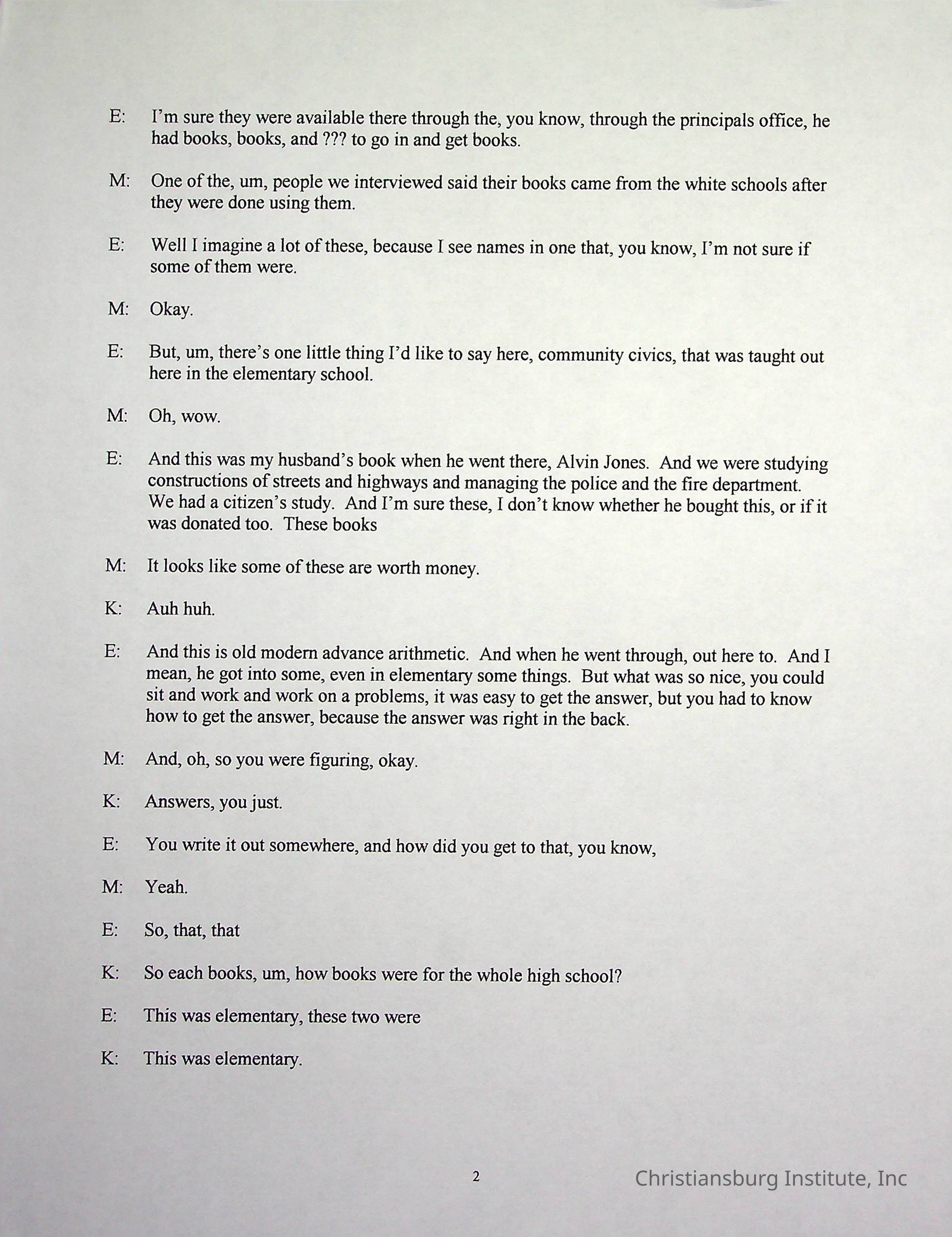 An oral history with Christiansburg Institute alumni, Esther Jones conducted by Kalthoum Alkandari and Maria Lymans on October 26th, 2000 and a second interview conducted on November 52nd, 2000.Collection