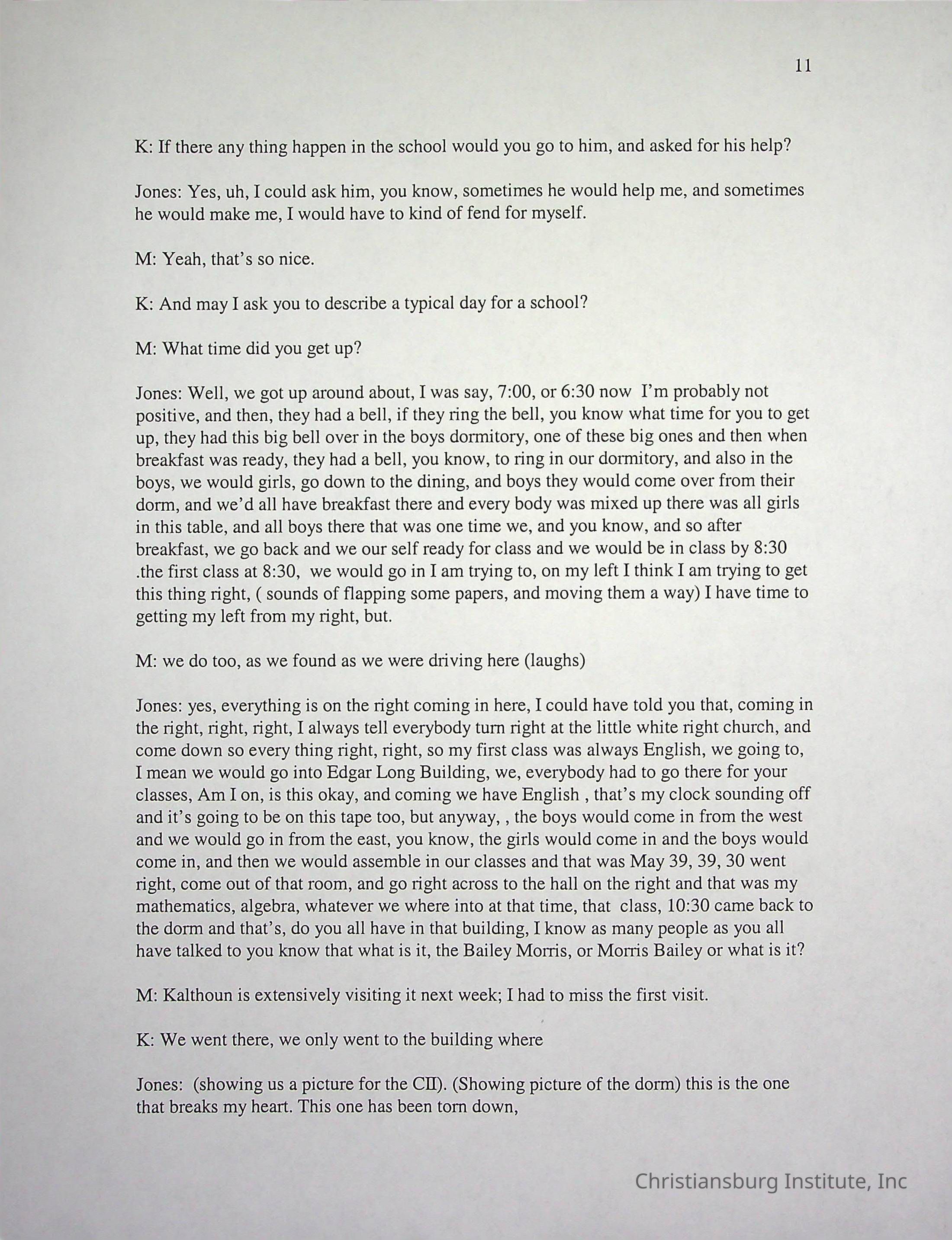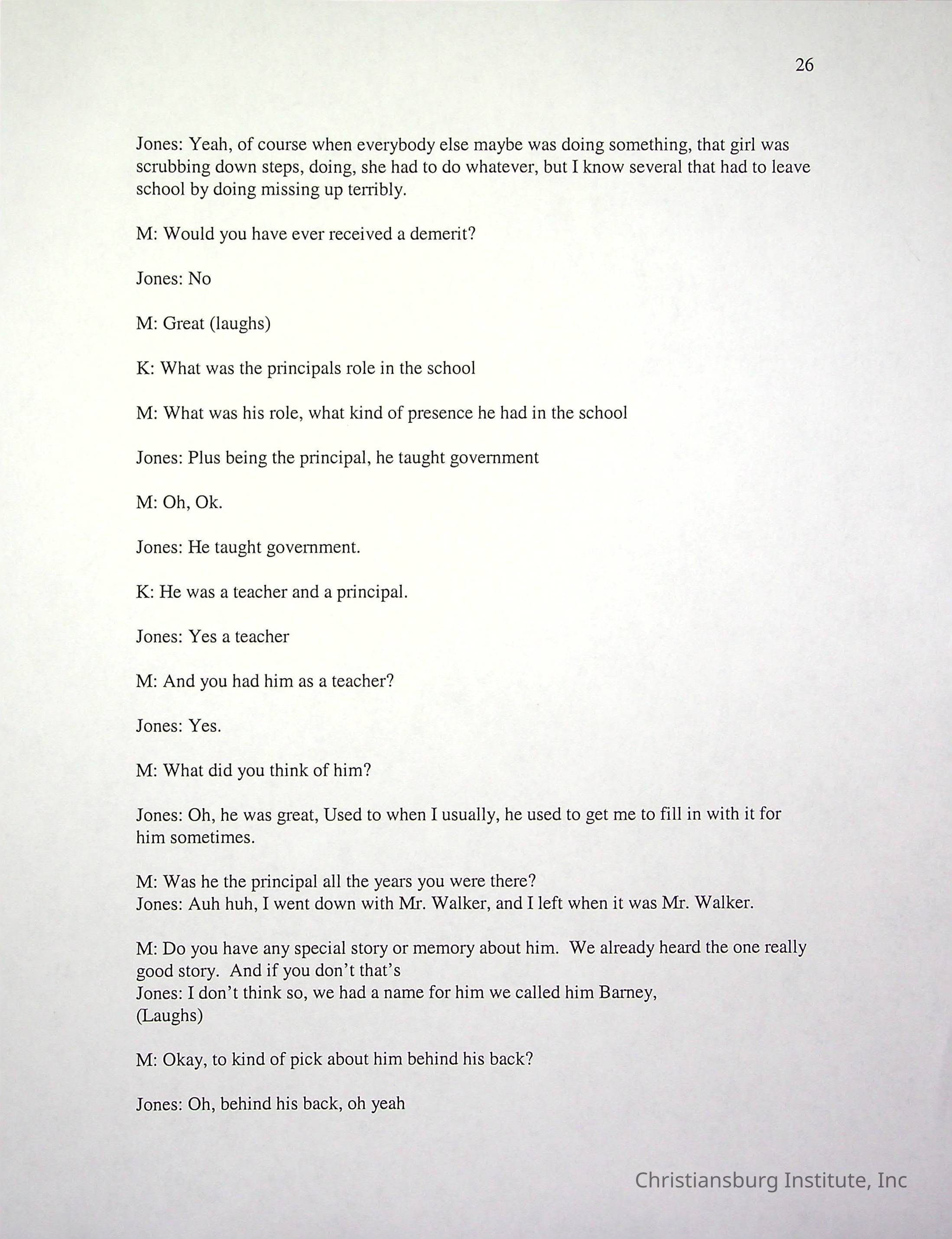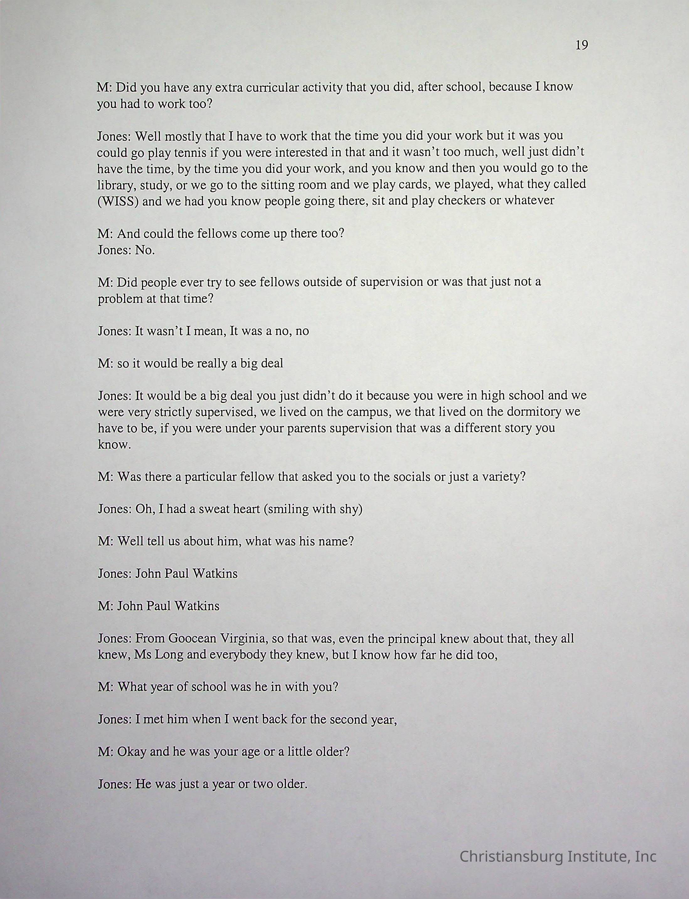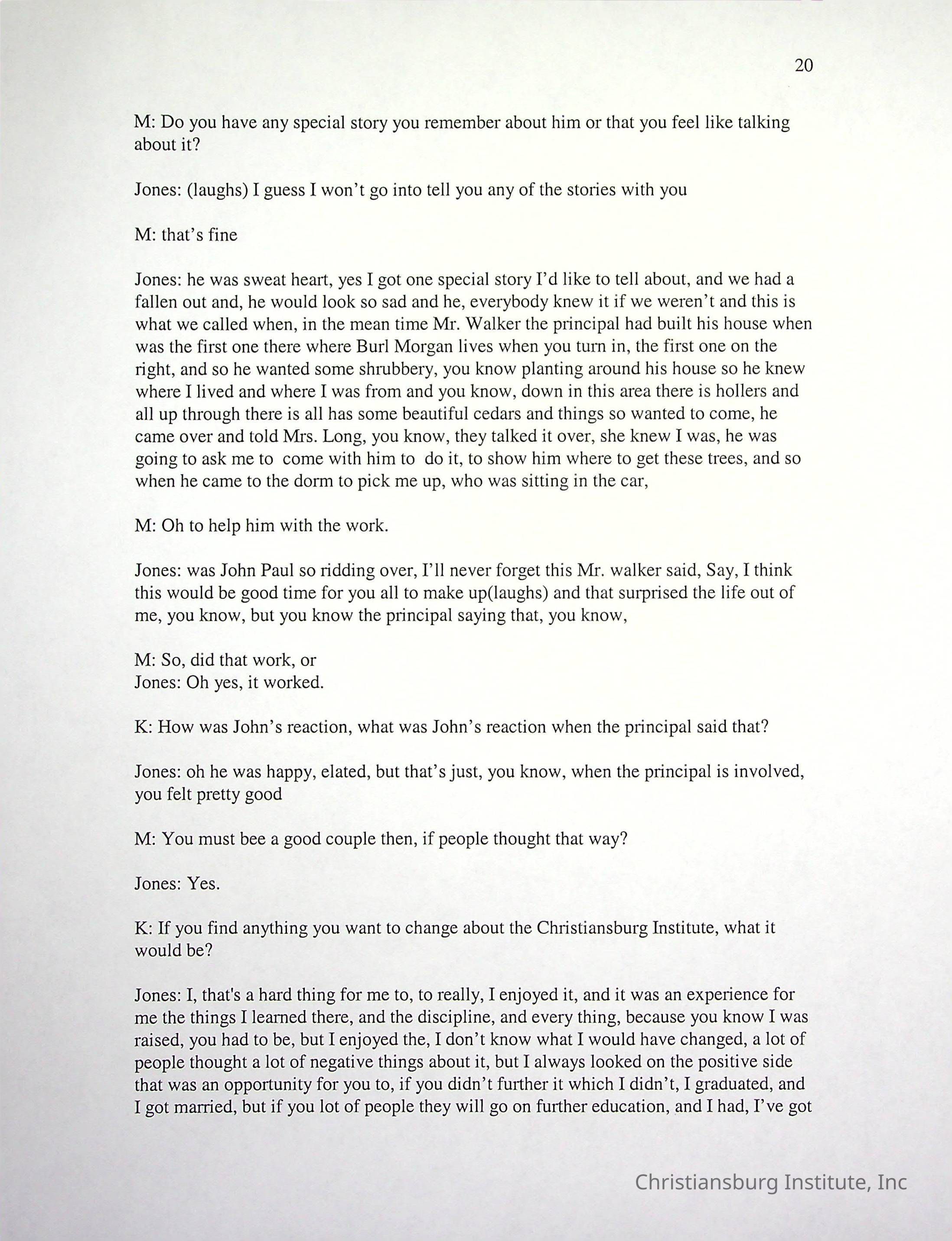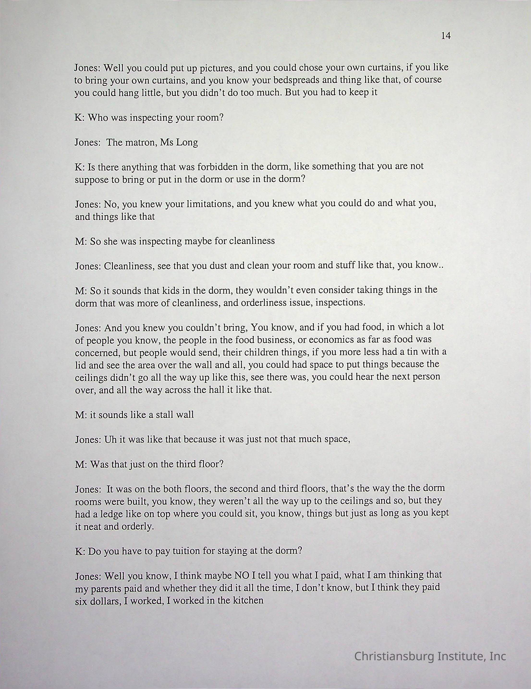 An oral history with Christiansburg Institute alumni, Esther Jones conducted by Kalthoum Alkandari and Maria Lymans on October 26th, 2000 and a second interview conducted on November 52nd, 2000.Collection