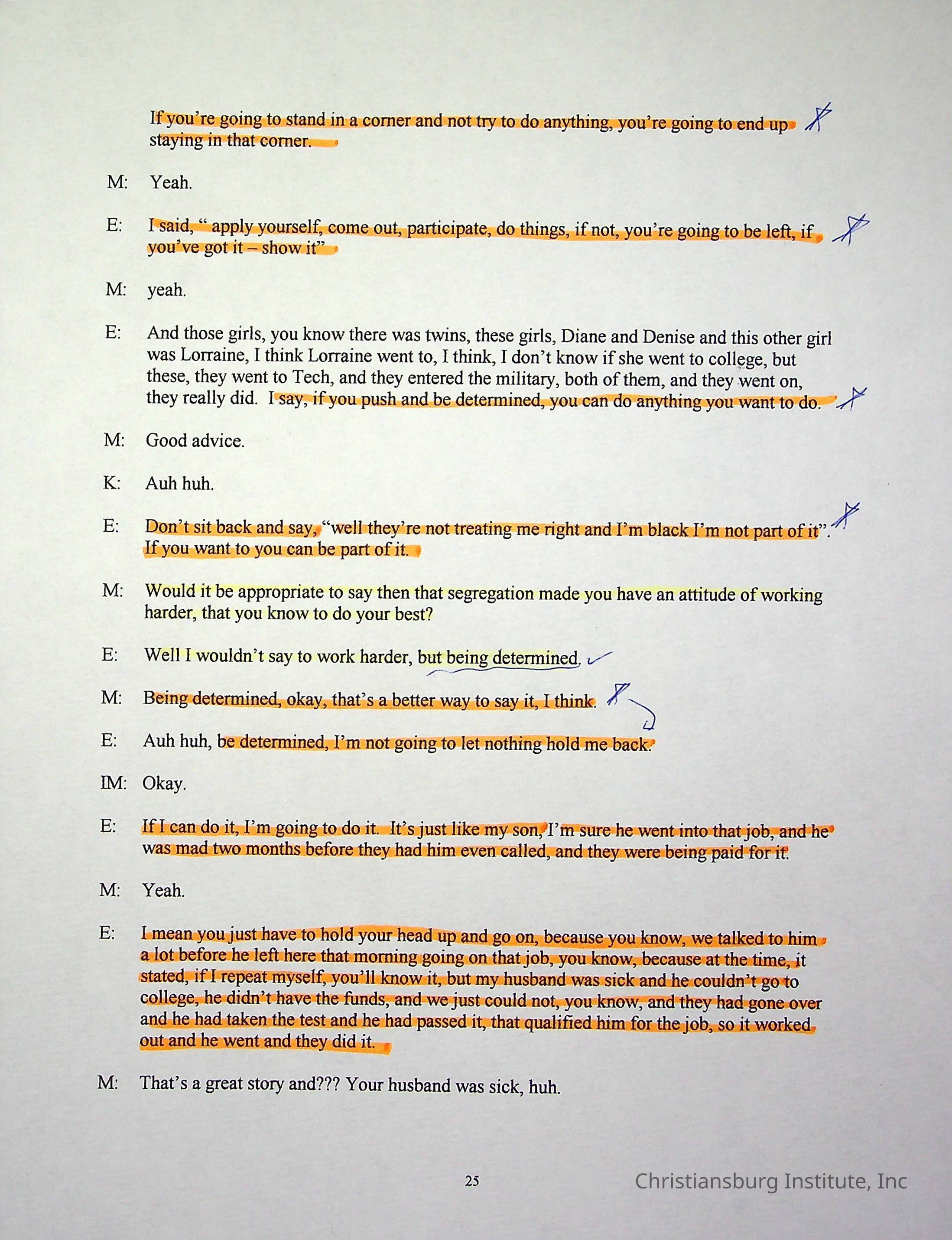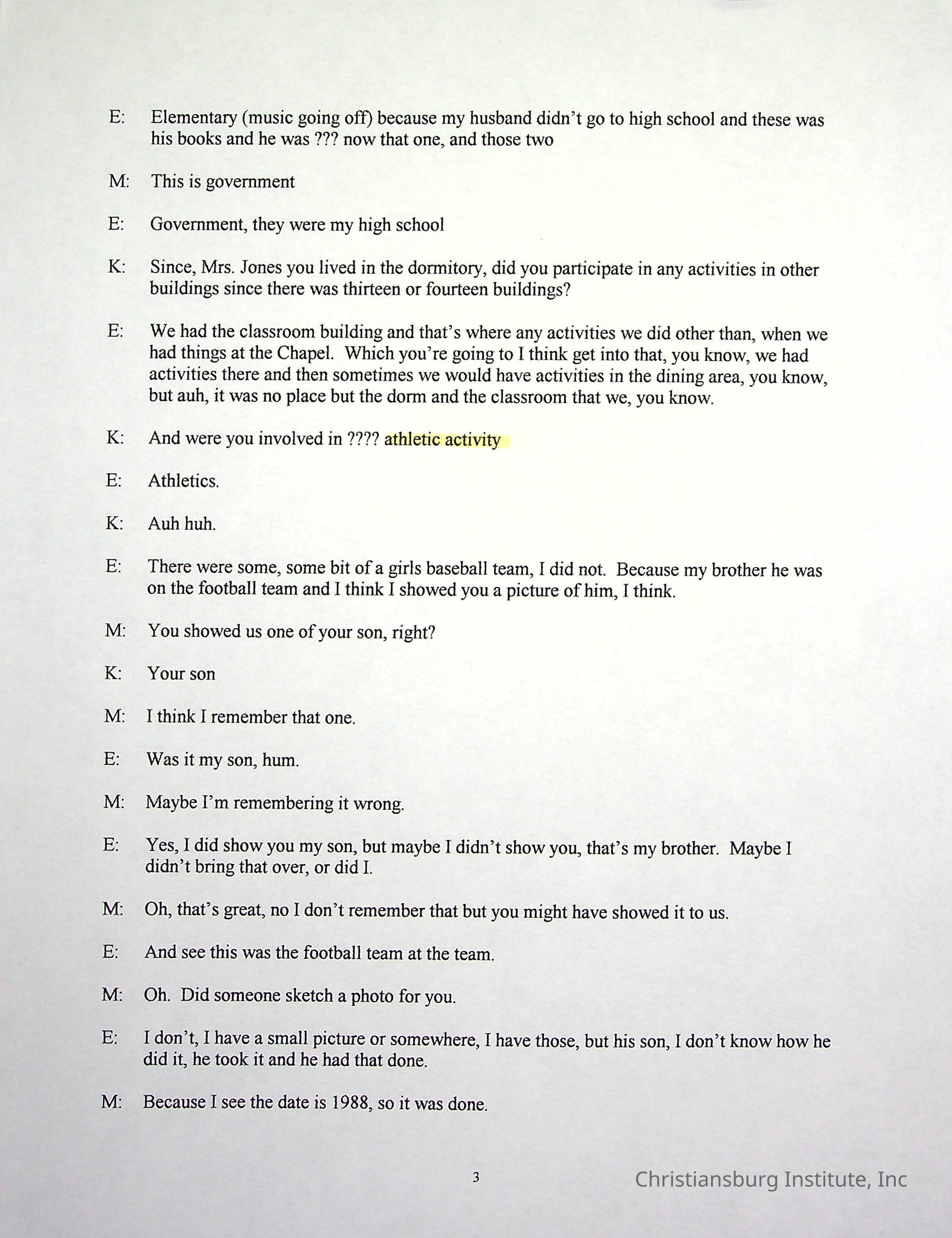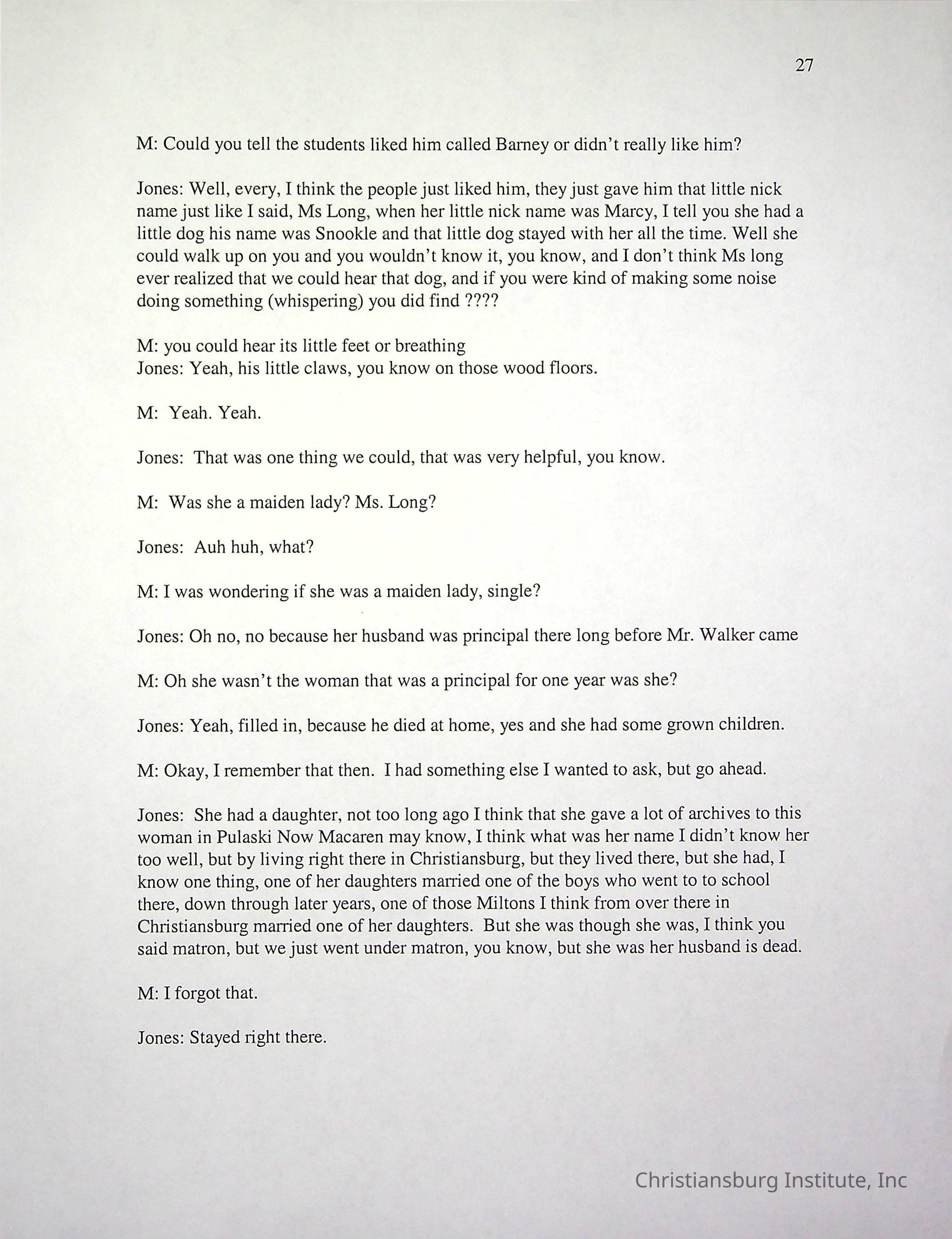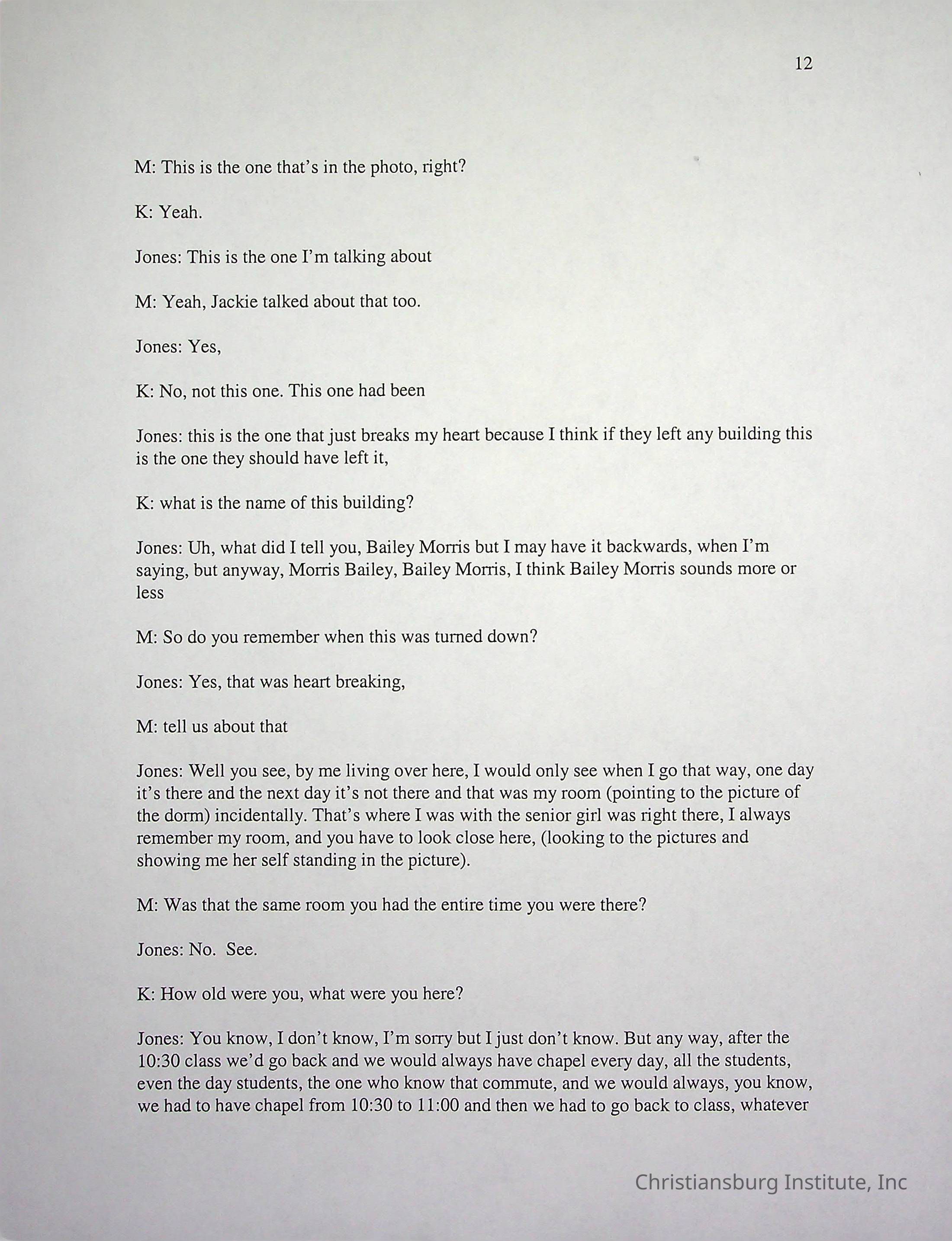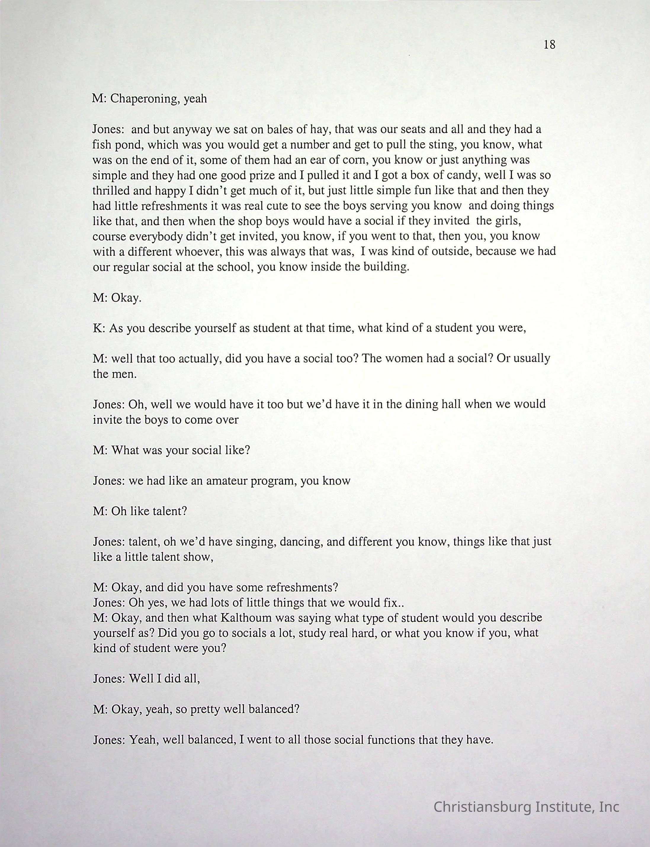 An oral history with Christiansburg Institute alumni, Esther Jones conducted by Kalthoum Alkandari and Maria Lymans on October 26th, 2000 and a second interview conducted on November 52nd, 2000.Collection
