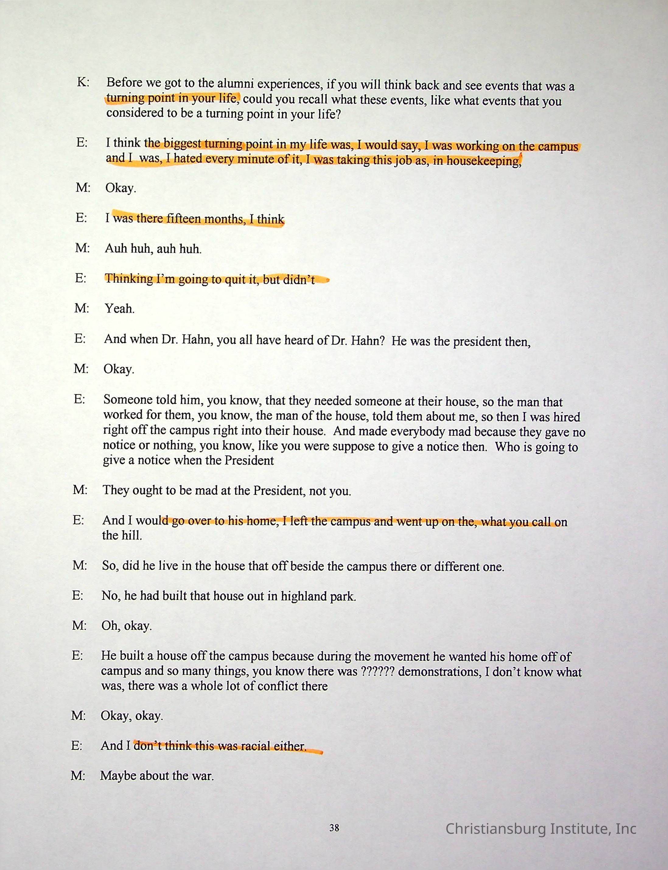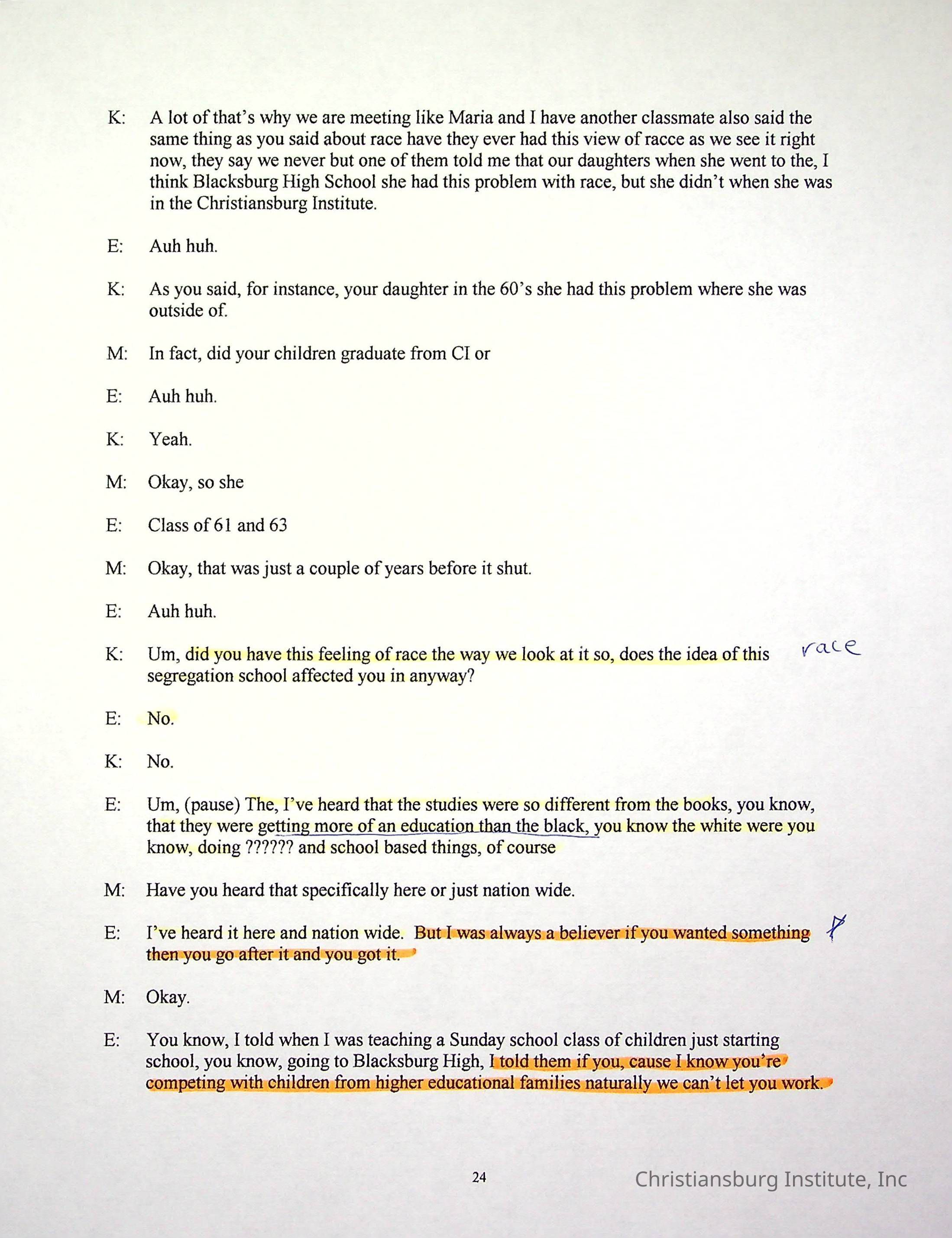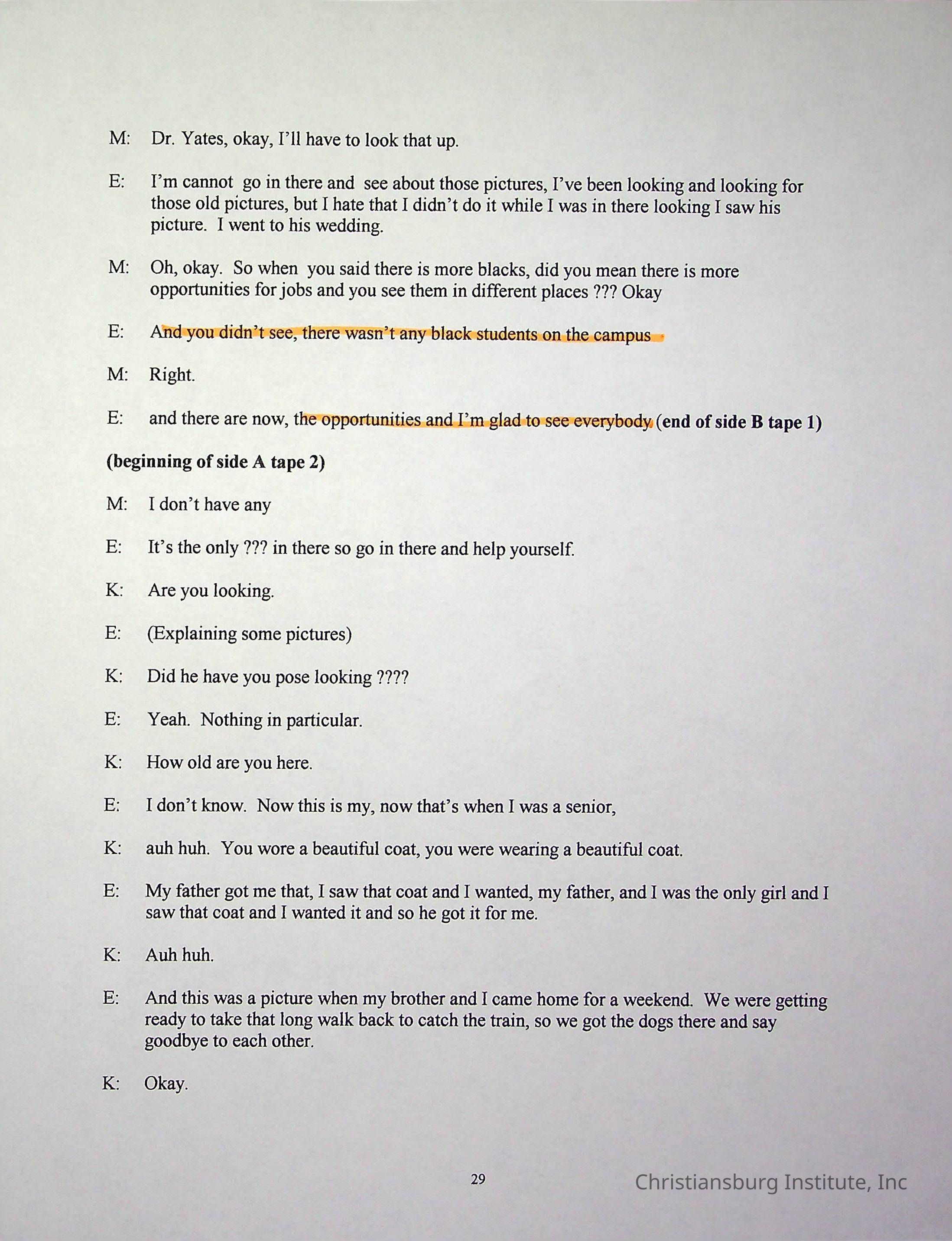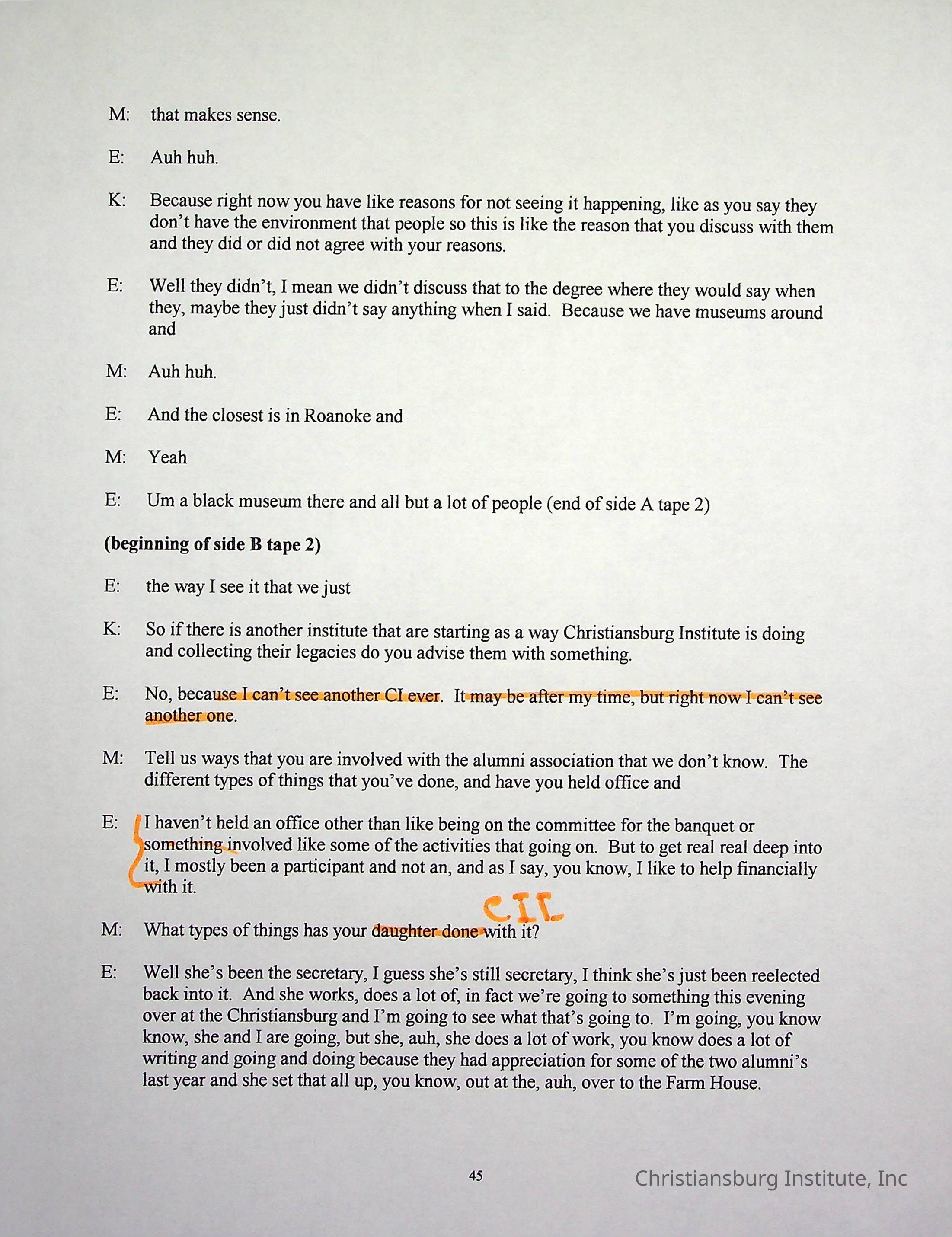An oral history with Christiansburg Institute alumni, Esther Jones conducted by Kalthoum Alkandari and Maria Lymans on October 26th, 2000 and a second interview conducted on November 52nd, 2000.Collection