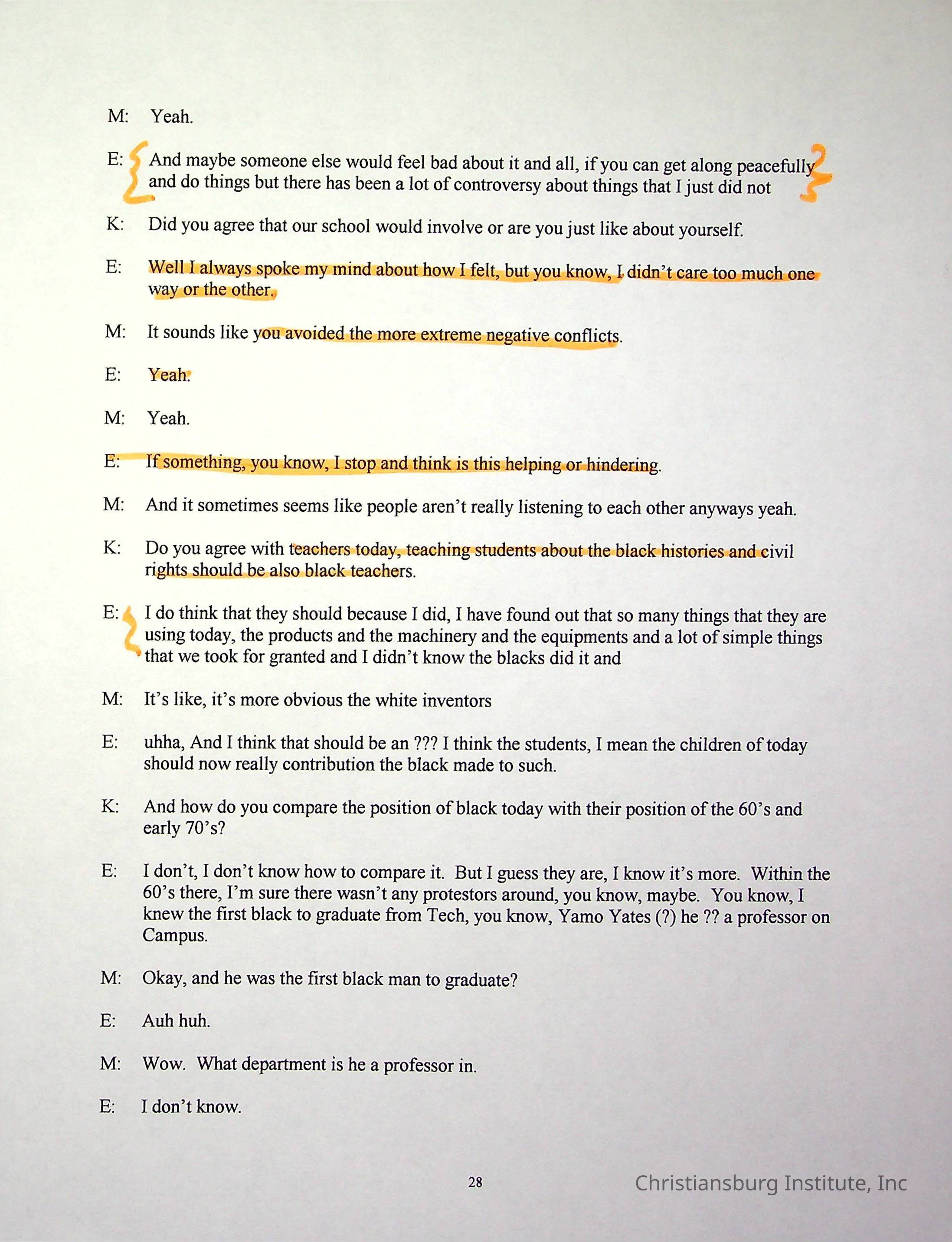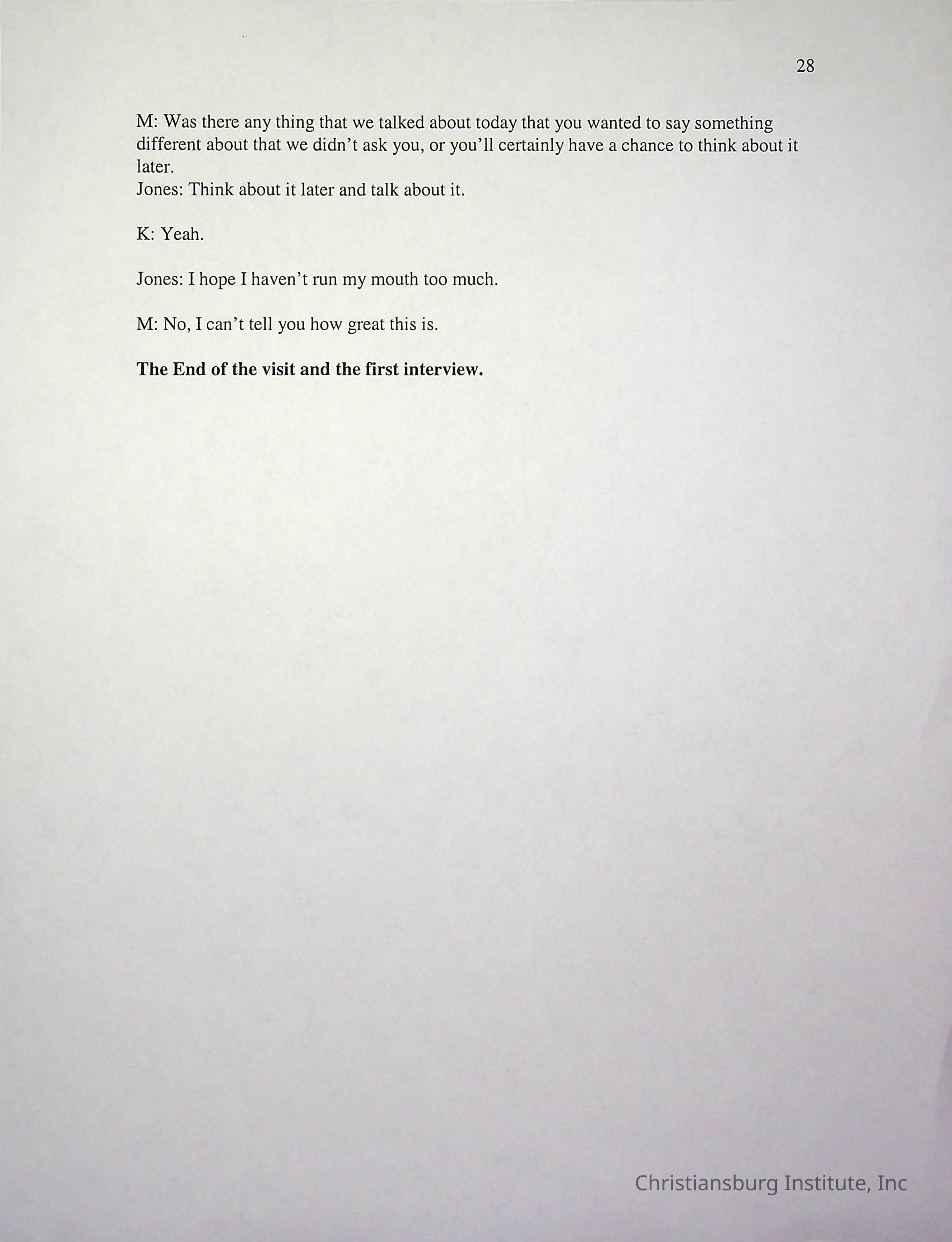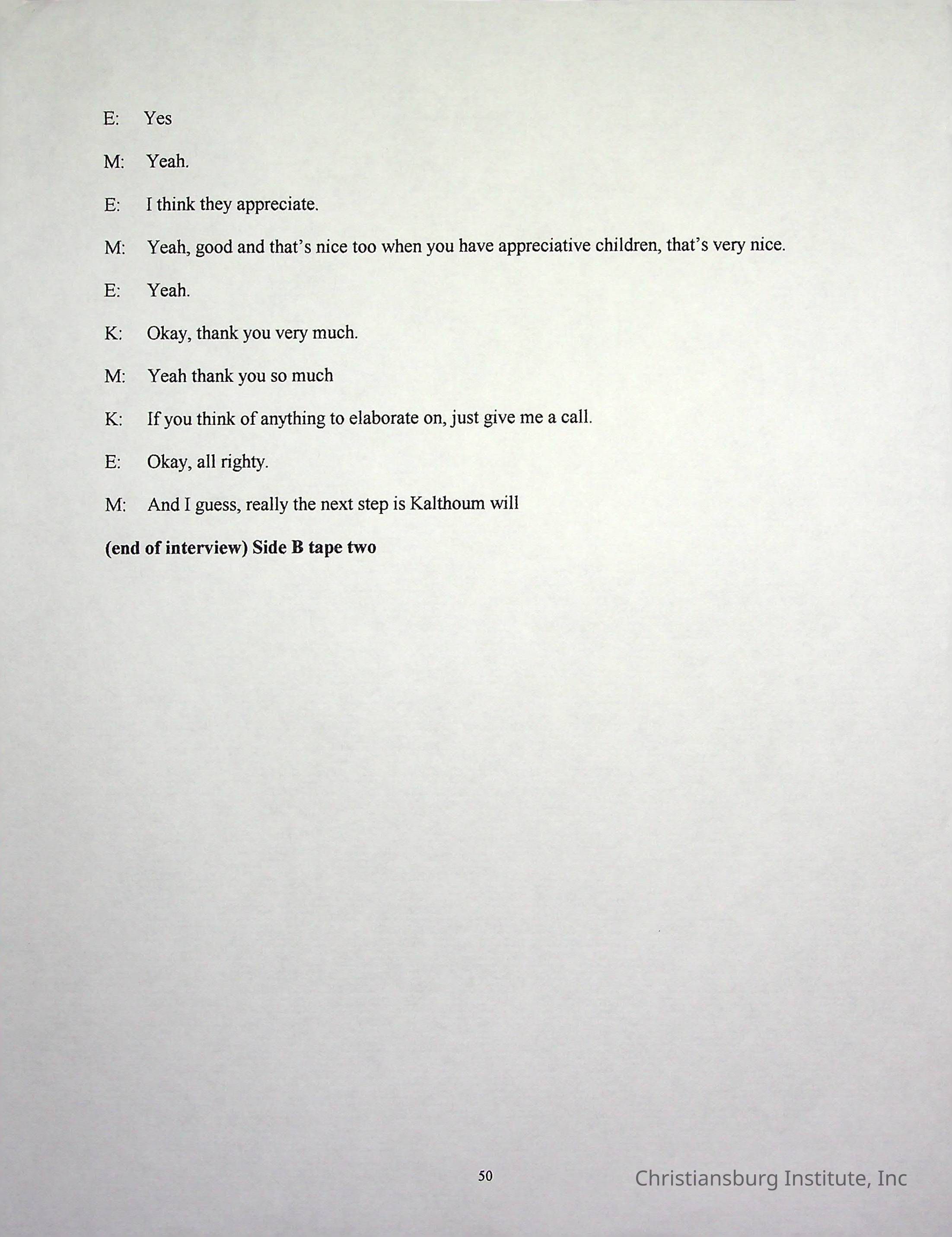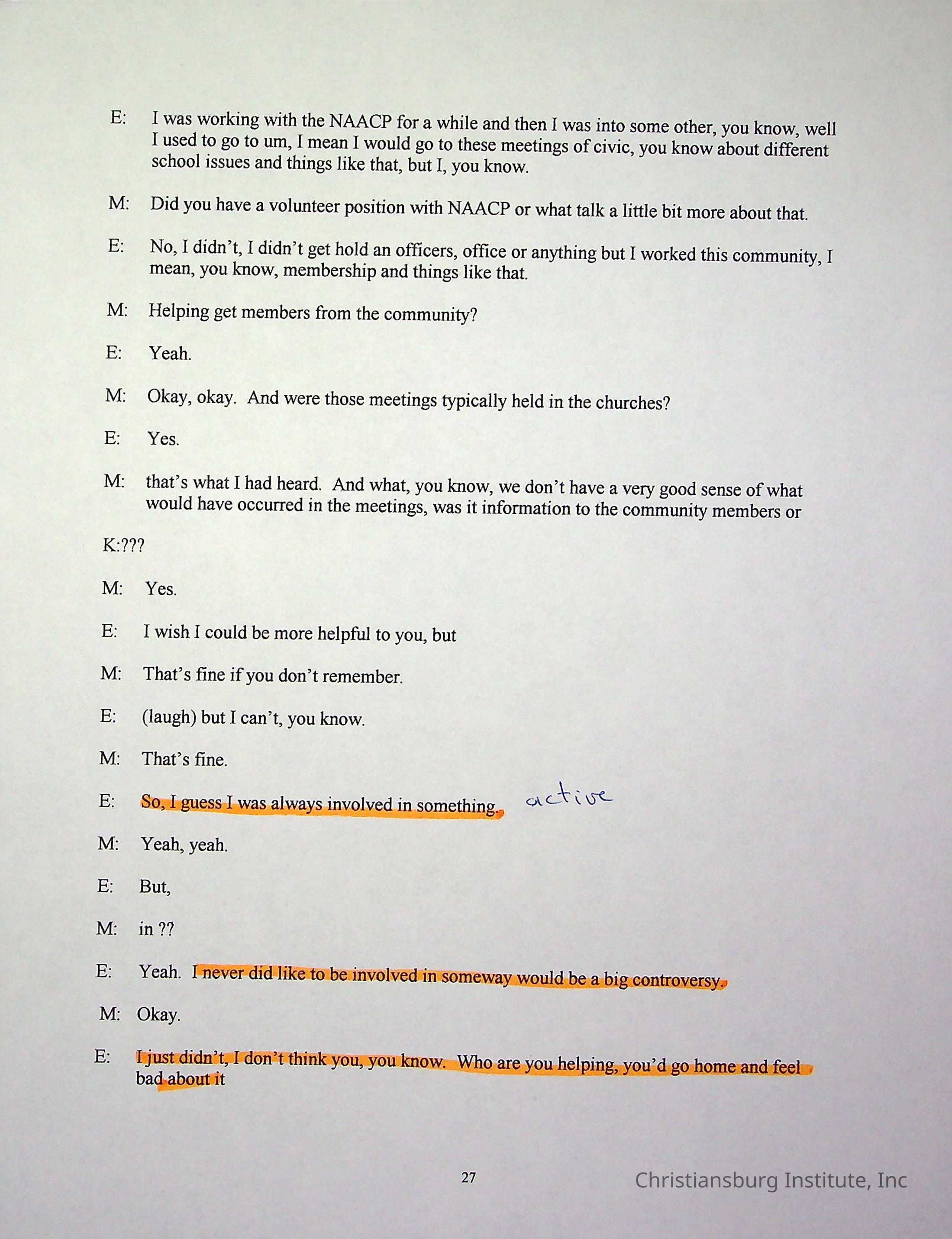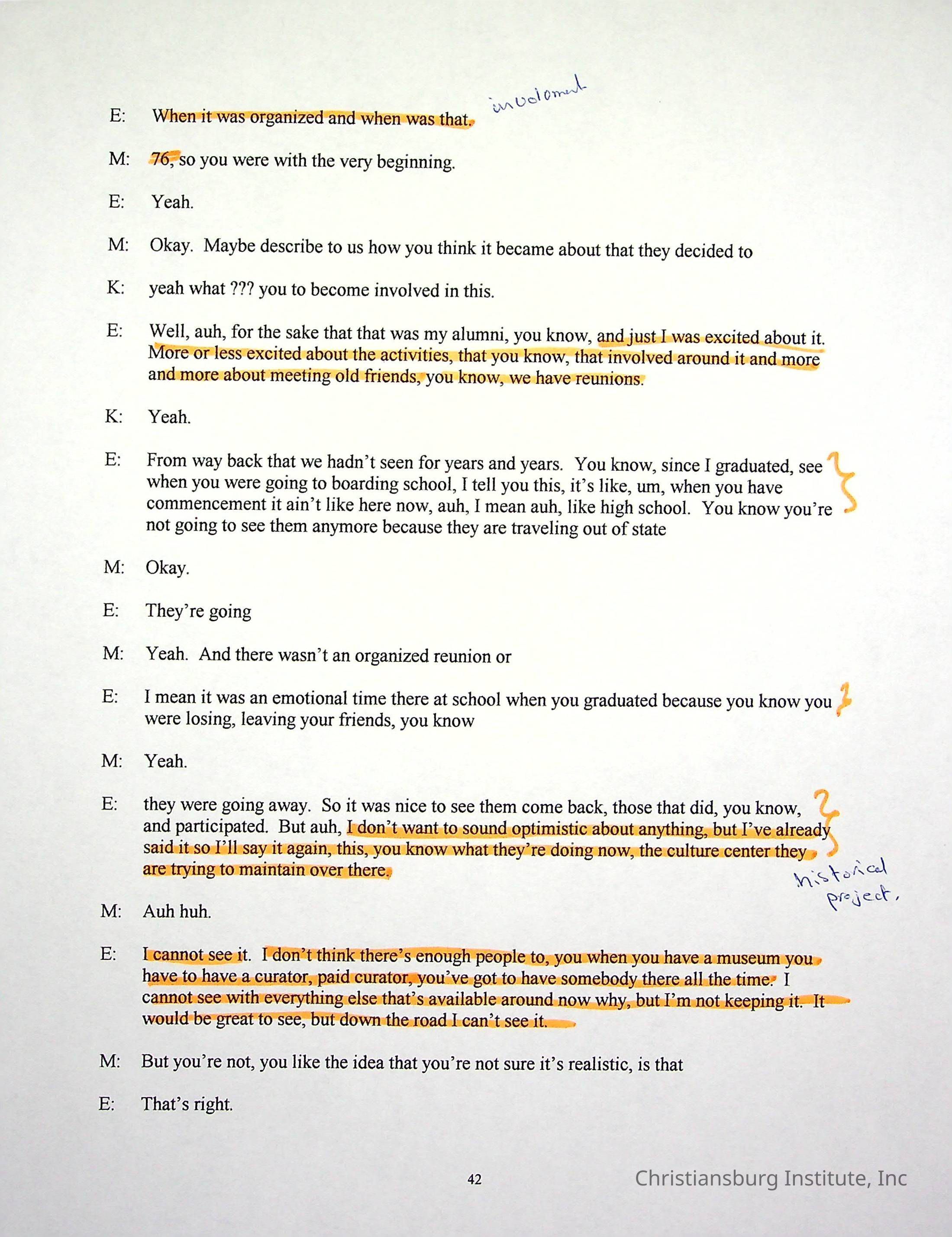 An oral history with Christiansburg Institute alumni, Esther Jones conducted by Kalthoum Alkandari and Maria Lymans on October 26th, 2000 and a second interview conducted on November 52nd, 2000.Collection
