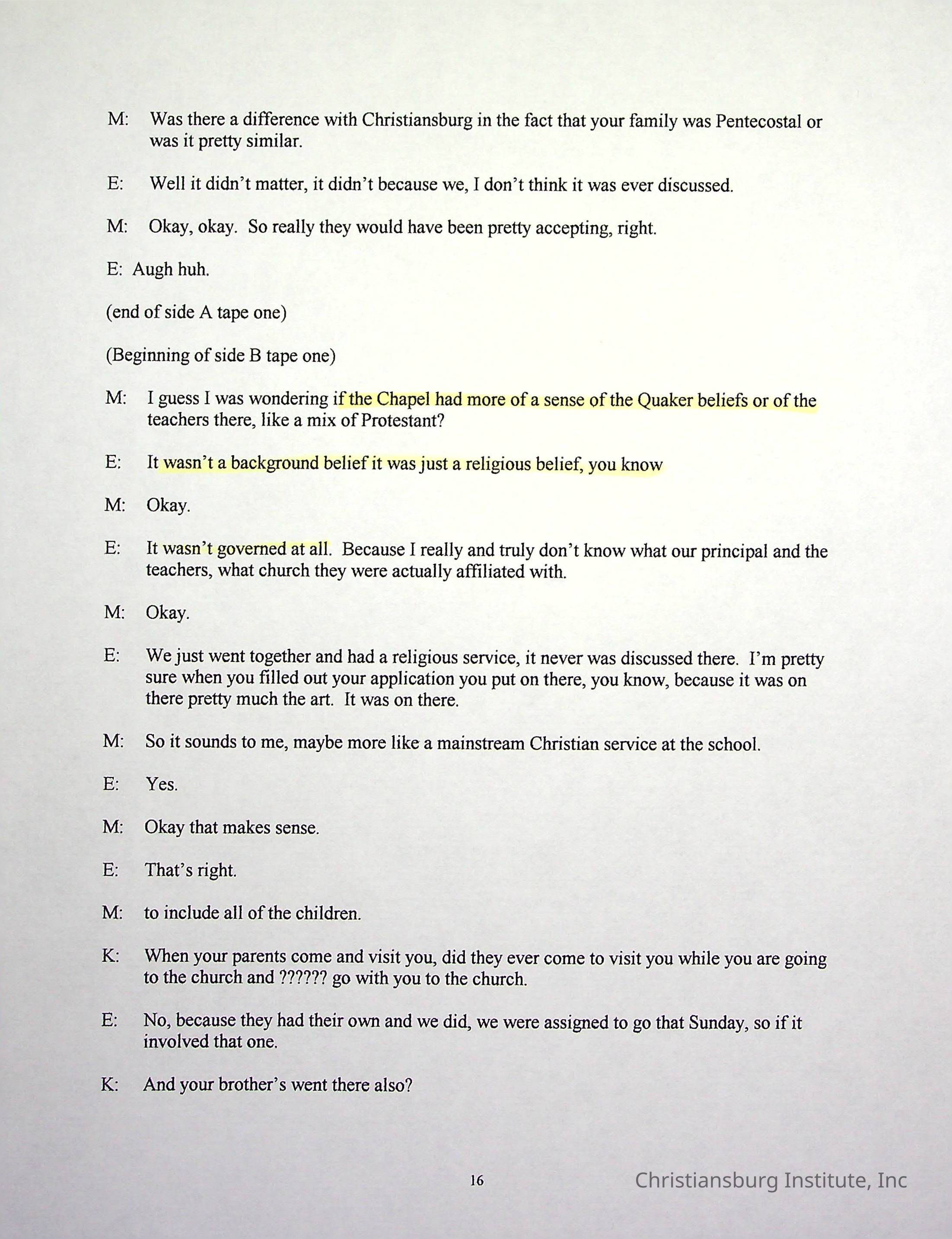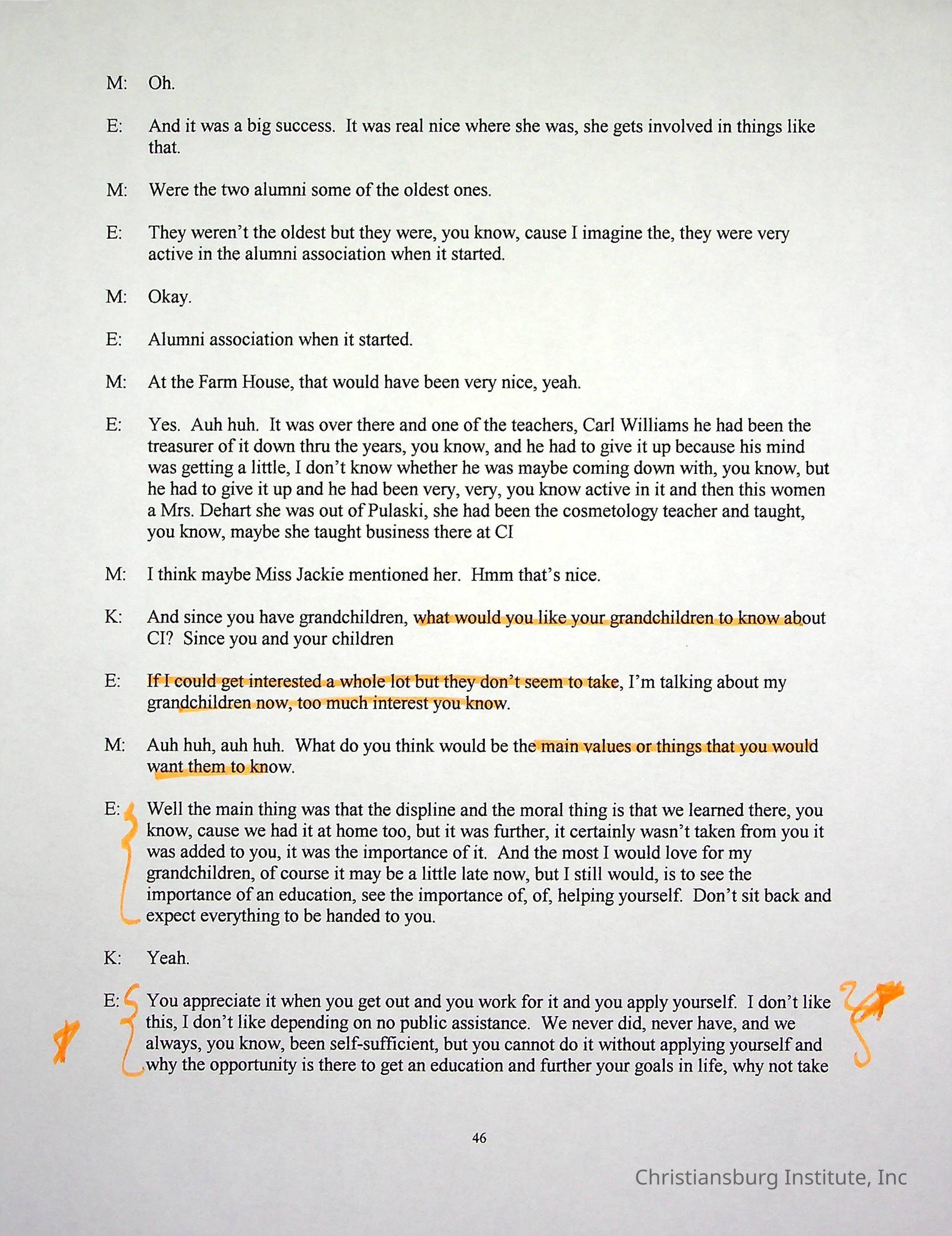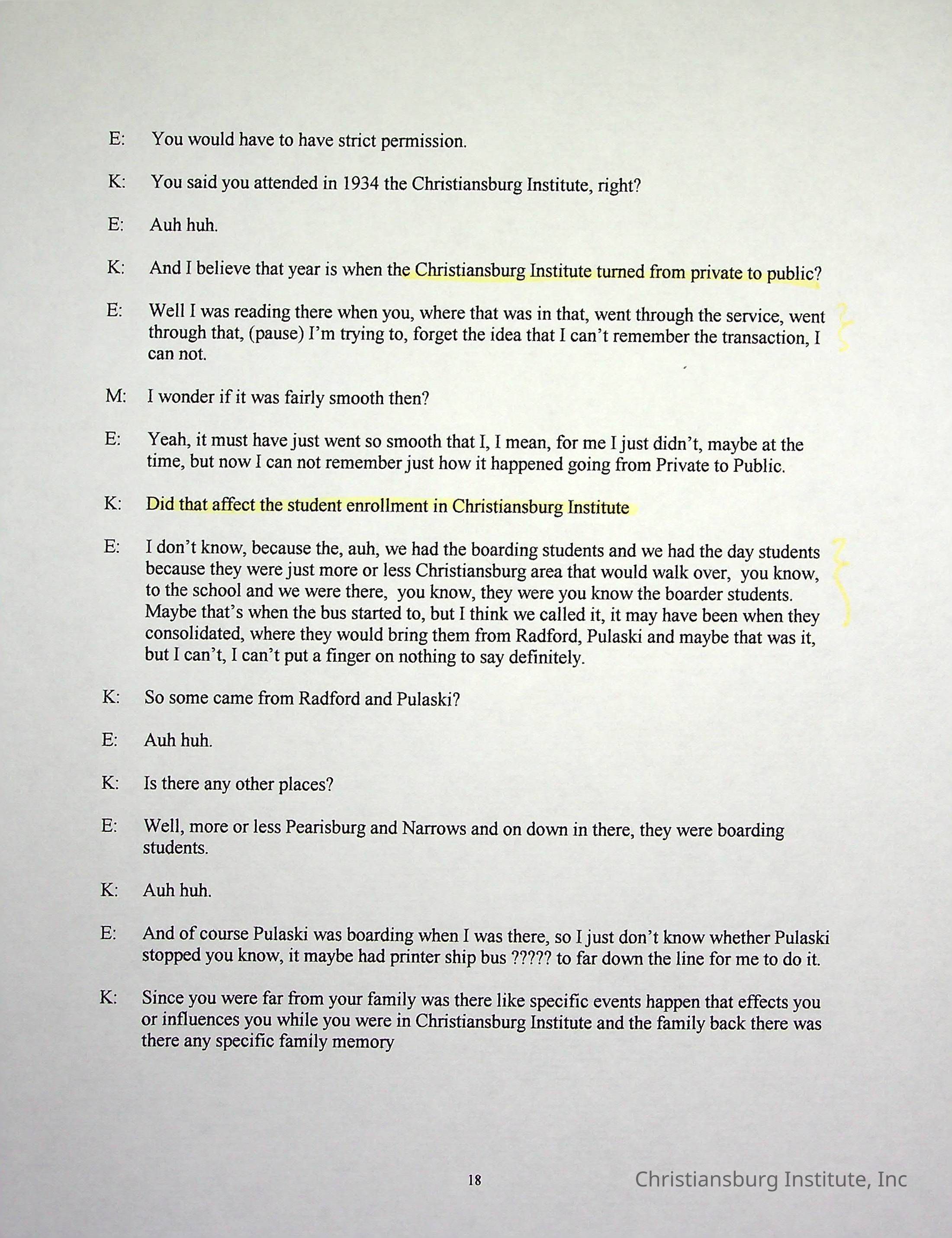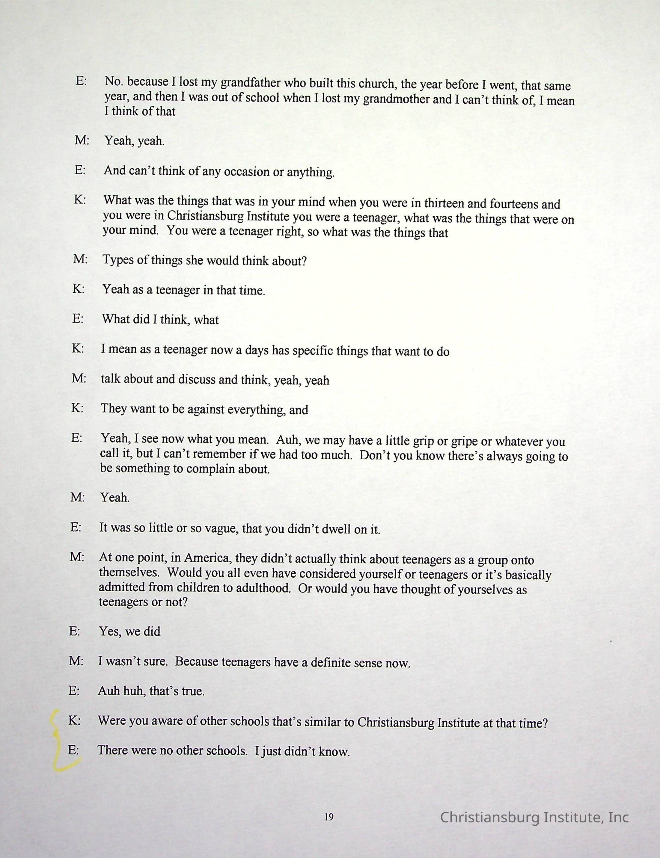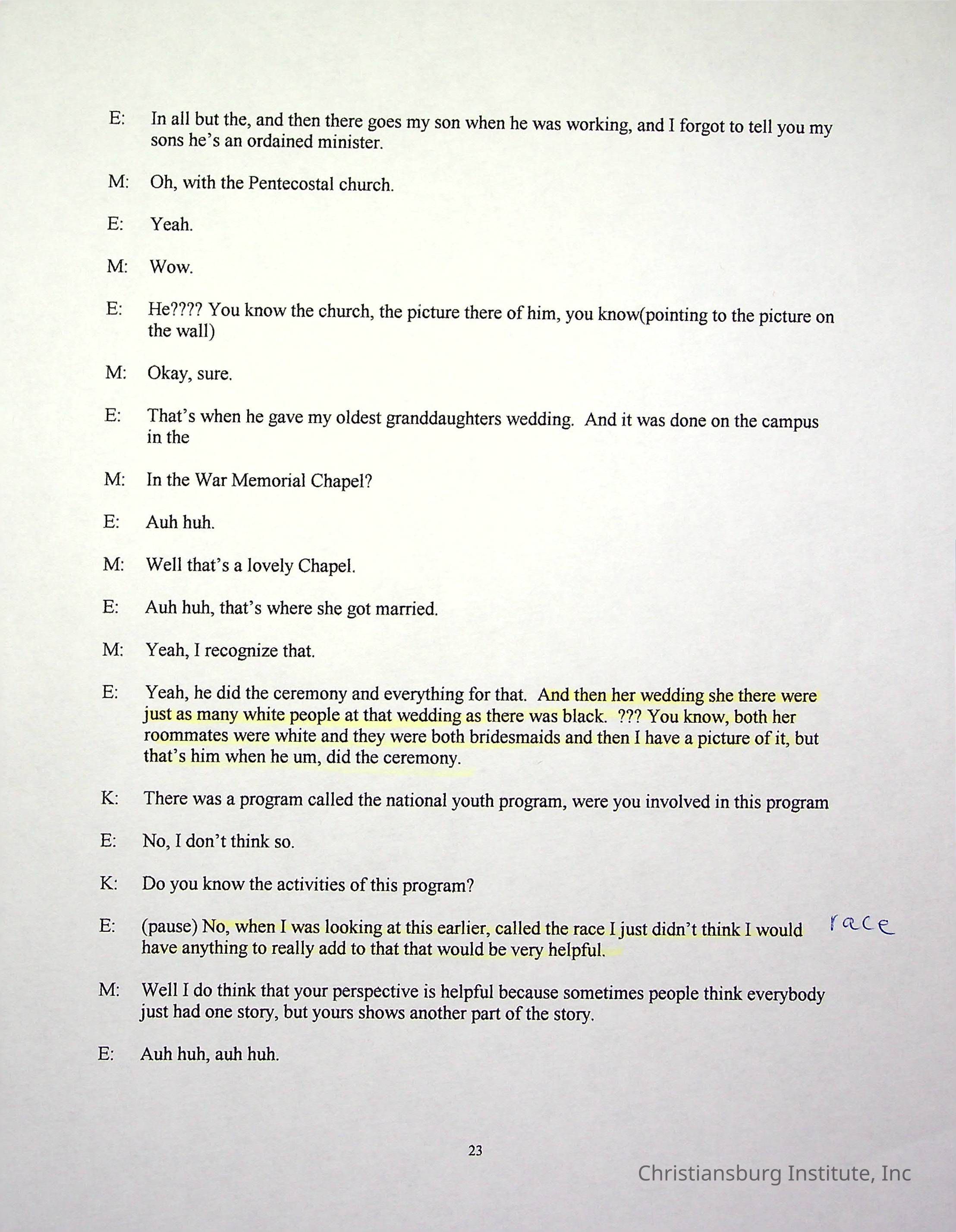An oral history with Christiansburg Institute alumni, Esther Jones conducted by Kalthoum Alkandari and Maria Lymans on October 26th, 2000 and a second interview conducted on November 52nd, 2000.Collection