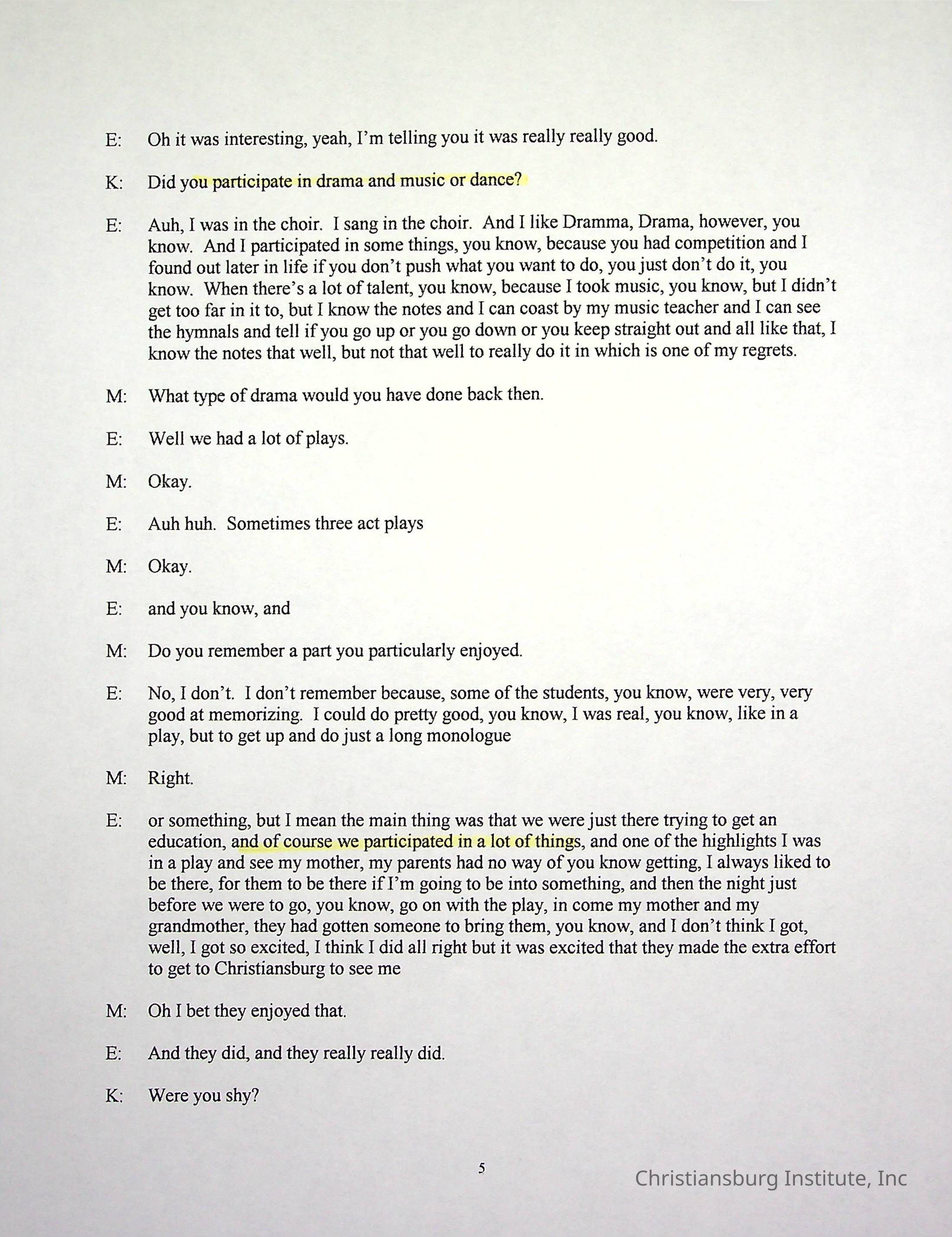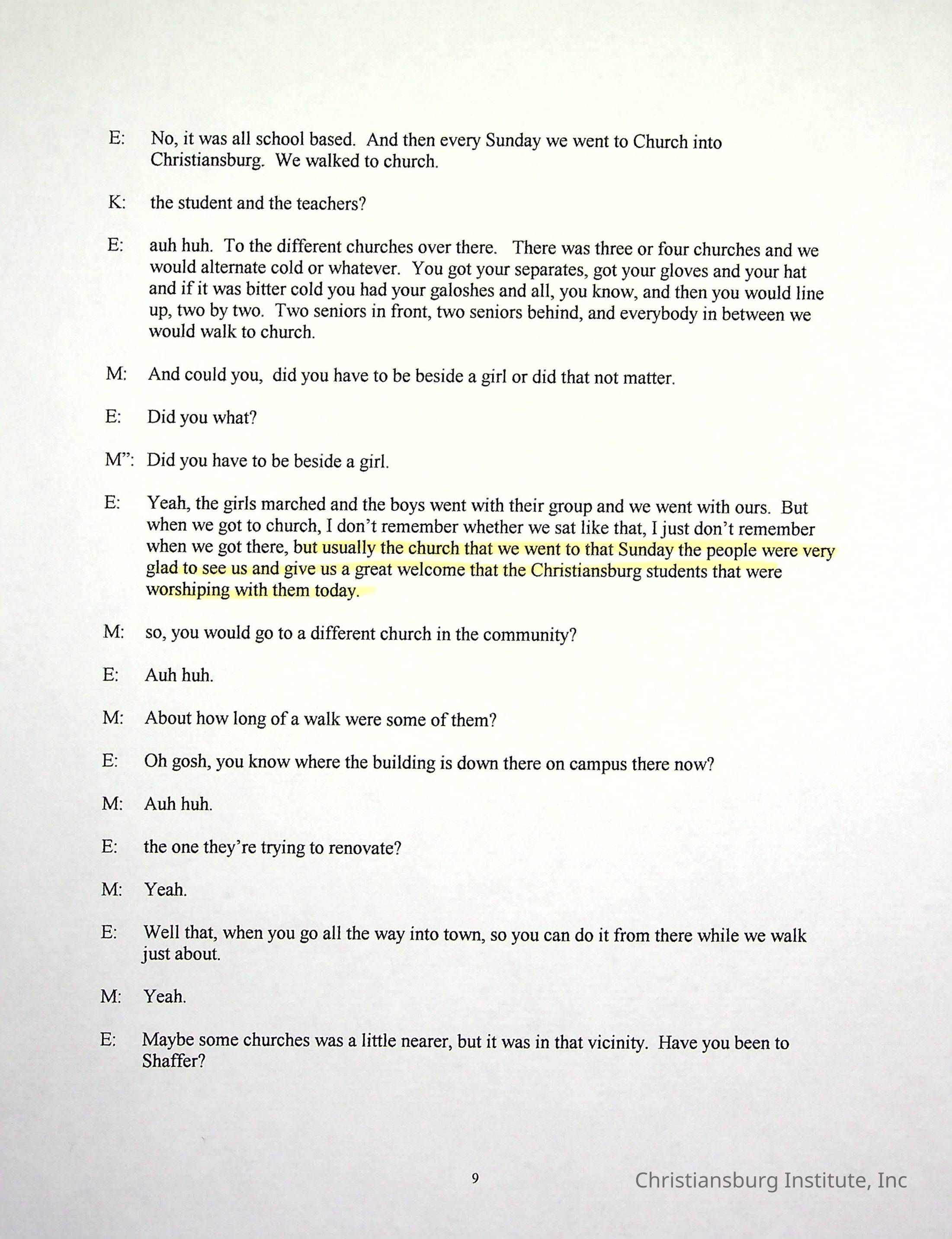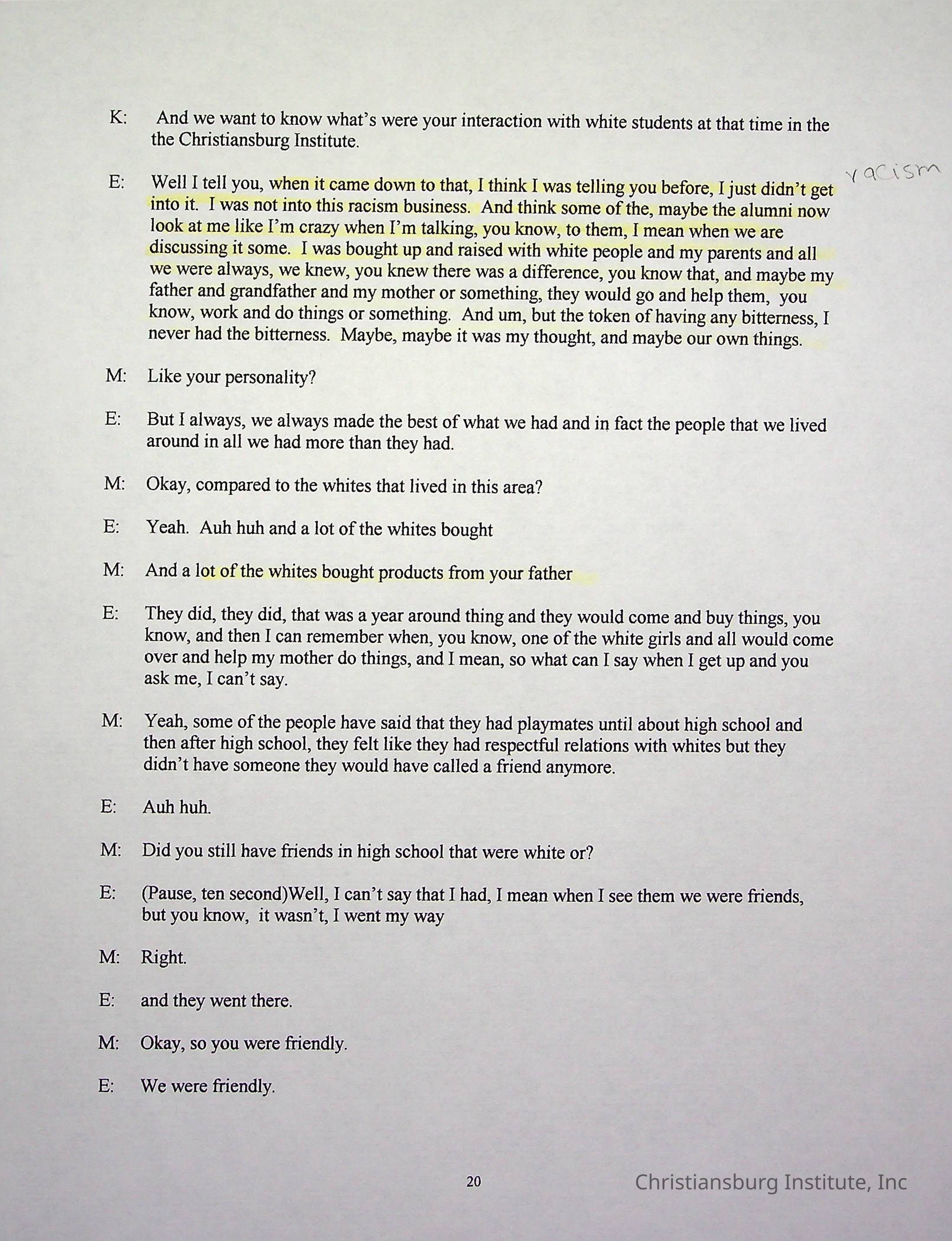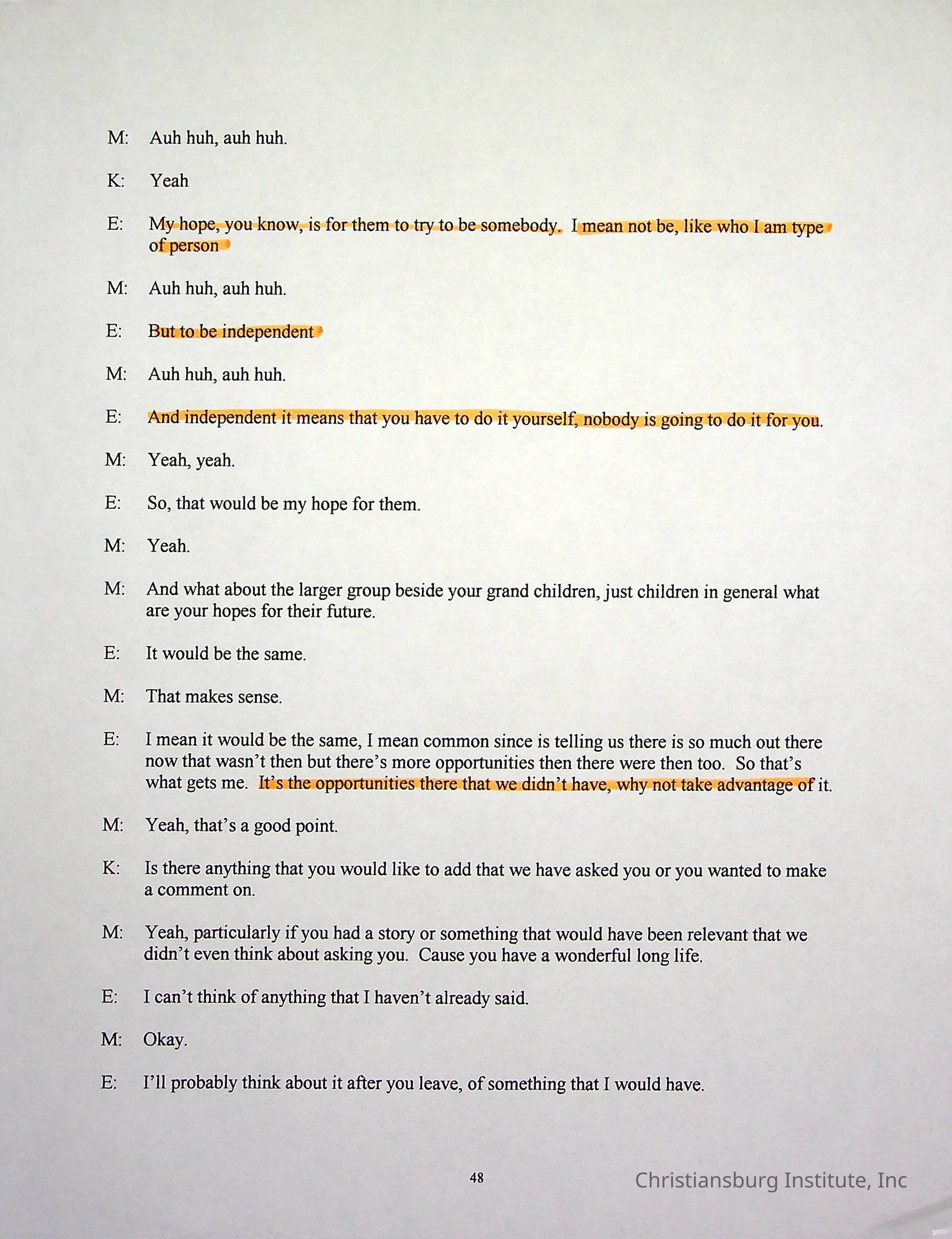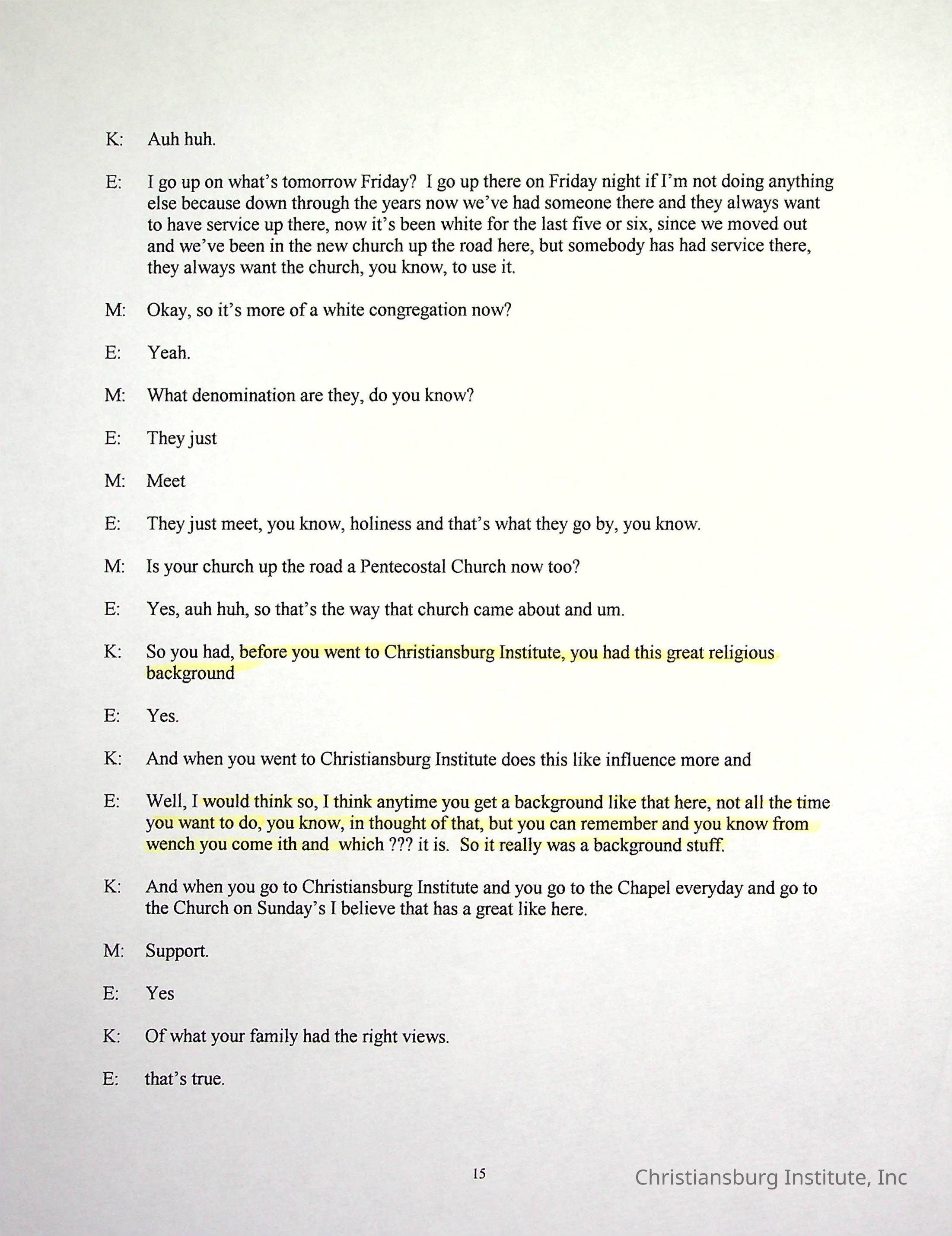 An oral history with Christiansburg Institute alumni, Esther Jones conducted by Kalthoum Alkandari and Maria Lymans on October 26th, 2000 and a second interview conducted on November 52nd, 2000.Collection