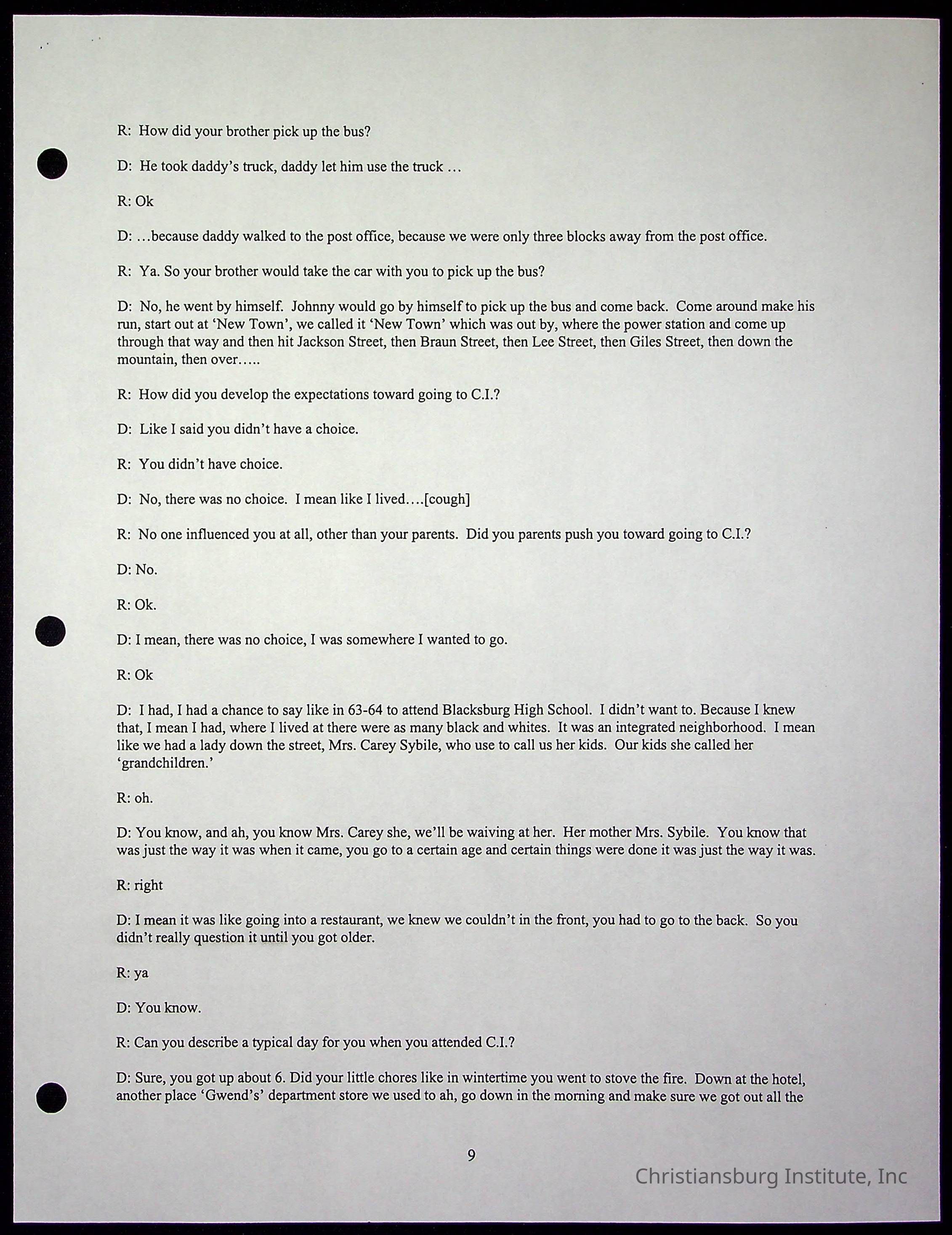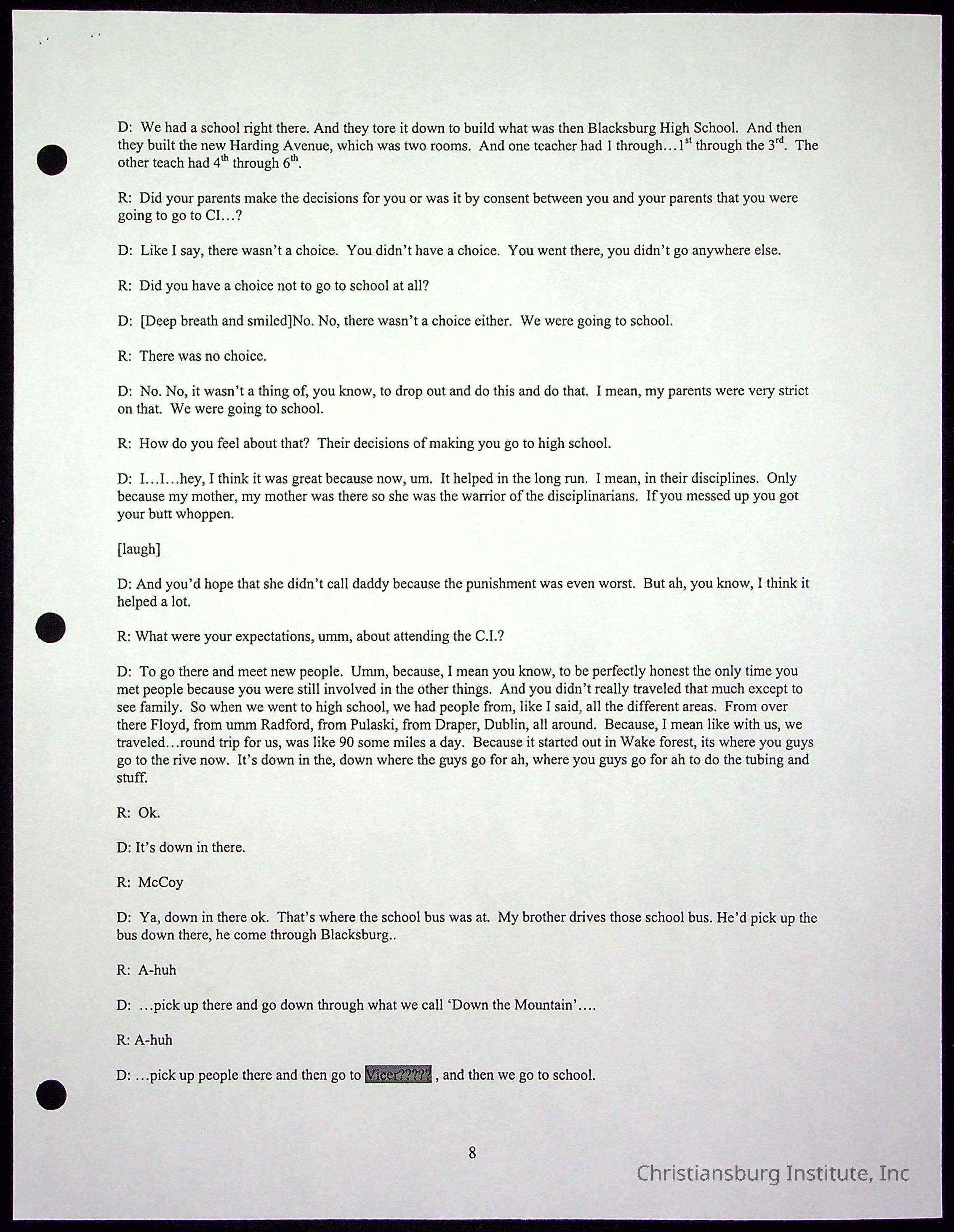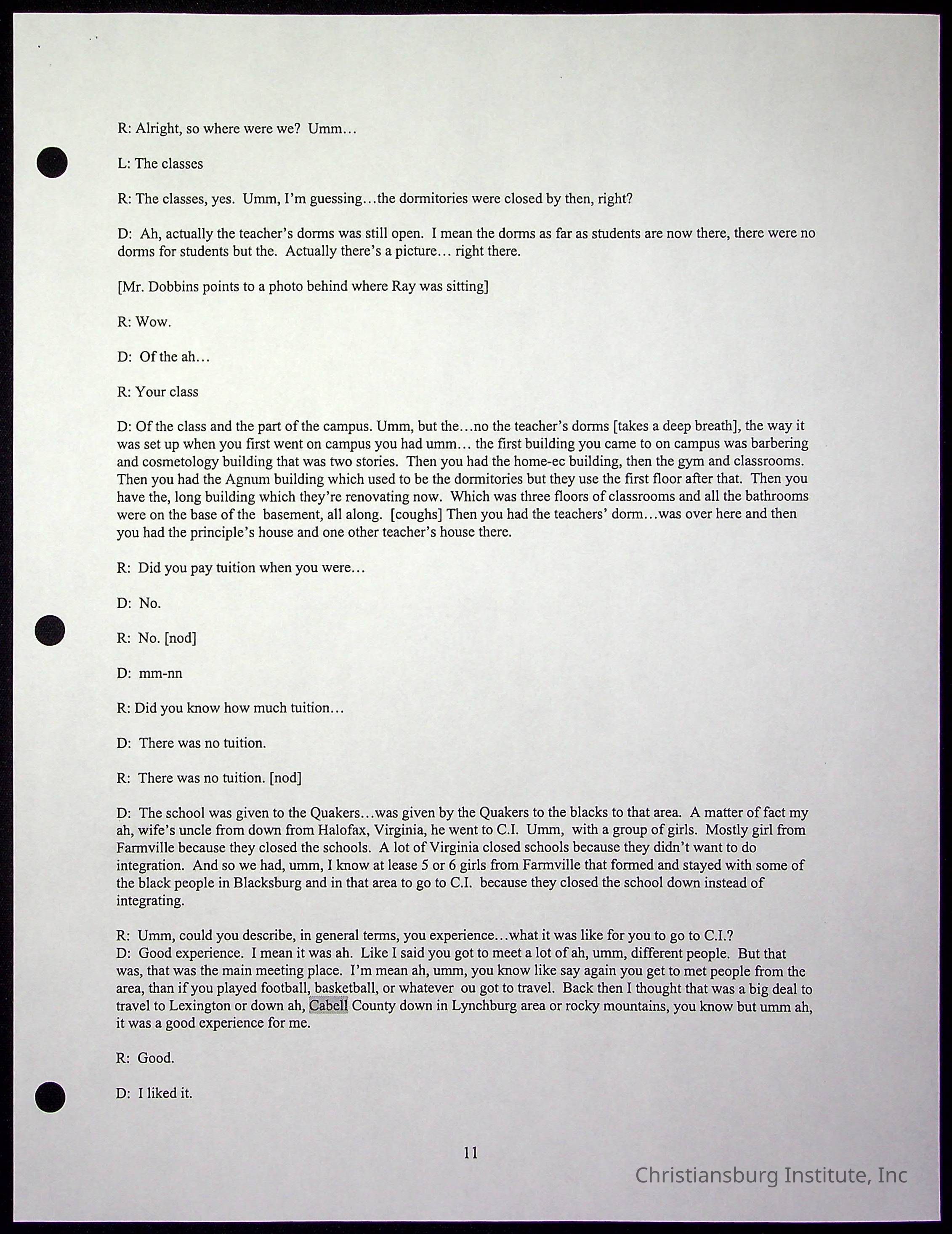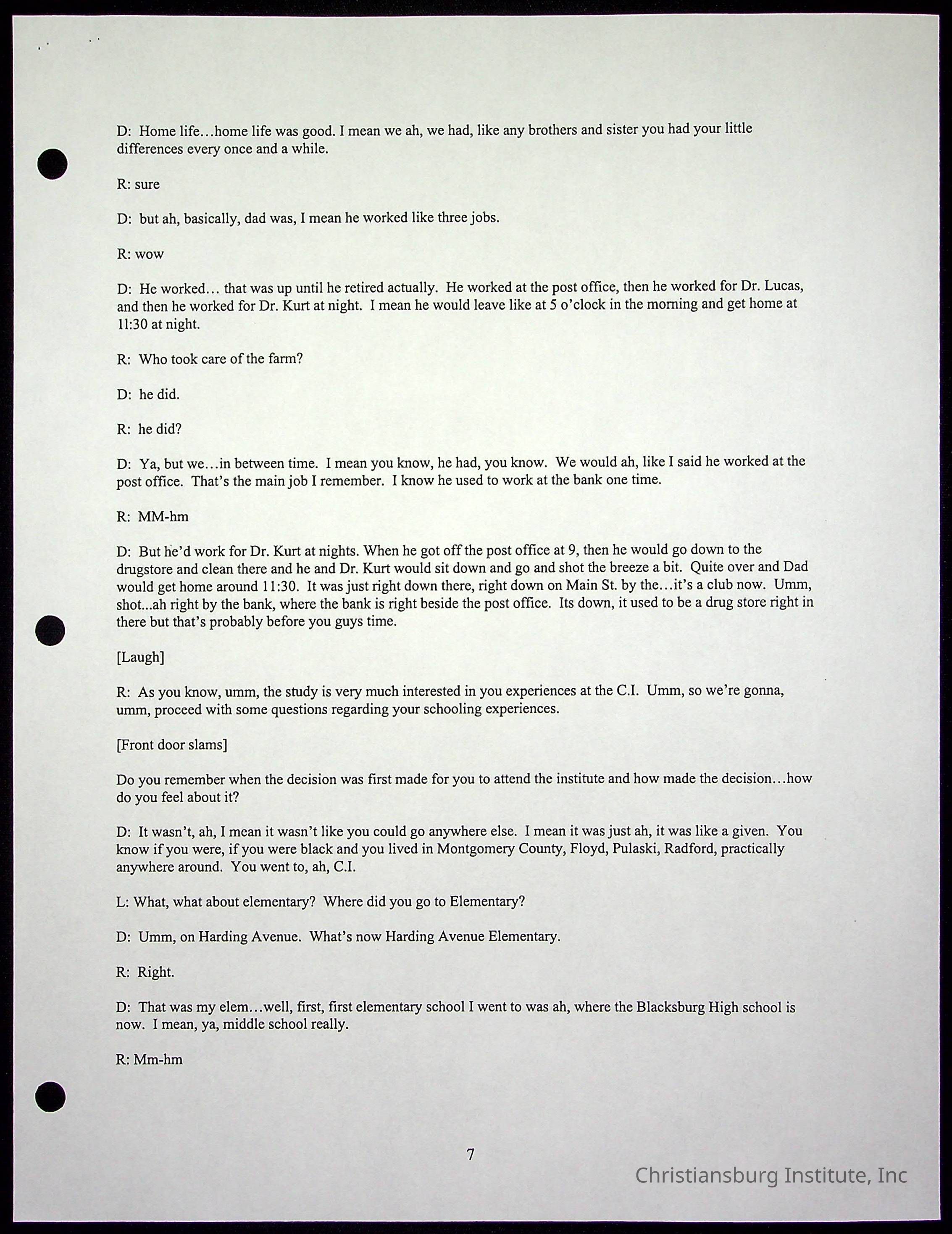 An oral history with Christiansburg Institute alumni, Rice Dobbins Jr conducted by Ray de Leon and Laura Shillington on April 7th, 2001.