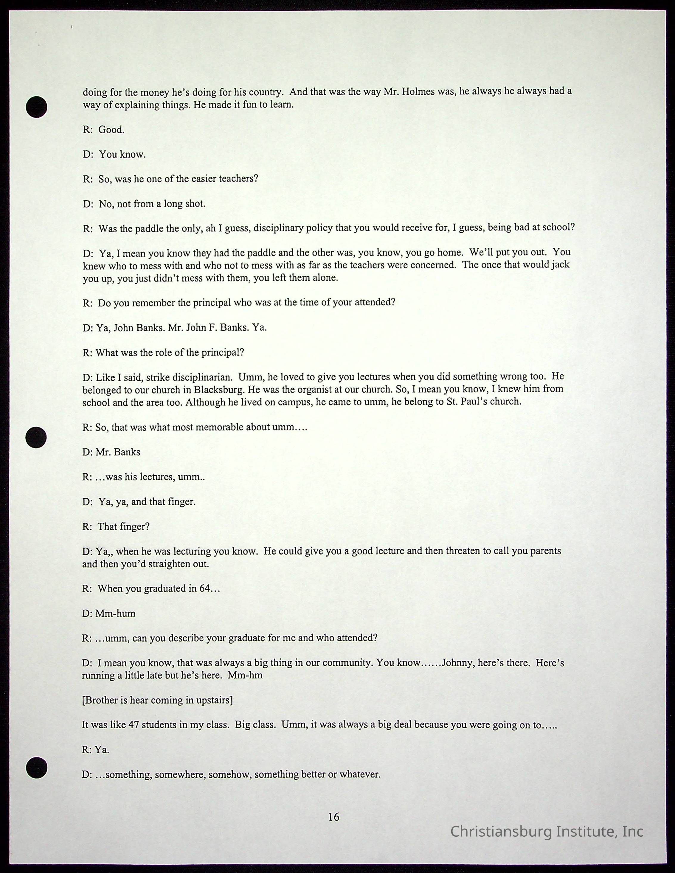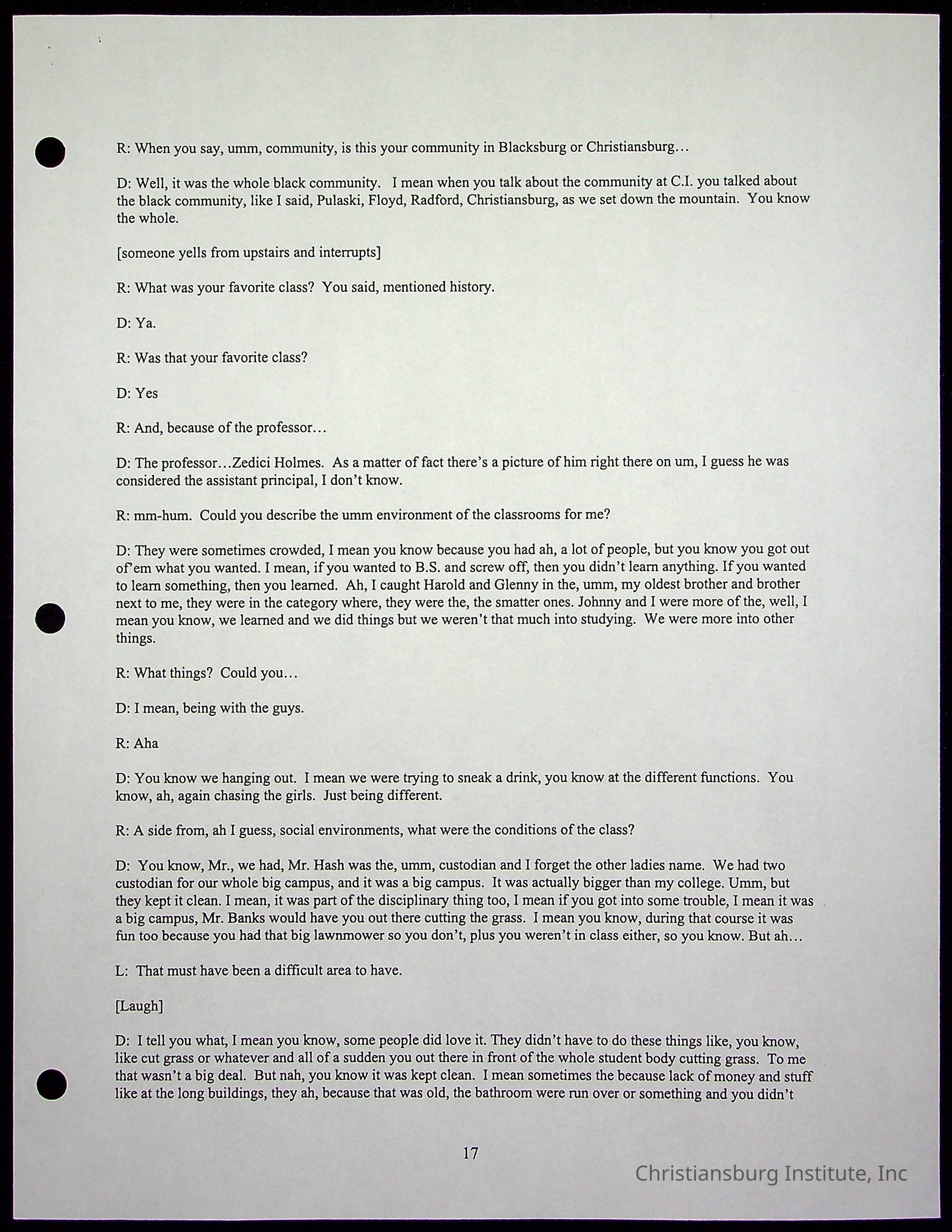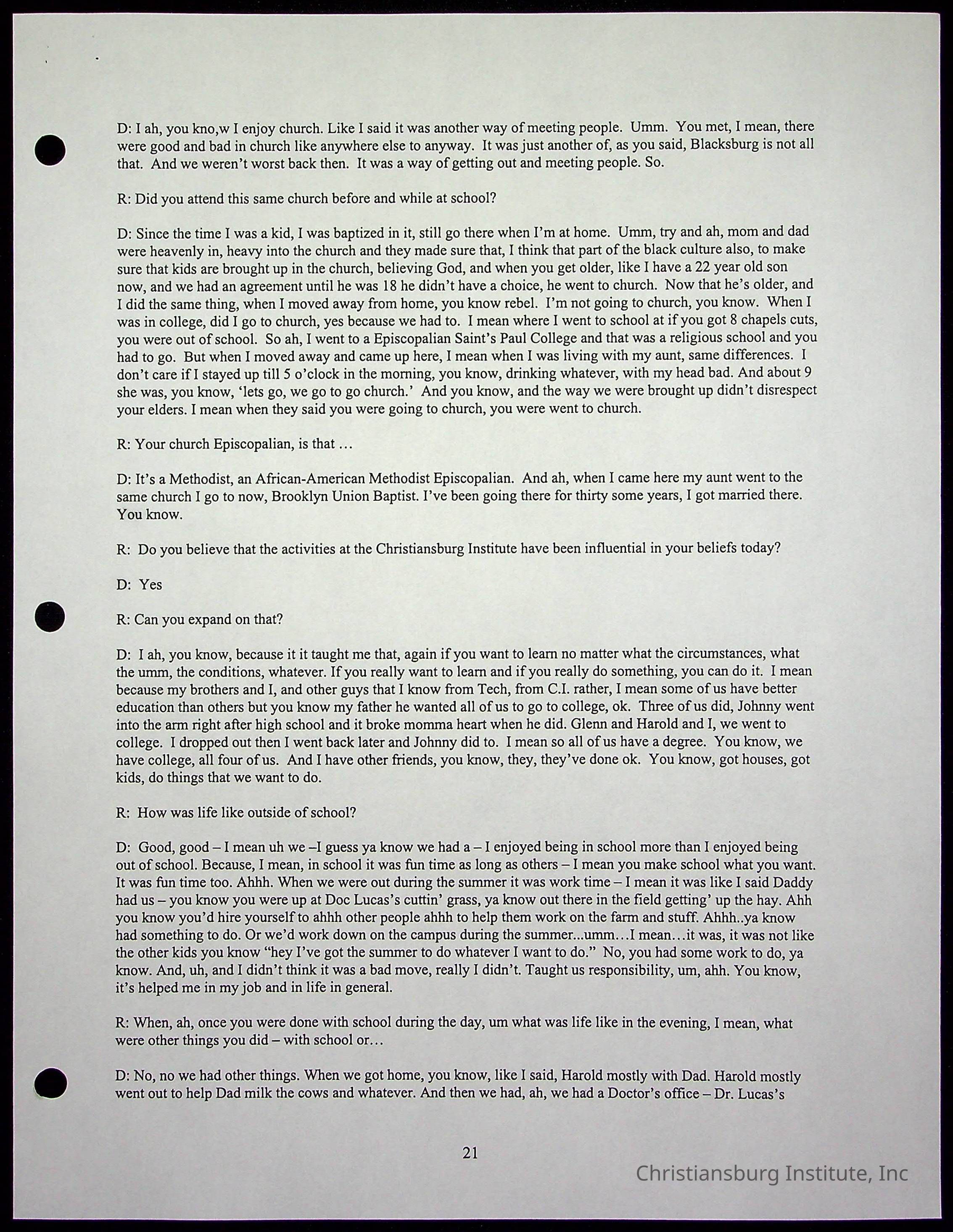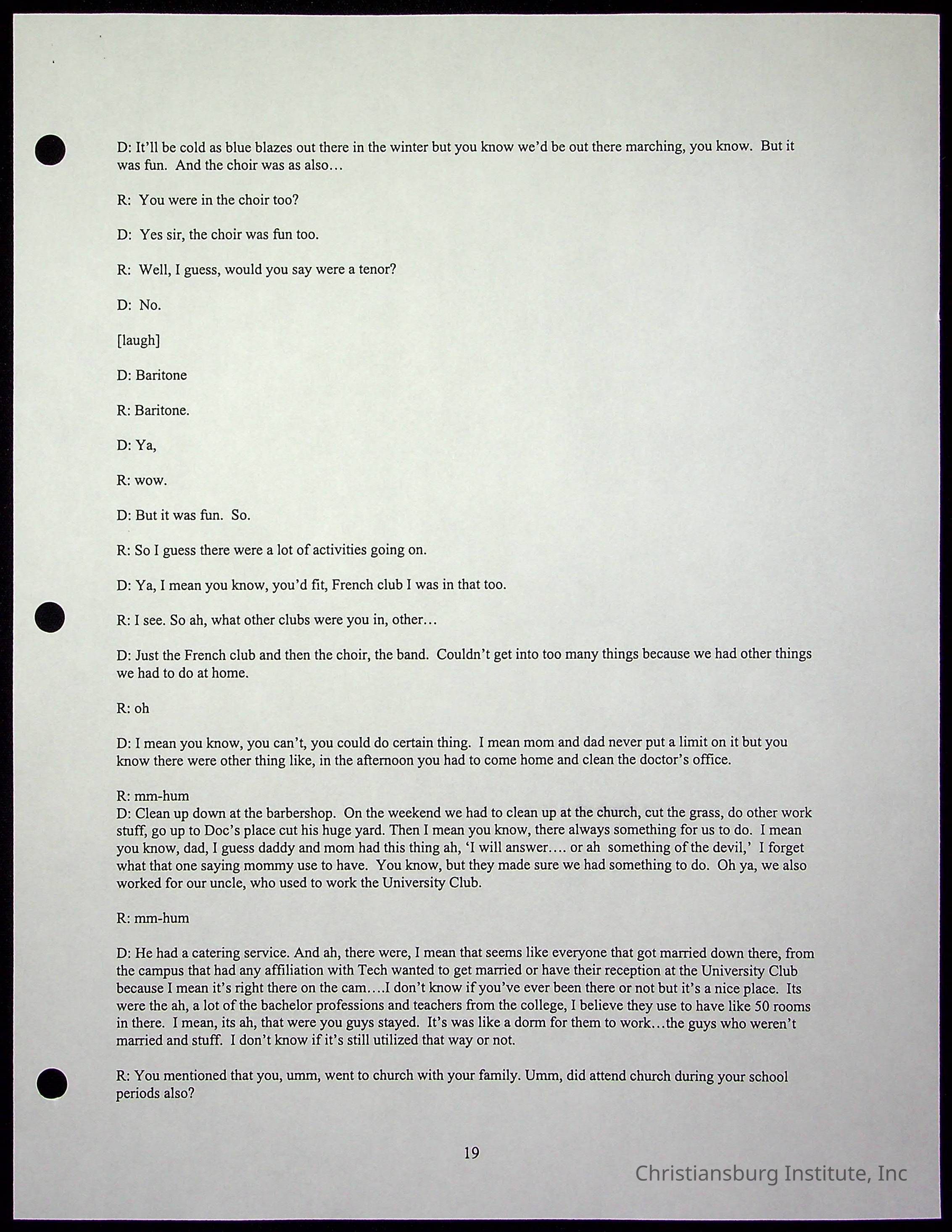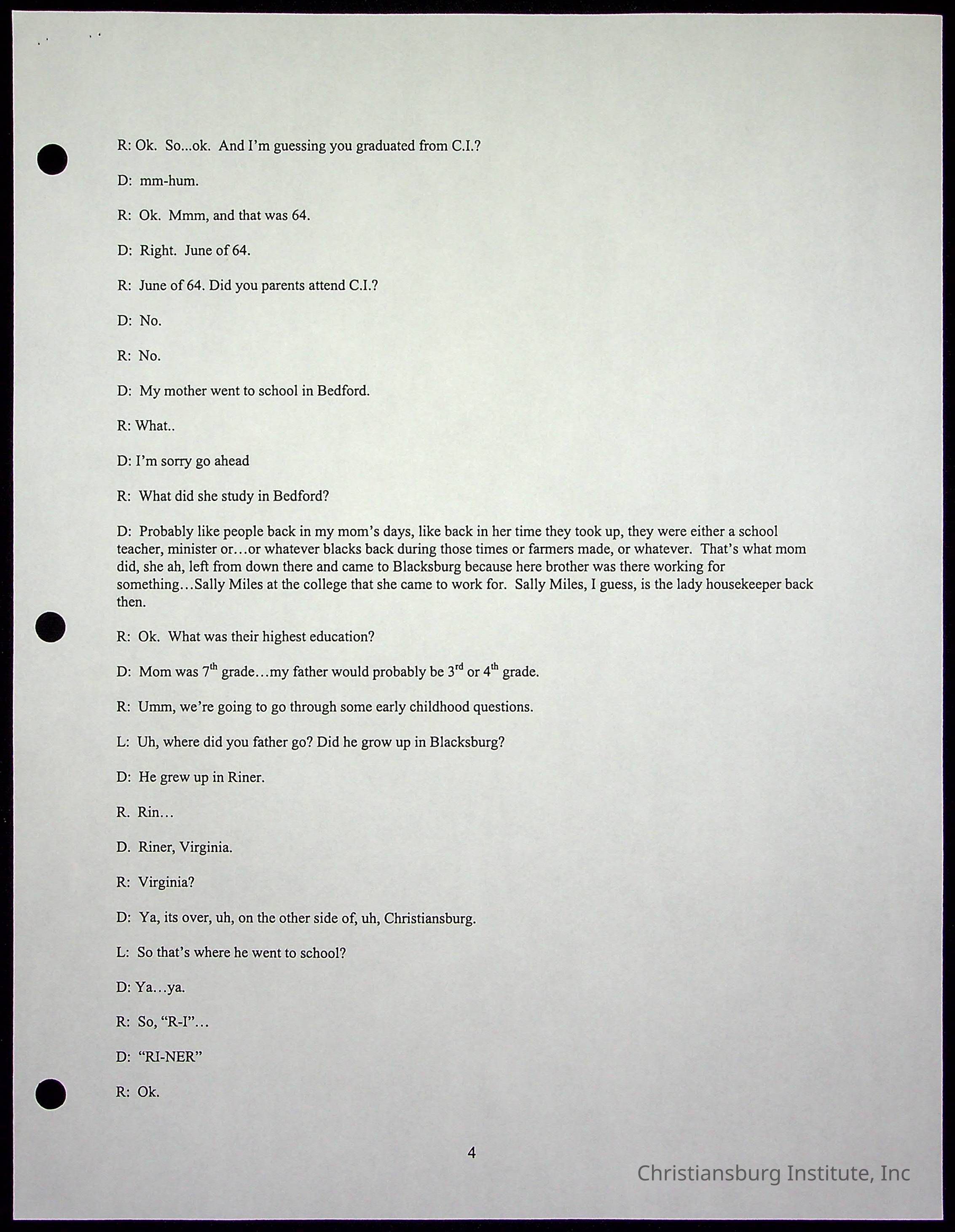 An oral history with Christiansburg Institute alumni, Rice Dobbins Jr conducted by Ray de Leon and Laura Shillington on April 7th, 2001.