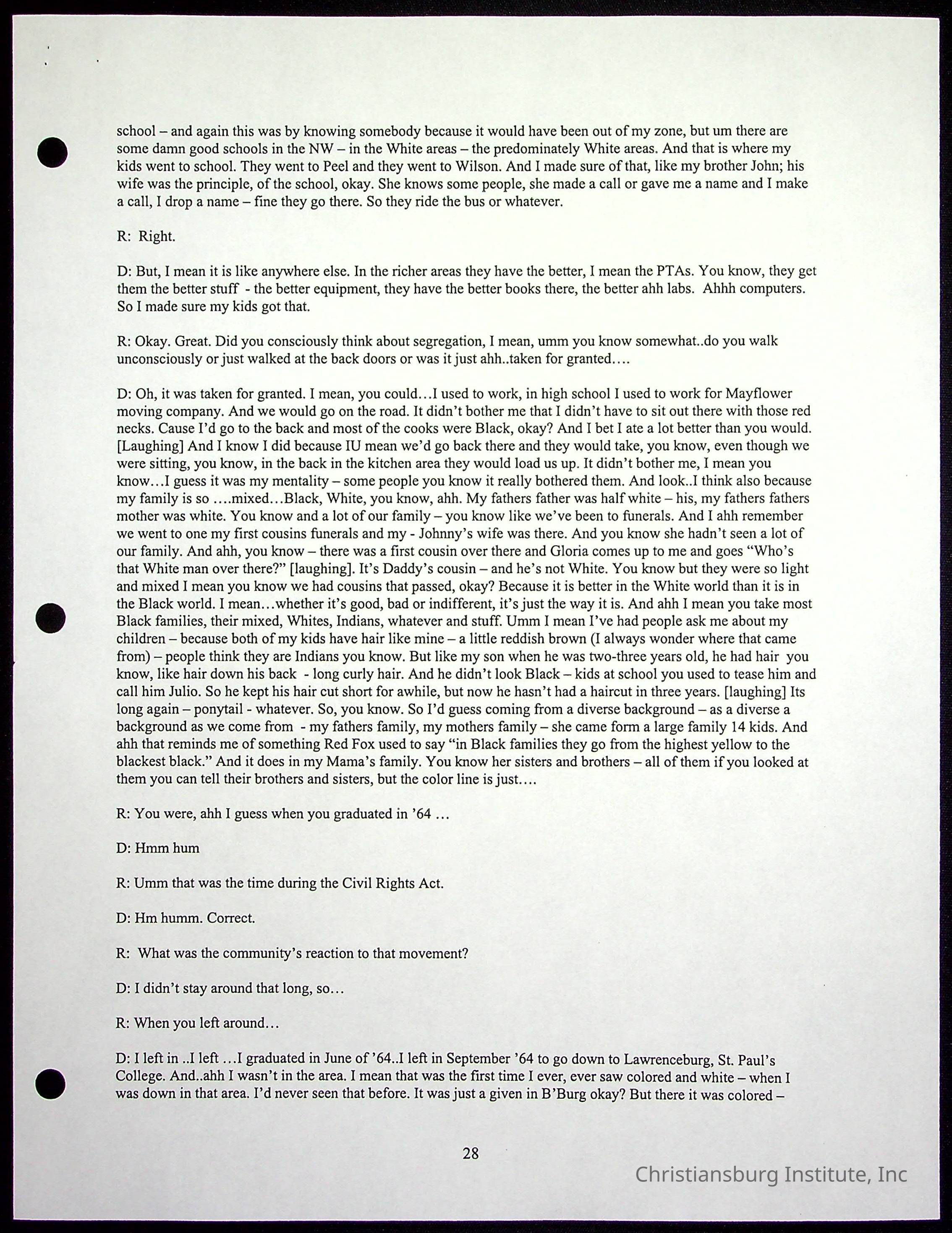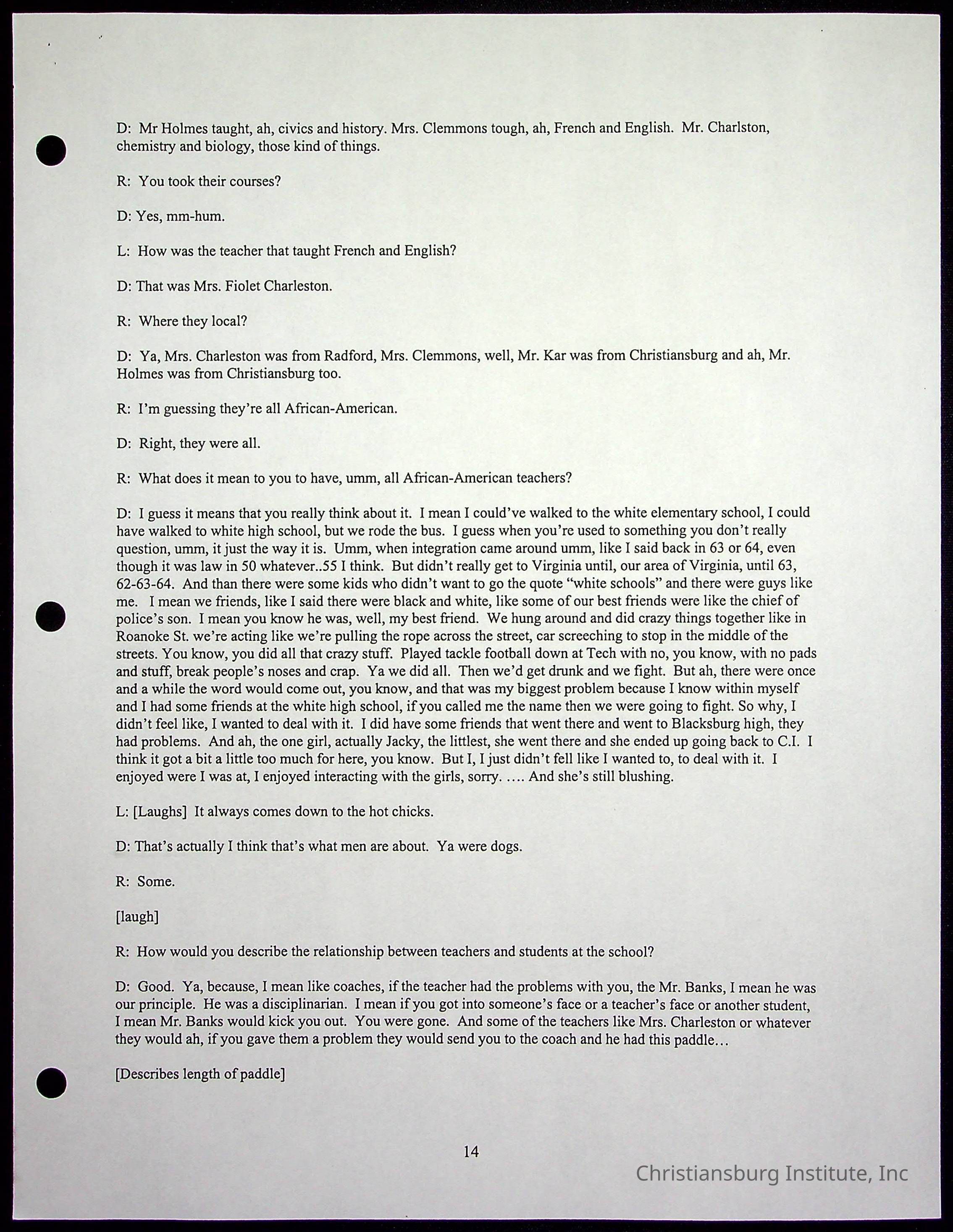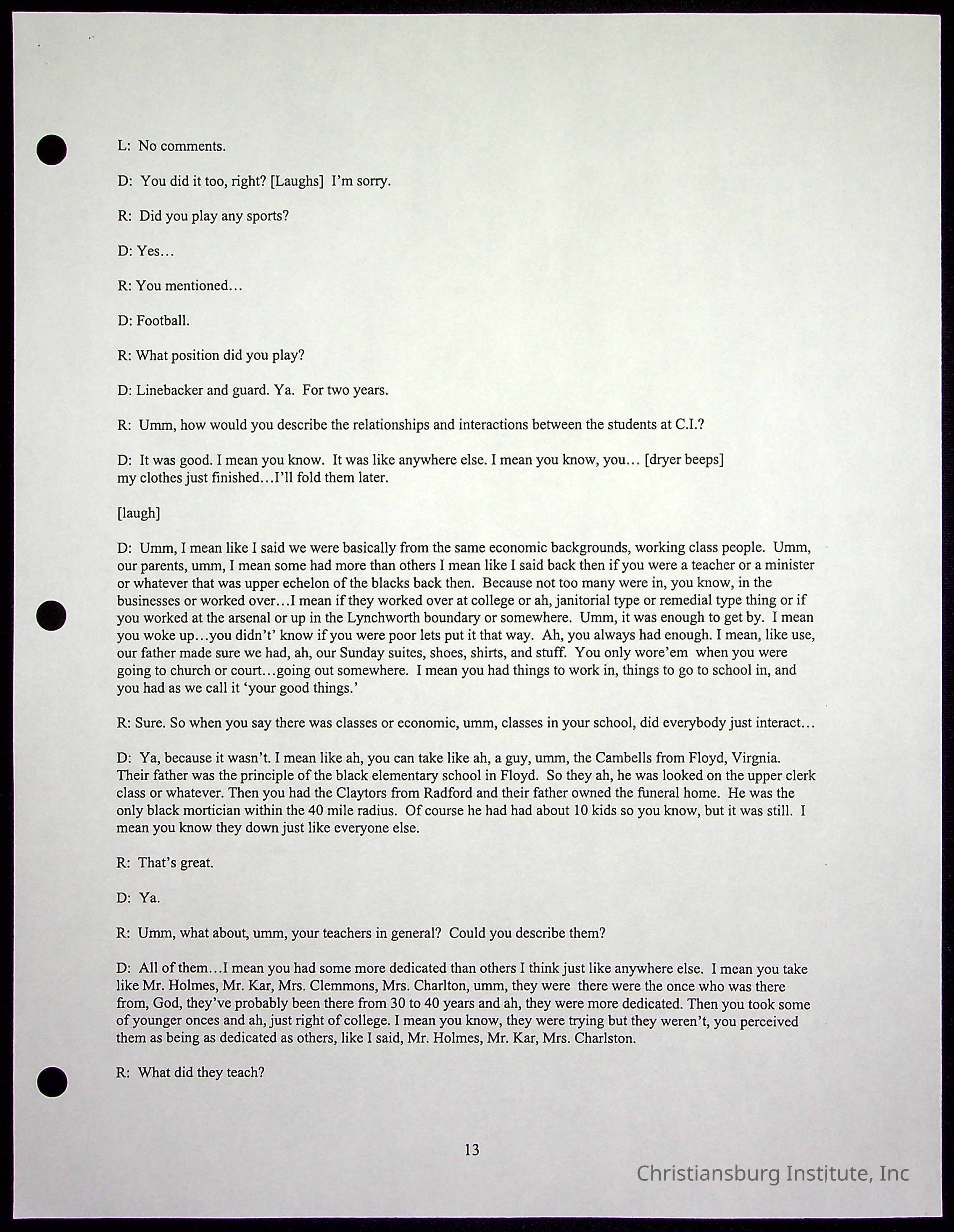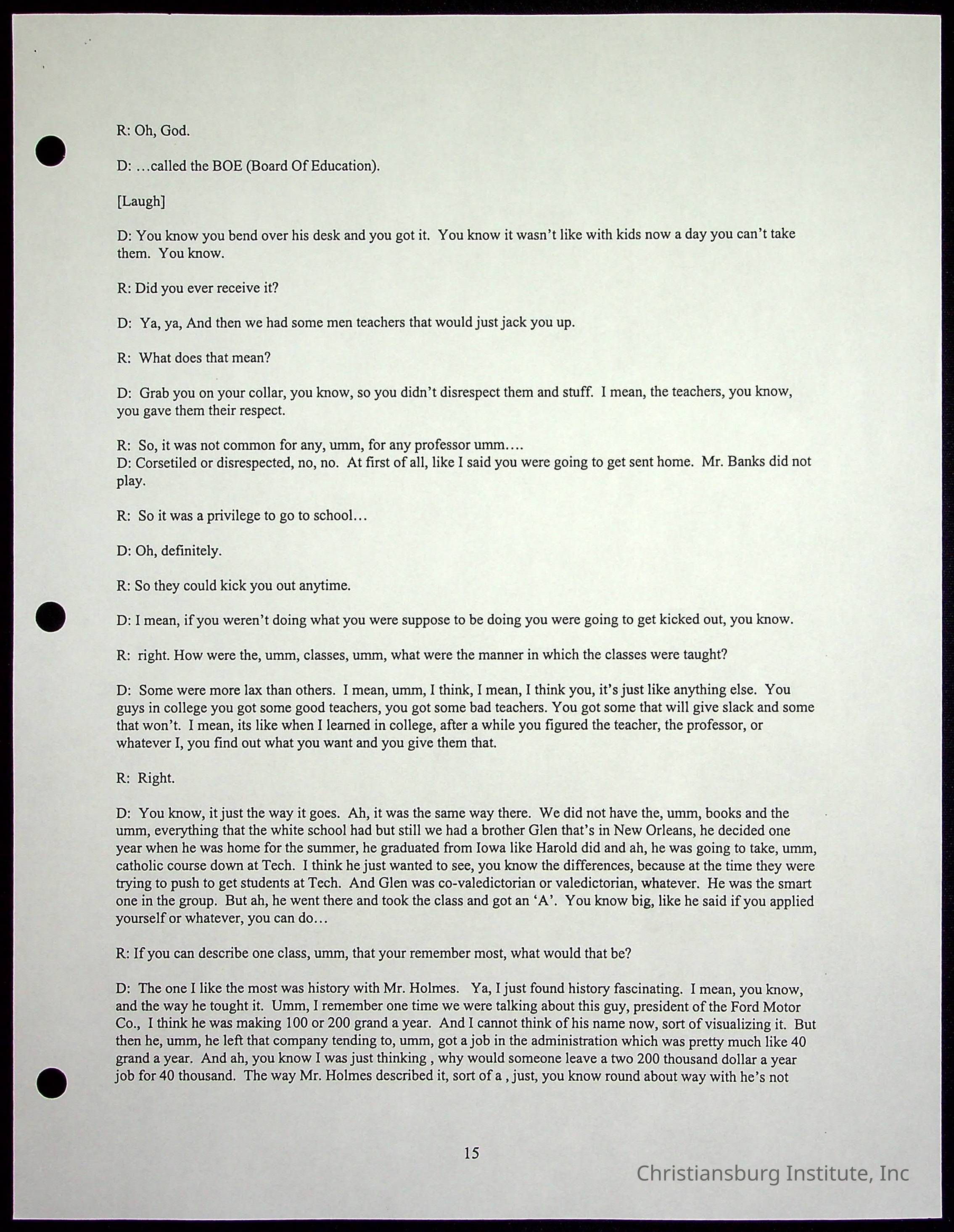 An oral history with Christiansburg Institute alumni, Rice Dobbins Jr conducted by Ray de Leon and Laura Shillington on April 7th, 2001.