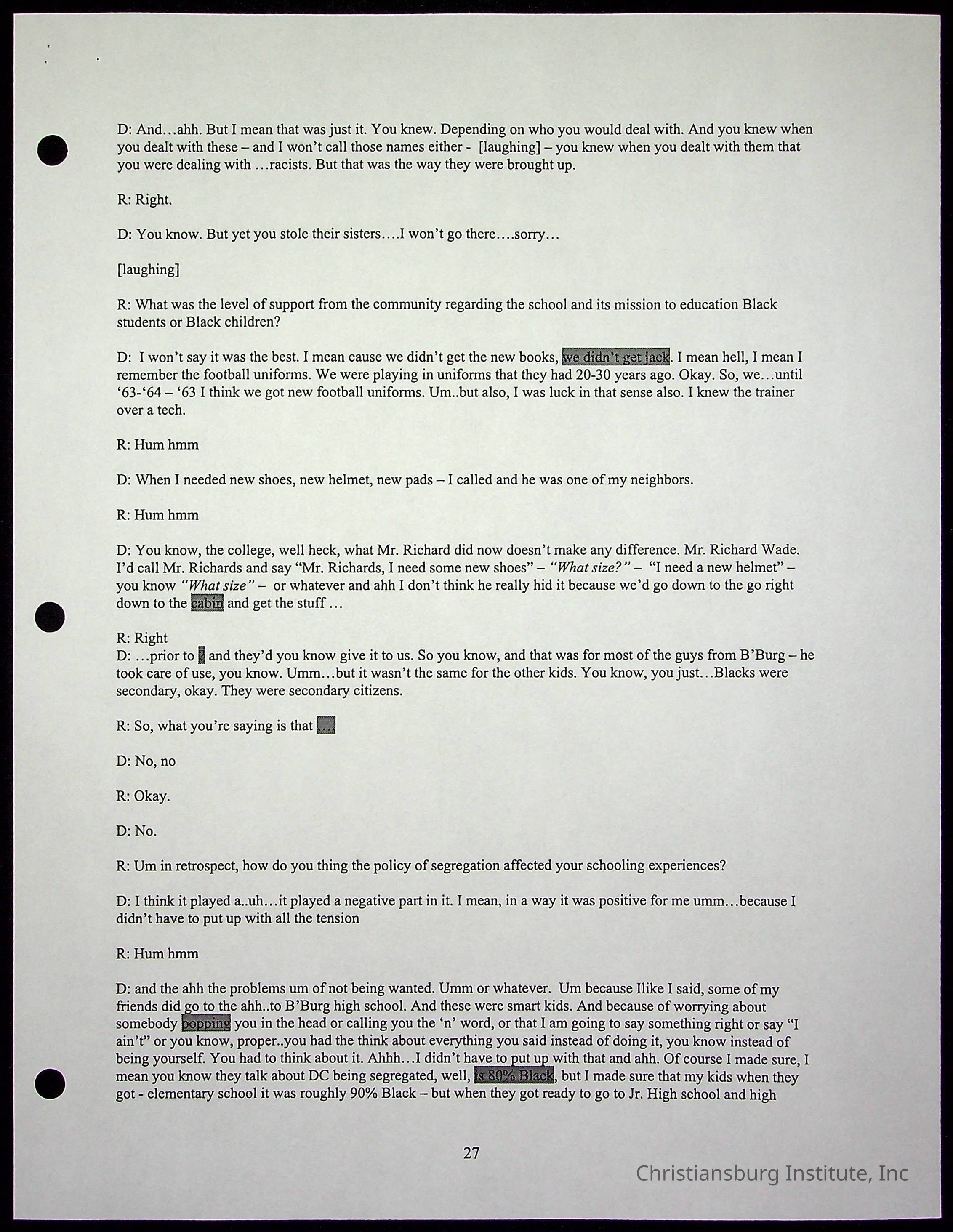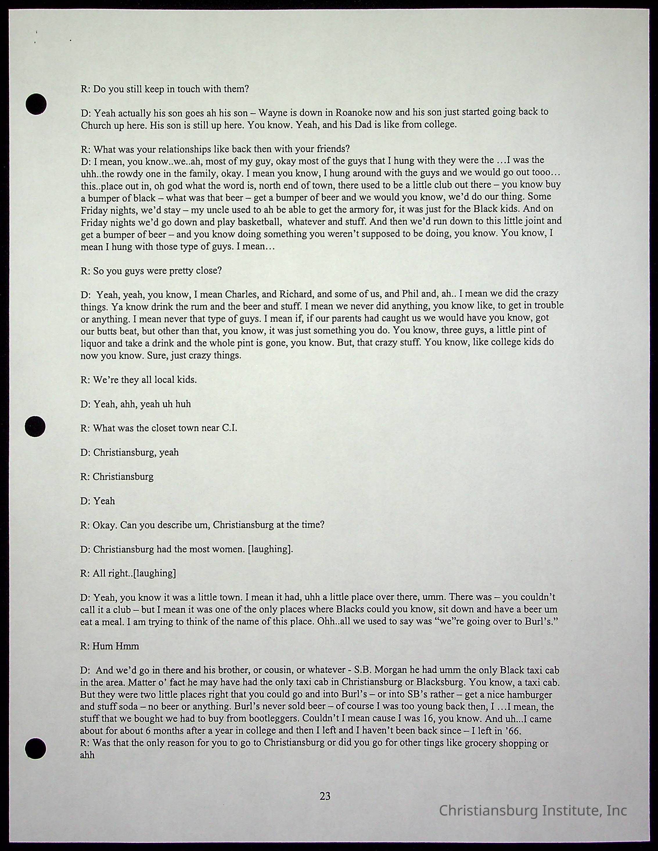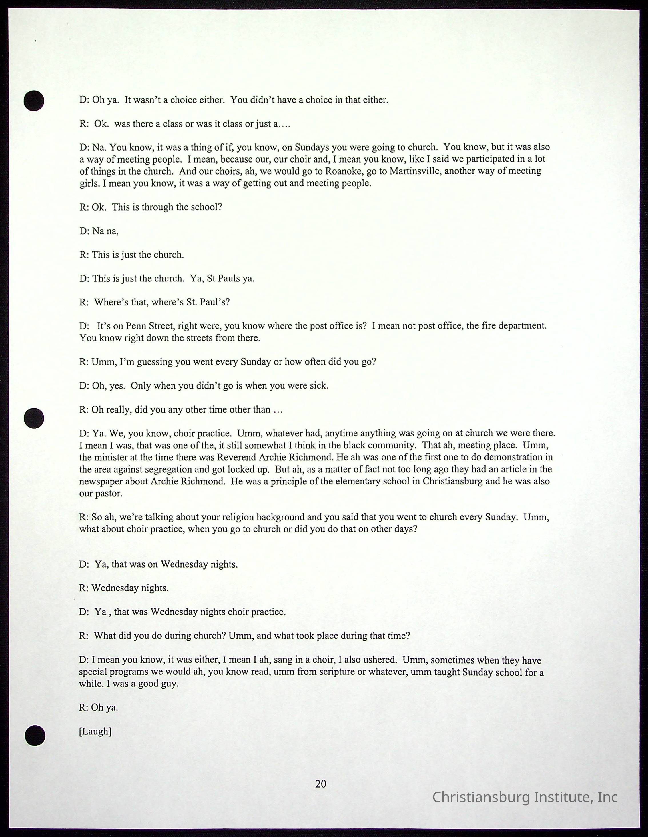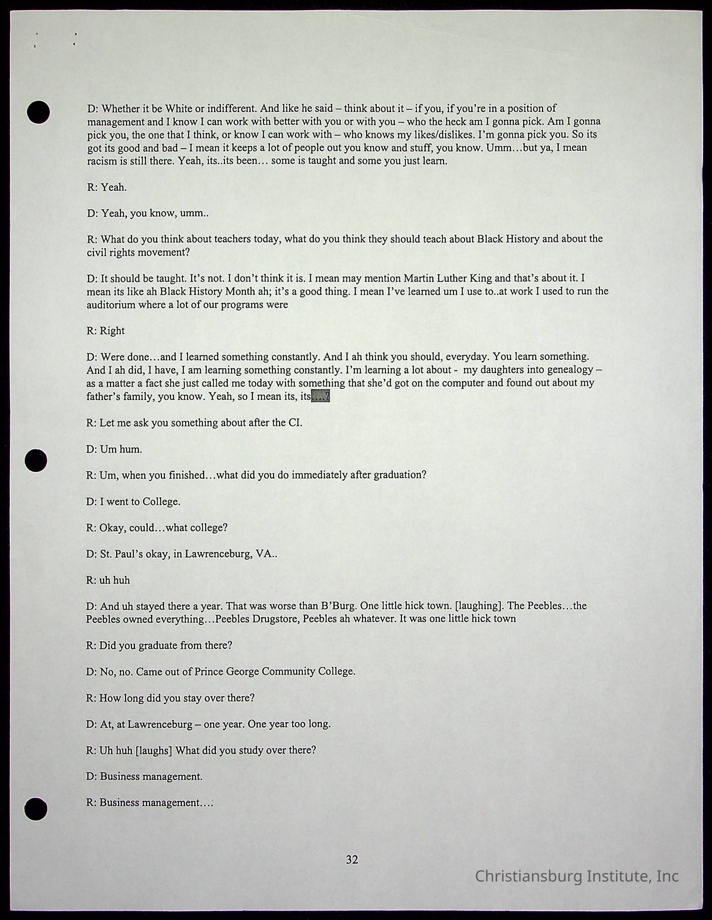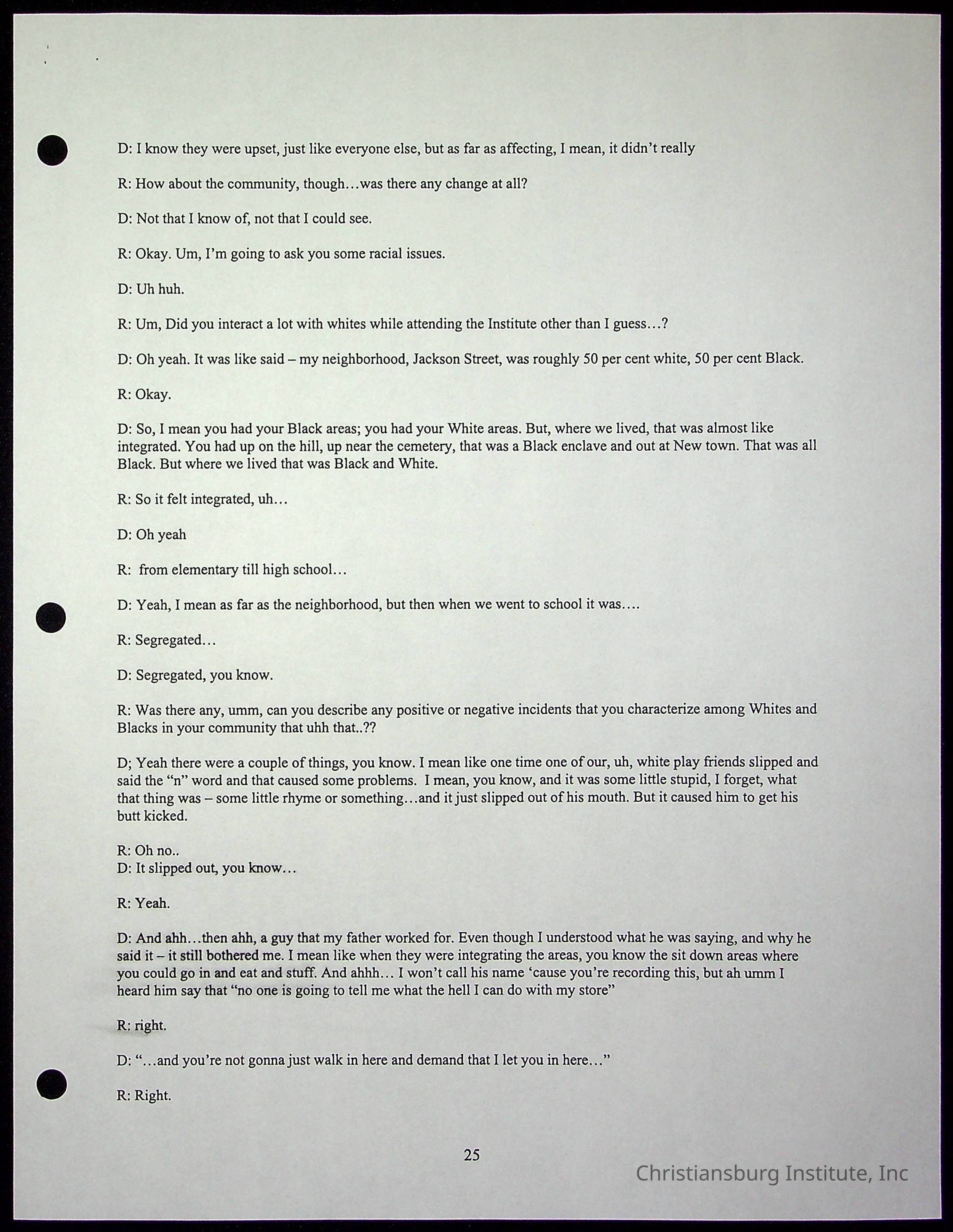 An oral history with Christiansburg Institute alumni, Rice Dobbins Jr conducted by Ray de Leon and Laura Shillington on April 7th, 2001.