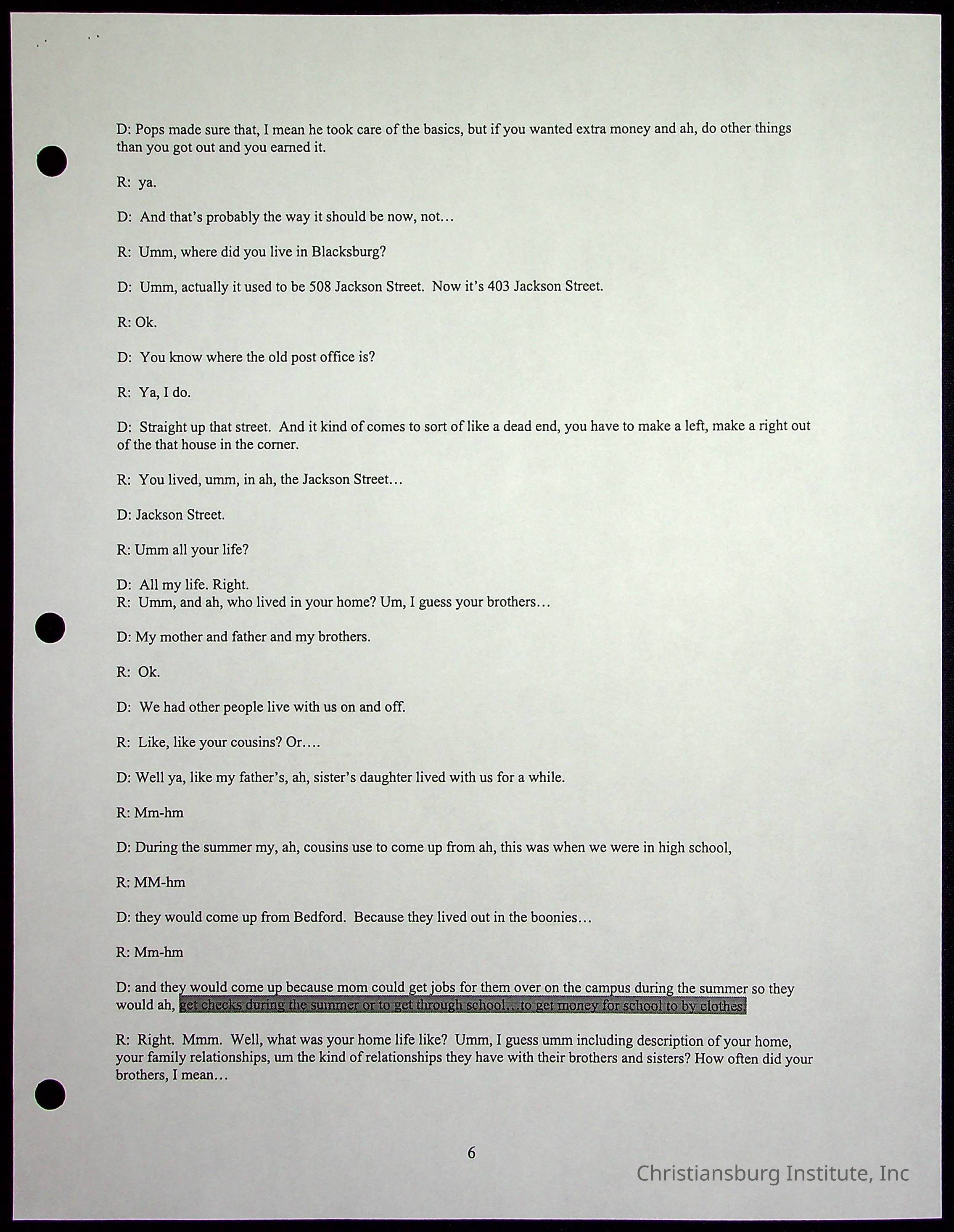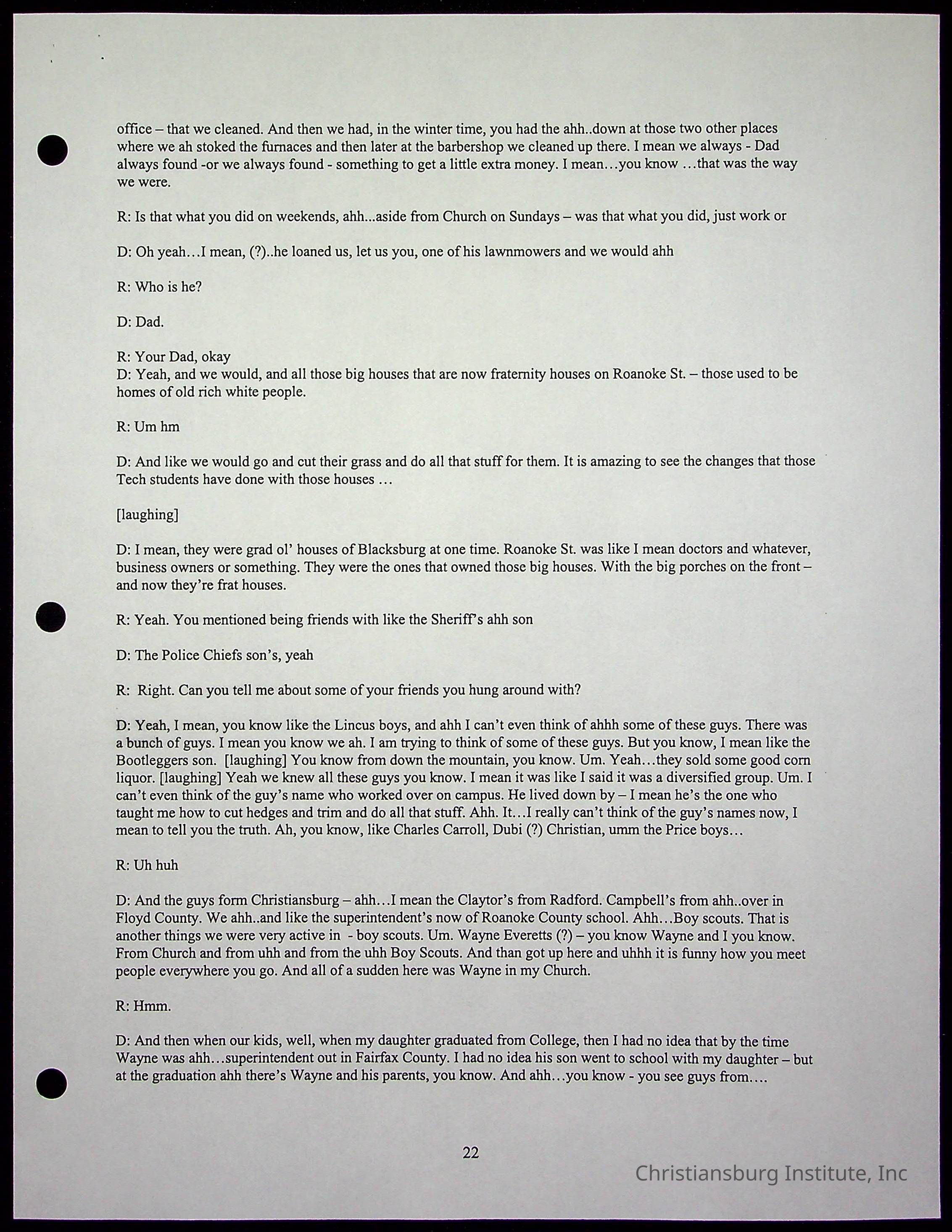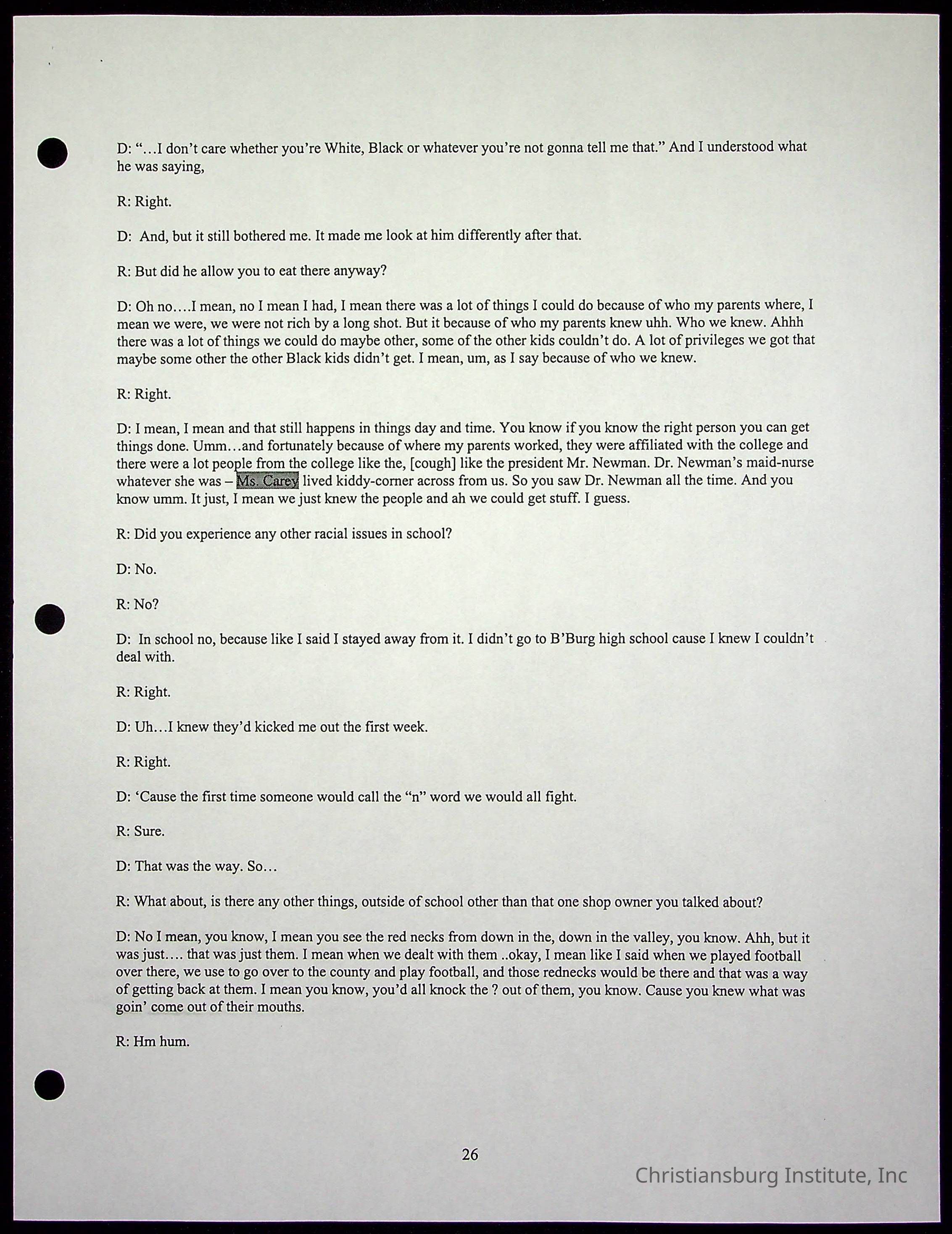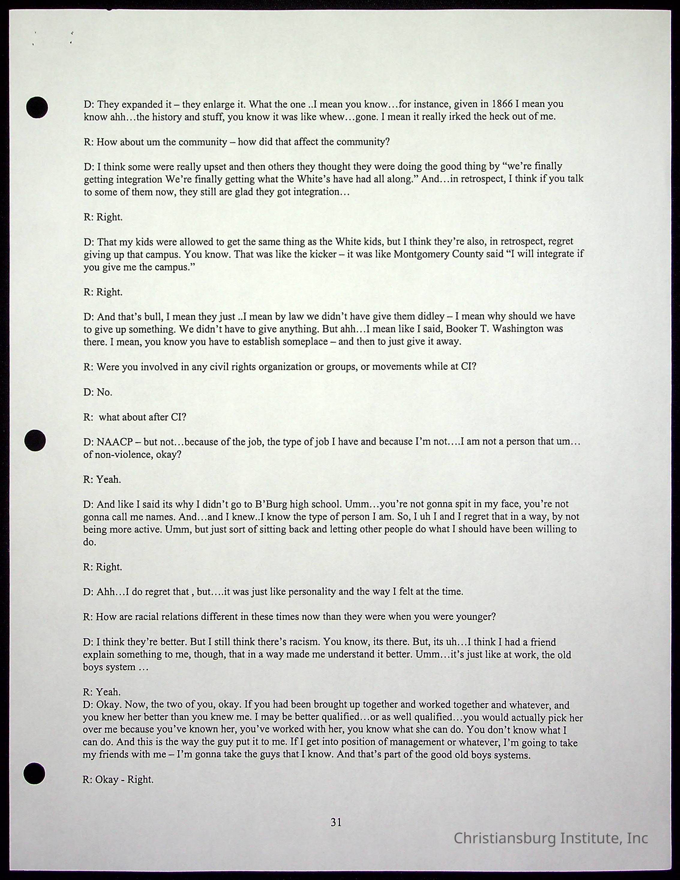 An oral history with Christiansburg Institute alumni, Rice Dobbins Jr conducted by Ray de Leon and Laura Shillington on April 7th, 2001.