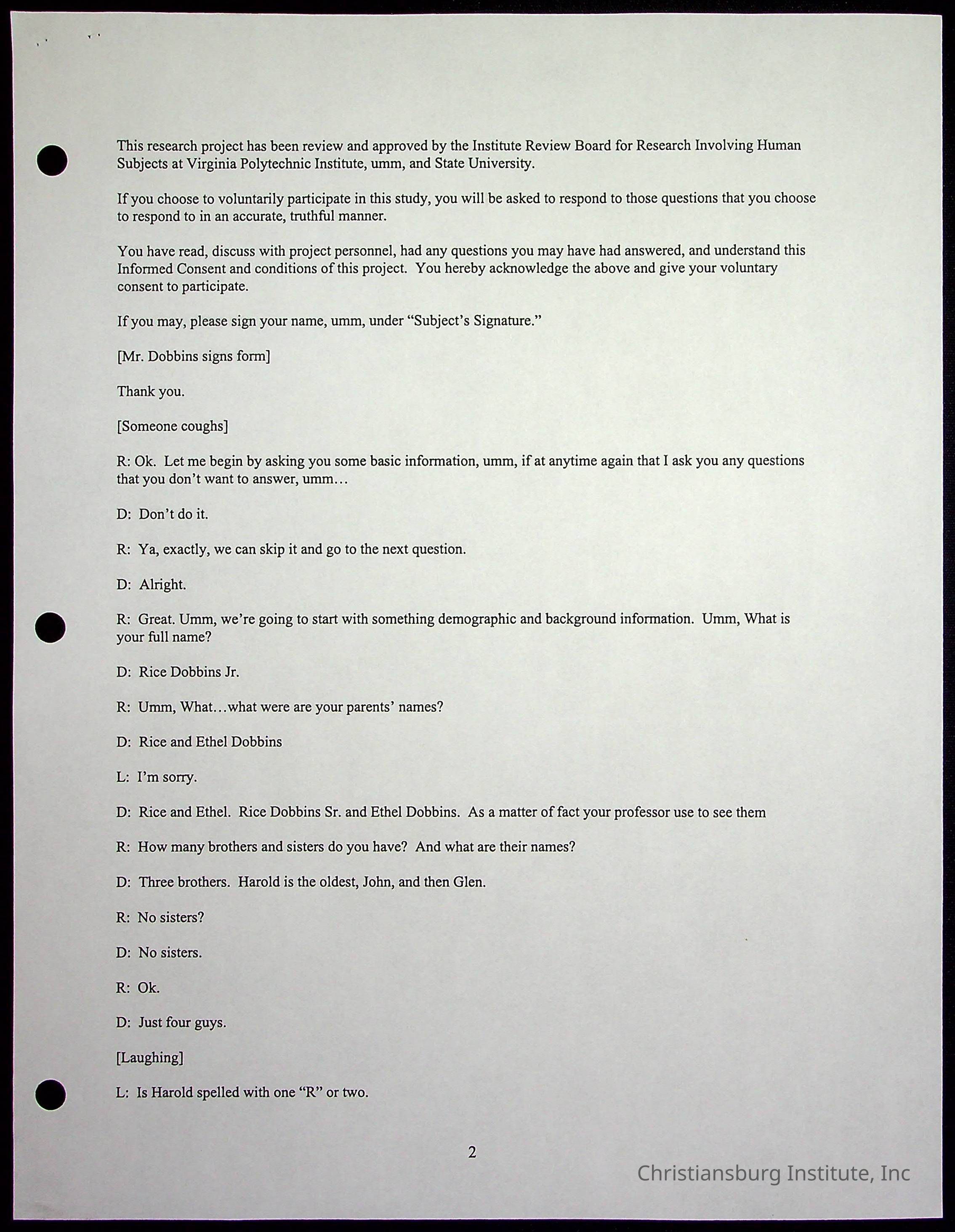 2000 Uttech Oral History Transcript, Rice Dobbins Jr