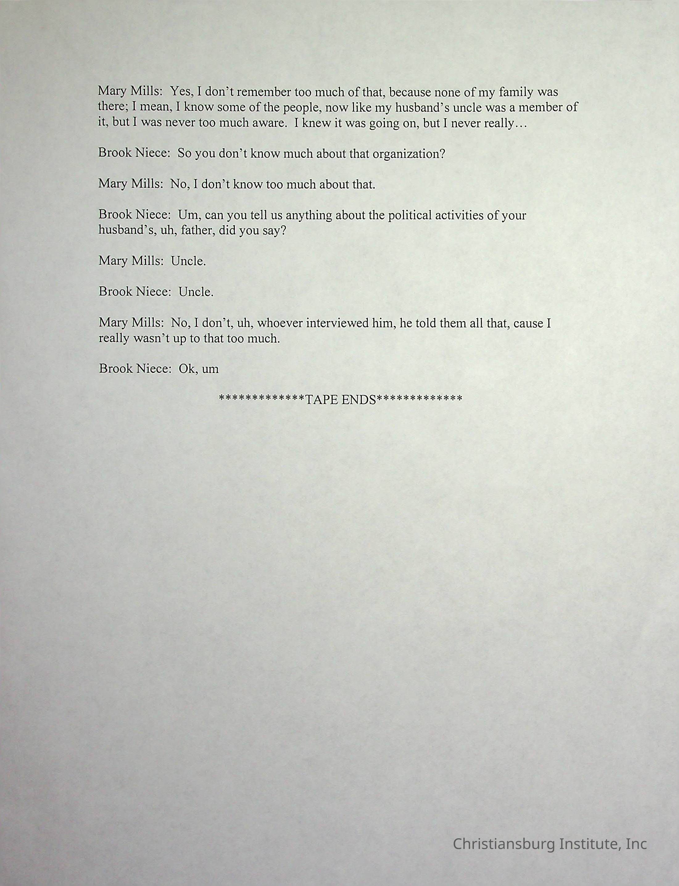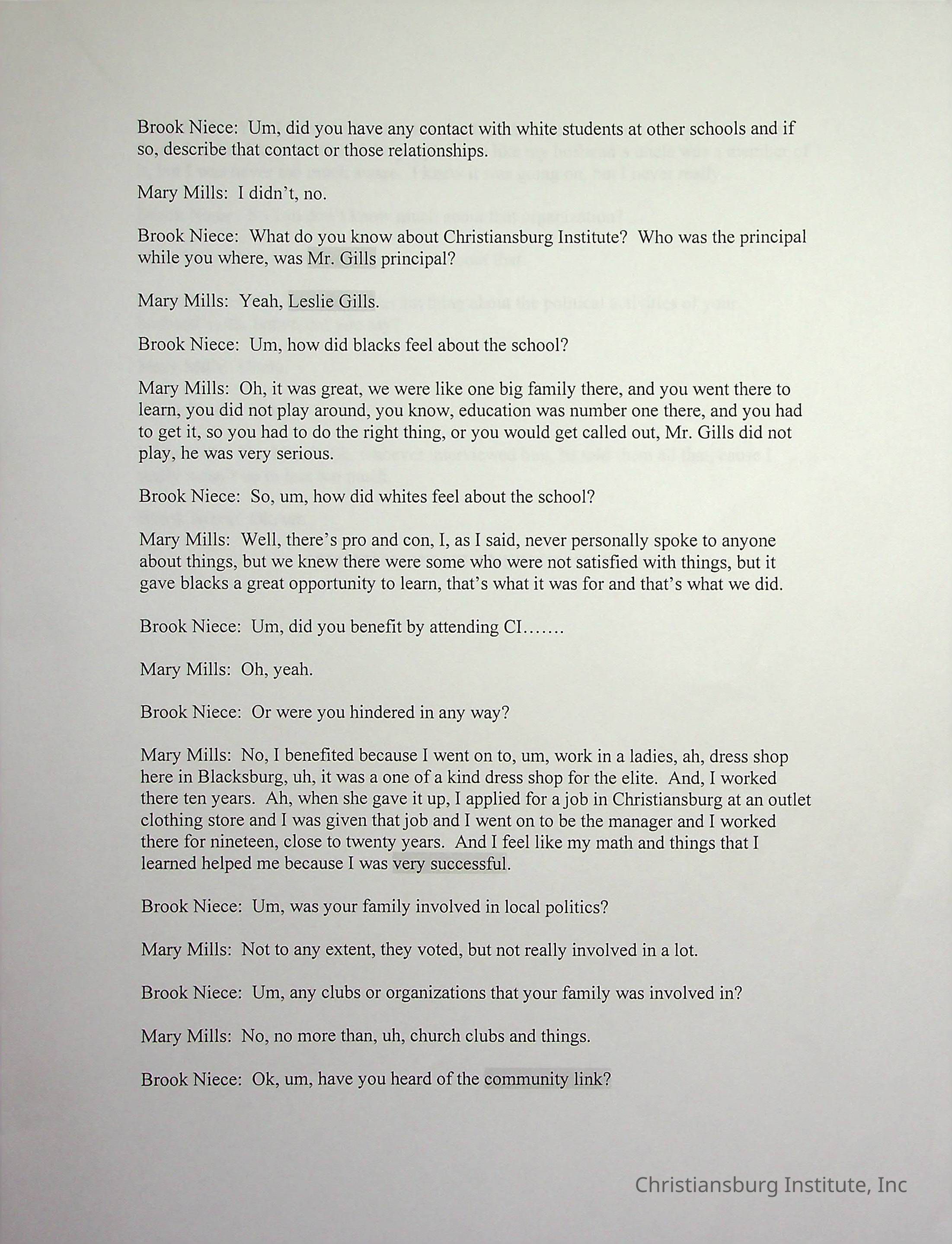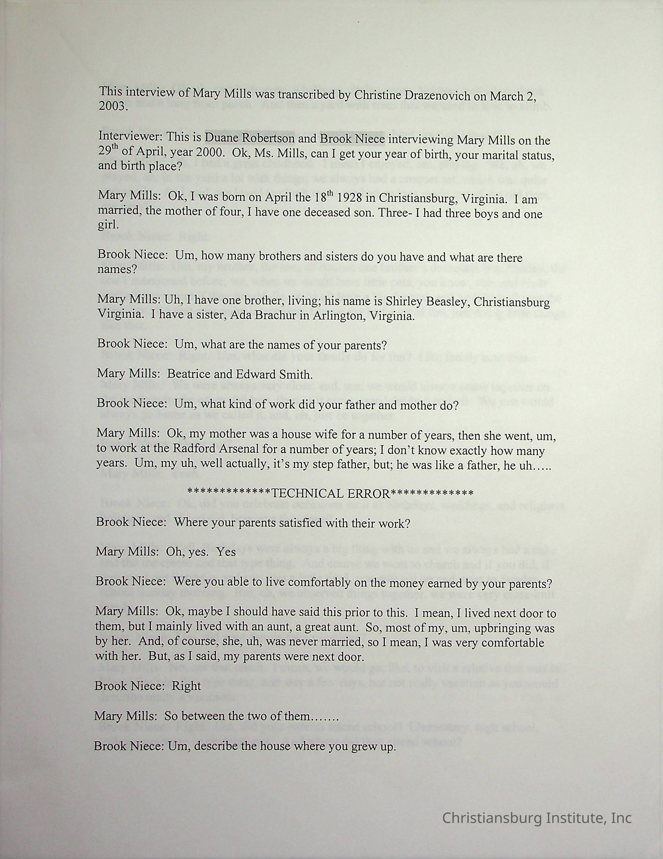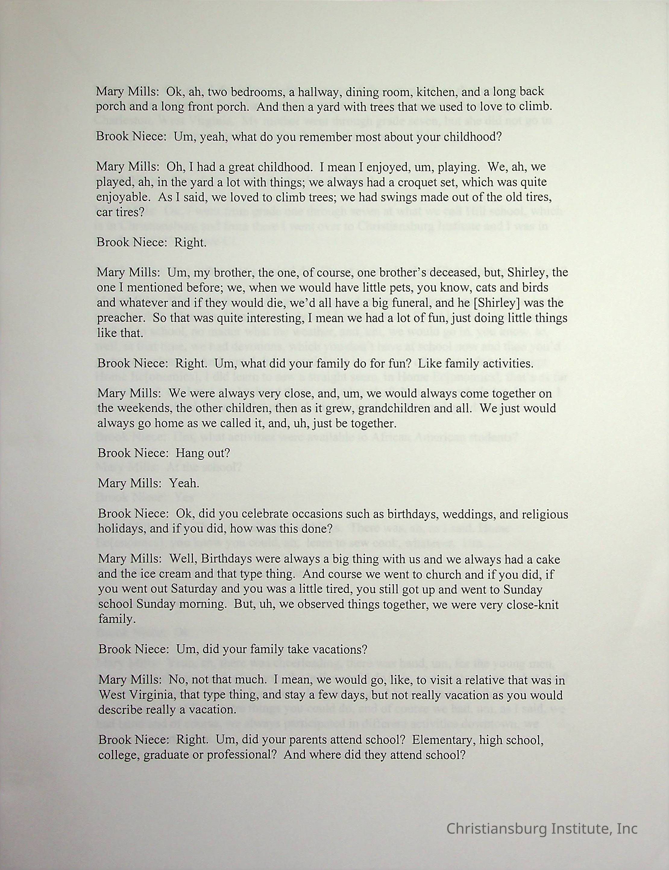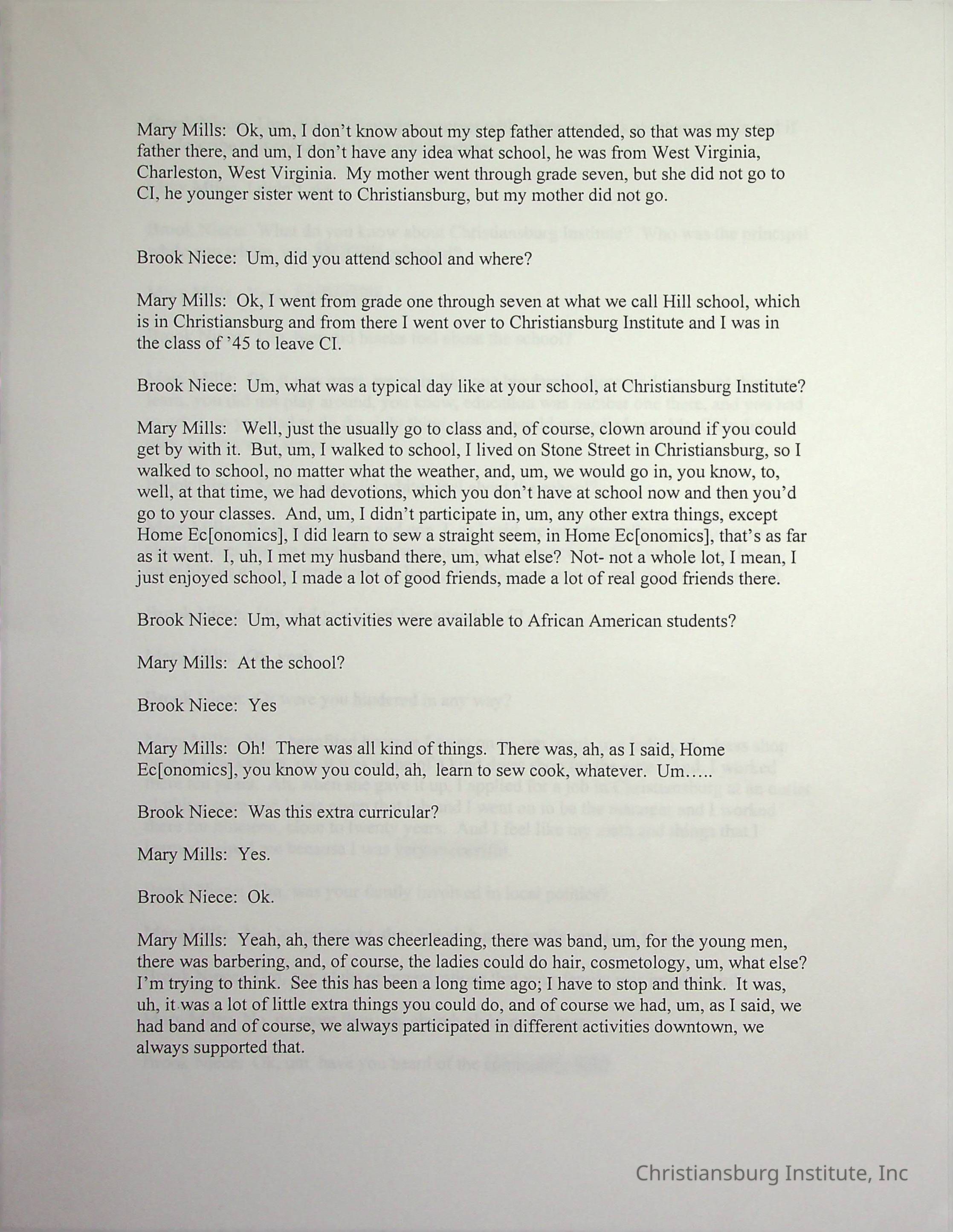 An oral history with Christiansburg Institute alumni, Mary Mills conducted by Duane Robertson and Brook Niece in March, 2003. This oral history was transcribed by Christine Drazenovich on March 2nd, 2003.Collection