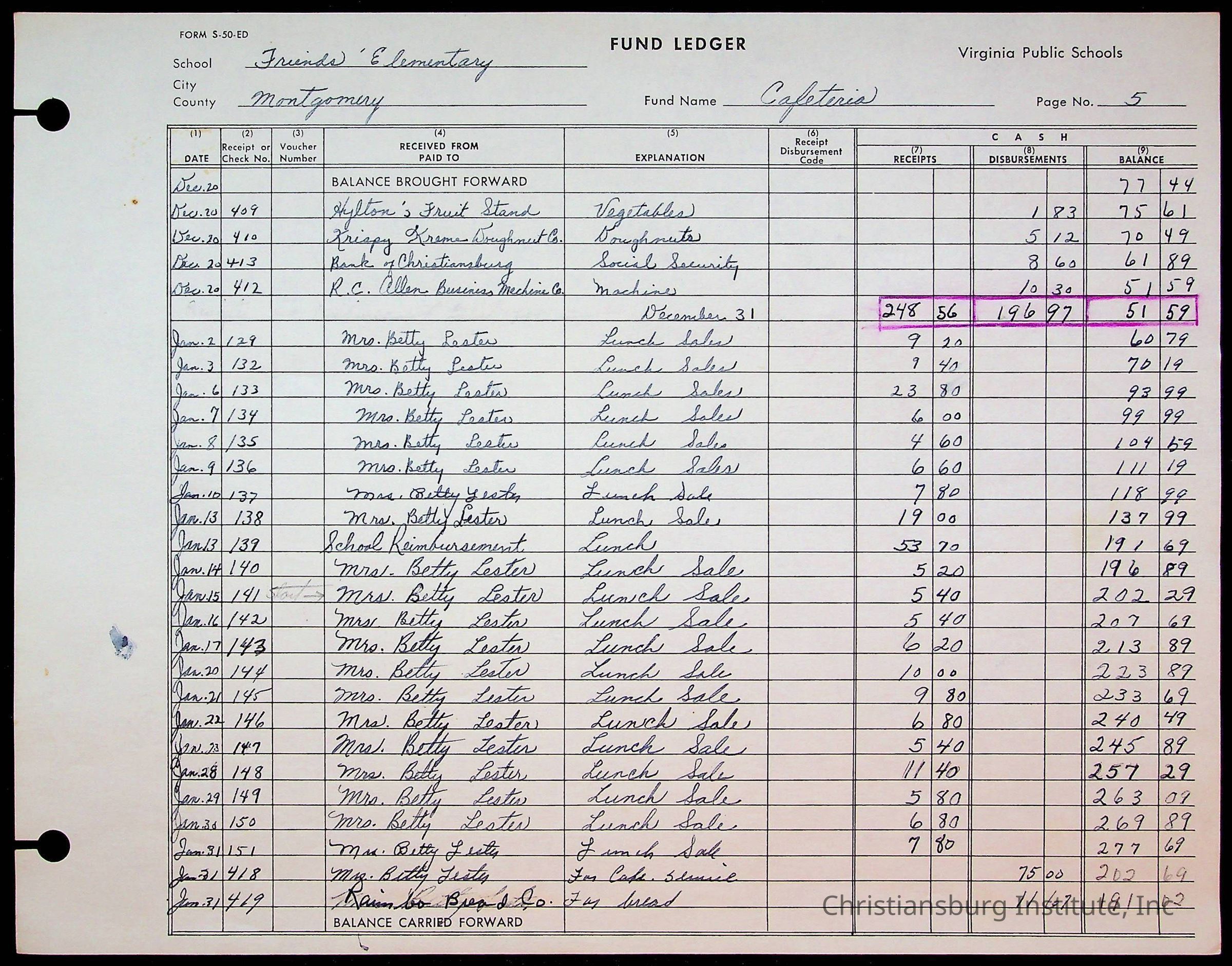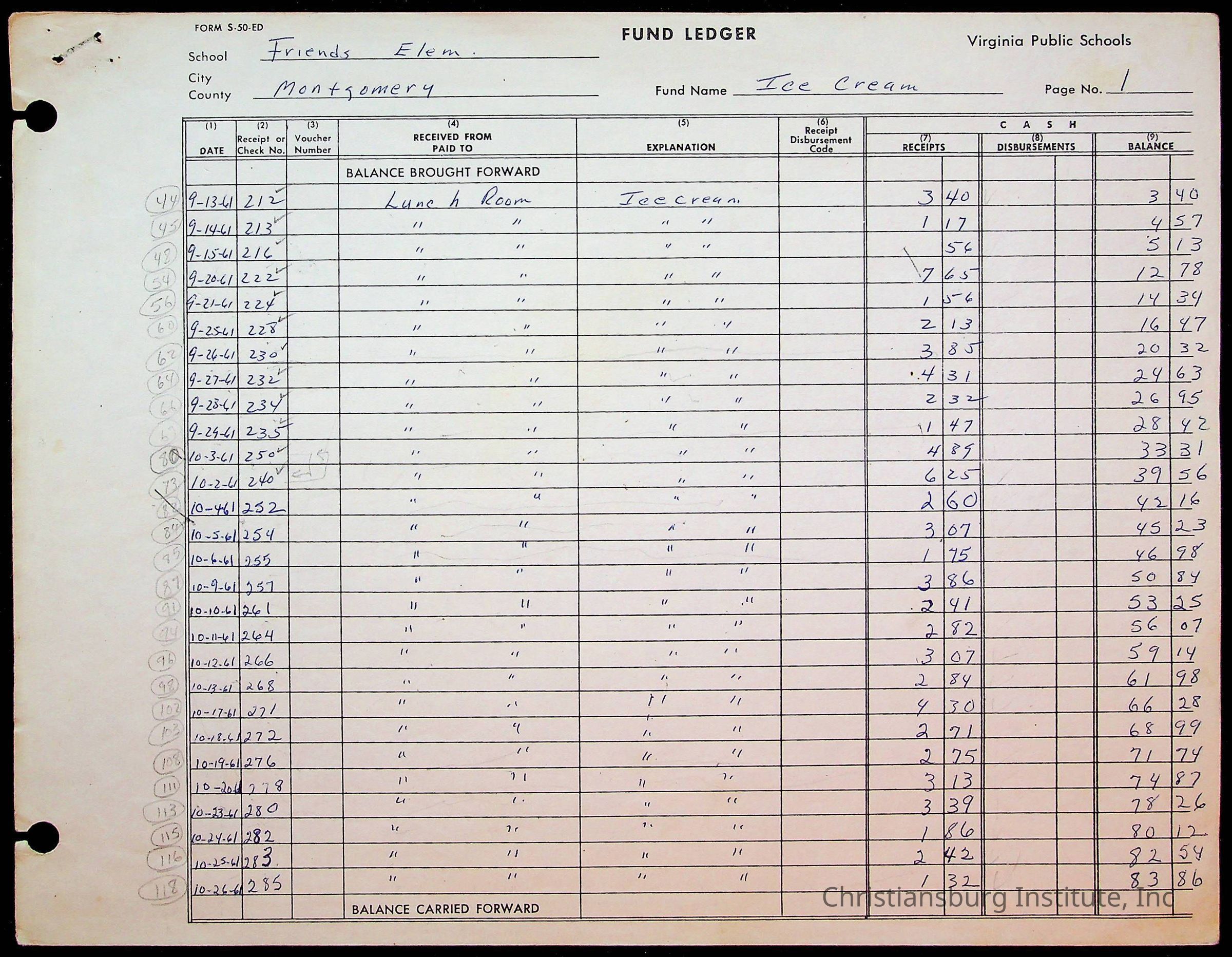 A fund ledger that recorded expenses from the lunch room at Friends Elementary School from 1961-1962.Collection