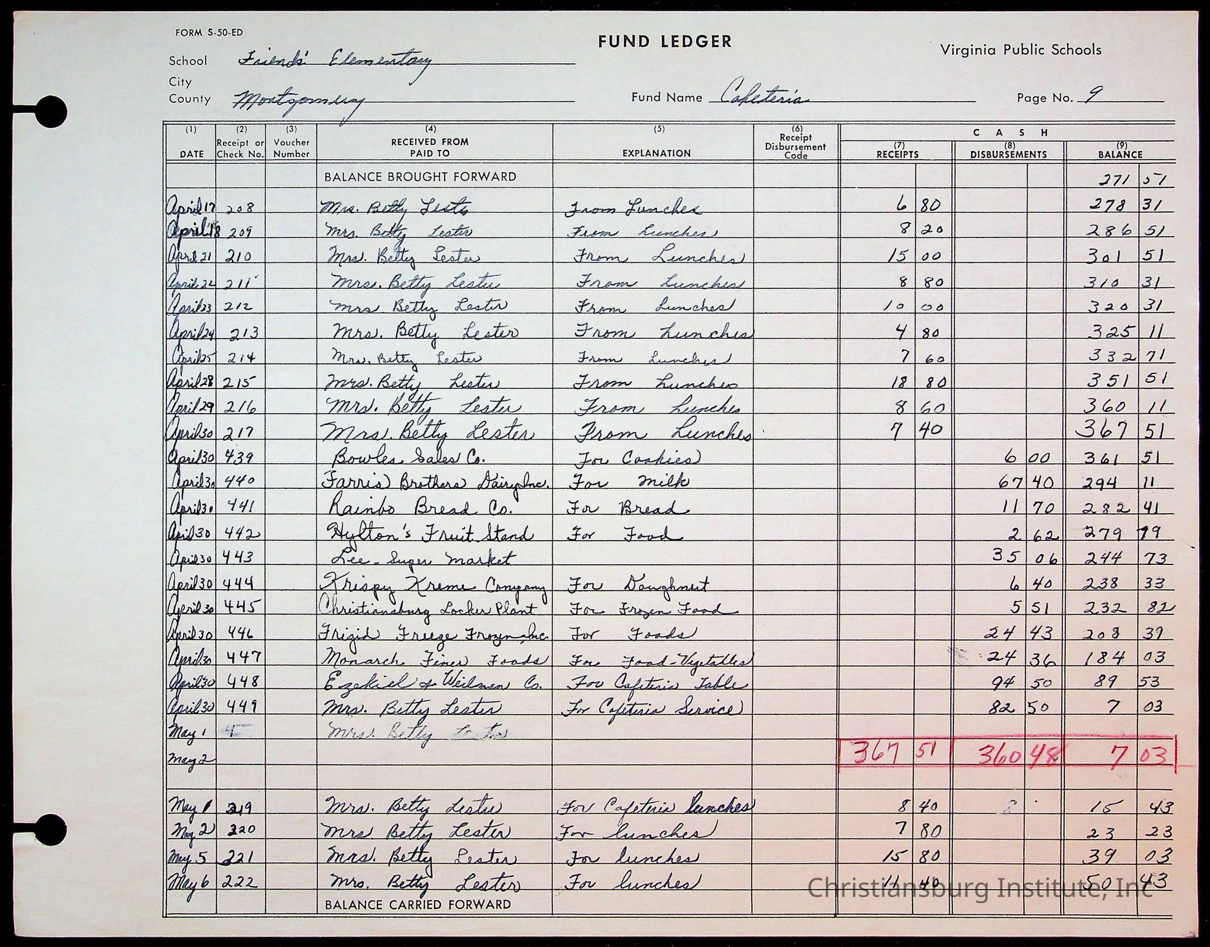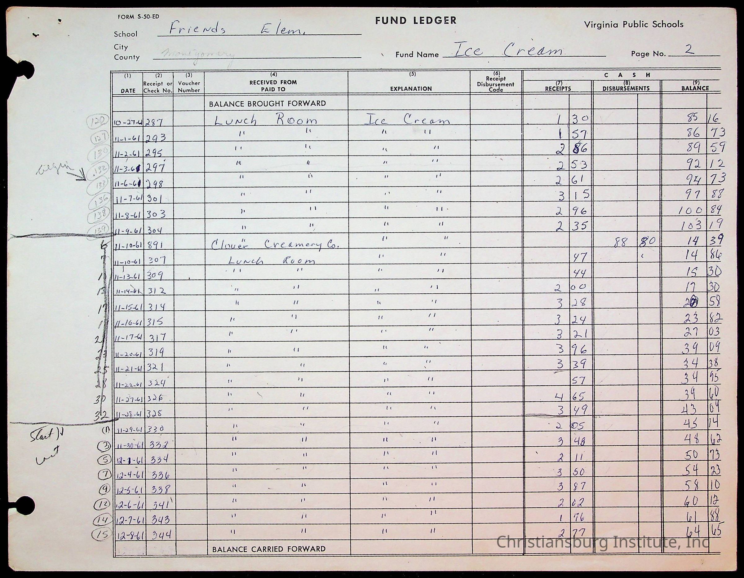 Friends Elementary Fund Ledger (Lunch Room), 1961-1962Tags