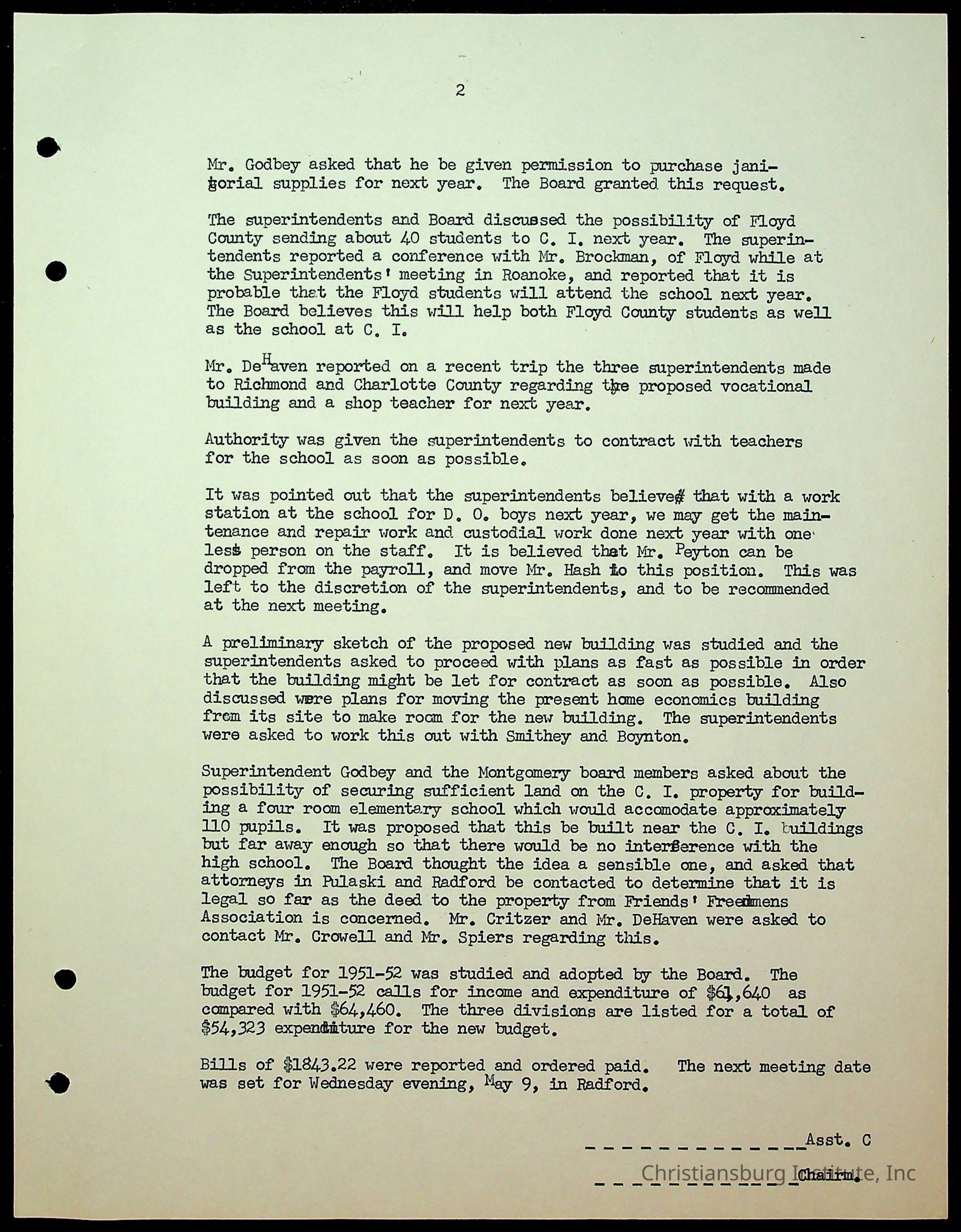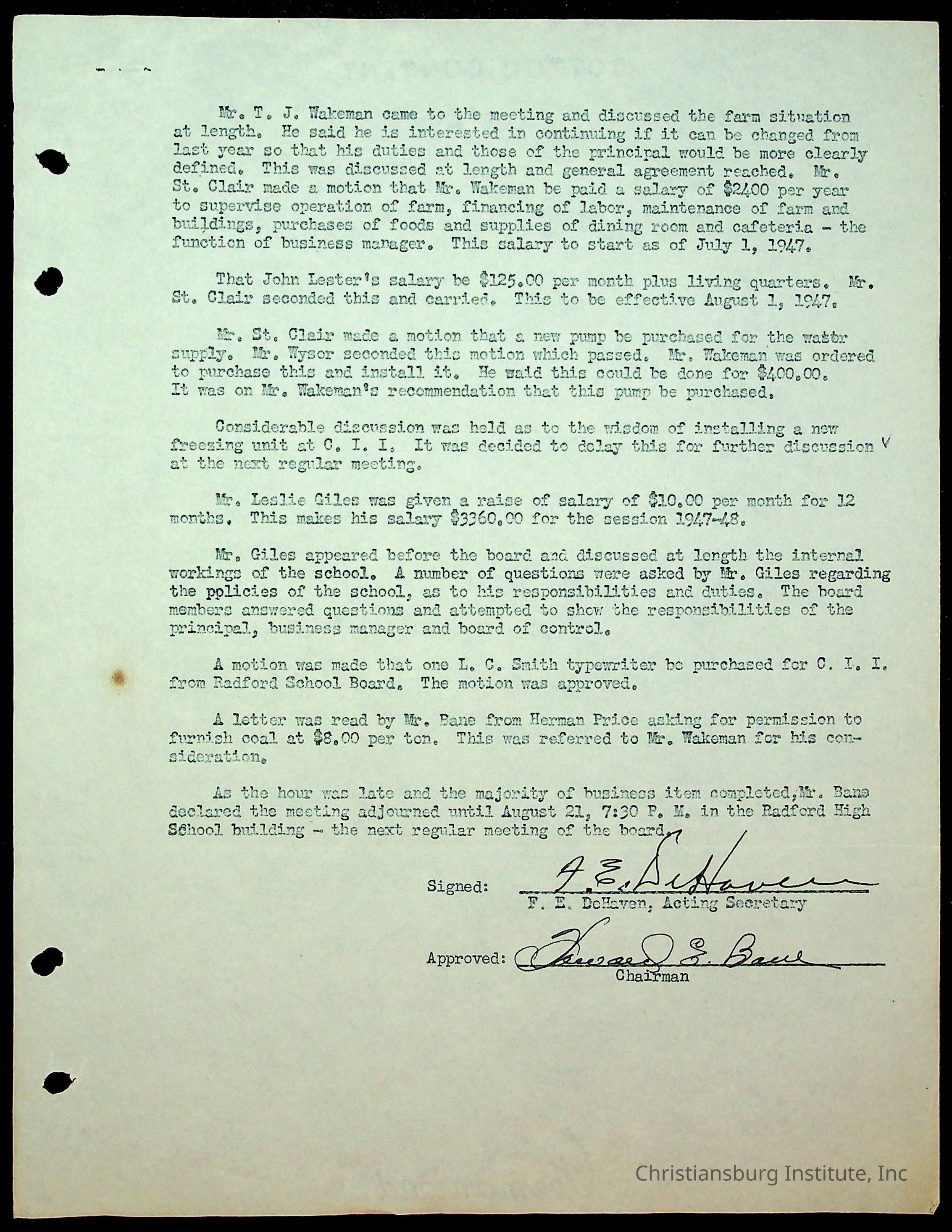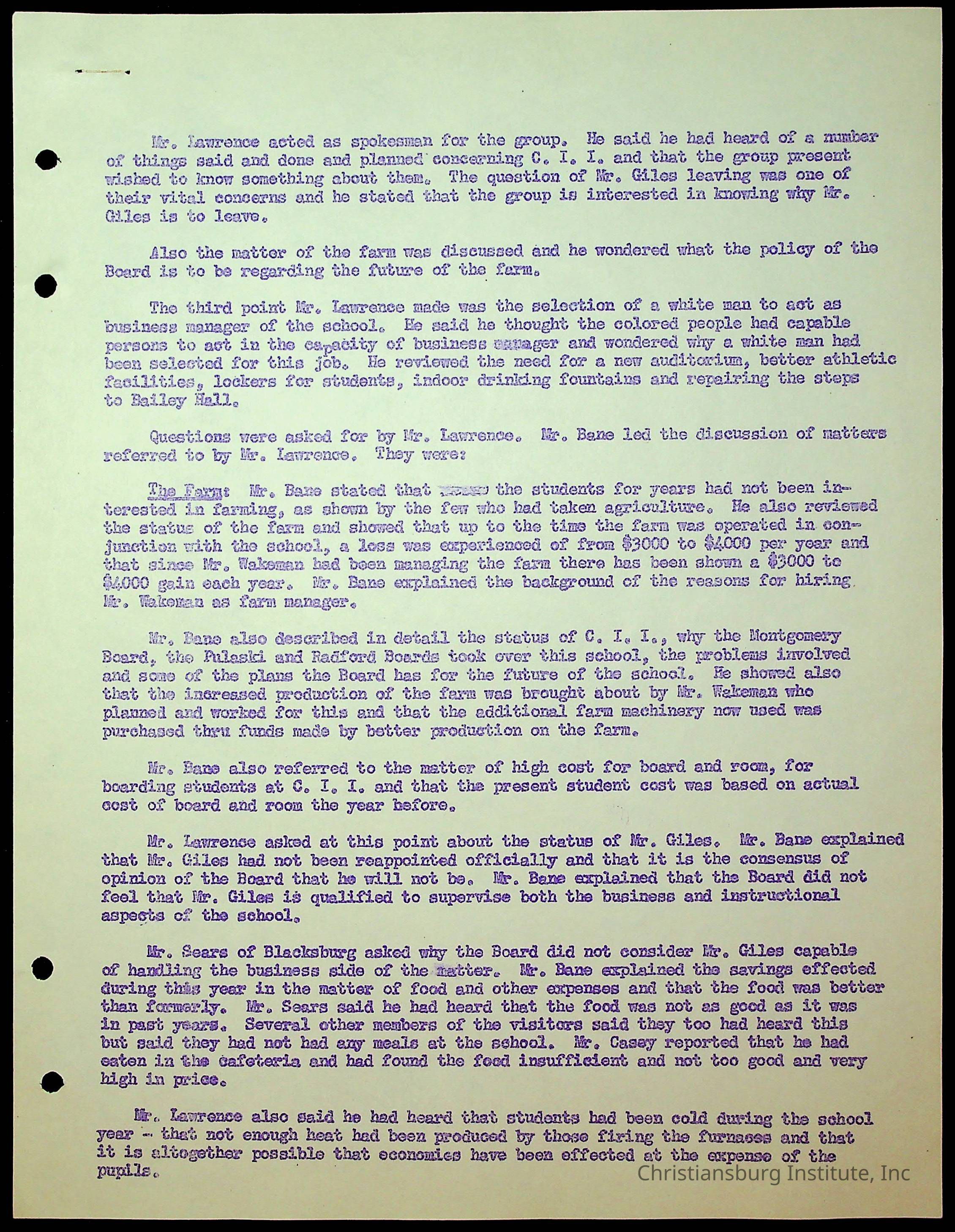 An archive of the Christiansburg Institute board meeting minutes from 1947-1951.