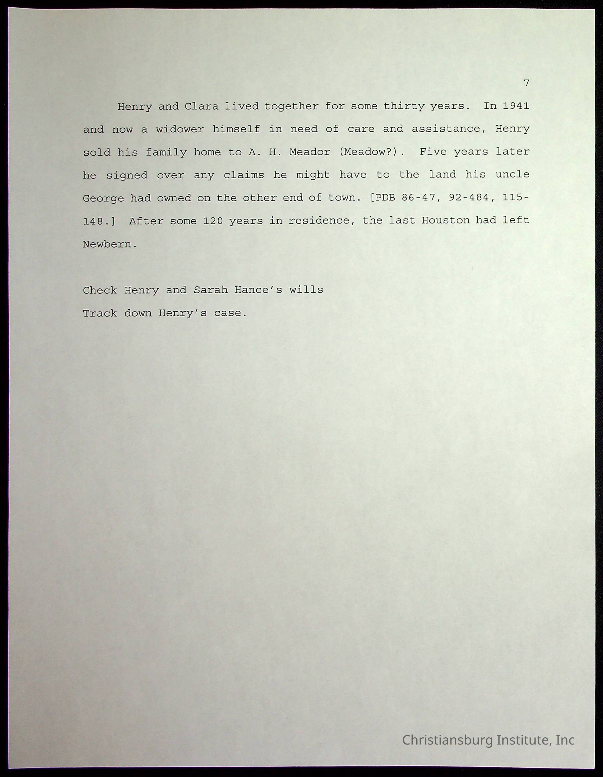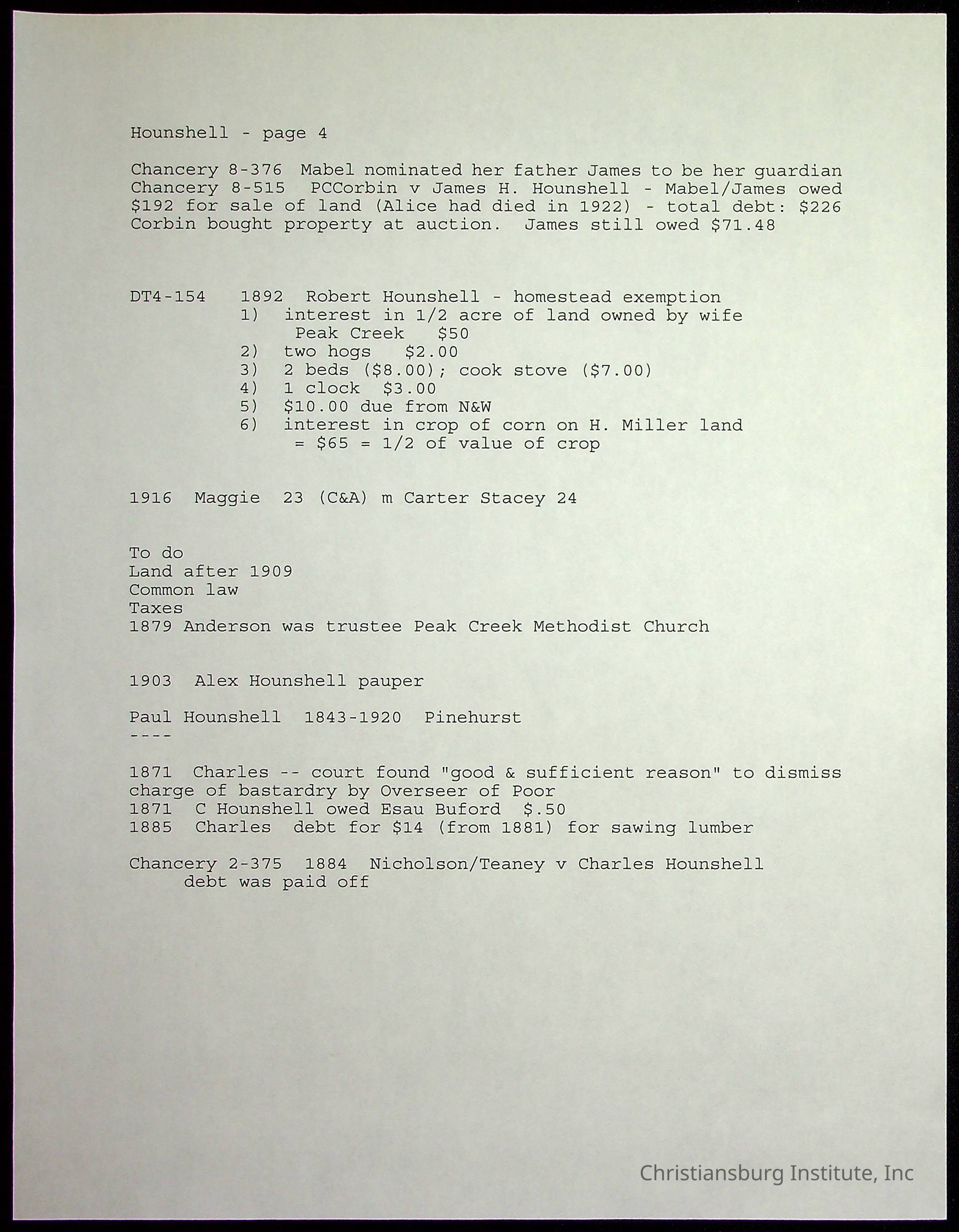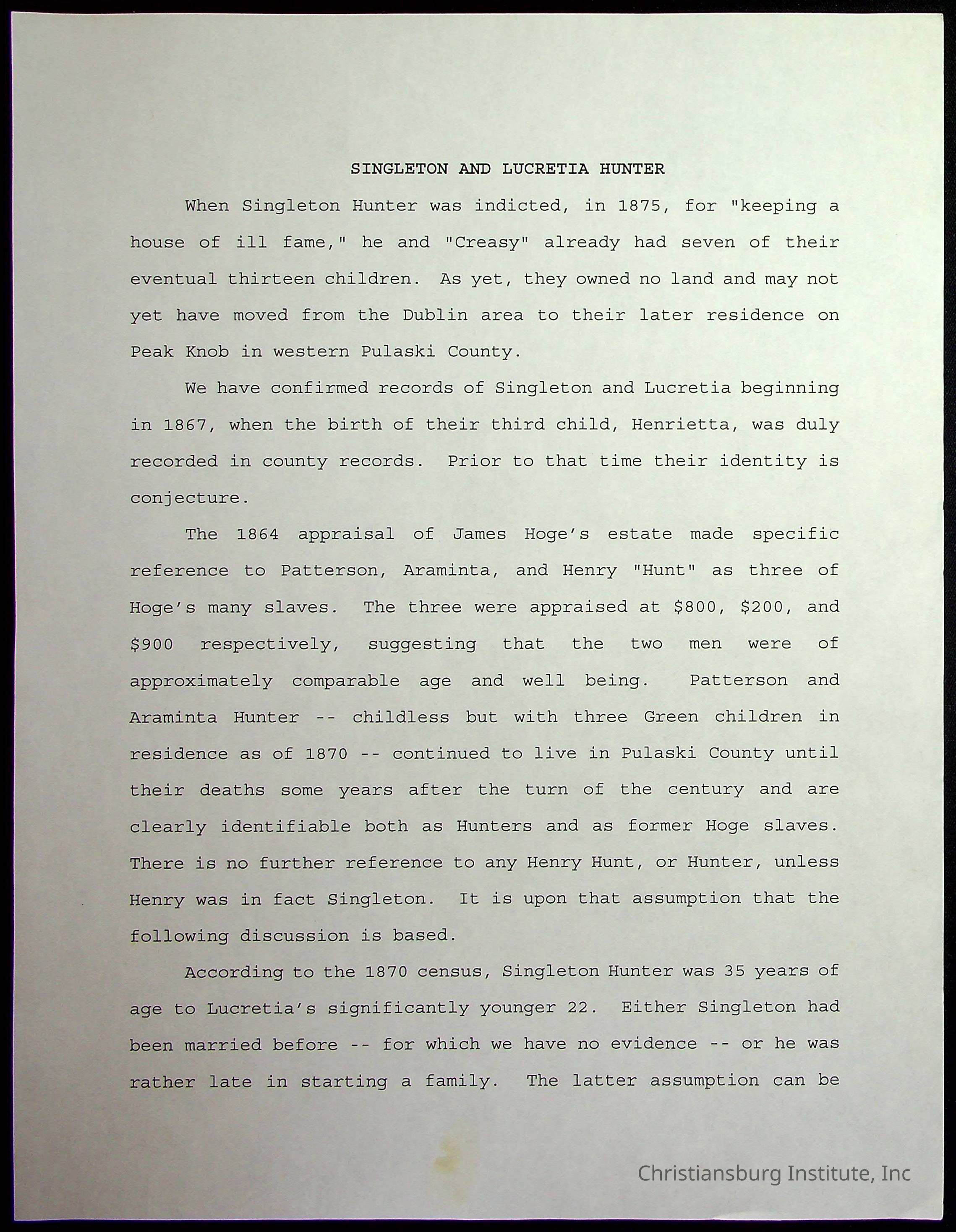 A folder of research materials collected by Radford University professor, Dr Linda Killen. This folder is titled 'H' and includes Killen's research on the H families names of Pulaski County, Virginia. This folder includes genealogy records and census records.