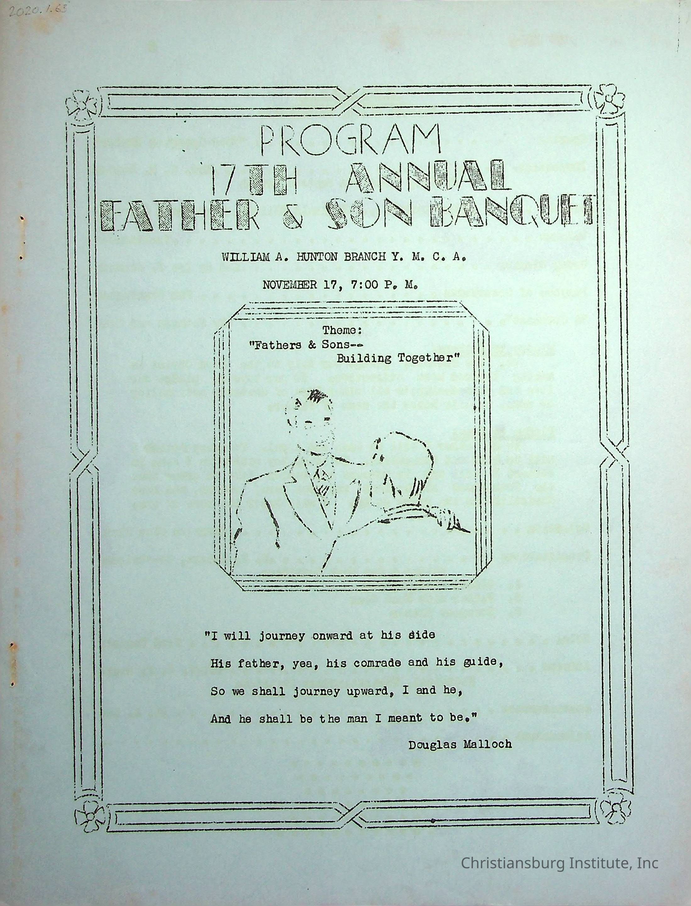 An event program for the 17th annual father and son banquet at the William A. Hunton YMCA Branch on November 17th. Christiansburg Institute principal, John F. Banks spoke an address at this event.Creator