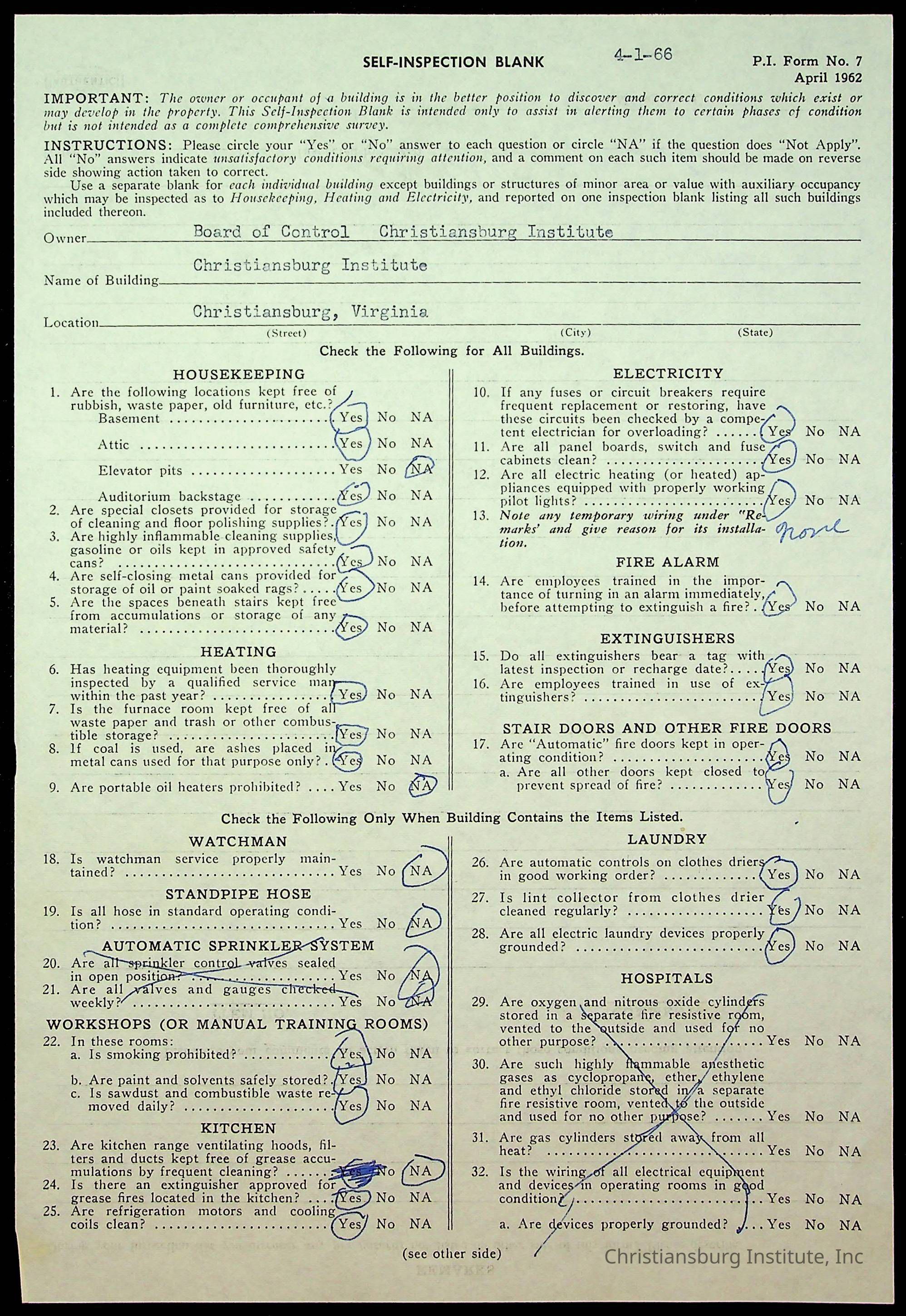 An archive of several fire self-inspection forms filled out by Christiansburg Institute from 1964 through 1966.