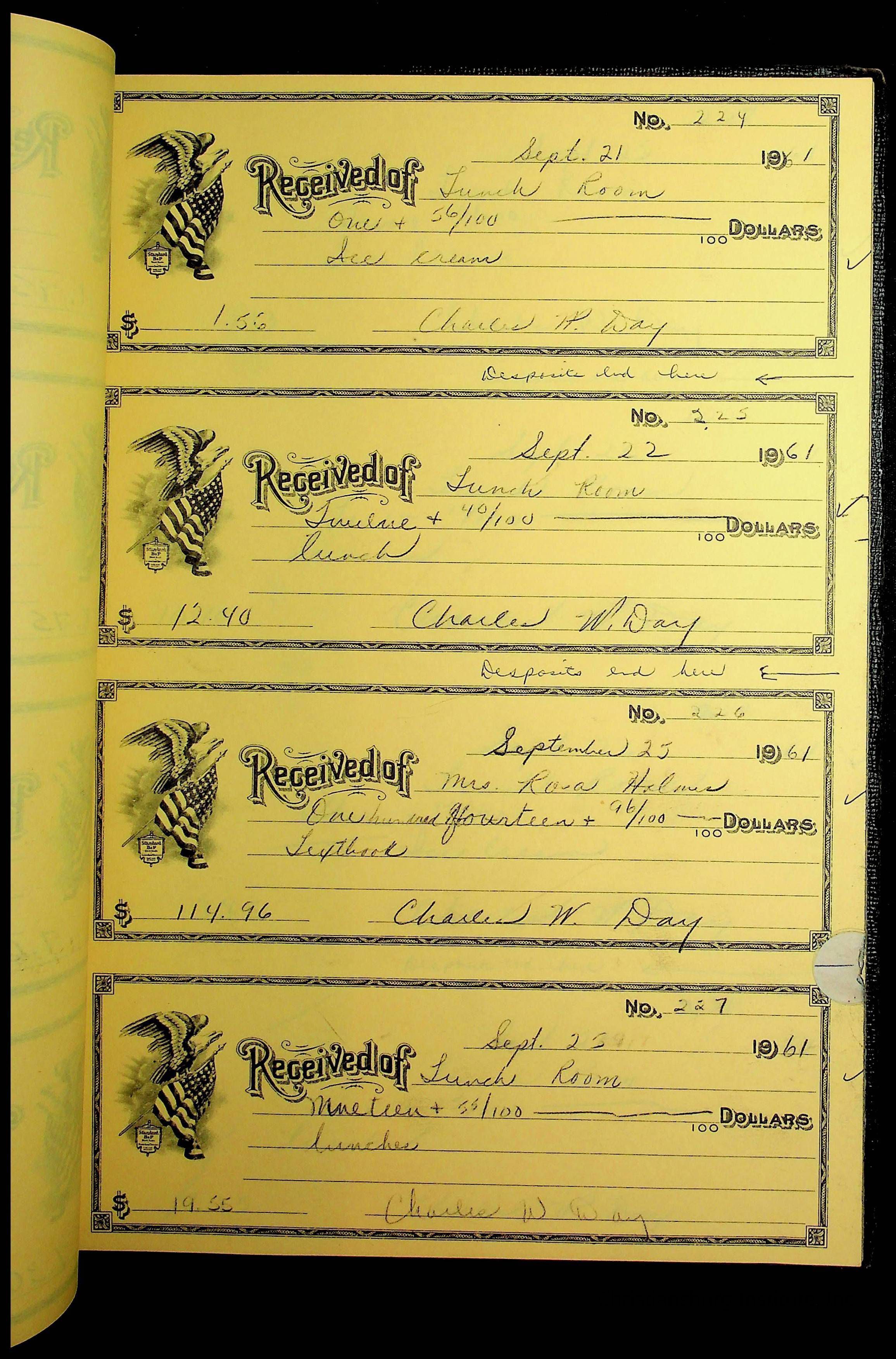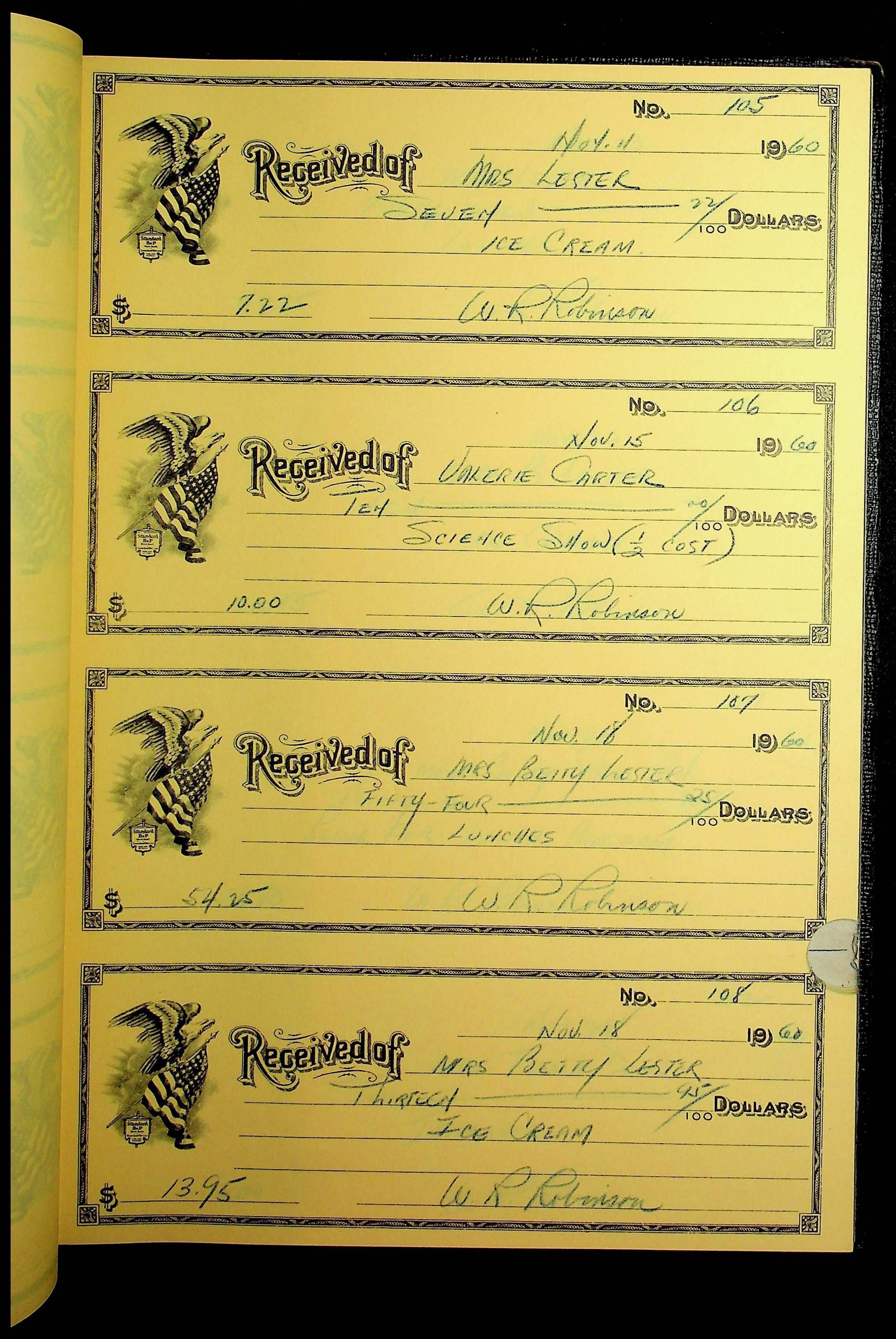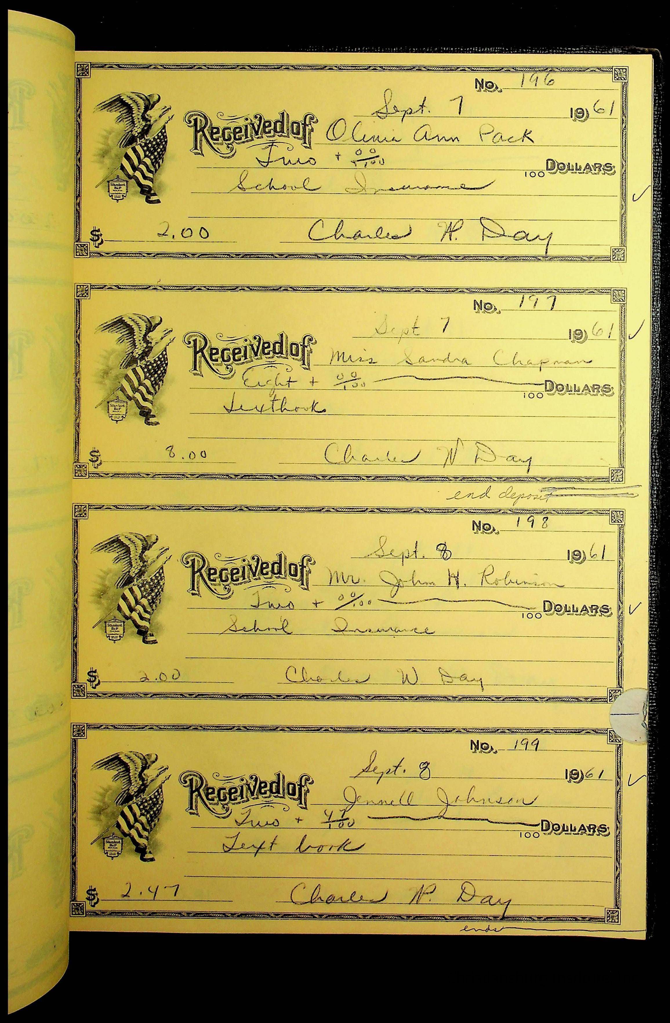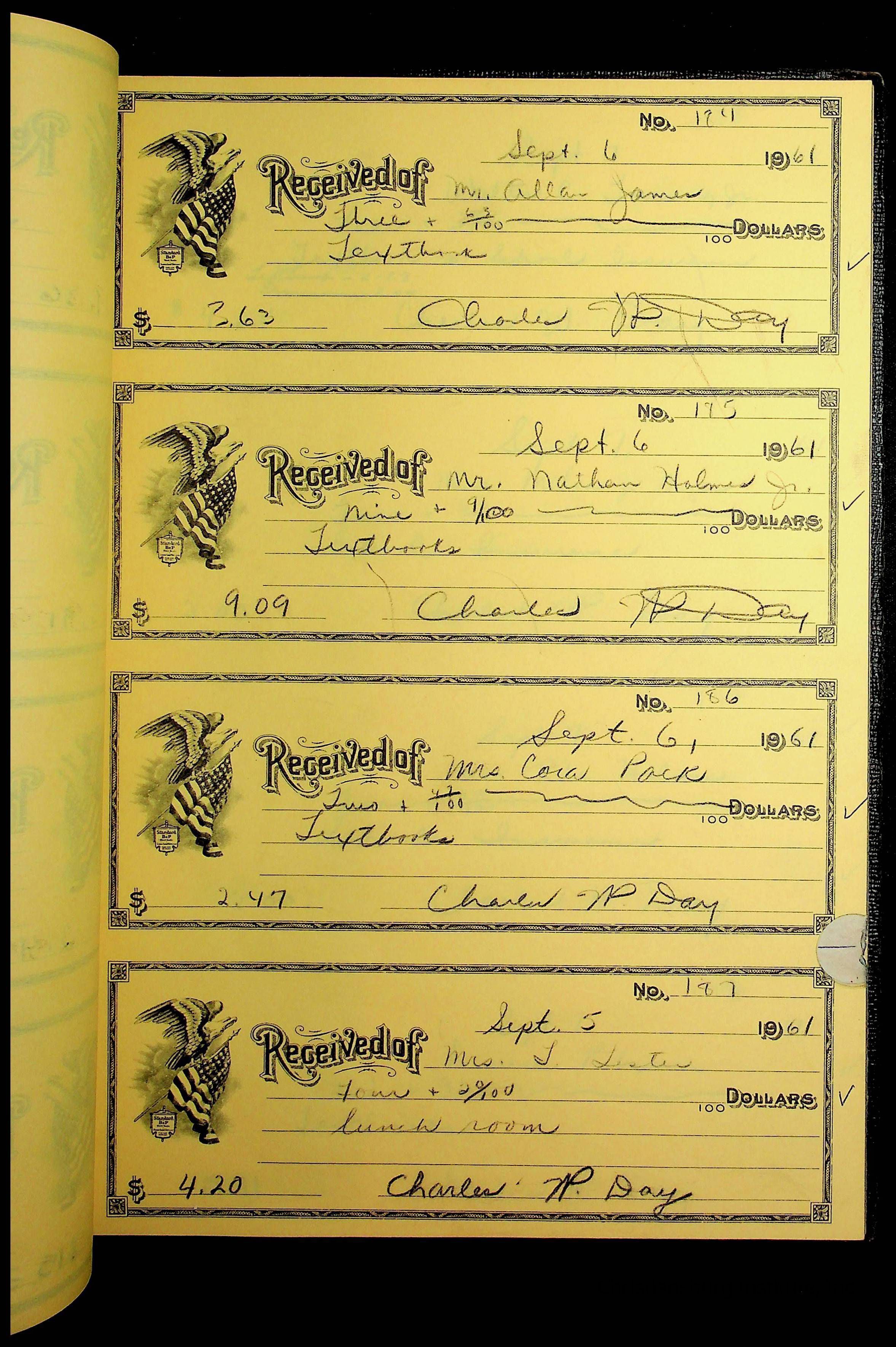 A receipt book manufactured by Boorum & Pease and used by Friends Elementary School to document expenses and receipts from 1959 through 1961.