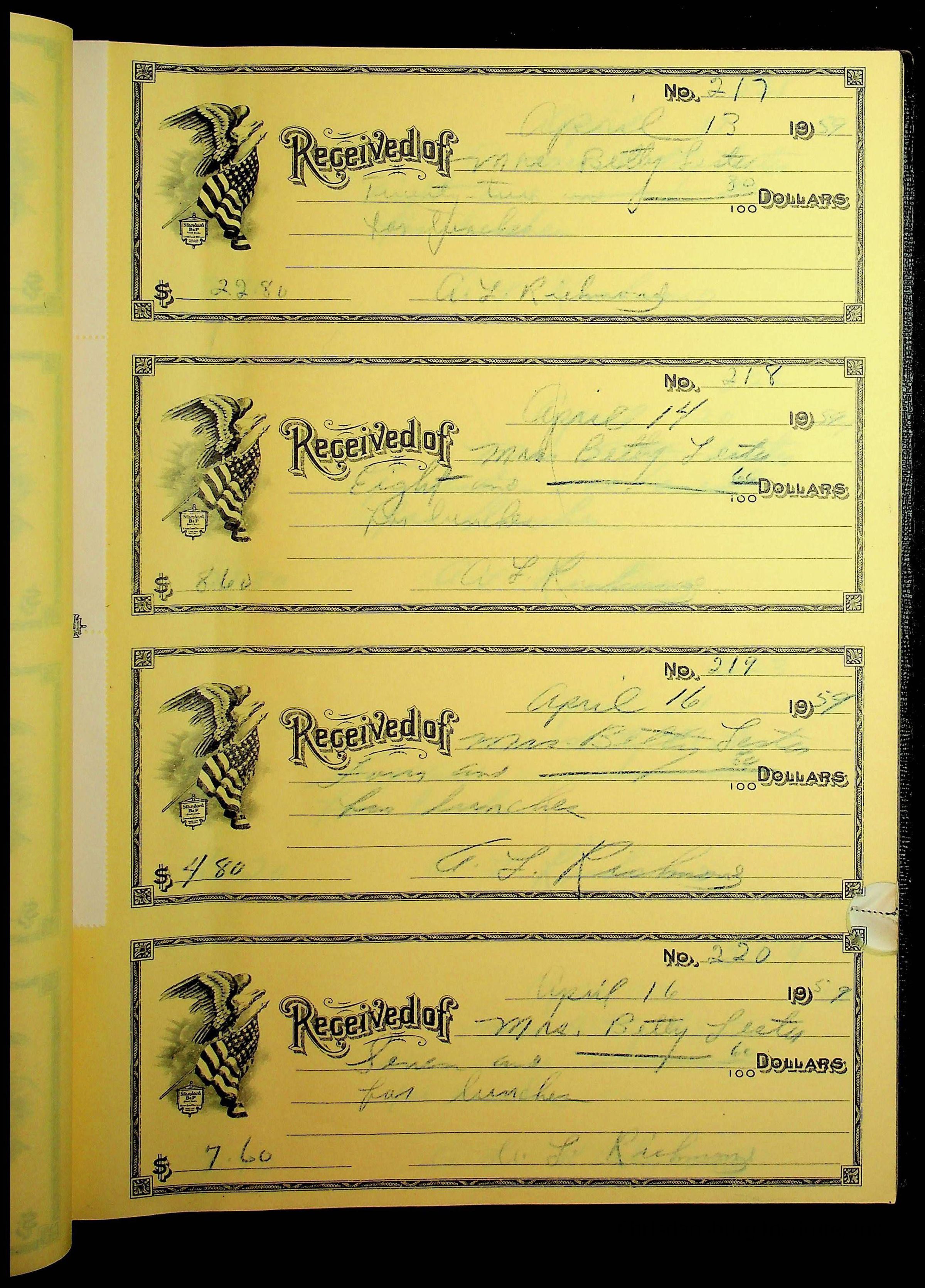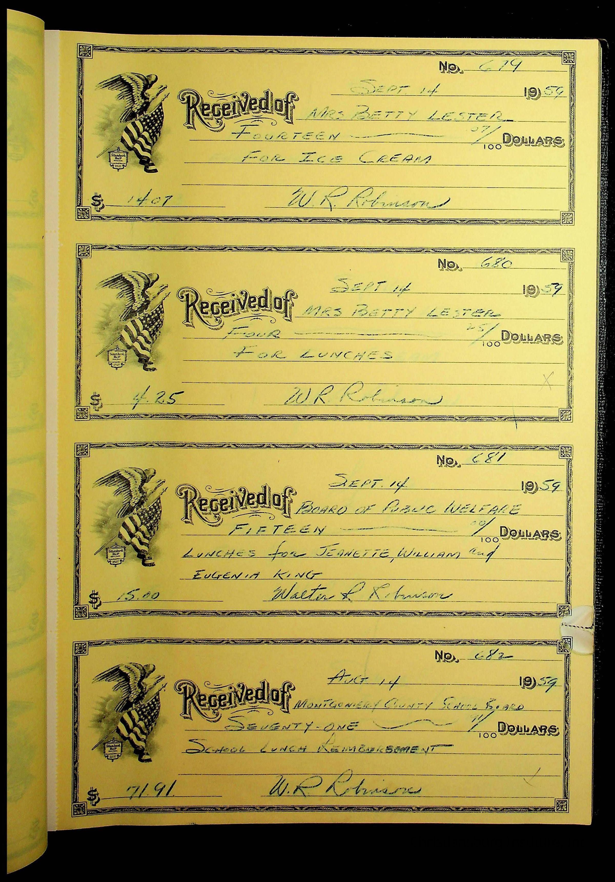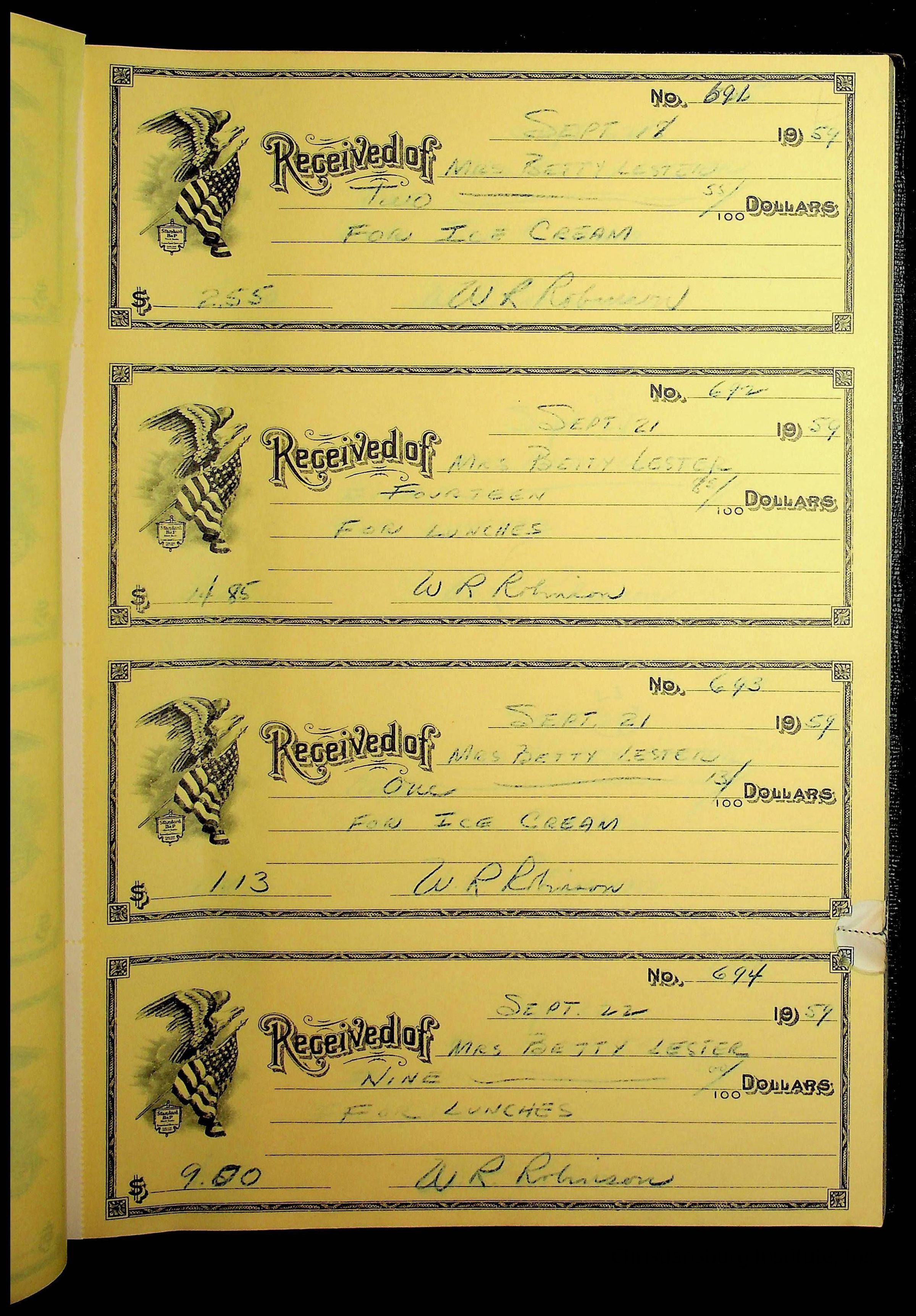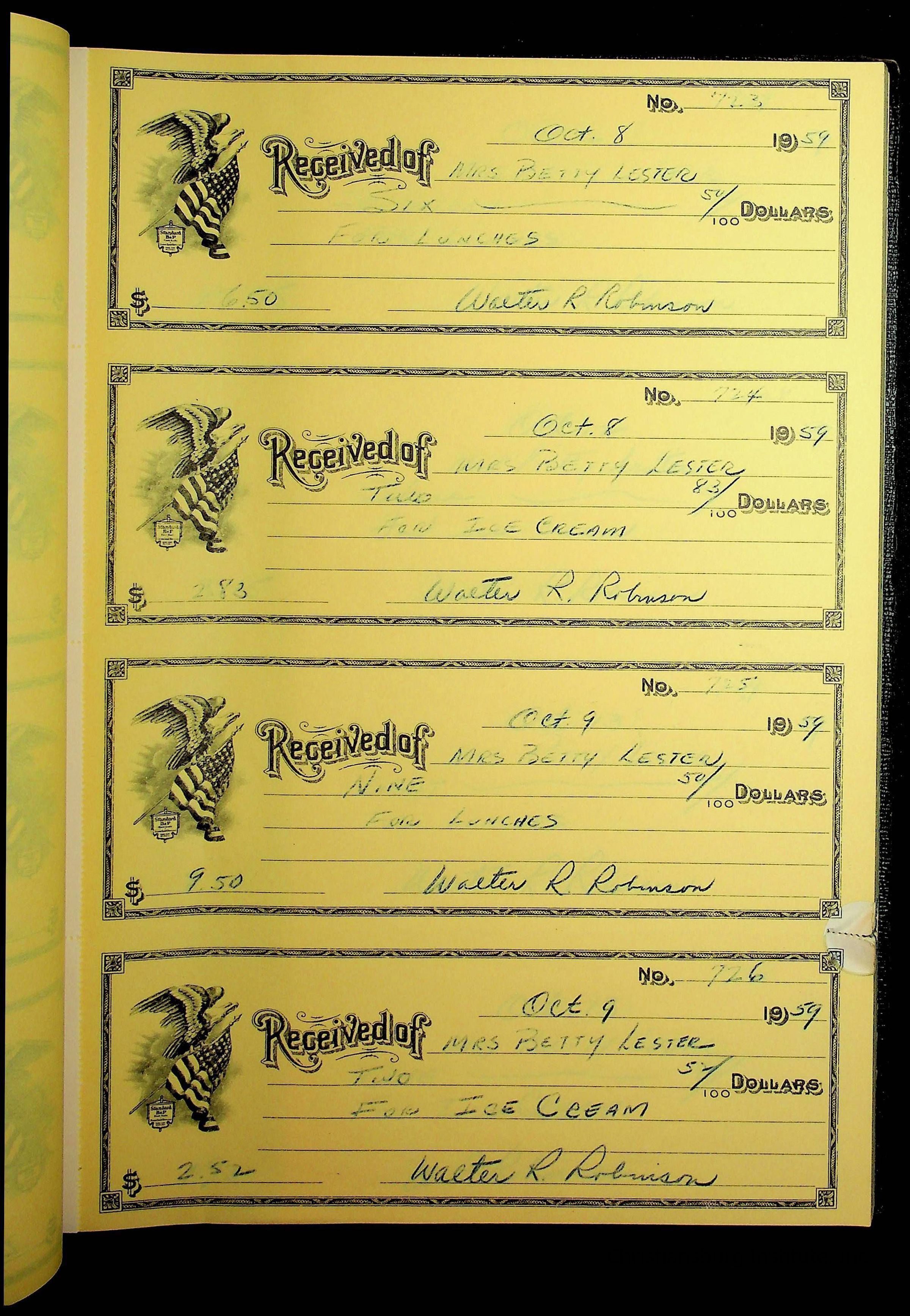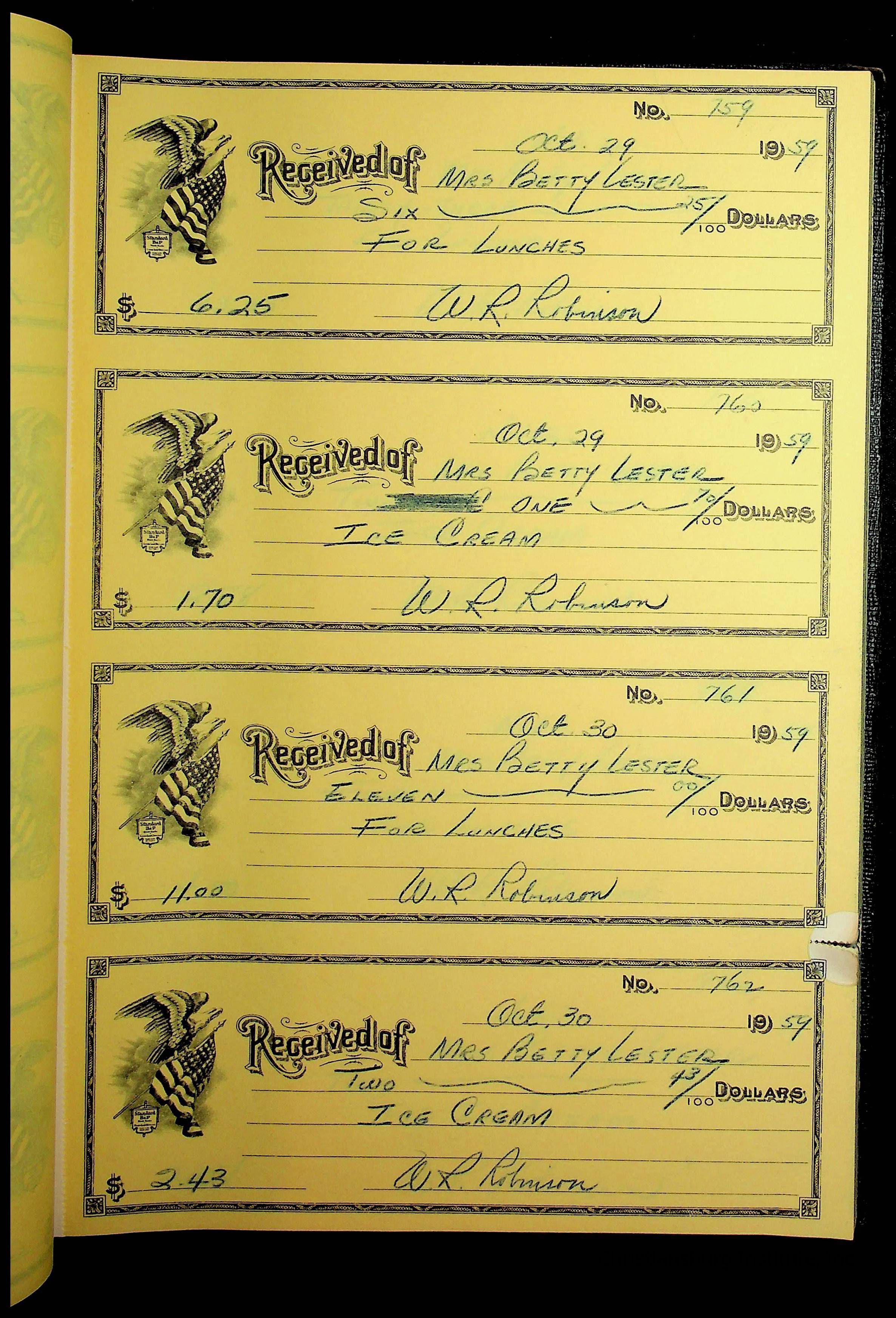 A receipt book manufactured by Boorum & Pease and used by Friends Elementary School to document expenses and receipts from 1959 through 1961.