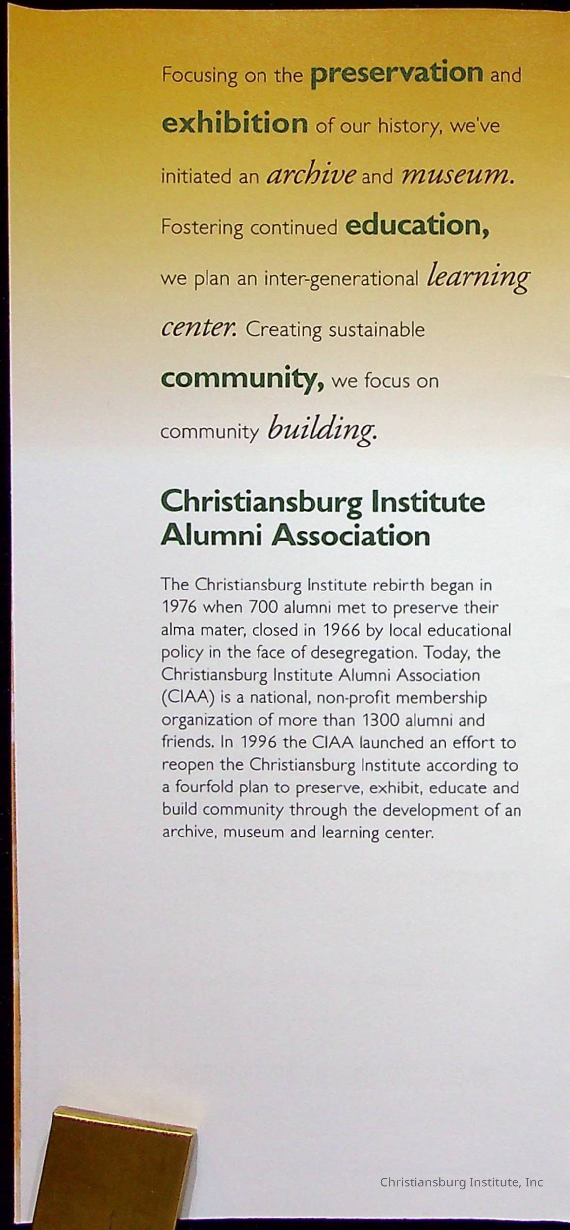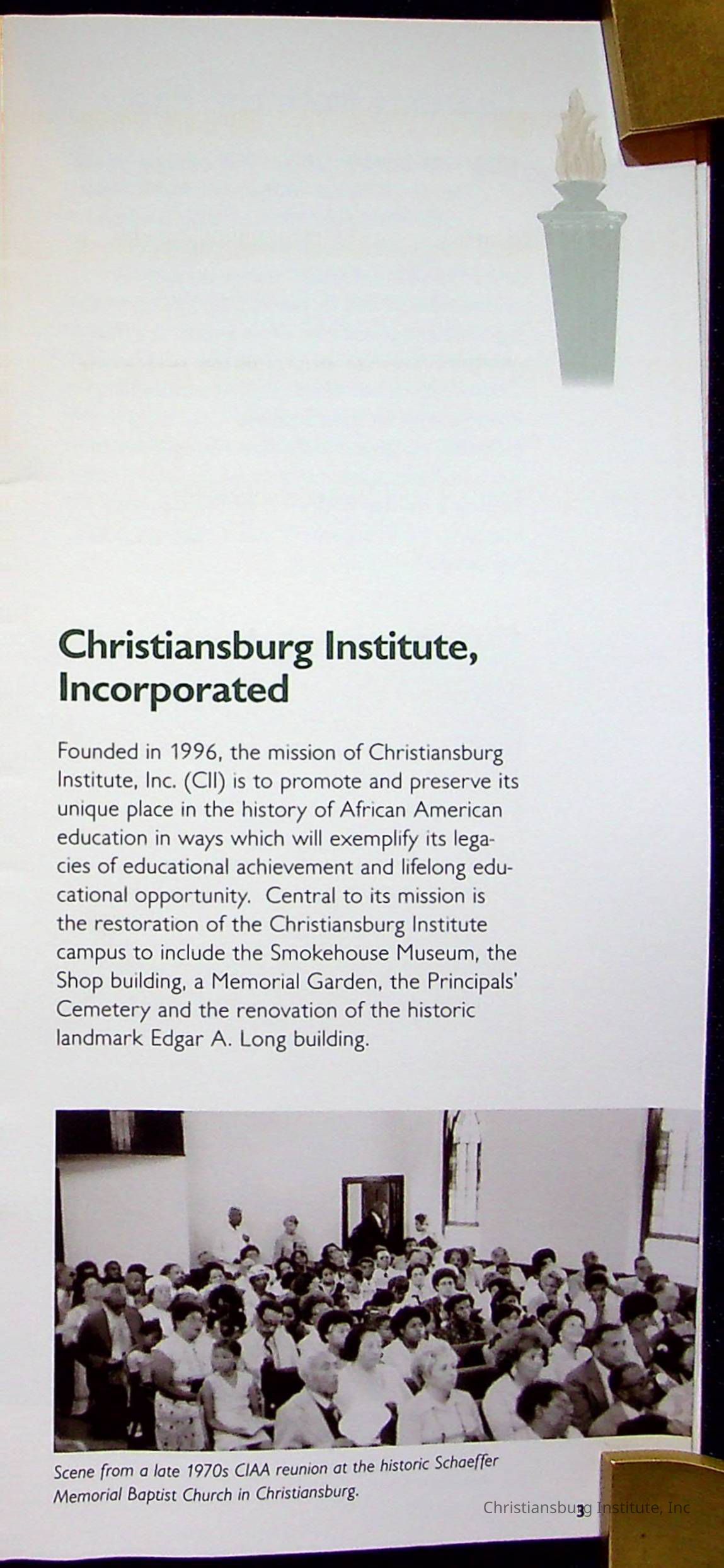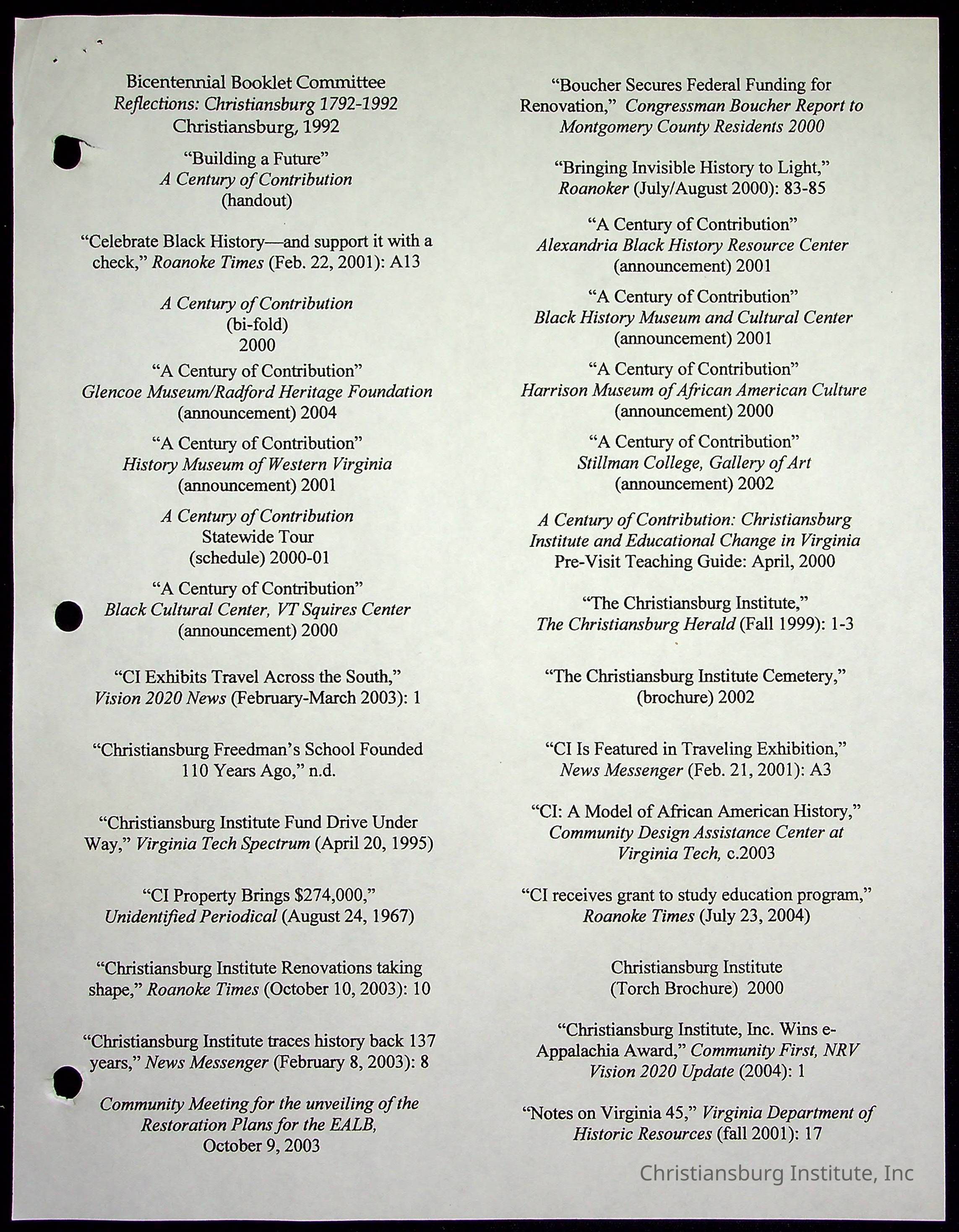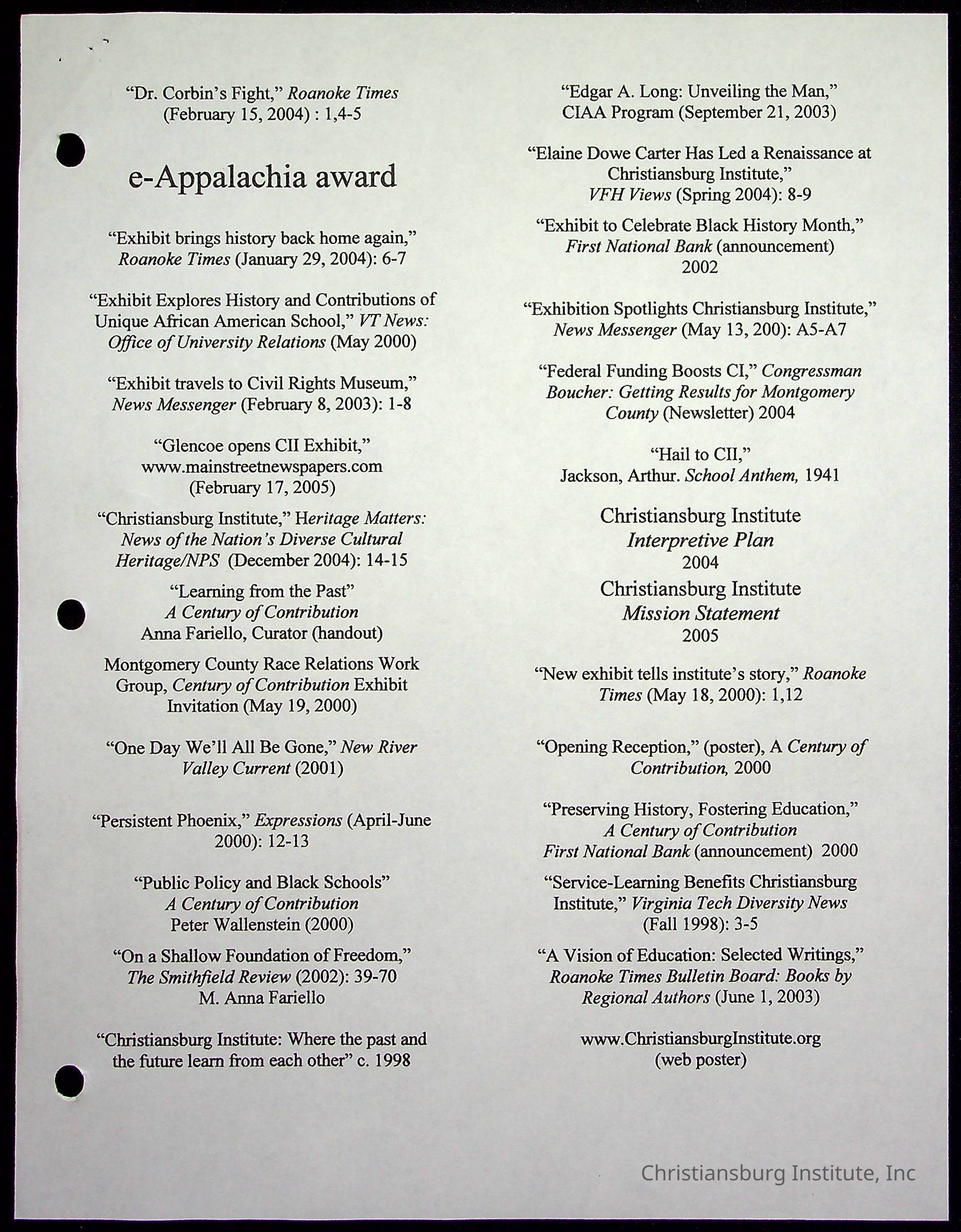 A collection of press materials and publications that feature Christiansburg Institute Inc, dates range from the year 1992 to 2004.Creator