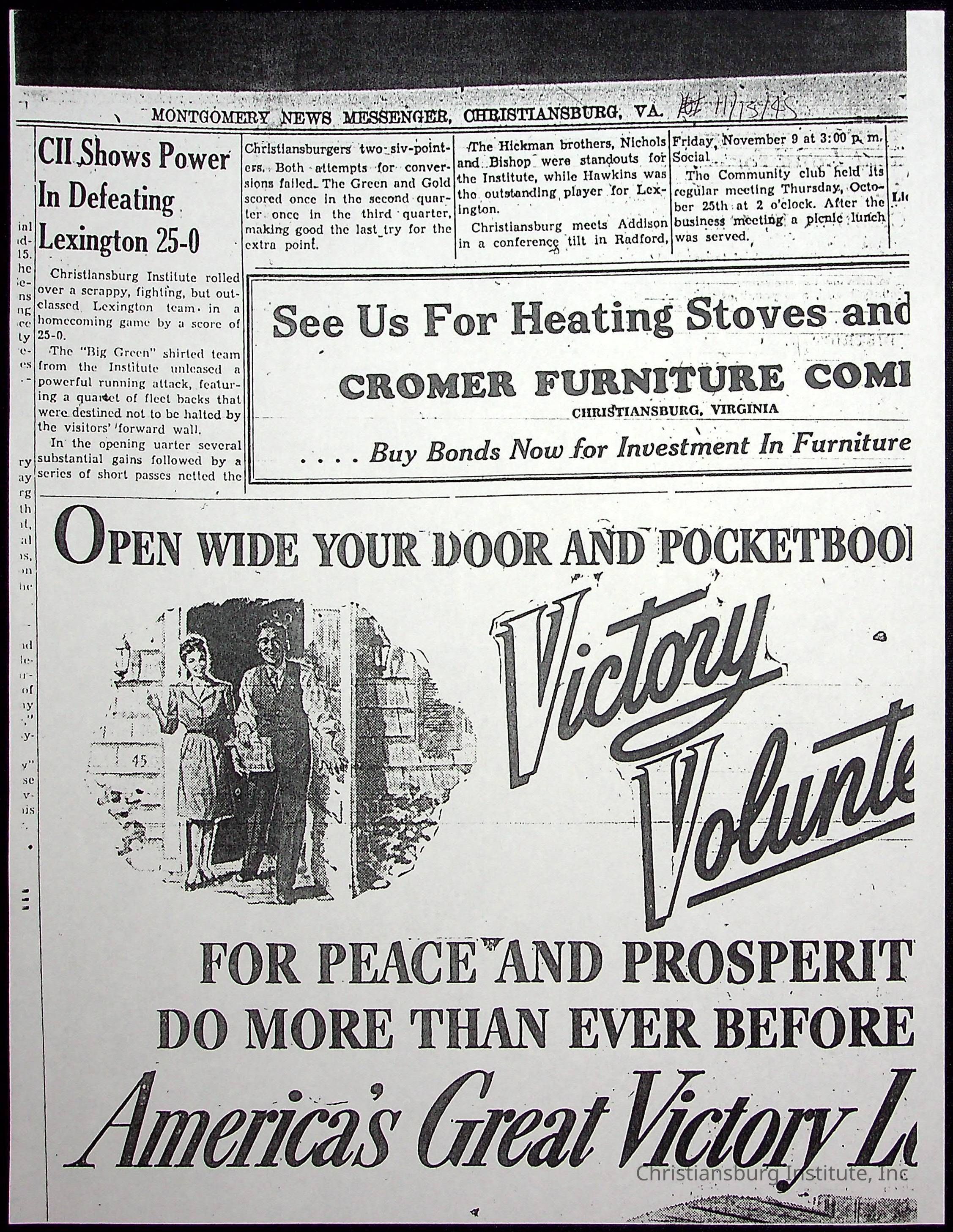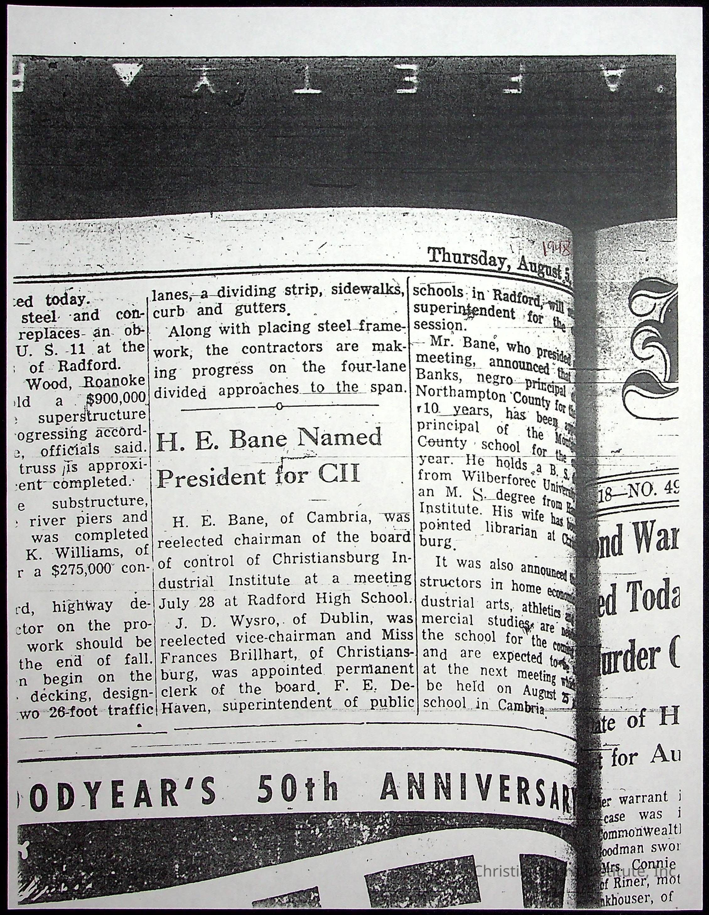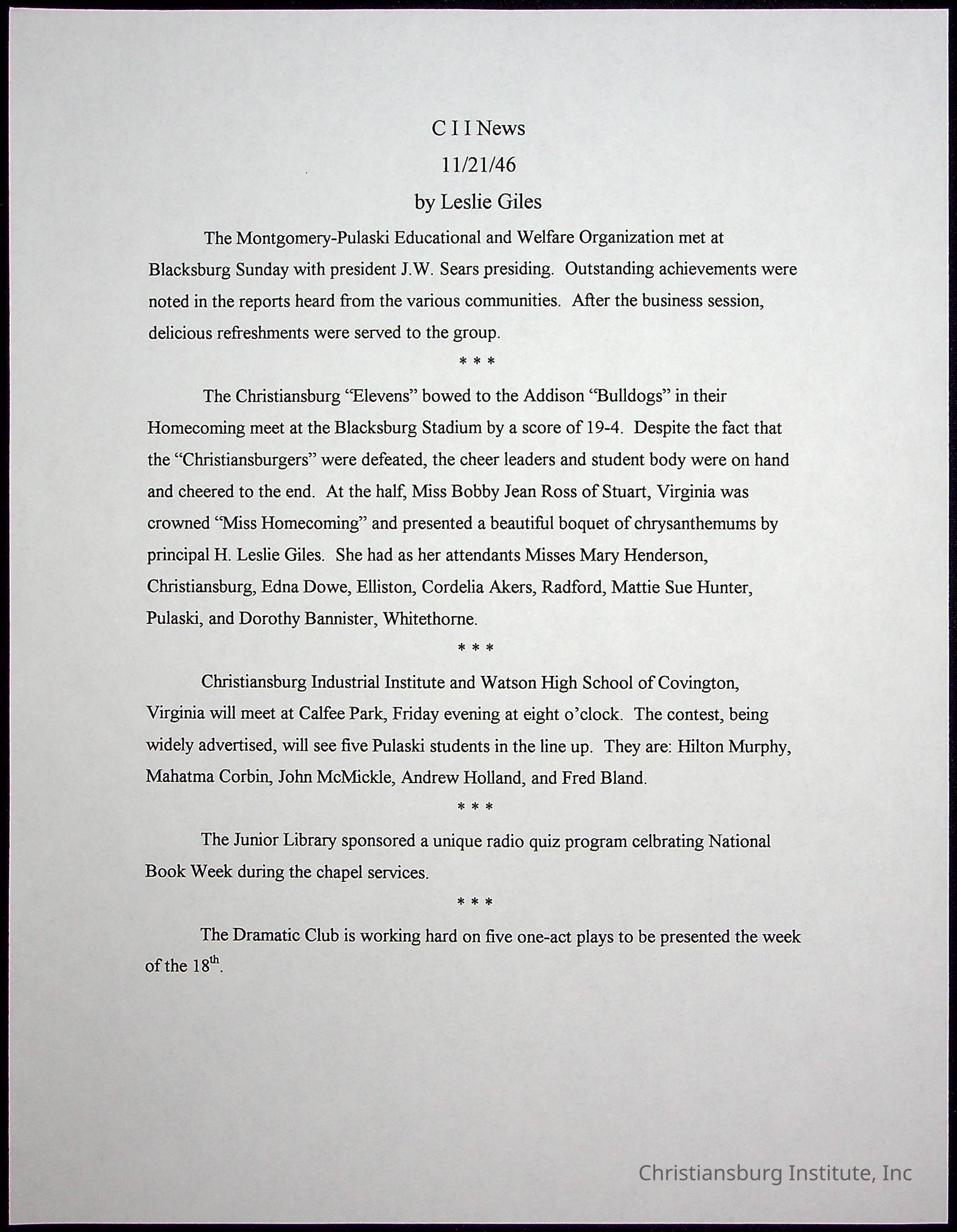 A collection of newspaper articles that feature stories about Christiansburg Institute and other Montgomery County schools dates range from 1941 through 1948. These articles come from various newspapers.Date(s) of Creation