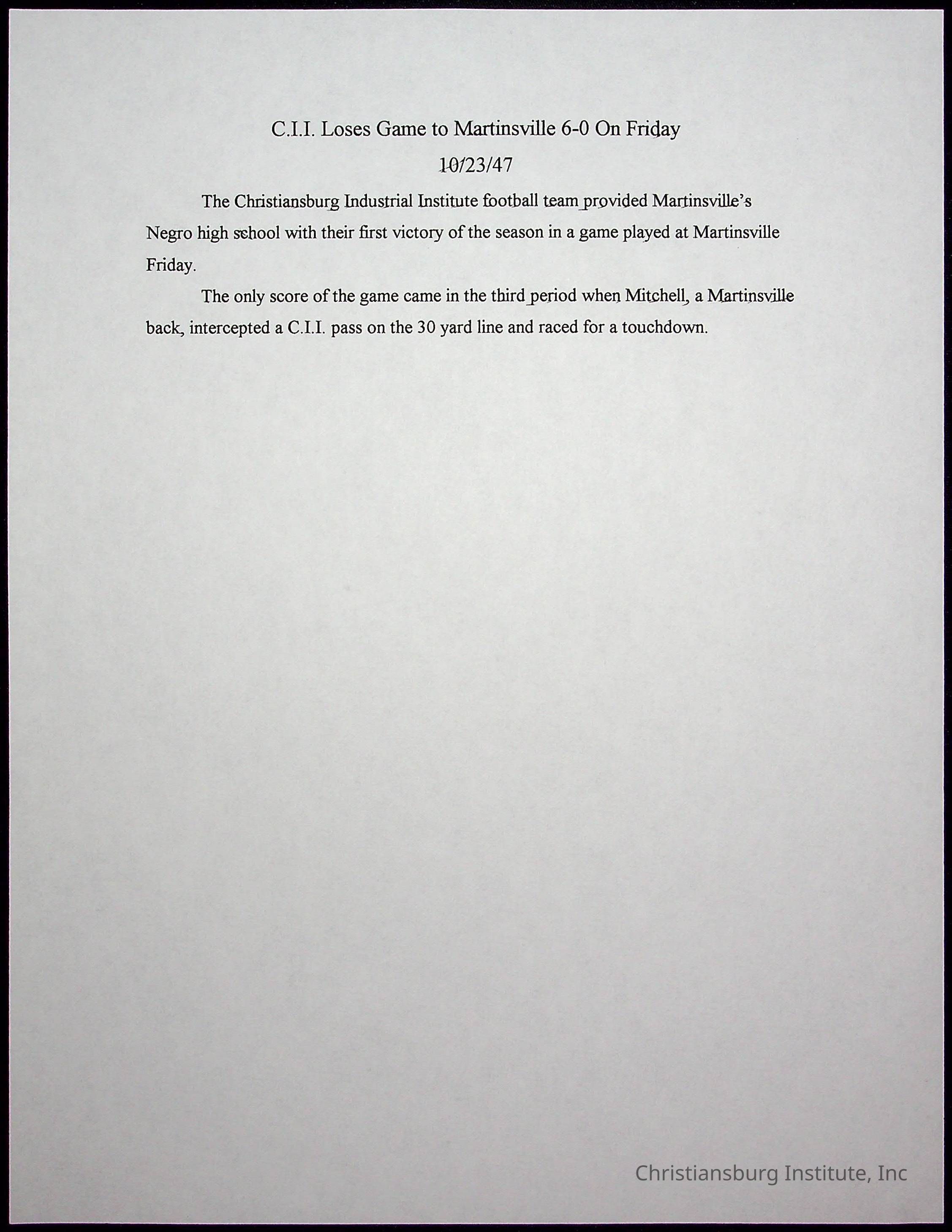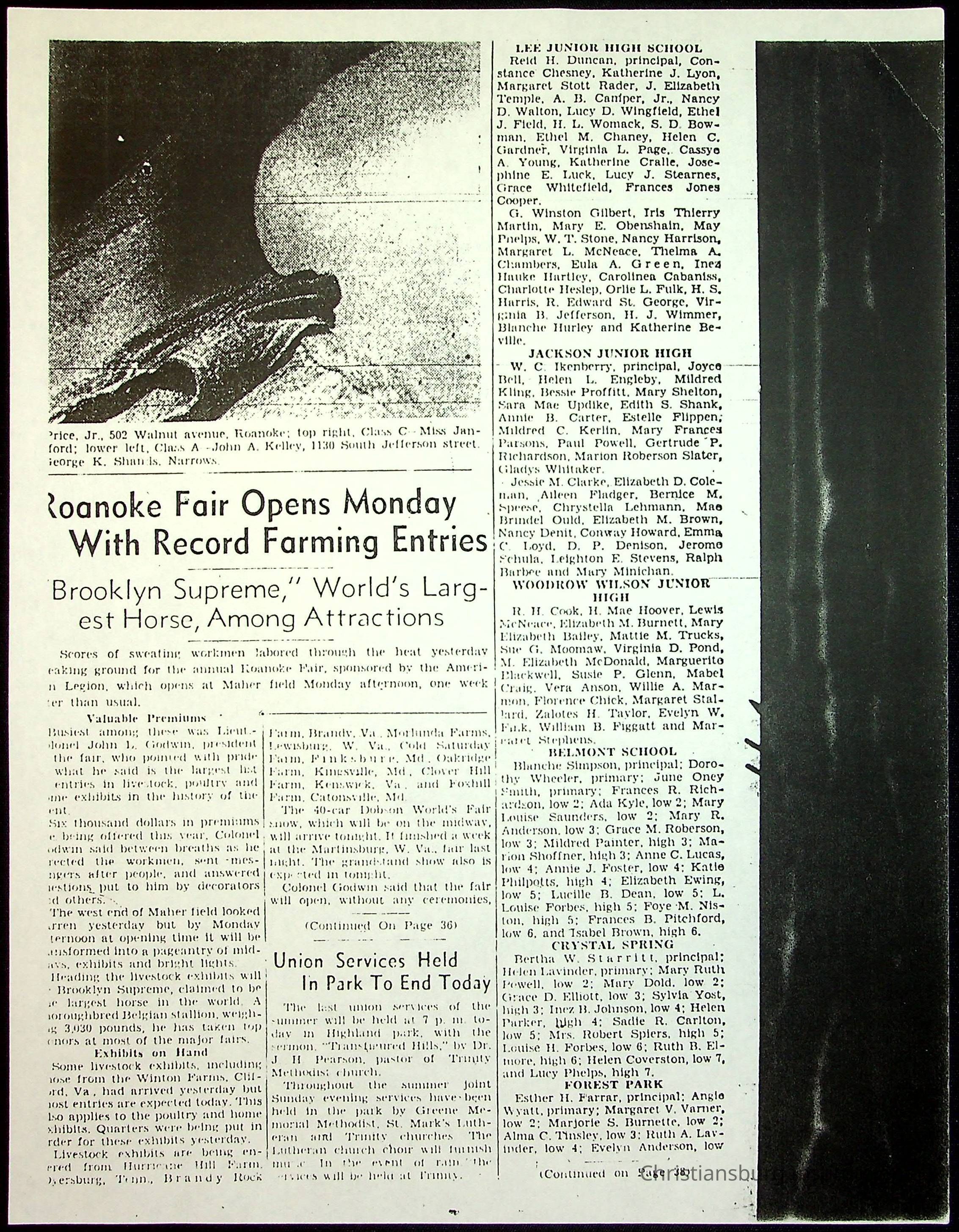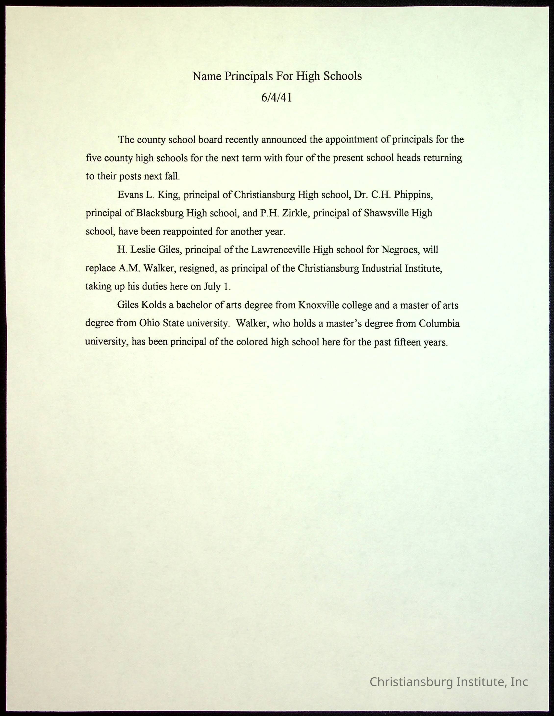 A collection of newspaper articles that feature stories about Christiansburg Institute and other Montgomery County schools dates range from 1941 through 1948. These articles come from various newspapers.Date(s) of Creation