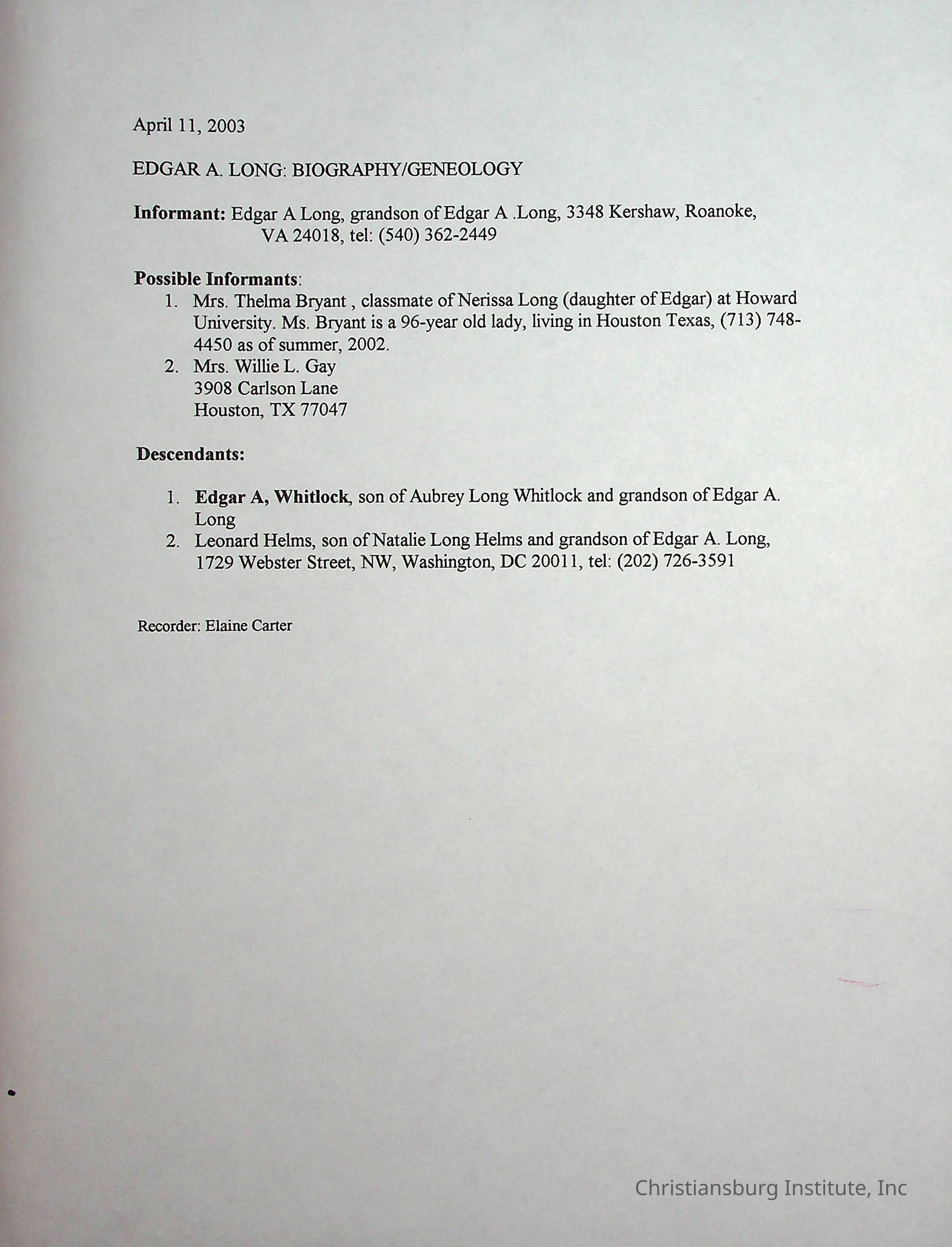 The Christiansburg Industrial Institute faculty file for Edgar A. Long, dated April 11th, 2003. This file contains genealogical information and was recorded by Elaine Dow Carter.Creator