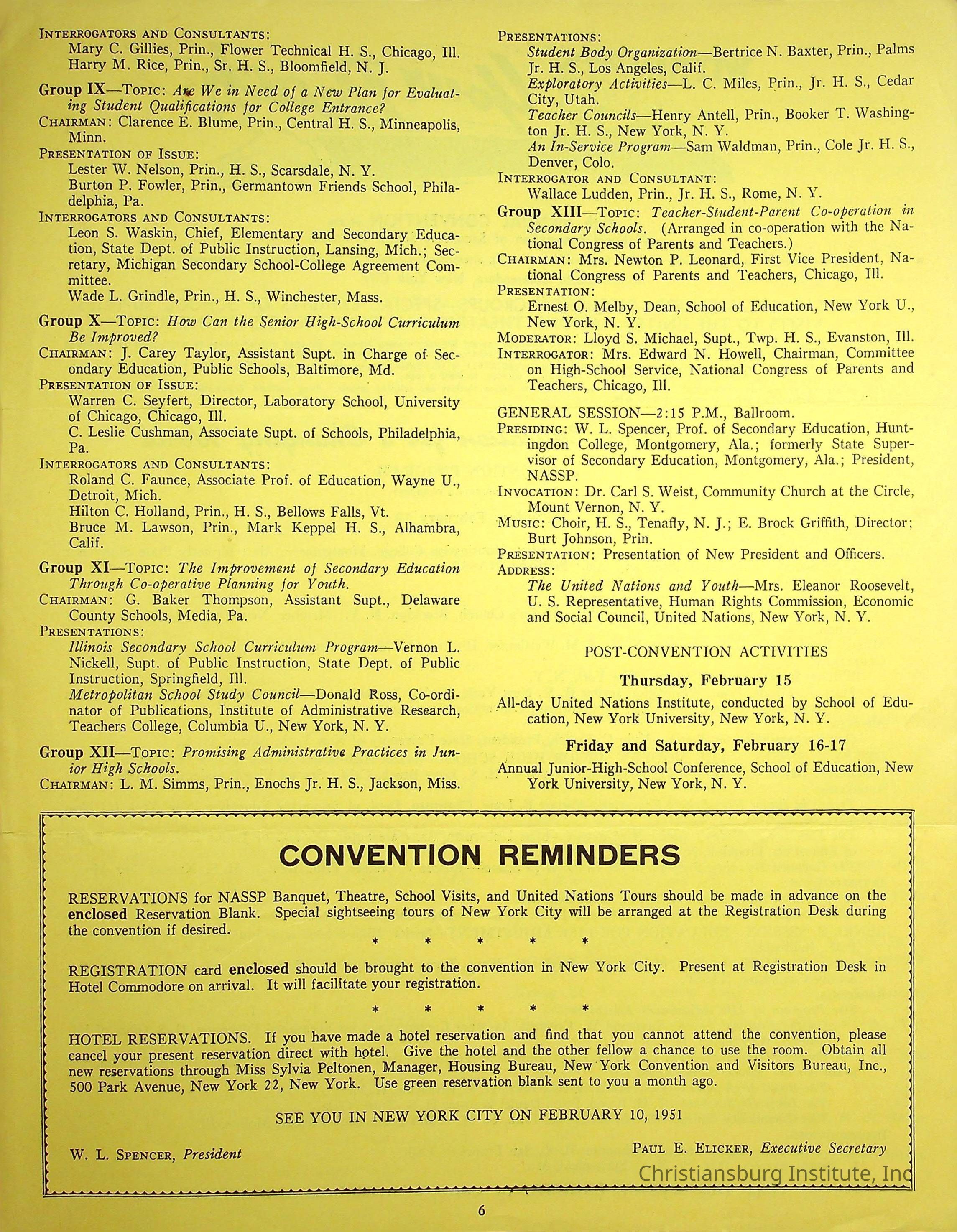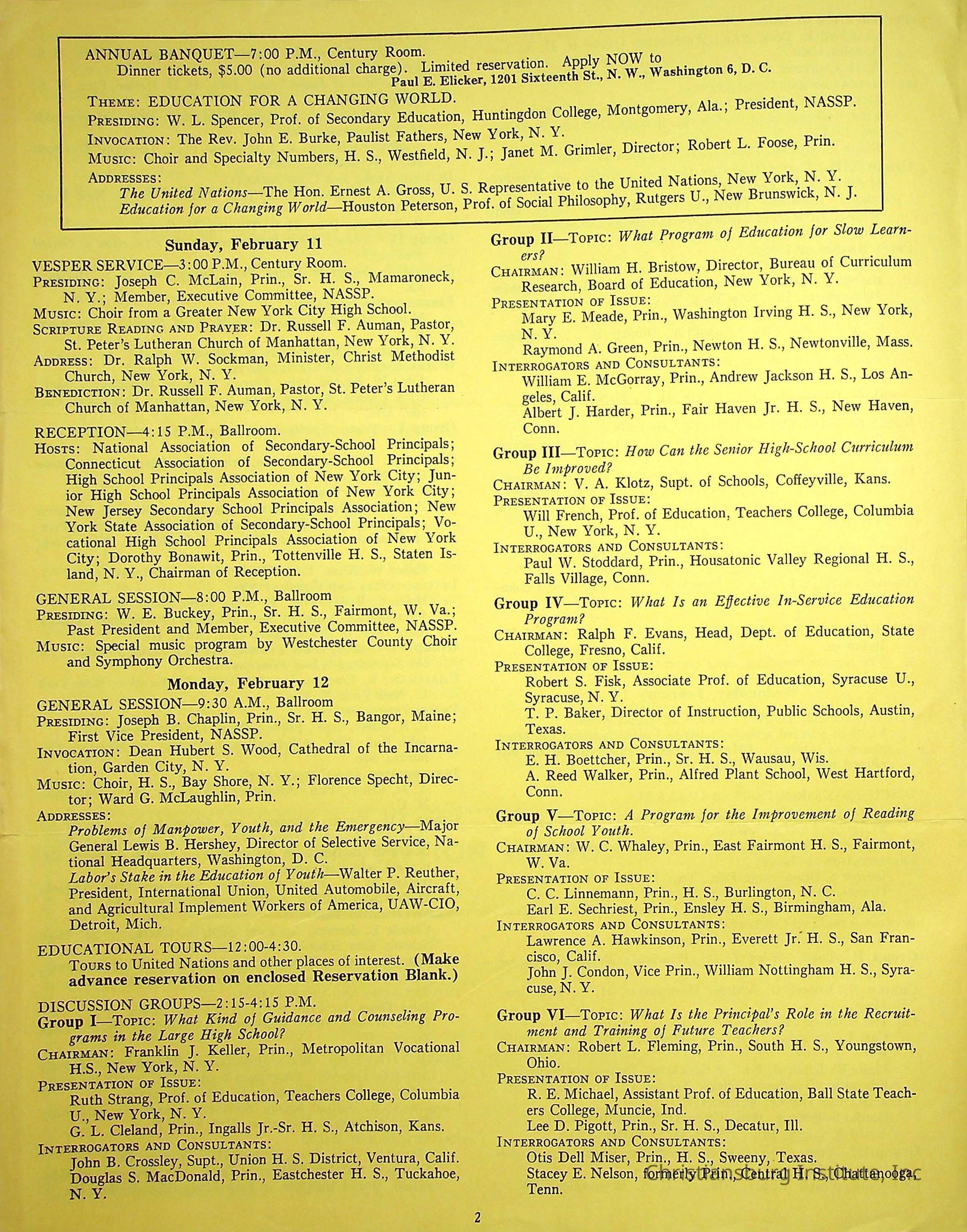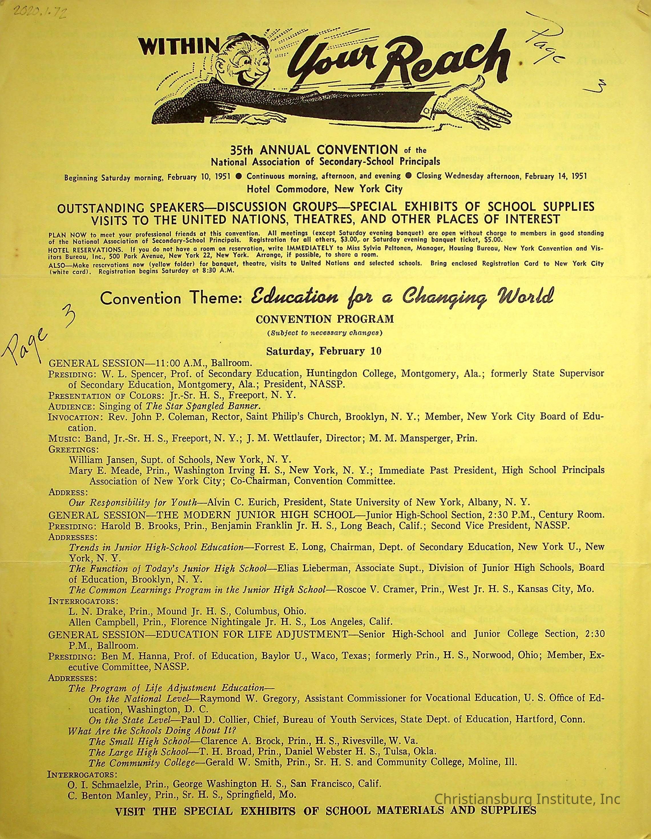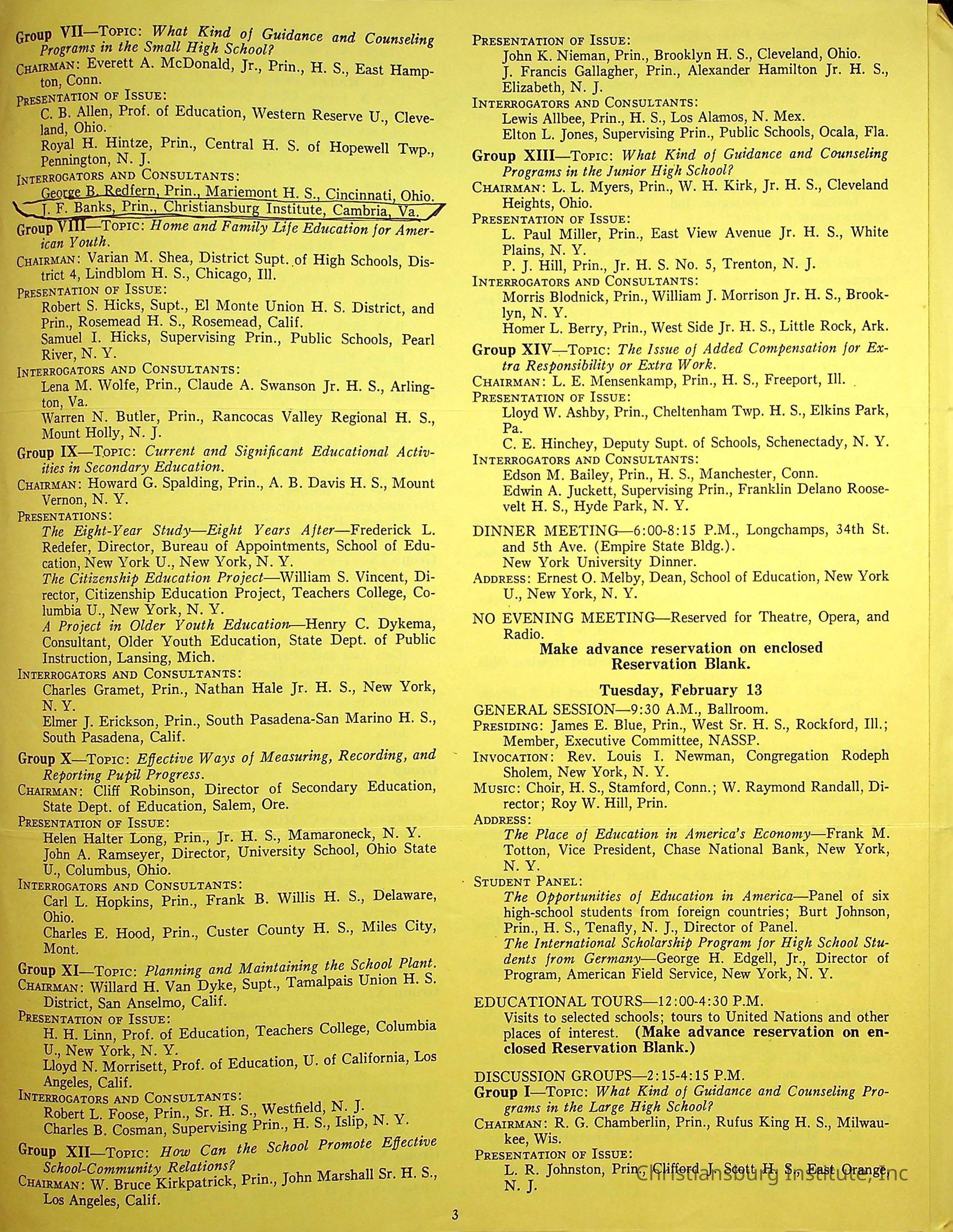 An event program for the 35th annual convention for the National Association of Secondary School Principals held in New York in February, 1951. Christiansburg Institute principal, John F. Banks was in attendance.Creator