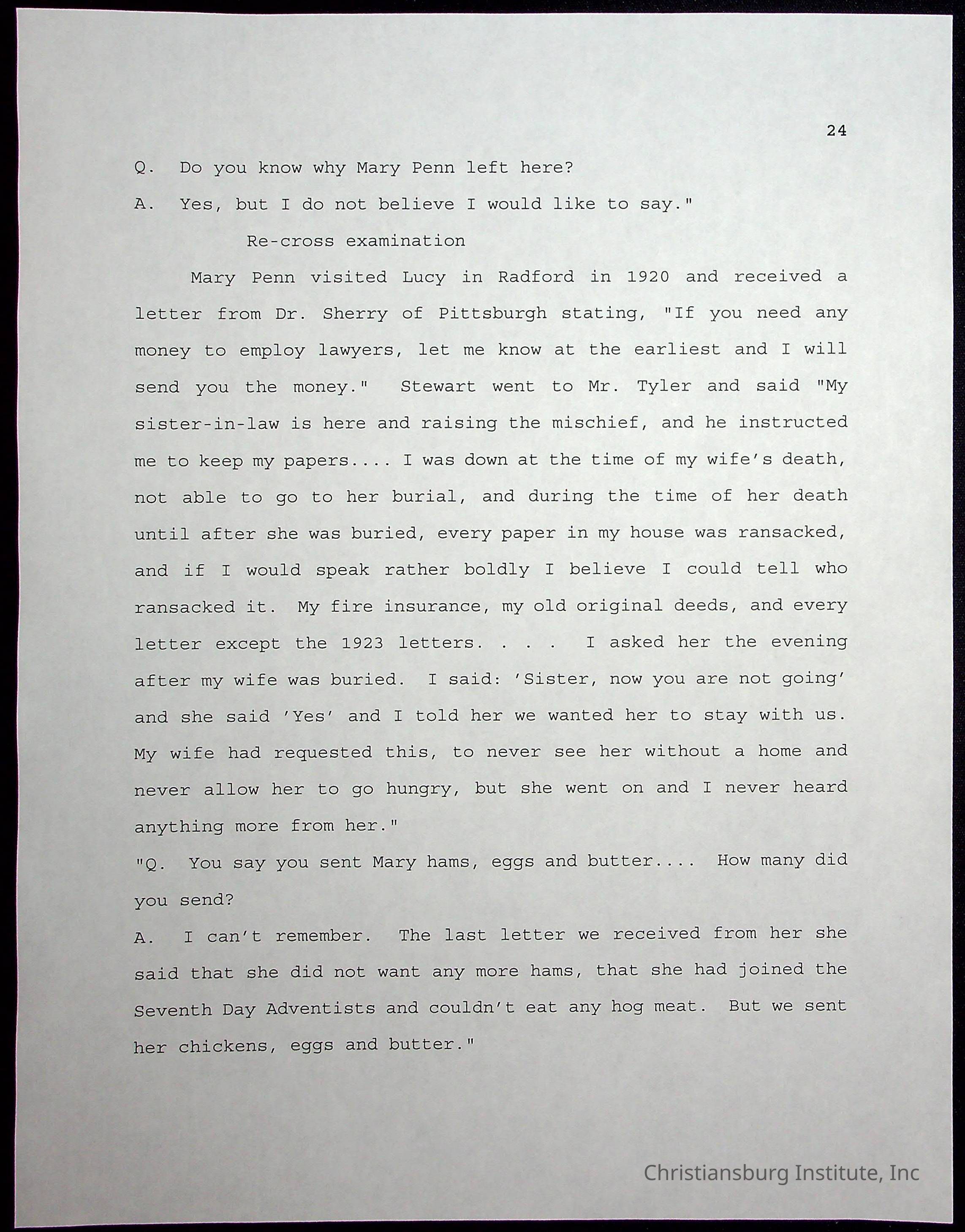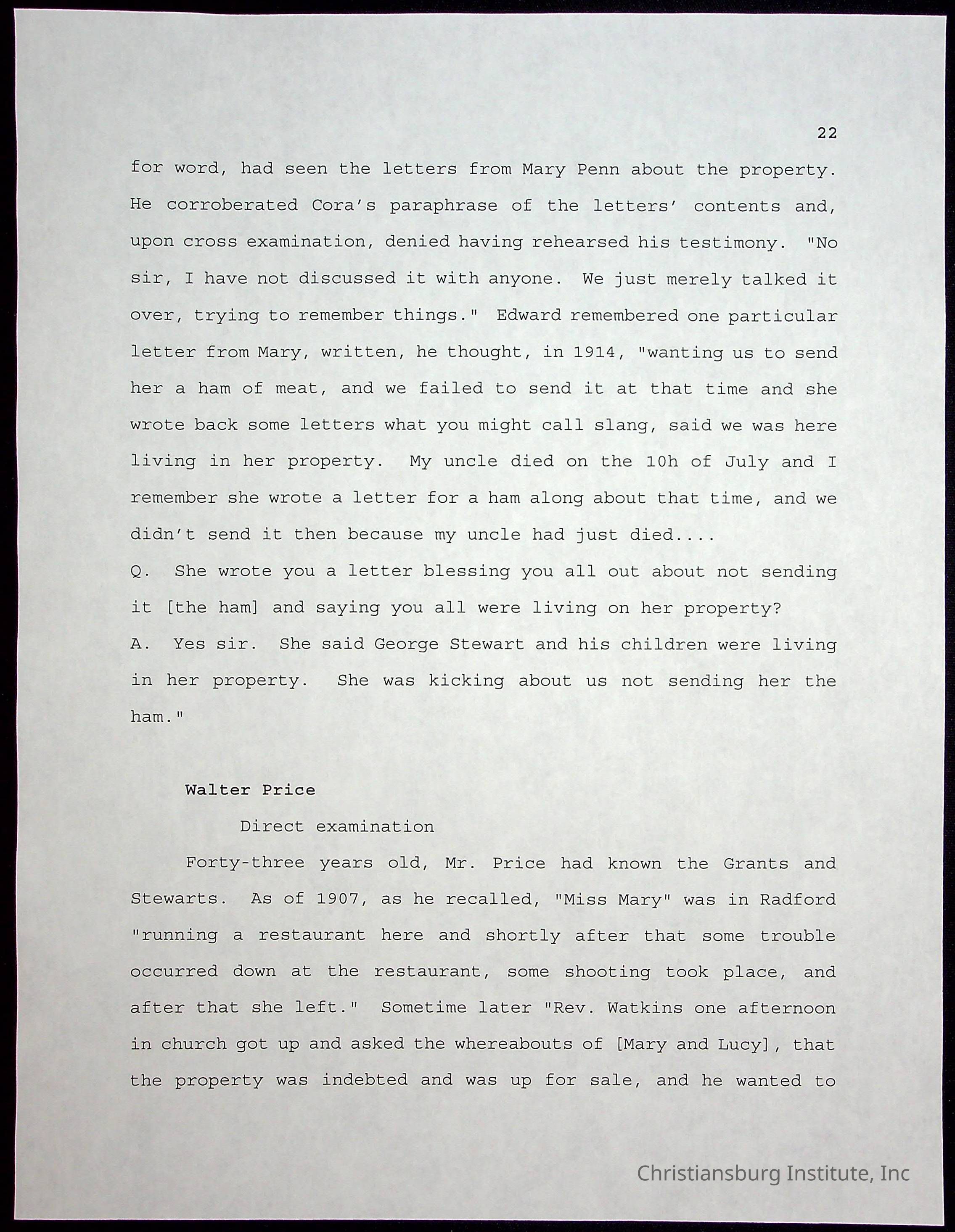A folder of research materials collected by Radford University professor, Dr Linda Killen. This folder is titled 'Grant/Penn/Stewart' and includes Killen's research on the Grant, Penn, and Stewart families of Radford, Virginia. This folder includes an article about a legal battle between the Grant, Penn, and Stewart families.