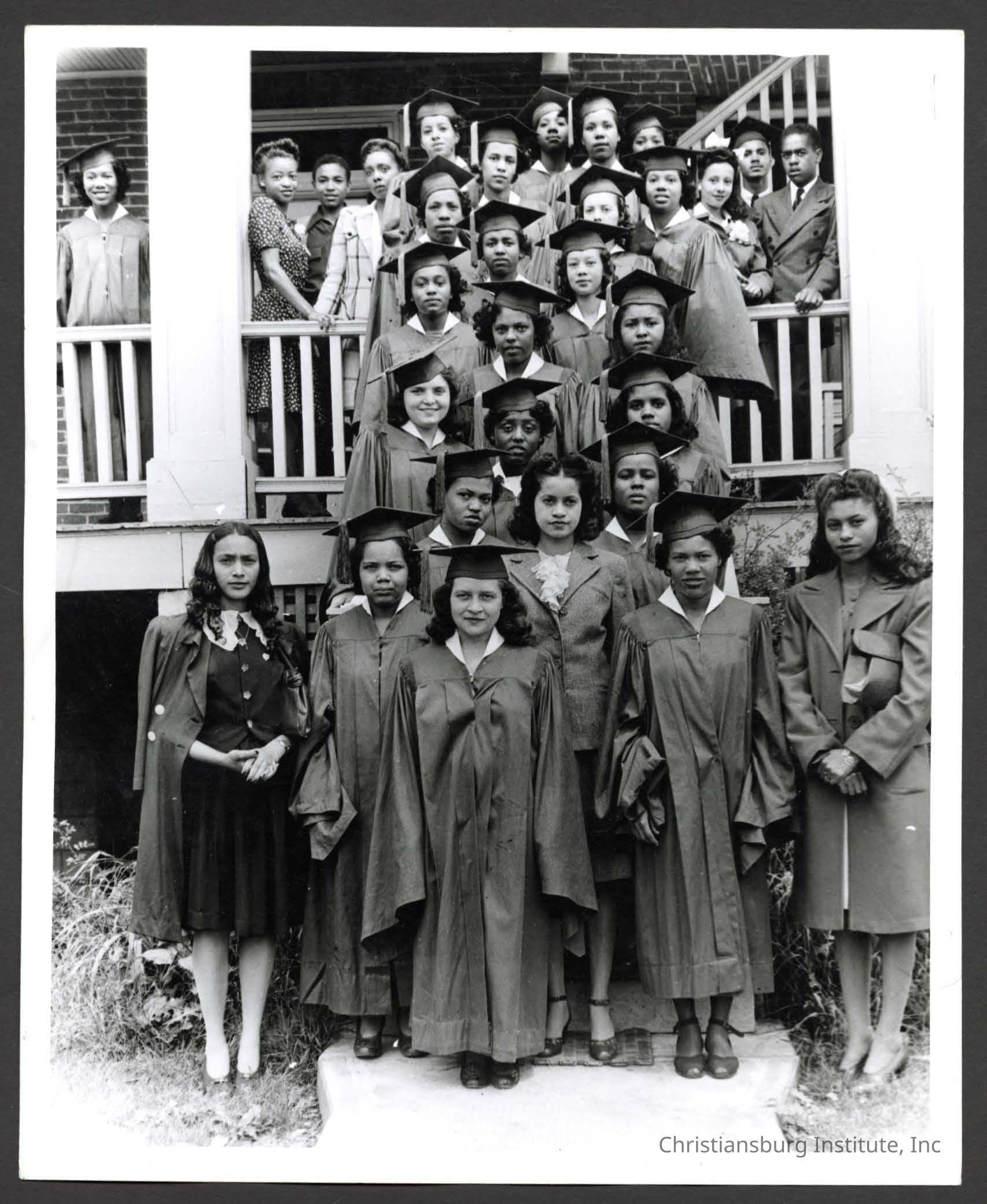 A photograph of unknown Christiansburg Institute graduates standing in front of Bailey Morris Hall, dated 1940.
