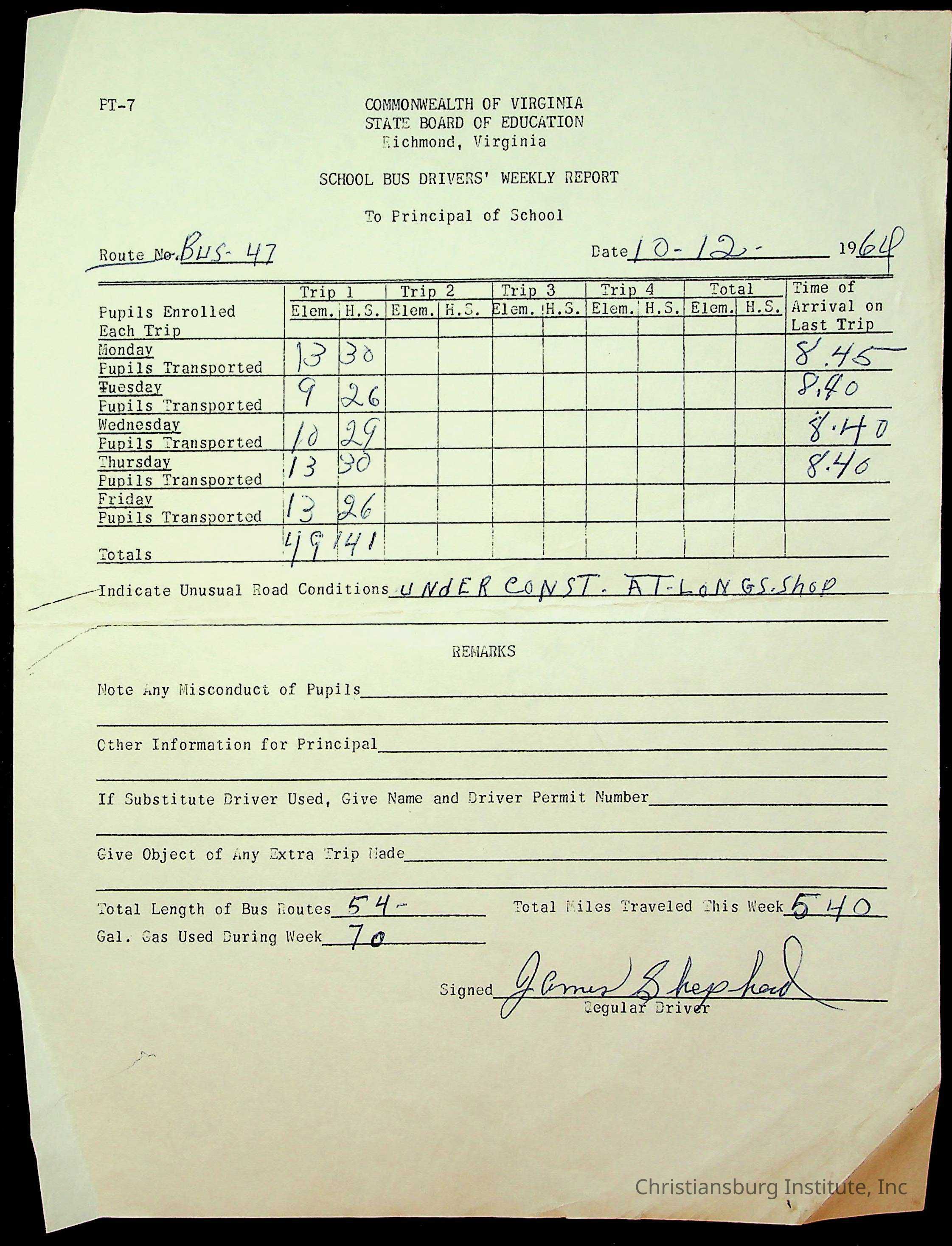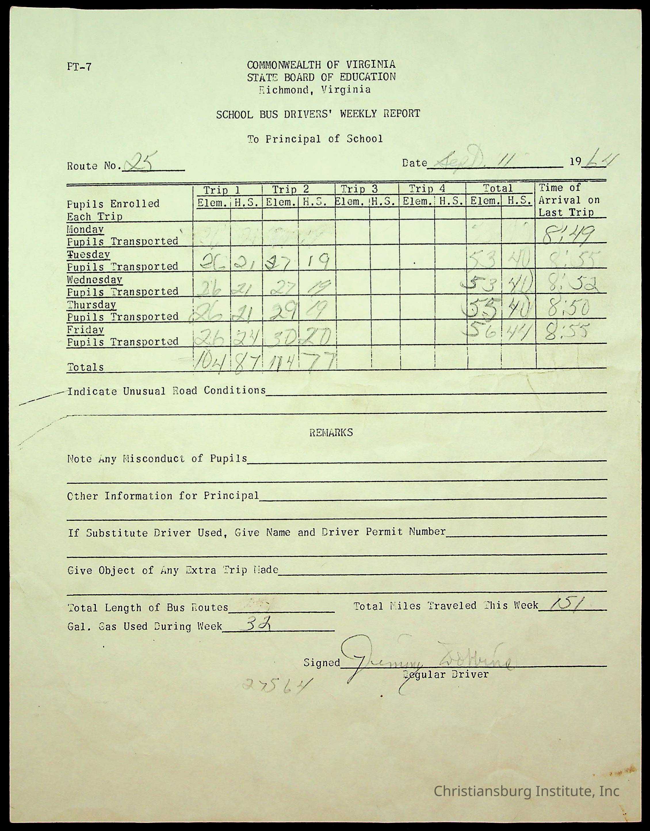 The second folder of an archive of materials that relate to the school buses in Montgomery County, Virginia circa 1960s including weekly bus reports, newspaper clippings, and notes.Collection