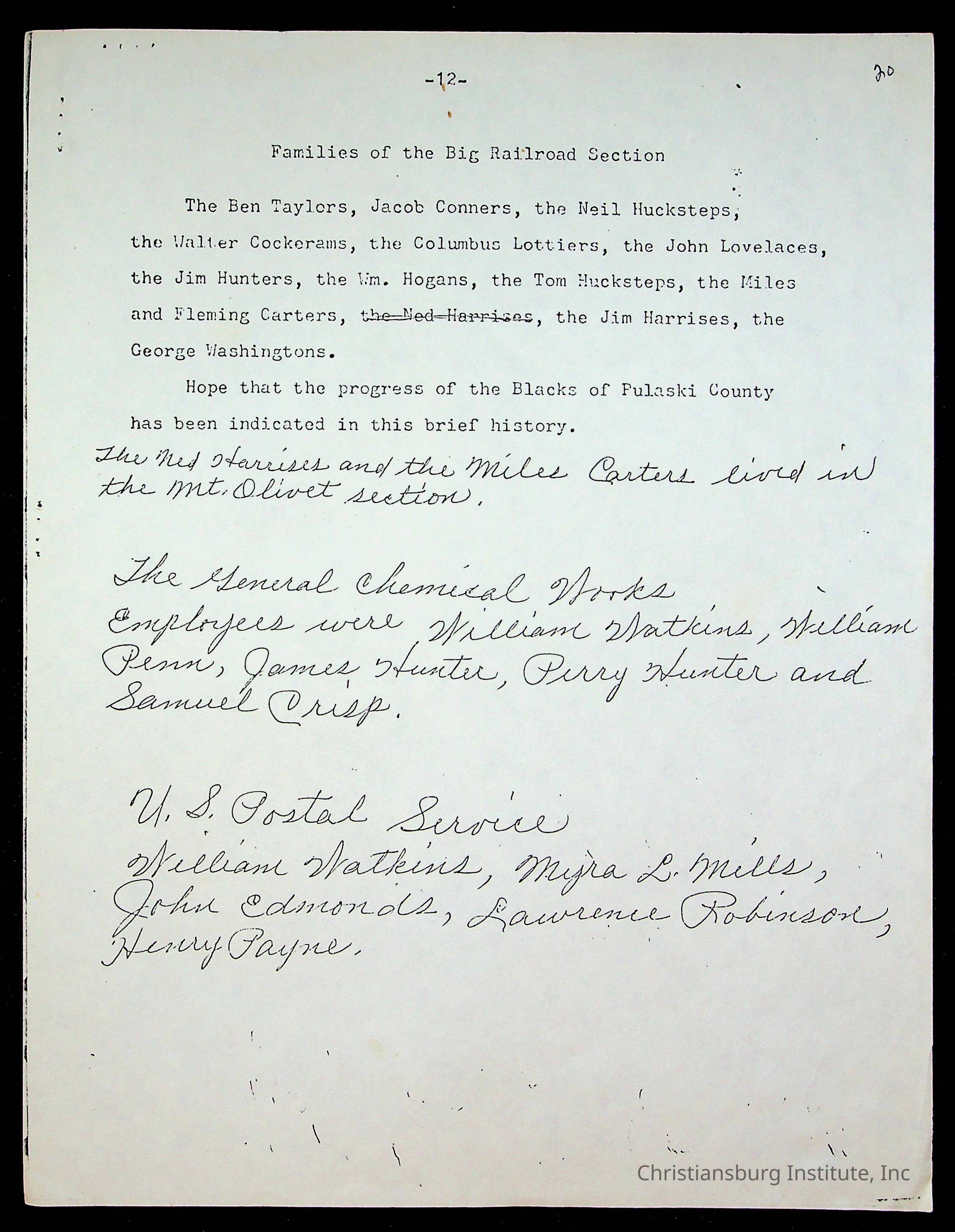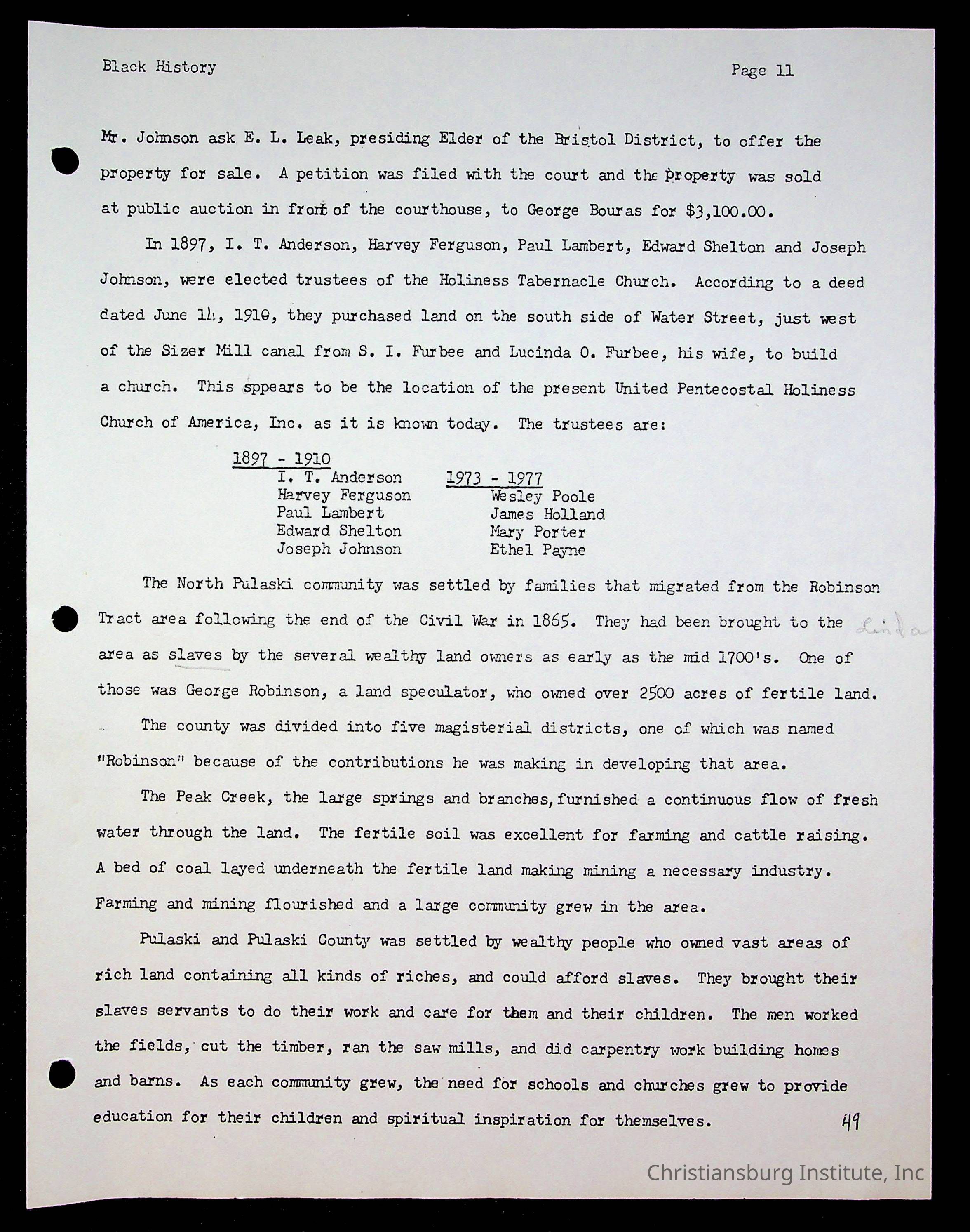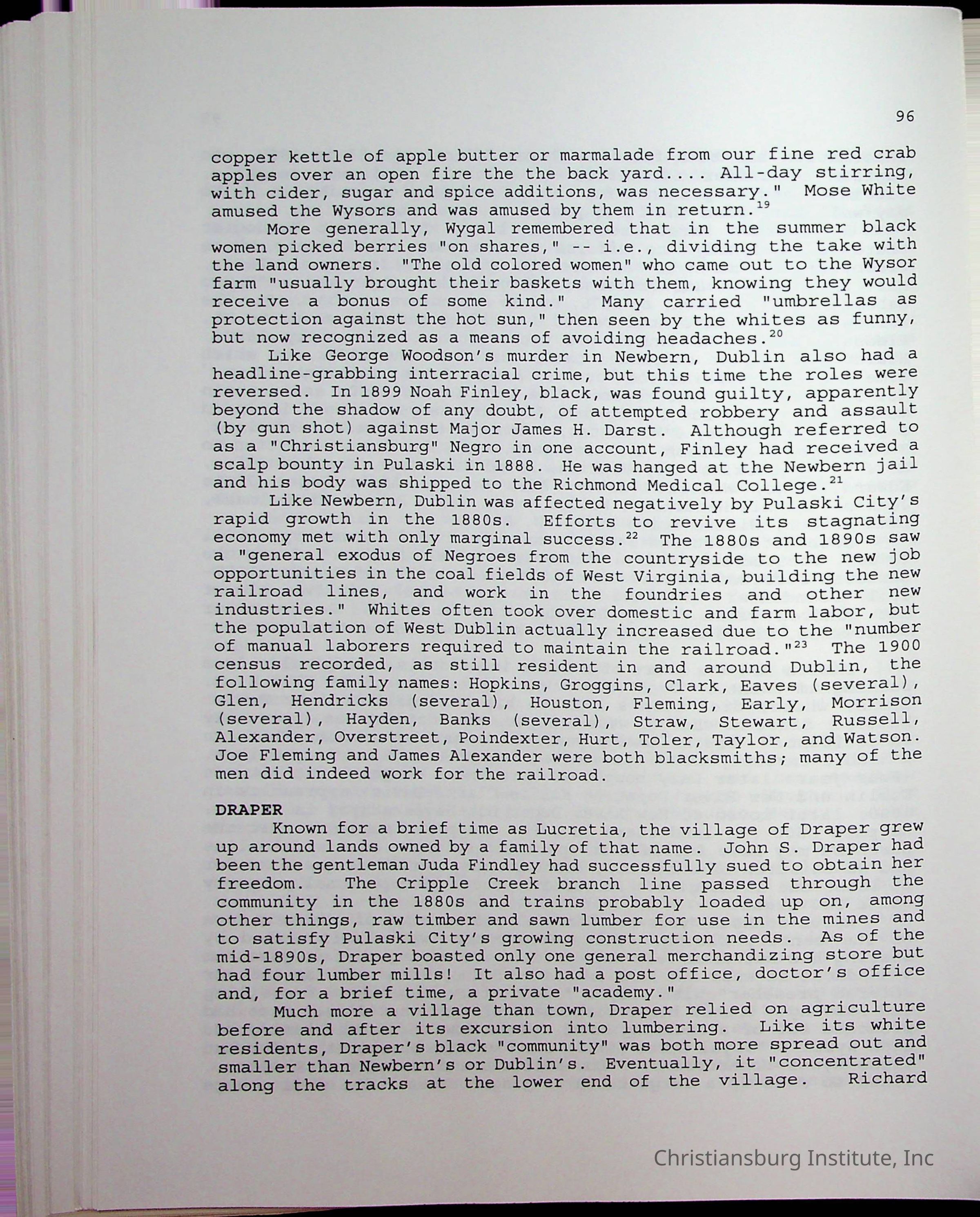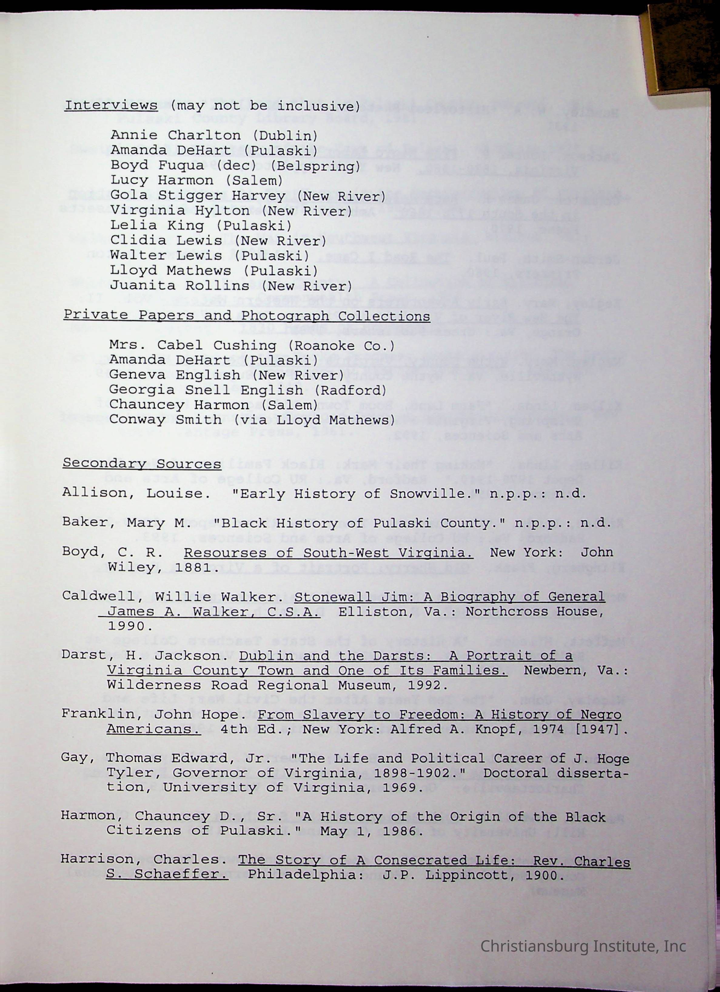 An archive of Black history materials from Pulaski County, Virginia assembled in 1995 by Amanda DeHart. Materials dated range from 1919 to 1995.