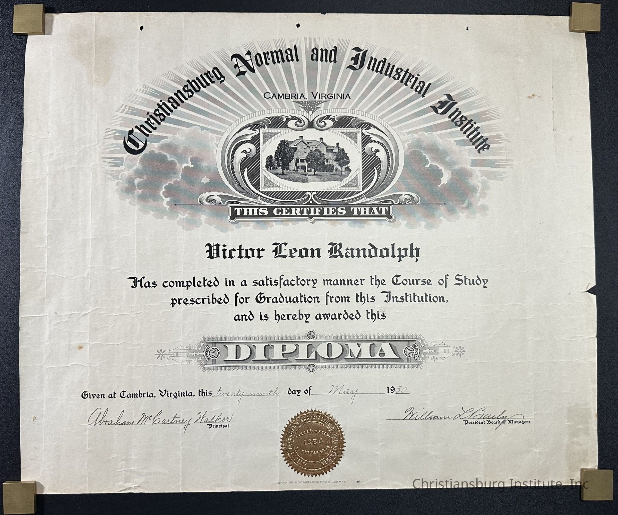 A high school diploma issued to Victor Leon Randolph on May 27th, 1930 for completing their course of study at Christiansburg Normal and Industrial Institute.Collection