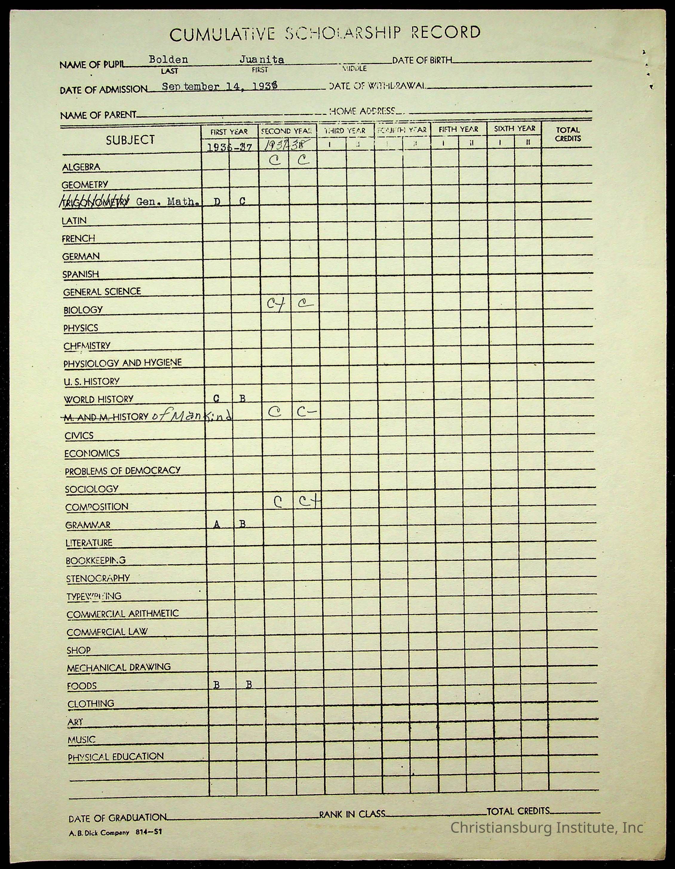 The student file for the Christiansburg Institute student, Juanita Bolden circa 1930s.