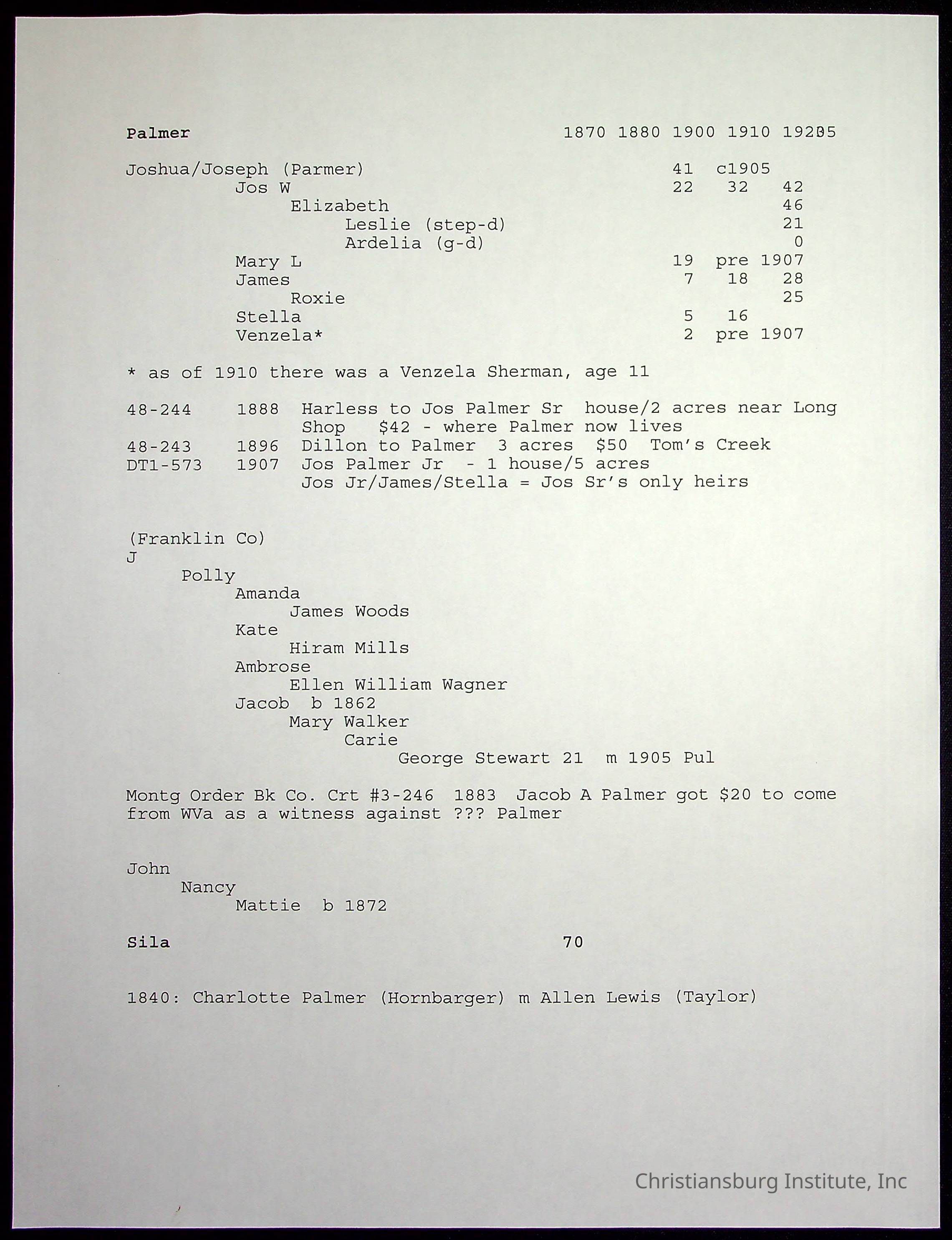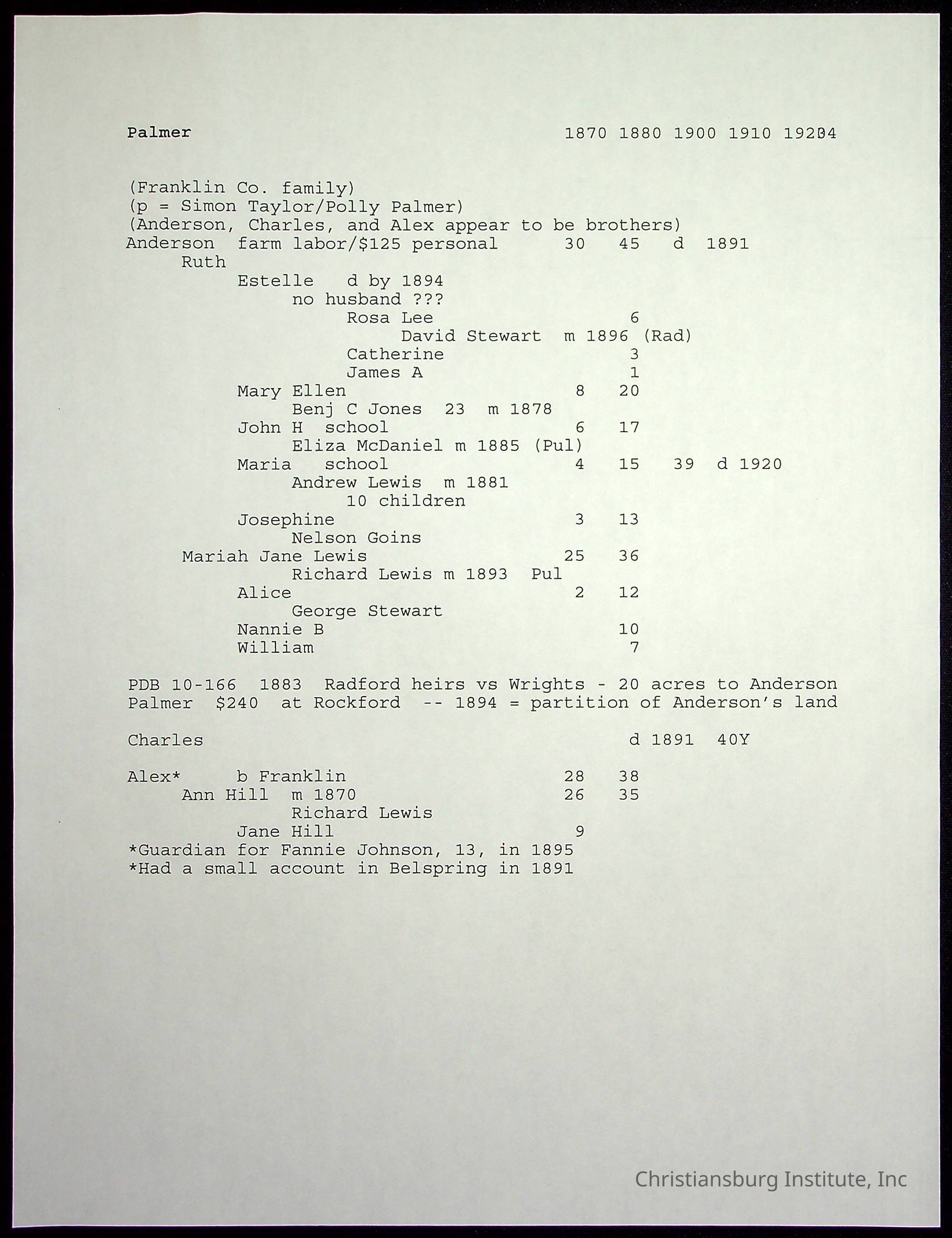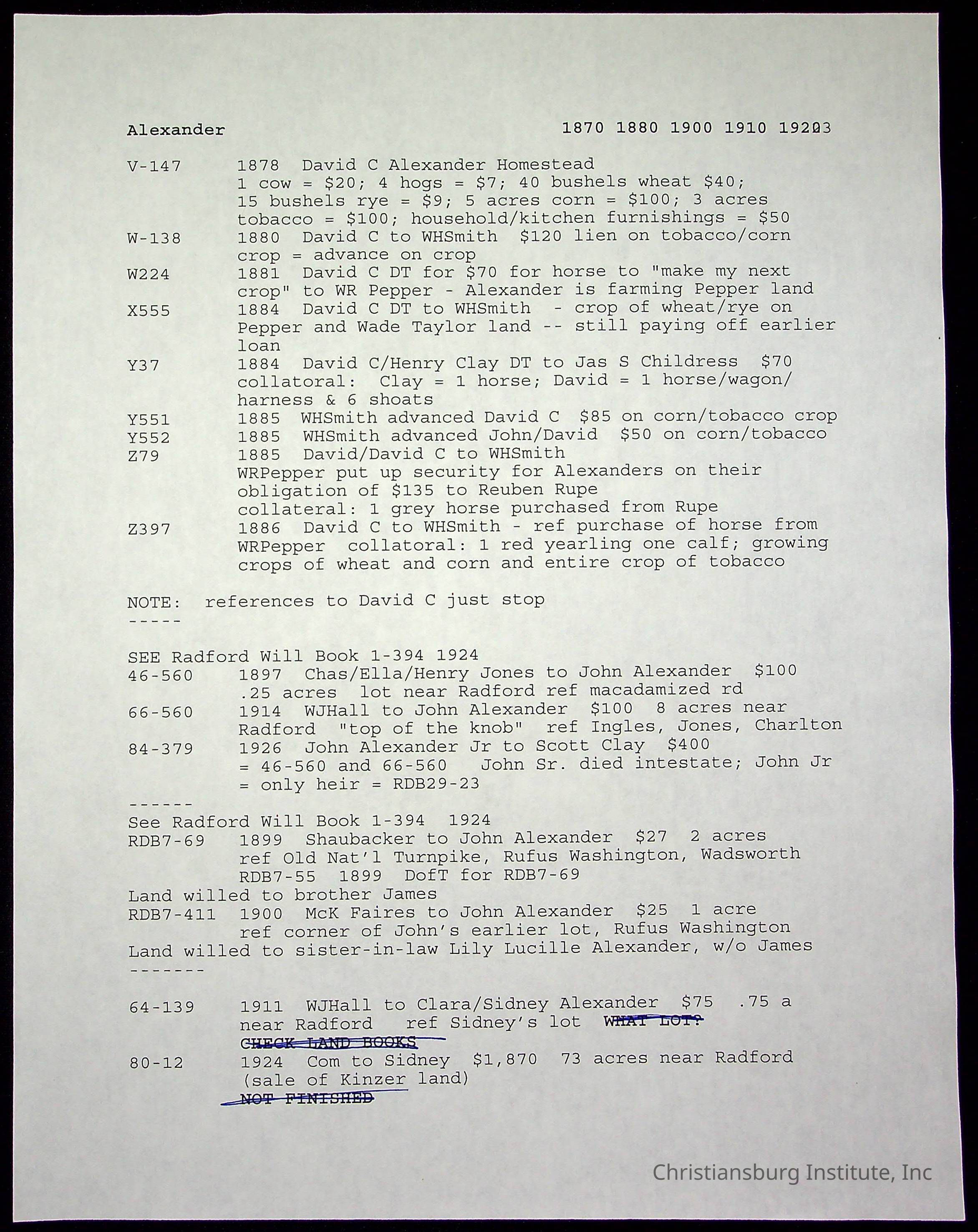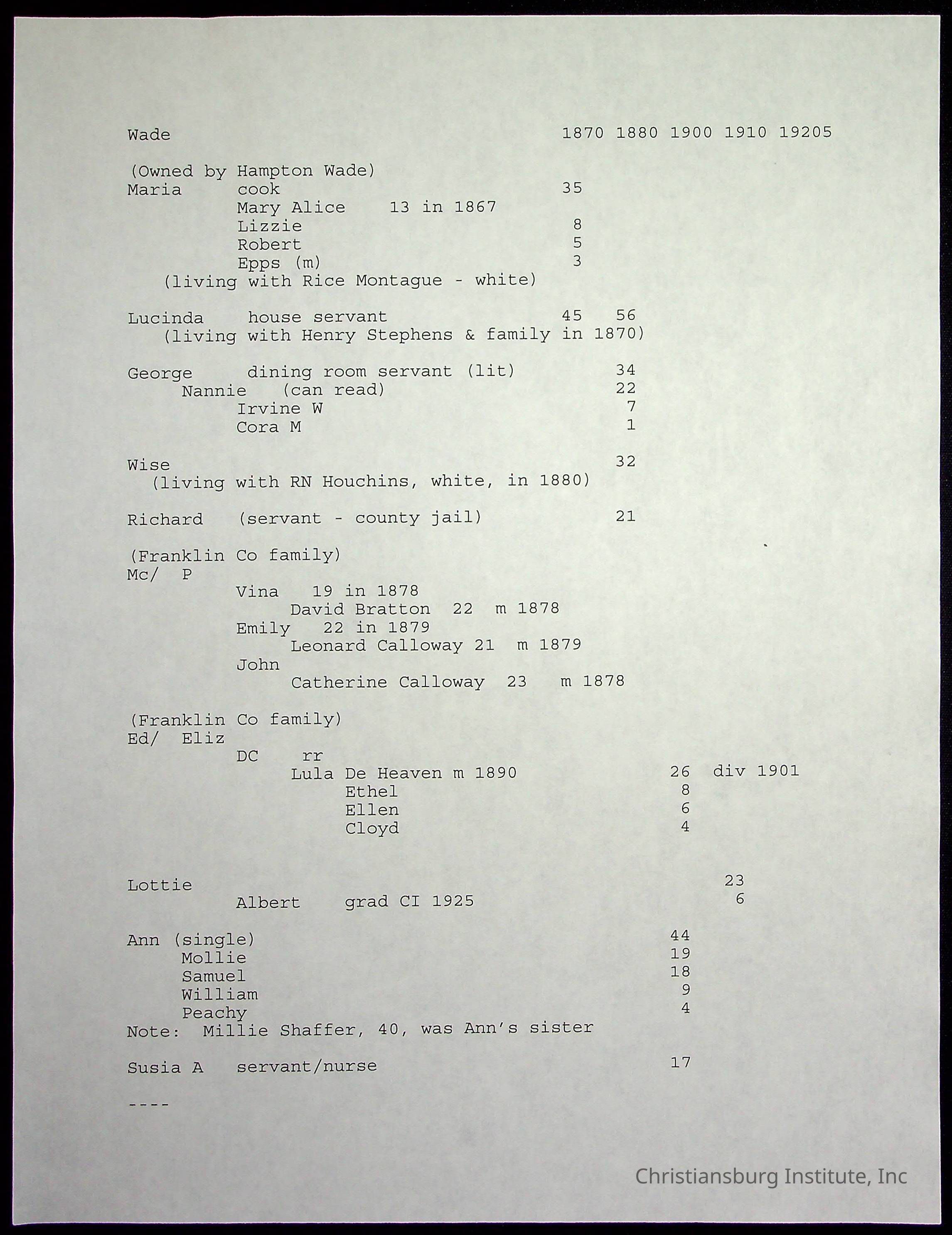 Farm Land, Boom Town, Village: A History of Belspring, Virginia, 1750-1940, The Reports of Charles S. Schaeffer from the Virginia counties of Montgomery and Pulaski, with additional information on the counties of Floyd, Giles, Craig, Wythe, and Roanoke., Ingles Ferry Ledgers (1840s-1880s), These people lived in a pleasant valley, Making their mark: Black Families of New River Depot, 1870-1940., Whartons’ Town New River Depot, 1870-1940., Radford’s Early Black Residents, 1880-1925