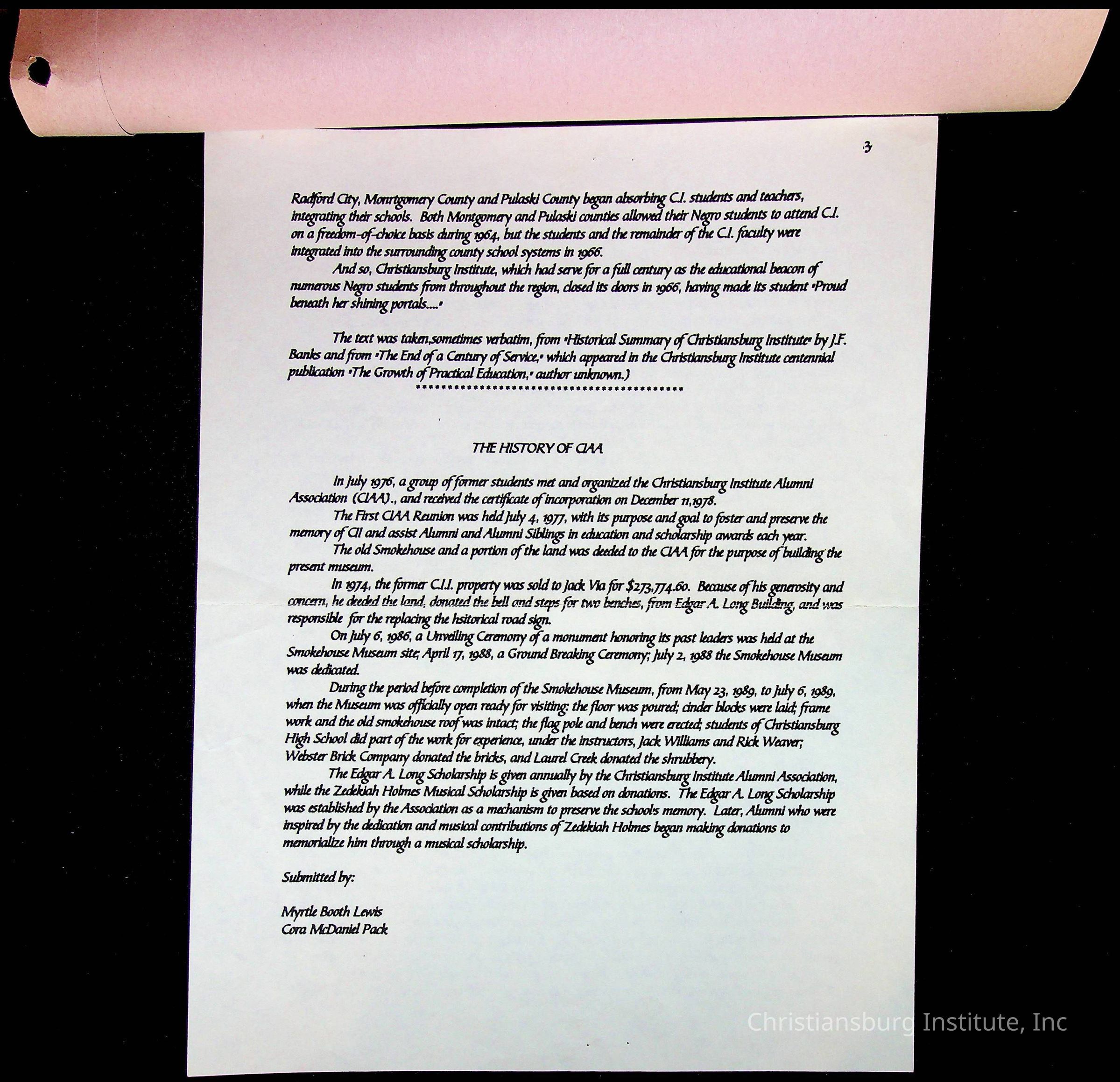 Copyright has been assigned to Christiansburg Institute Museum & Archives by Amanda DeHart. For permission to publish materials created by the donor, contact CIMA@christiansburginstitute.com. Materials not created by Amanda DeHart may still be under copyright.