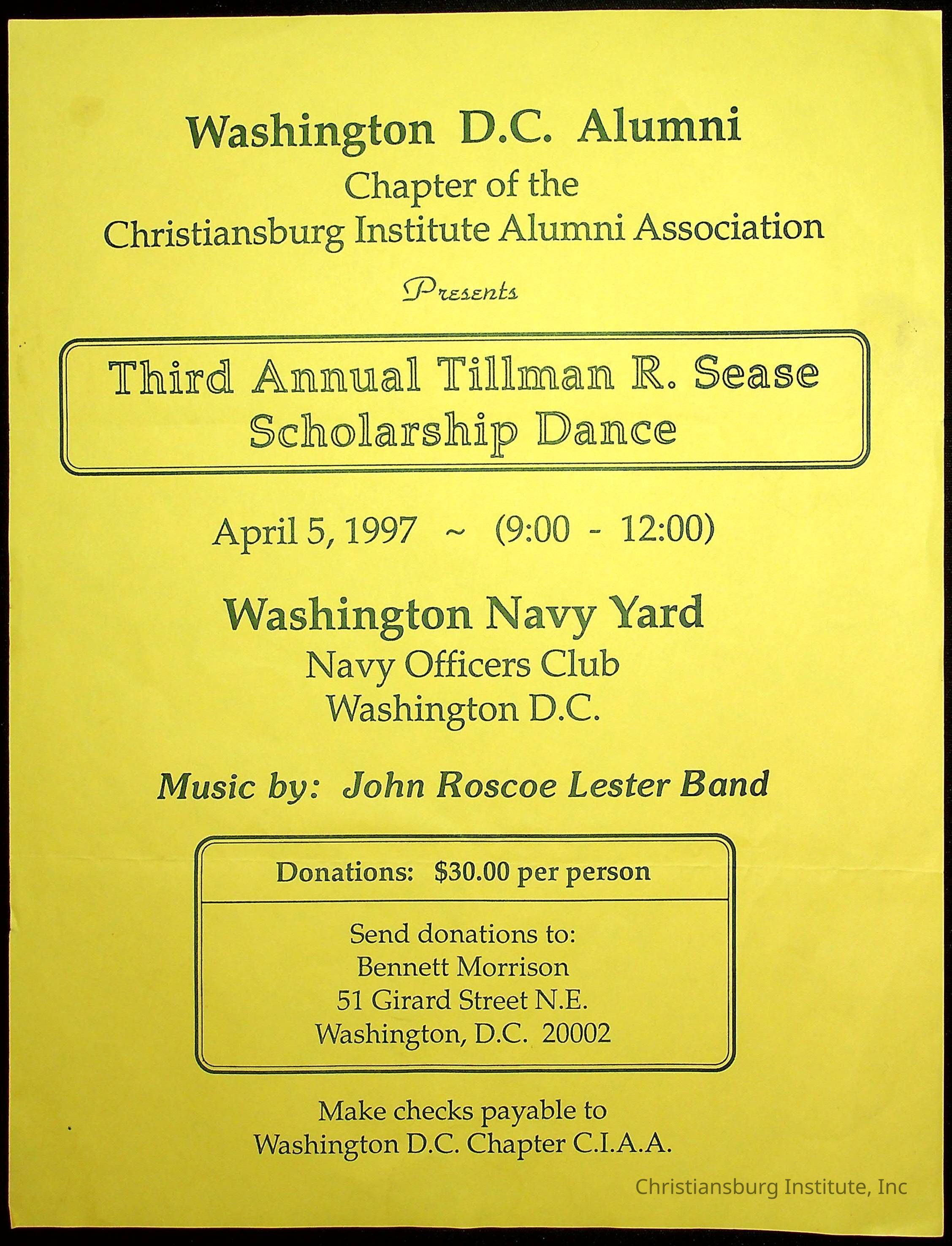 An event flyer for the 3rd Annual Tillman R. Sease Scholarship dance hosted by the Christiansburg Institute Alumni Association Washington DC chapter on April 5th, 1997 in Washington DC.Creator