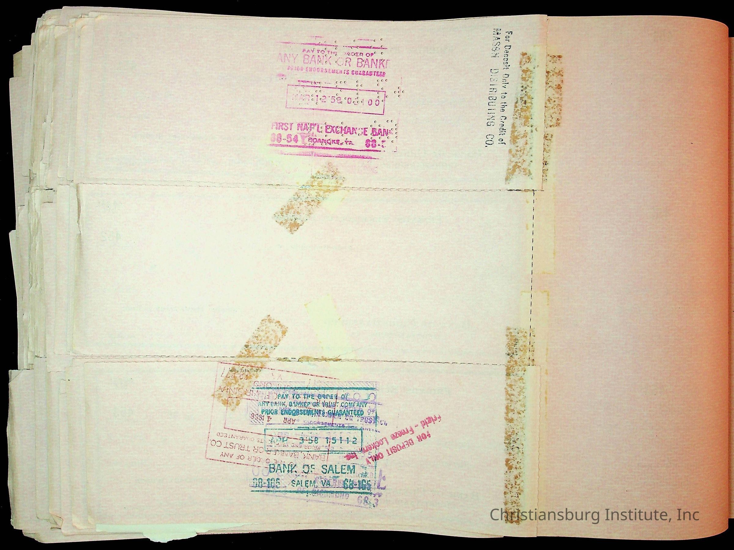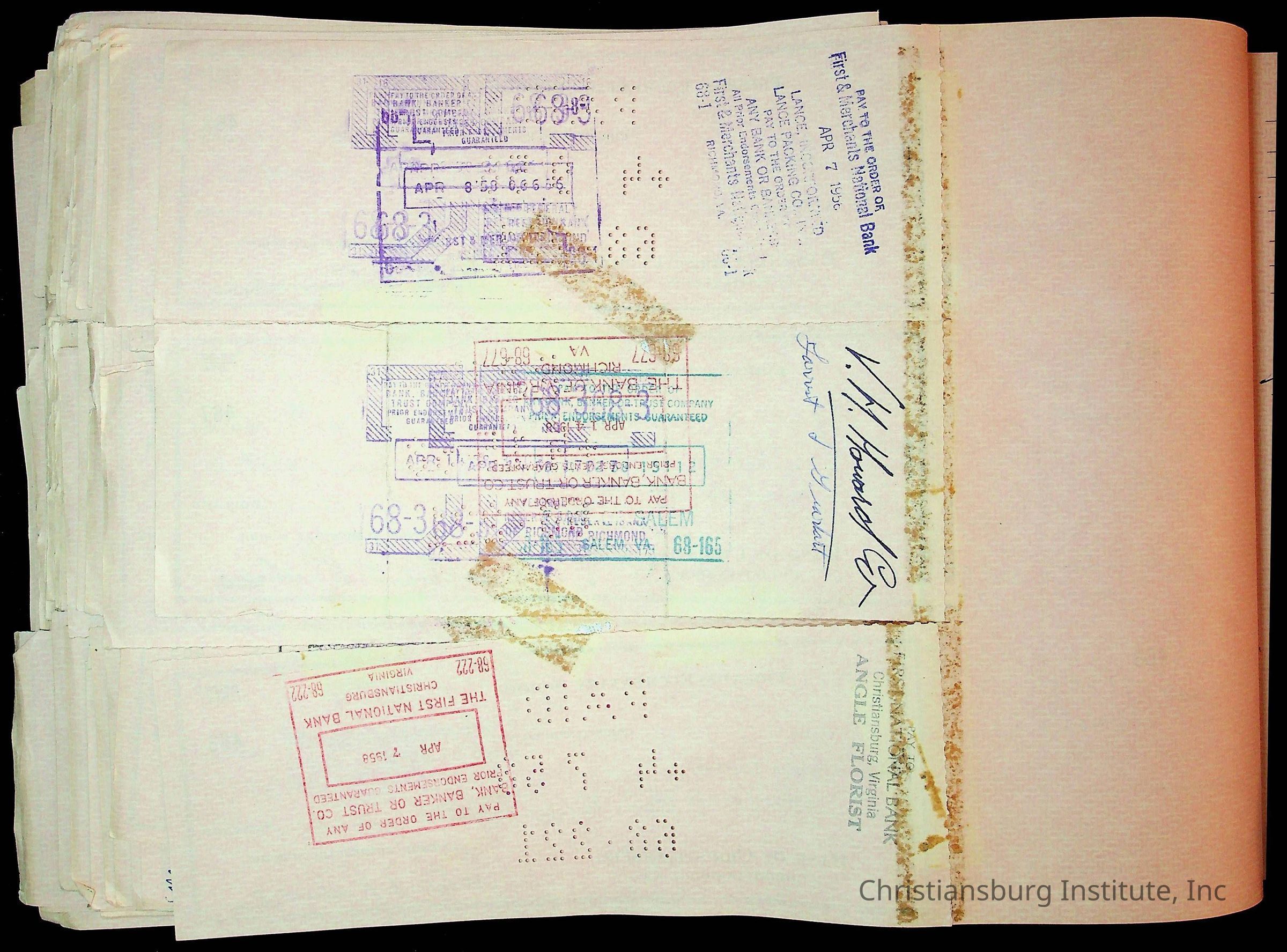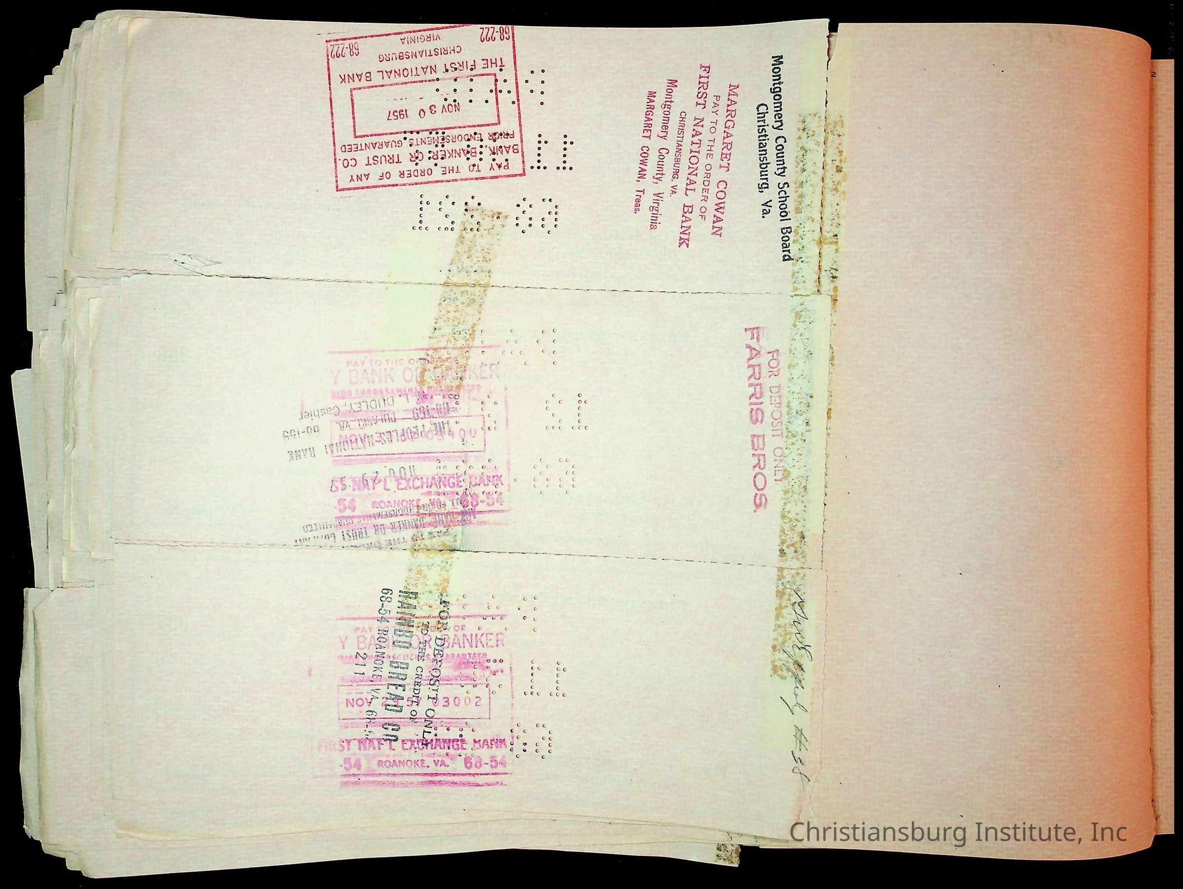 A flat-lay checkbook manufactured by the John H. Harland Company used by Friends' Elementary School documenting their expenses and outgoing checks from February 1957 through May 1958.