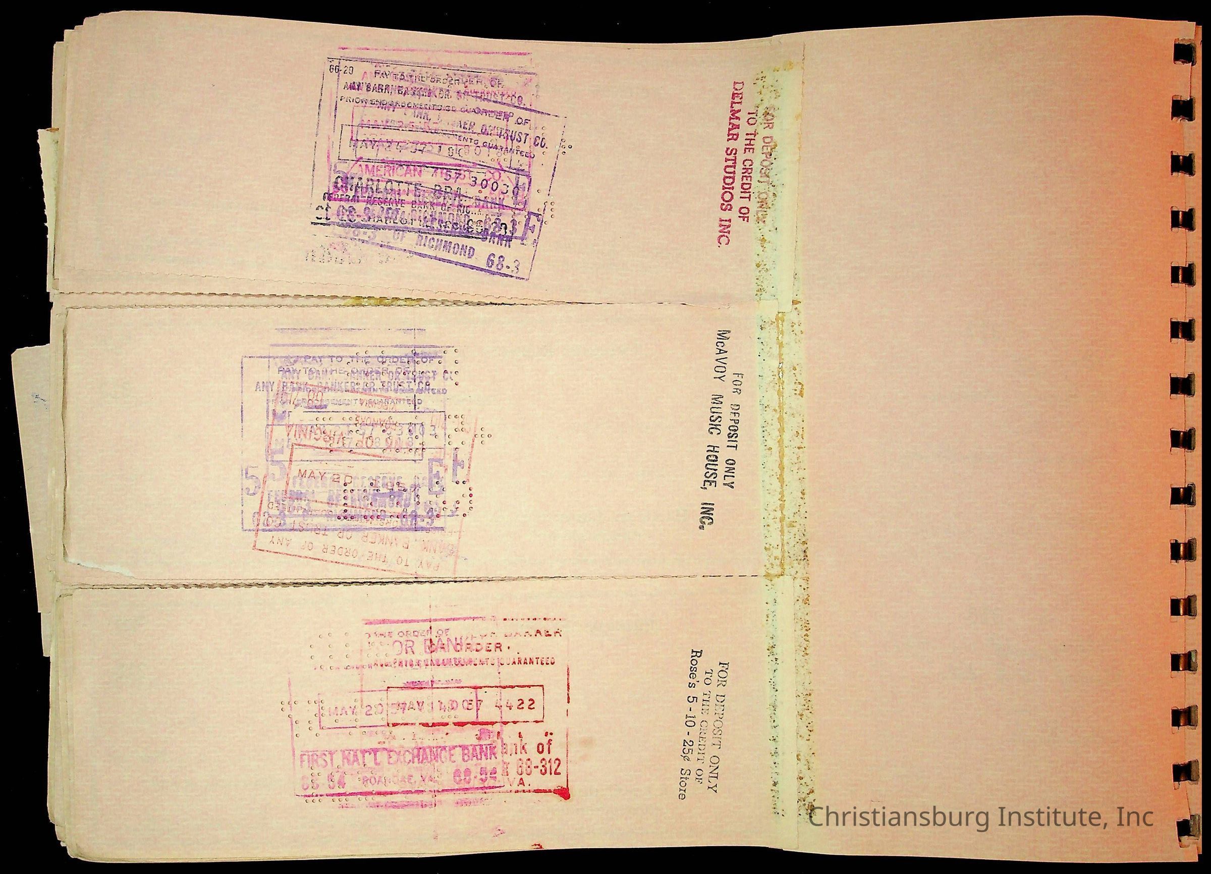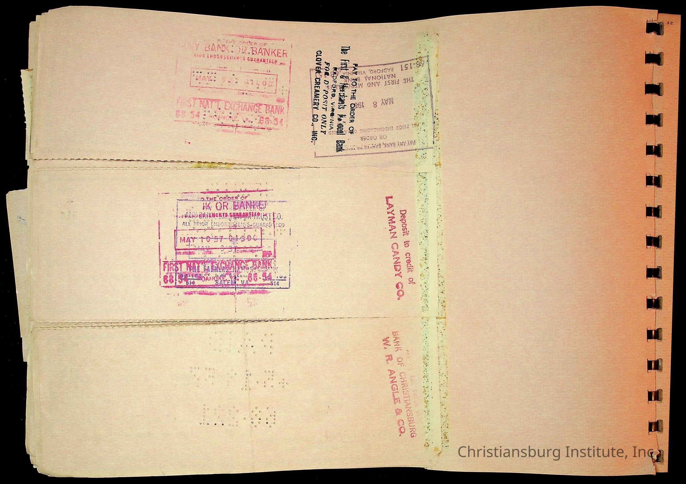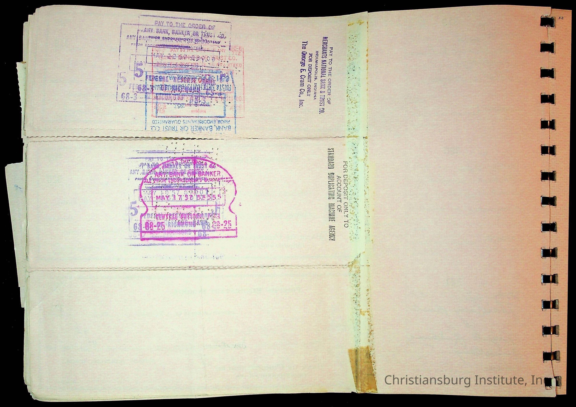 A flat-lay checkbook manufactured by the John H. Harland Company used by Friends' Elementary School documenting their expenses and outgoing checks from February 1957 through May 1958.
