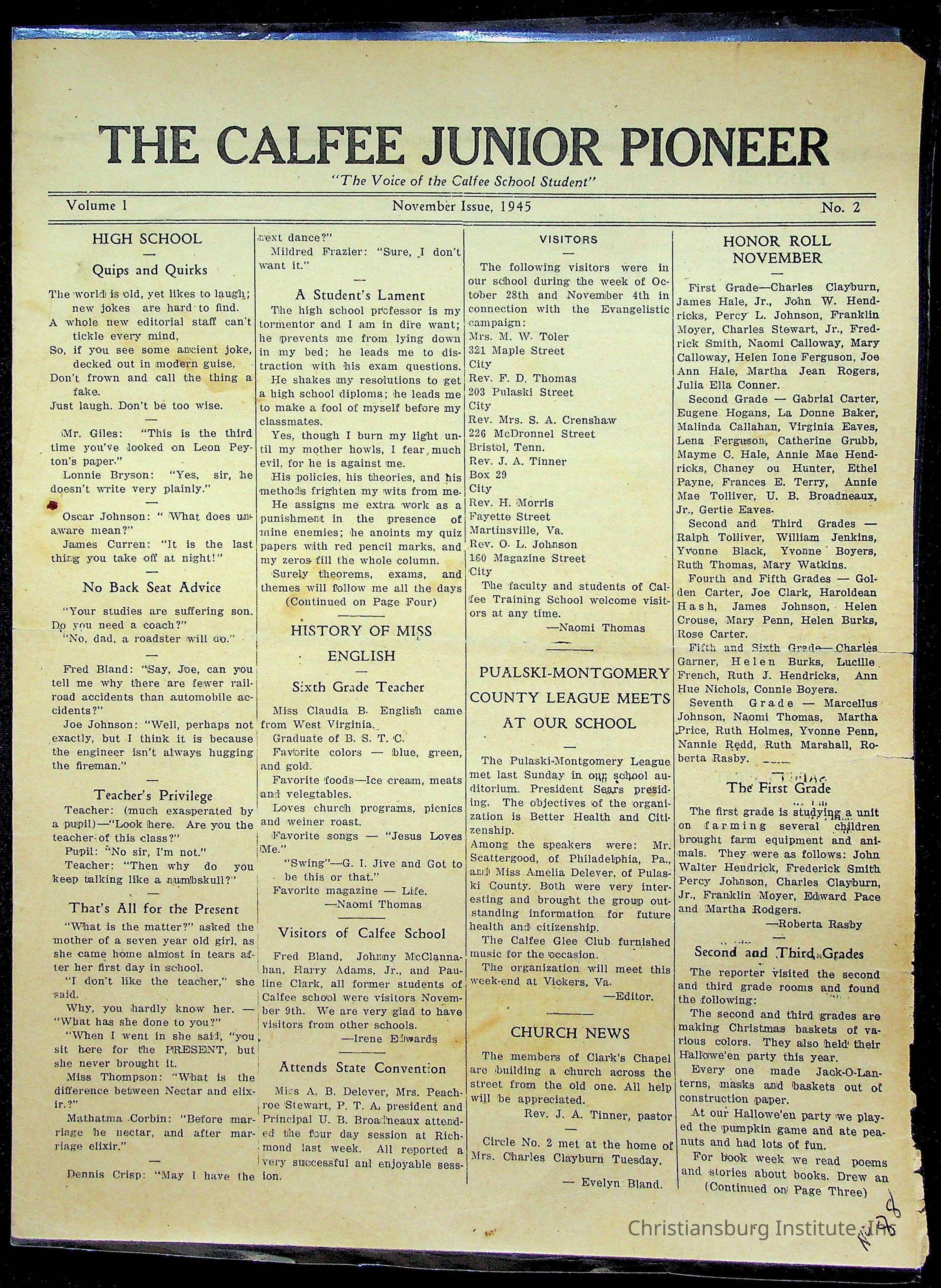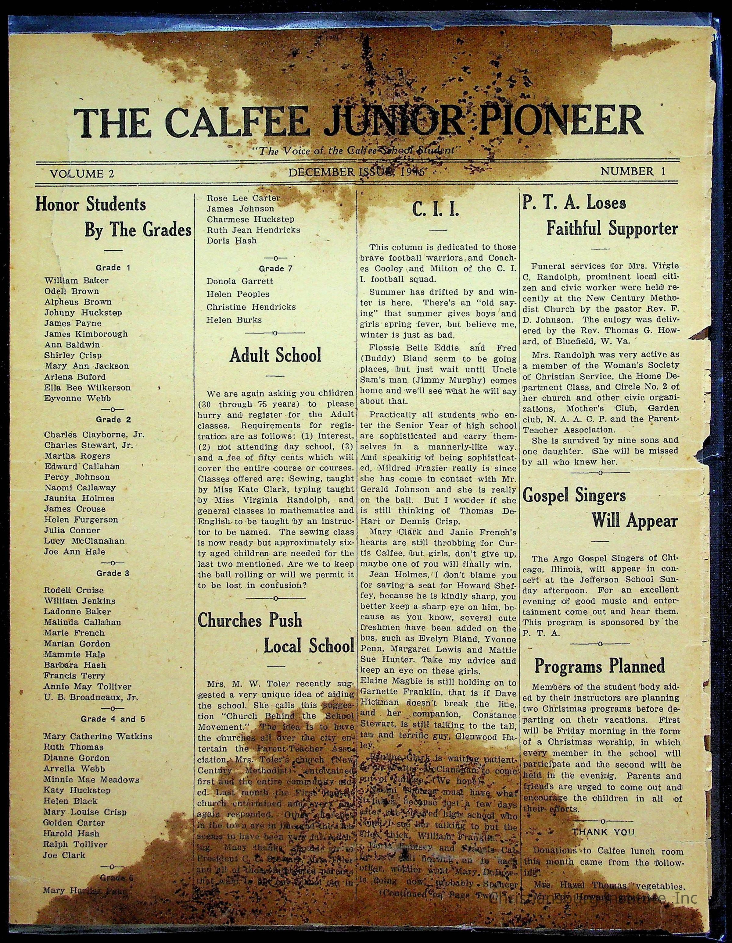 An archive of materials from the Calfee Training School including photographs, educational exercises, and the student publication, Calfee Junior Pioneer. The archive materials are from 1919-1946.Collection