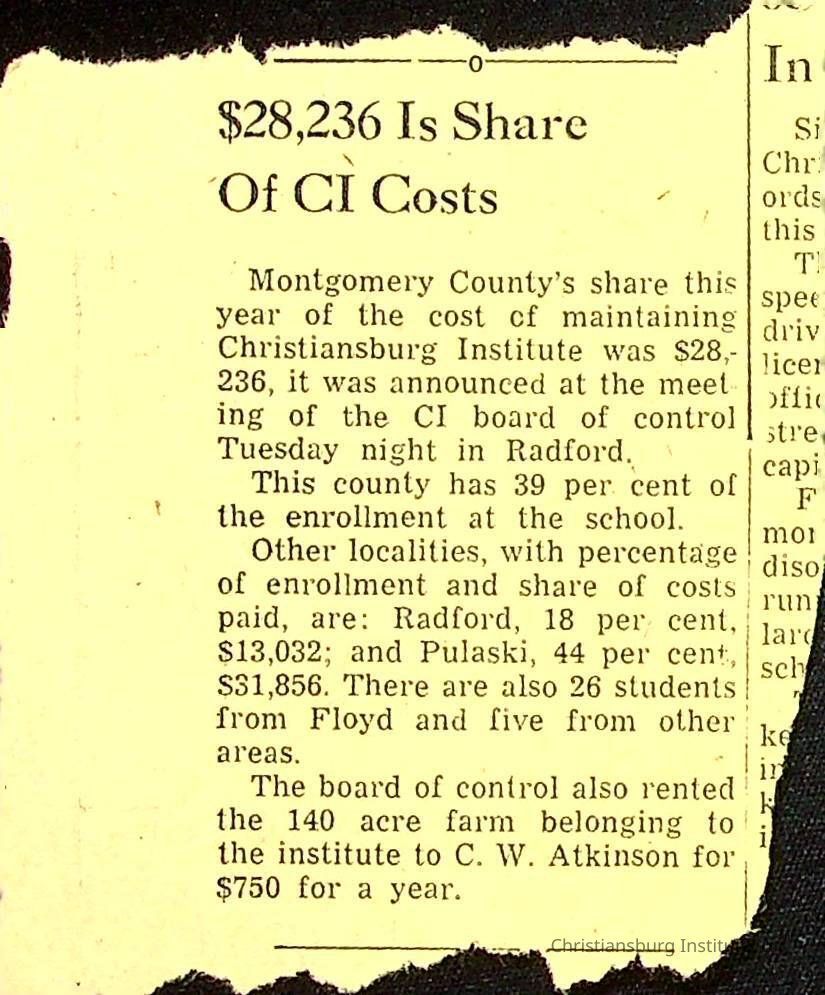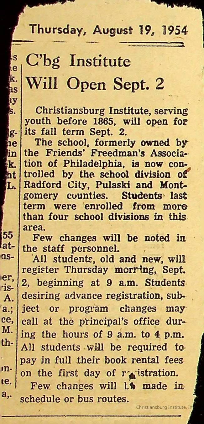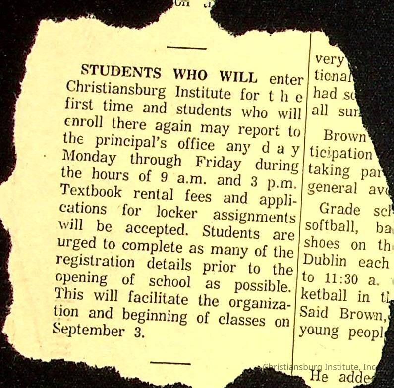 A series of newspaper clippings that feature stories about administrative news in regards to Christiansburg Institute circa 1950s-1960s.