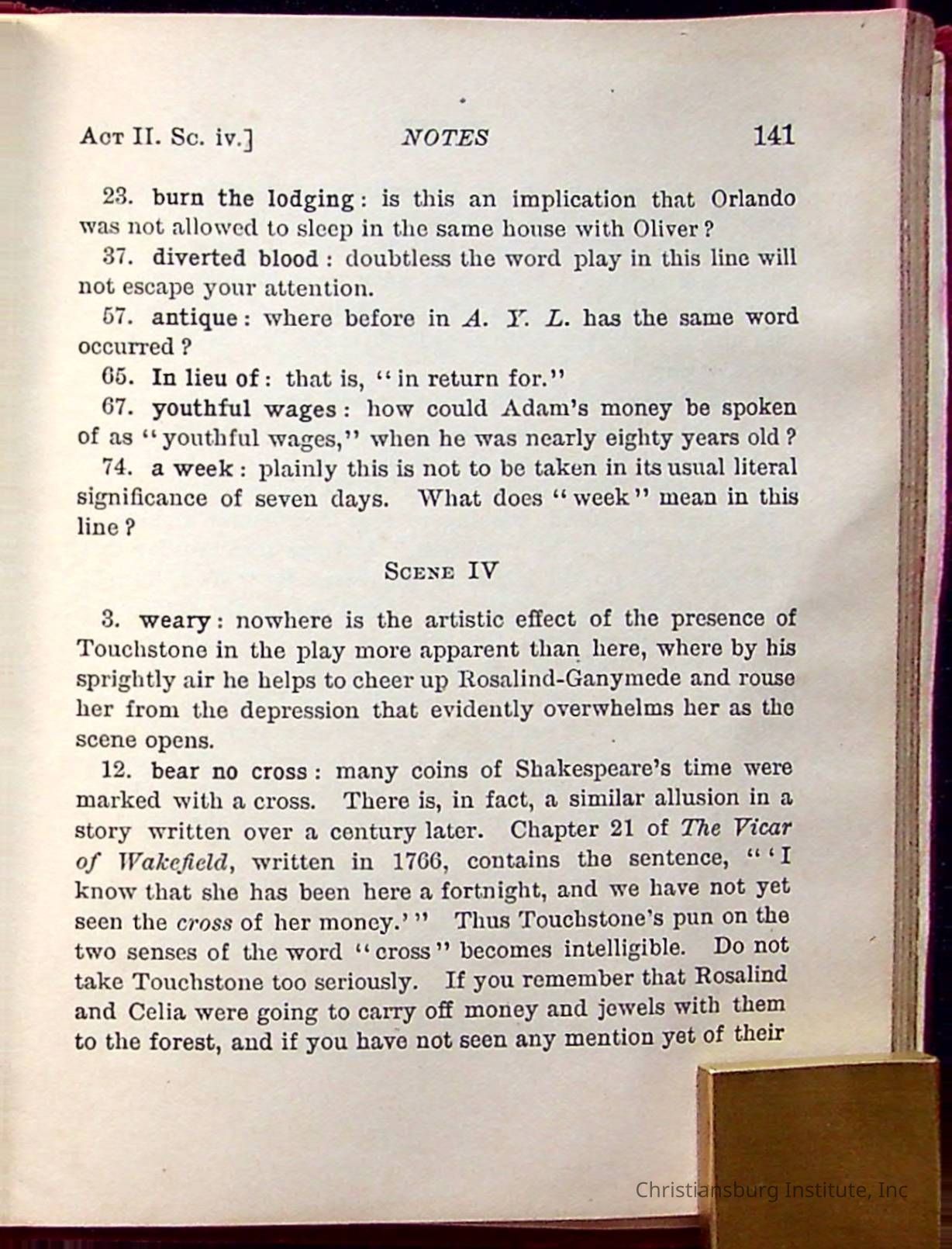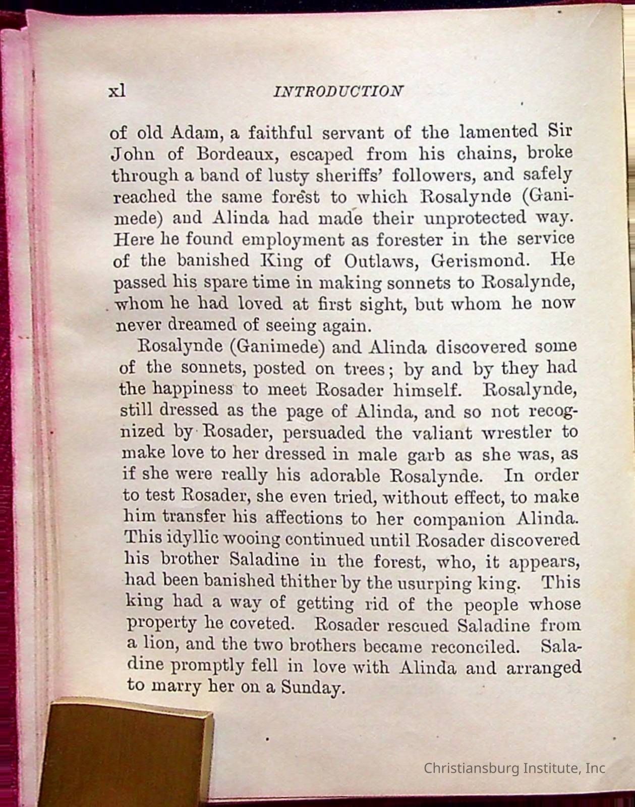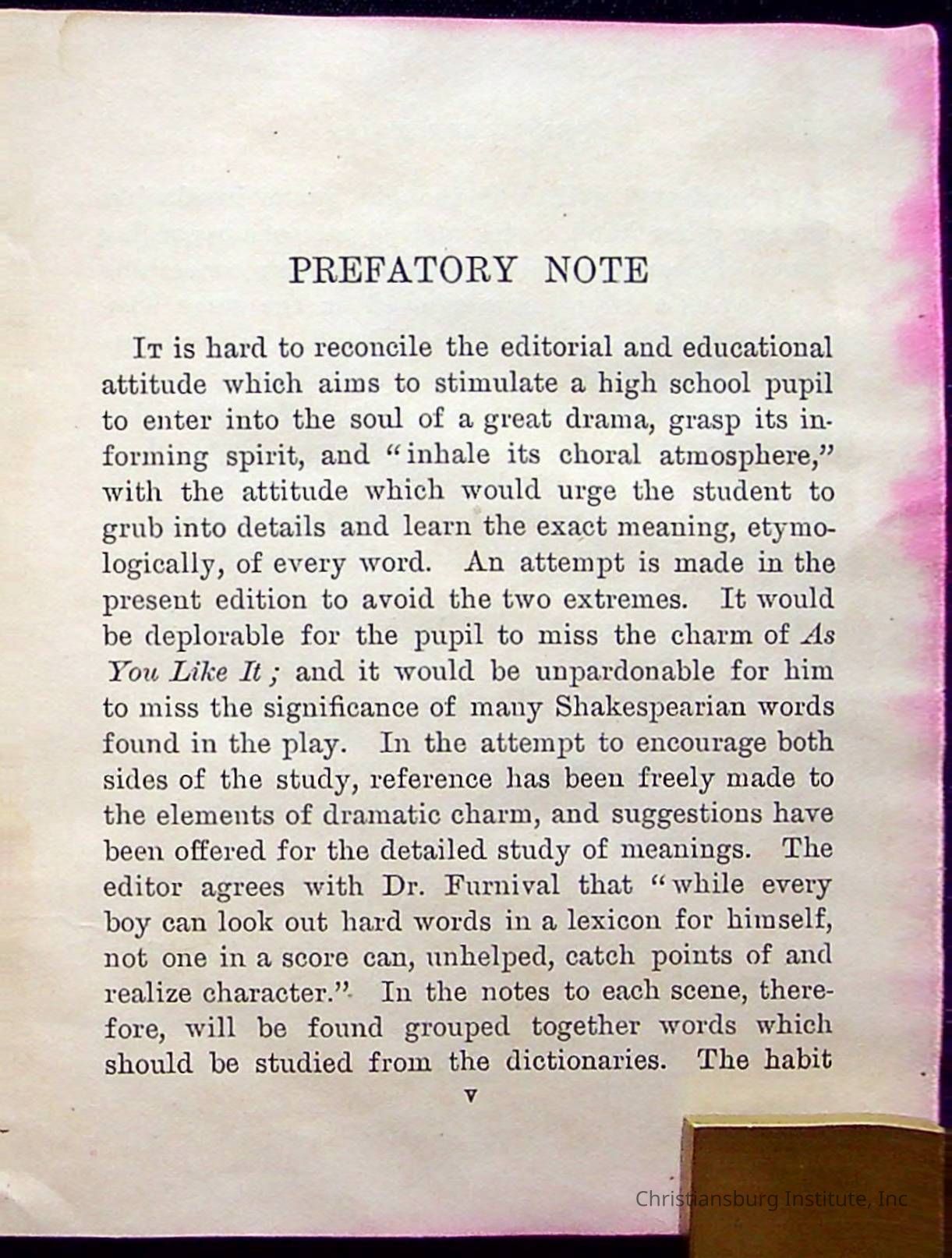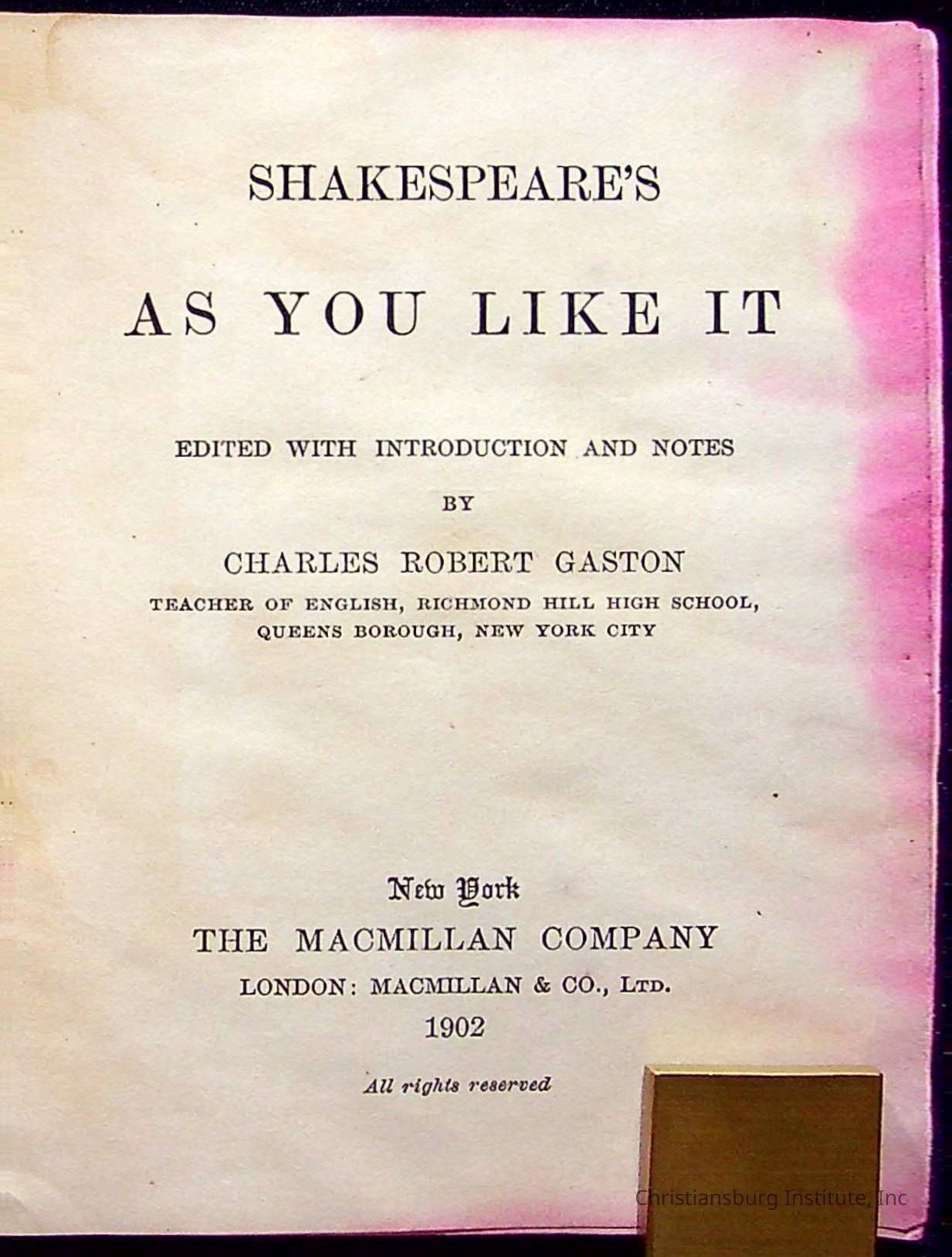 A second copy of the book, Shakespeare's As You Like It edited by Charles R. Gaston and published by the MacMillan Company in the year 1902. This book was used by Christiansburg Institute teacher, Viola Charlton in her class.Collection