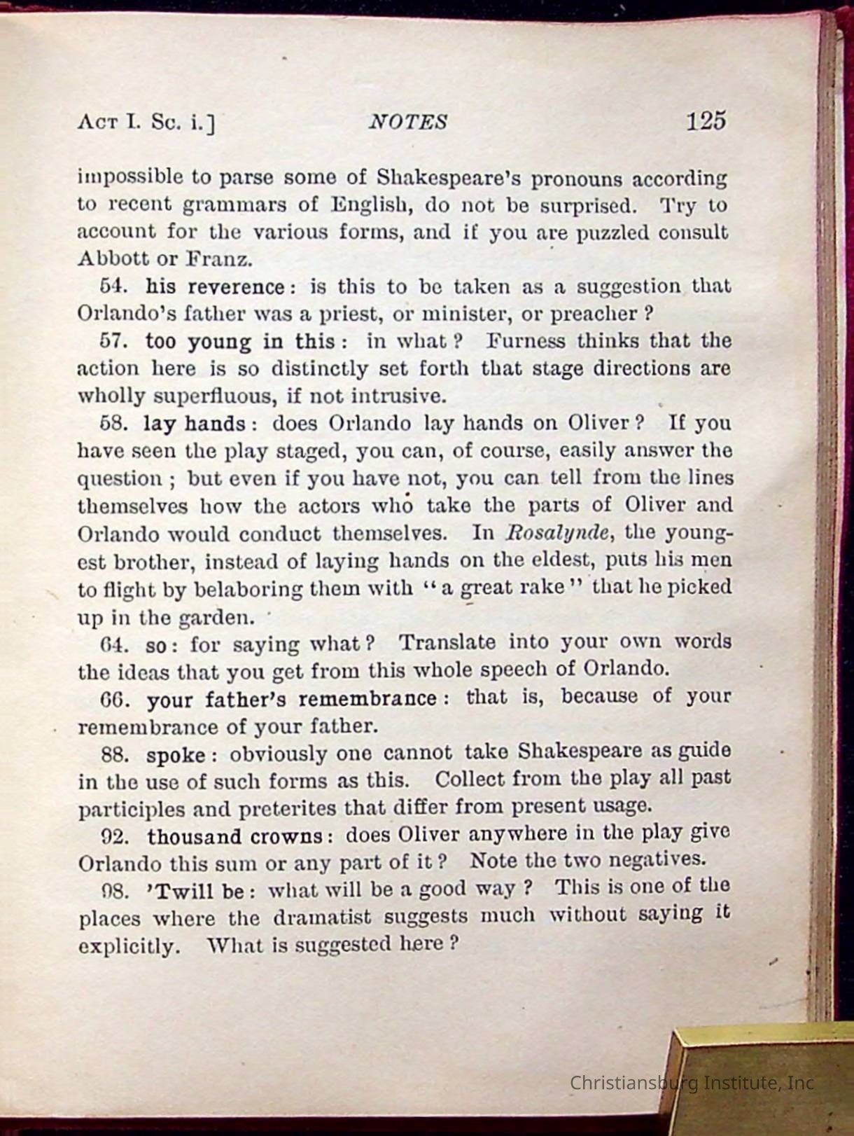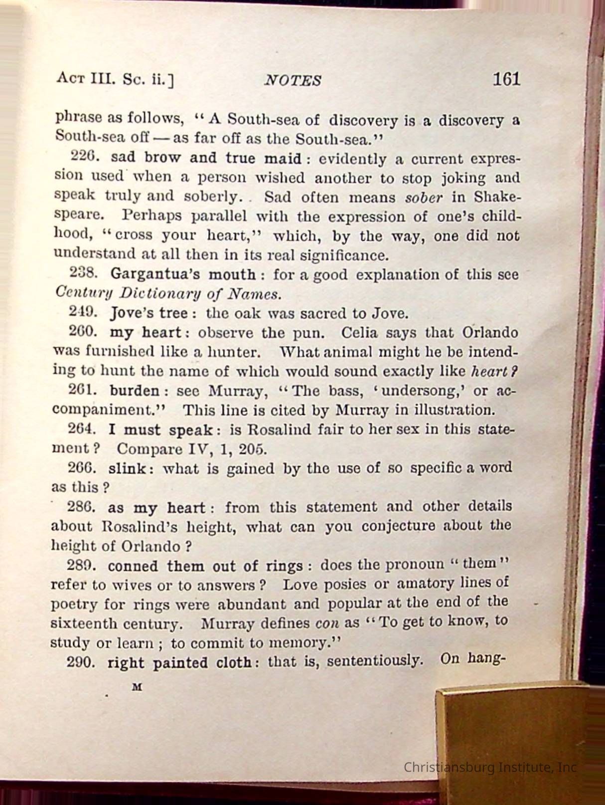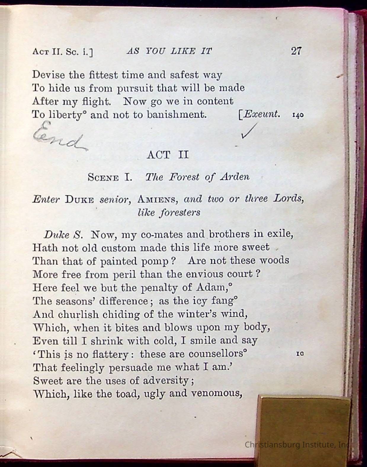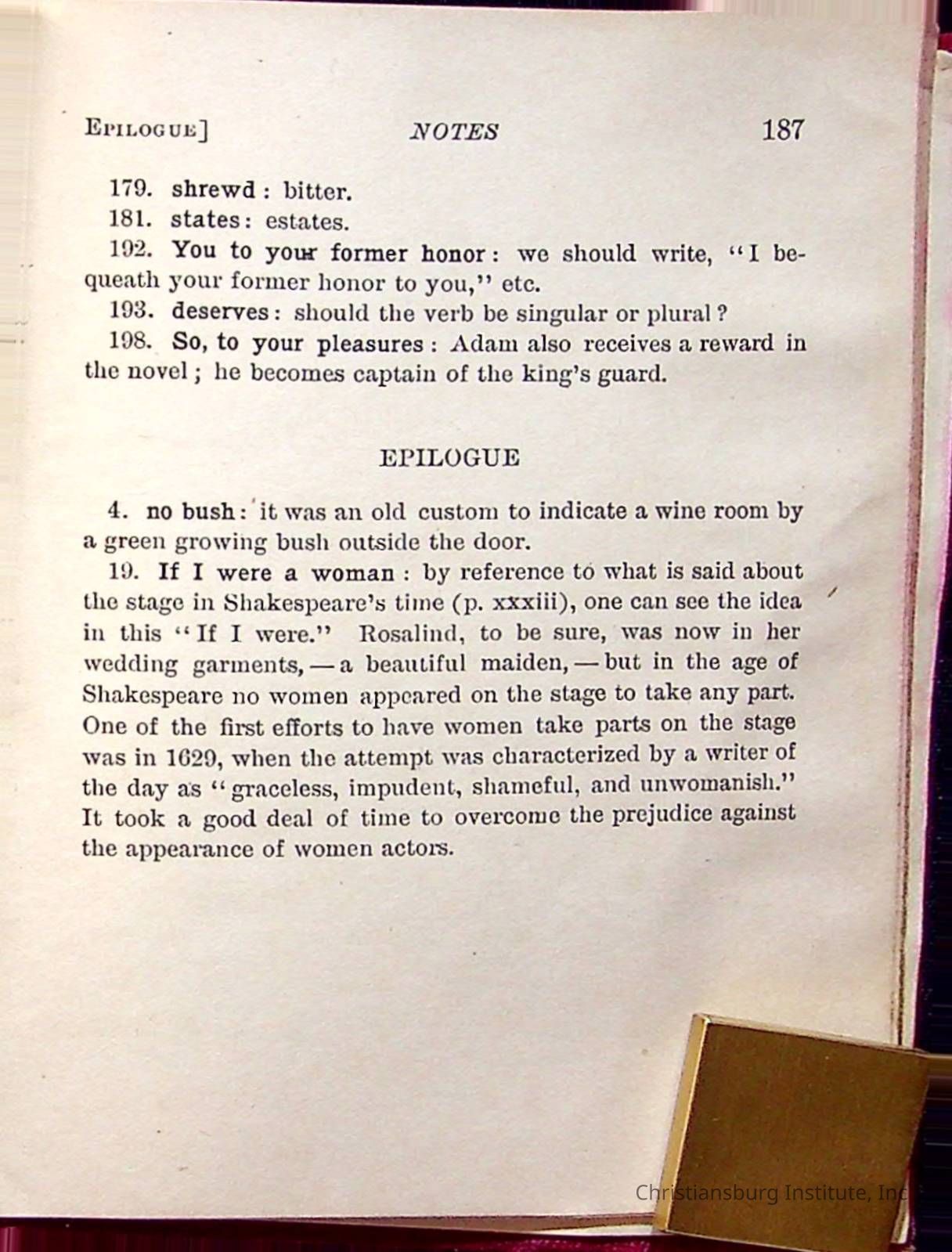 A second copy of the book, Shakespeare's As You Like It edited by Charles R. Gaston and published by the MacMillan Company in the year 1902. This book was used by Christiansburg Institute teacher, Viola Charlton in her class.Collection